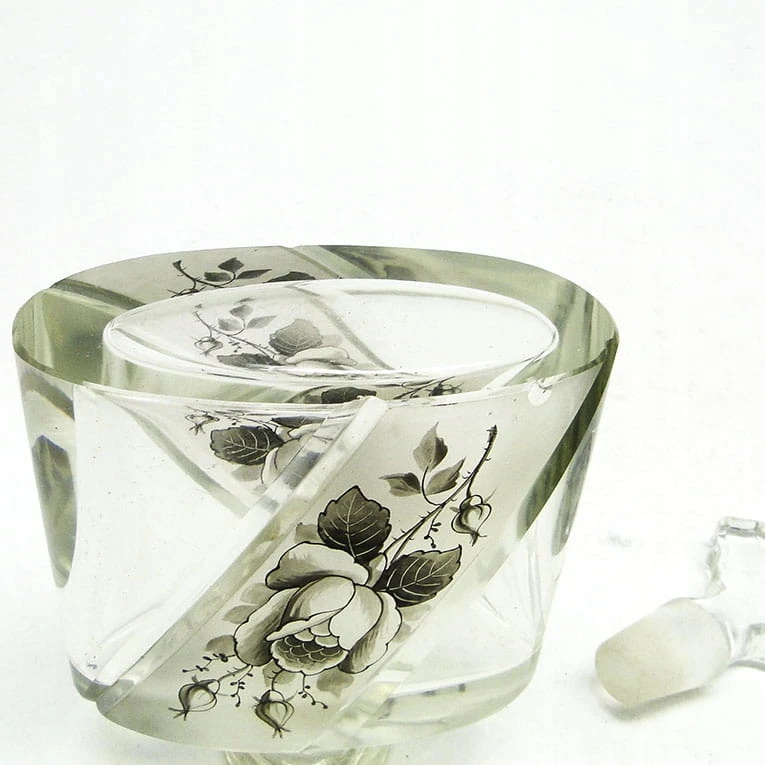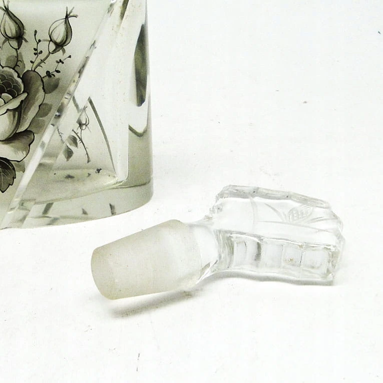 Karafka wyprodukowana została w Czech w latach 30. Karafka jest w bardzo dobrym stanie. Korek jest dobierany i pasuje kolorem i rozmiarem. Wykonana z szkła fasetowanego. Wykonana w stylu art deco.