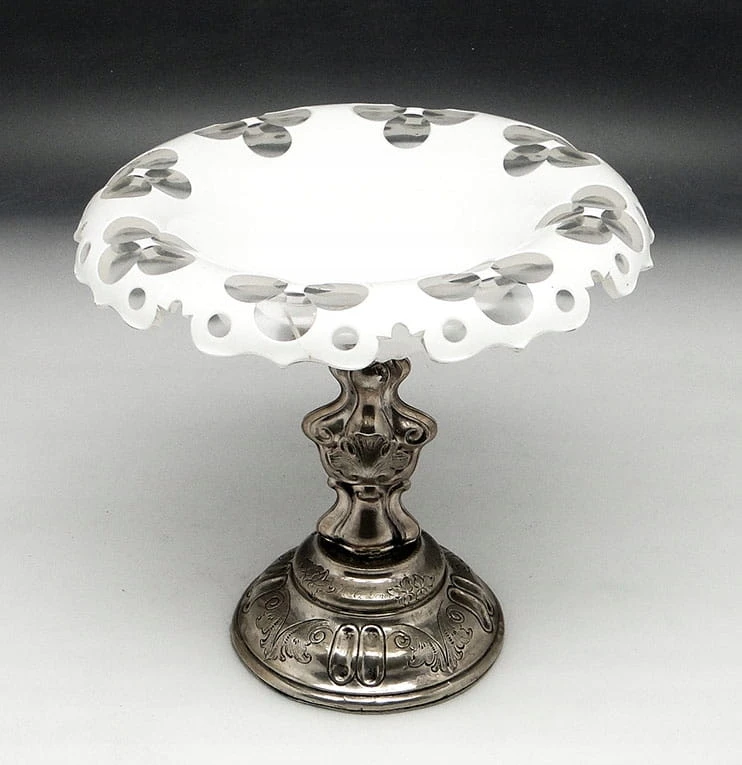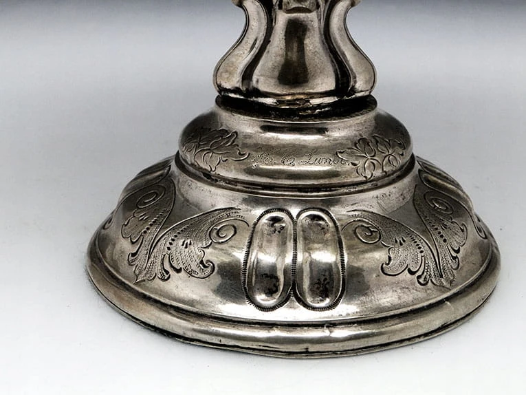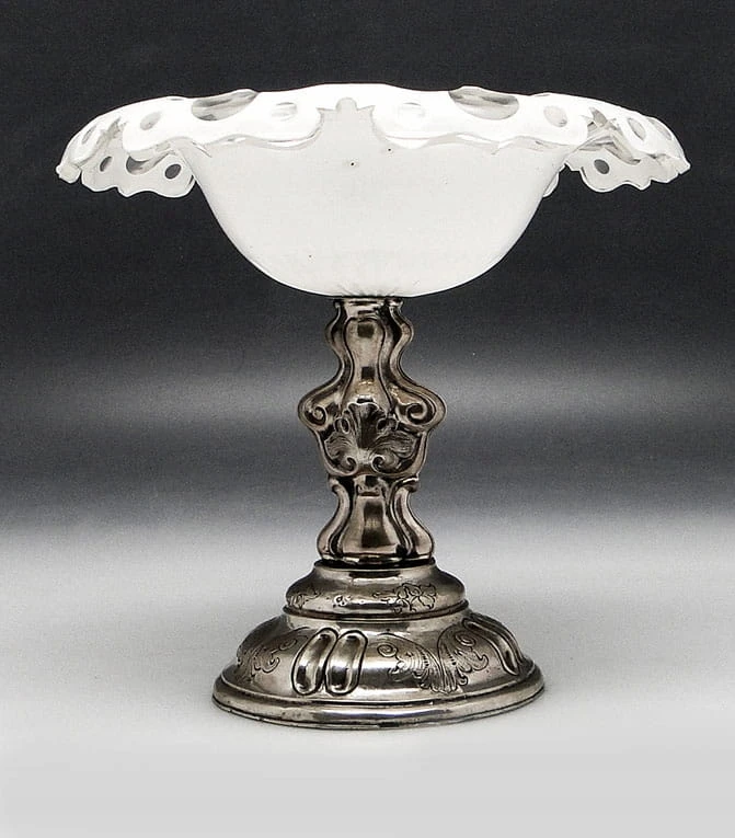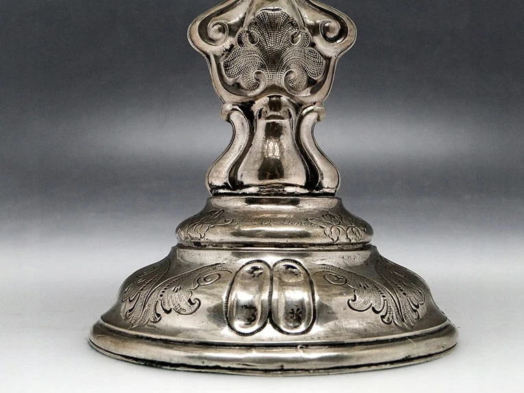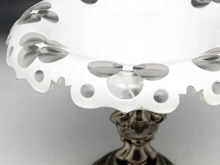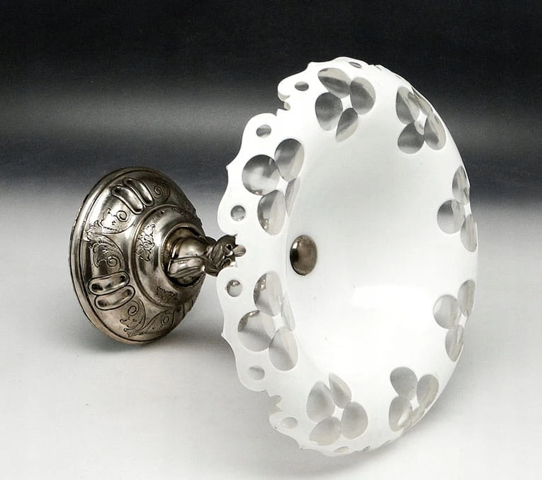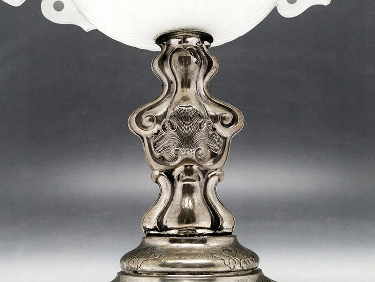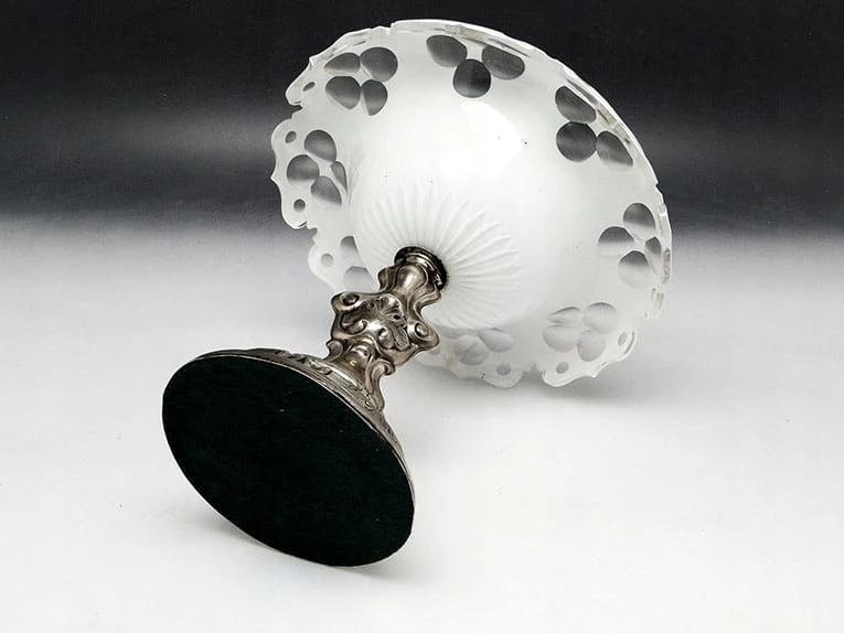 Sposób wykonania: Stopa ze srebra jest wytłocznona i osadzona na stopie wykonanej techniką kalifonii. Wzory przedstawione na niej są wykonane w stylu biedermeier.
