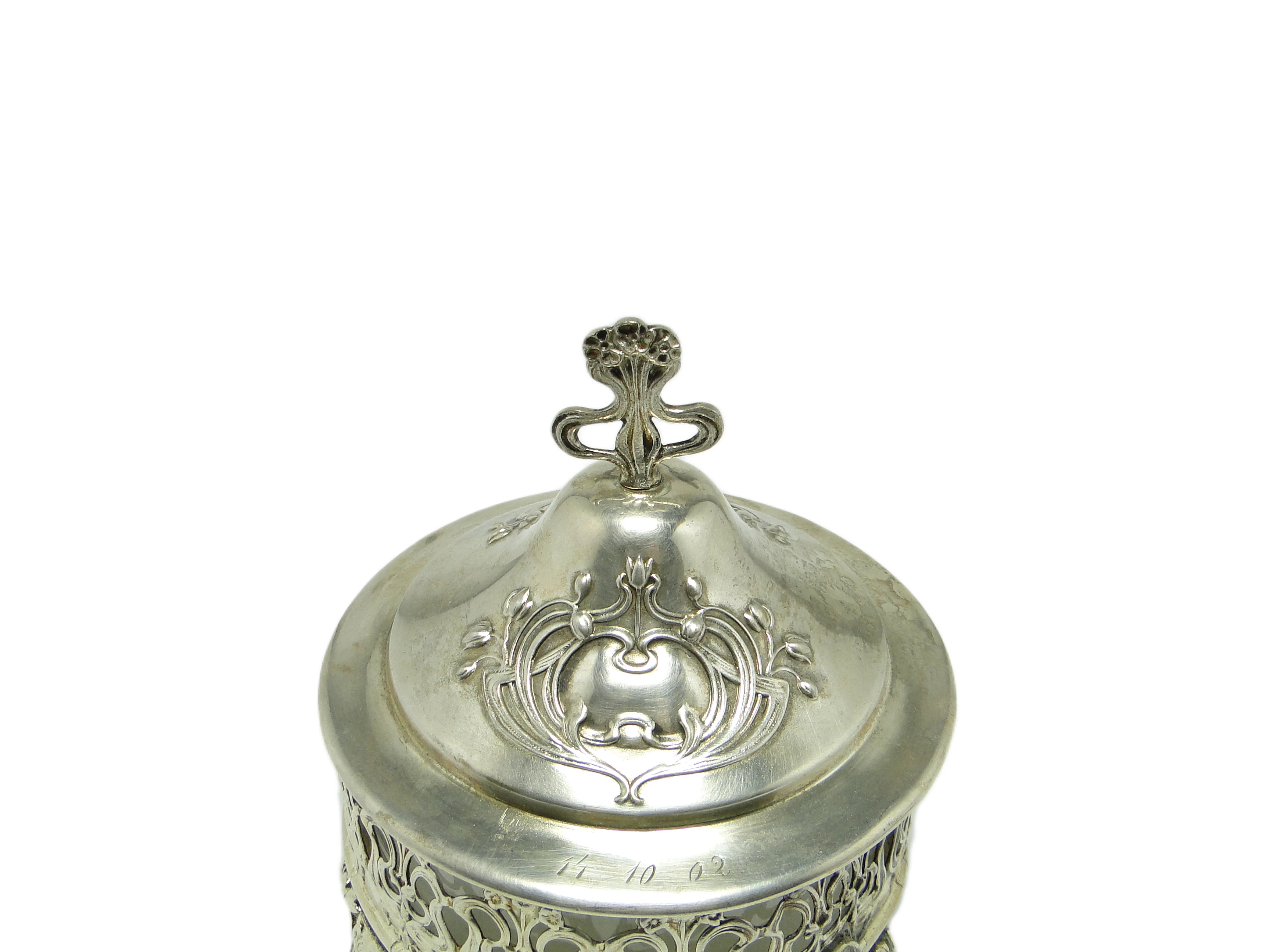 Secesyjna bomboniera z początków XX wieku, wykonana w Niemczech, stanowi przykład rzemiosła artystycznego epoki Art Nouveau. Korpus powstał z mosiądzu pokrytego warstwą srebra, utrzymanego w chłodnym, srebrzystym odcieniu z delikatną nutą ciepła charakterystyczną dla srebrzonych przedmiotów. Całość uzupełnia przezroczysty, gładki wkład szklany, widoczny przez ażurowe wycięcia. Formę dekorują misternie otwarte ornamenty florystyczne i organiczne o płynnych, asymetrycznych liniach – motywy roślinne rozciągają się po całej powierzchni, podkreślając inspiracje naturą. Kopułowa pokrywa z ozdobnym, rzeźbionym uchwytem harmonijnie wpisuje się w bryłę naczynia, a całość wsparta jest na trzech stylizowanych nogach o kształcie przypominającym zwierzęce łapy lub liście. Proporcje są wyważone, z dbałością o detale oraz płynne przejścia pomiędzy elementami. Powierzchnia metalu jest jednolita, bez widocznych uszkodzeń czy wyraźnej patyny, a szklany wkład nadaje całości lekkości. Stan zachowania: bardzo dobry, brak śladów renowacji i uszkodzeń, wszystkie elementy autentyczne.Bomboniera przekazuje ducha secesyjnej Europy, gdzie zmysłowość formy i bezpośrednie nawiązania do świata przyrody wyznaczały nowy porządek estetyczny w sztuce użytkowej. Jej ornamenty układają się w rytmiczne, organiczne linie, jakby były odciskiem roślinnych pędów w metalu, a lustrzana powierzchnia odbija światło, tworząc subtelny dialog z przezroczystością szkła. Przedmiot zdaje się opowiadać o salonach sprzed stulecia, pełnych otwartości na nowe idee i wrażliwości na detal, gdzie każdy element wnosił do wnętrza atmosferę finezyjnej elegancji.Taką bombonierę można wyeksponować na dębowej konsoli w klasycznym salonie, gdzie jej ornamenty będą współgrać z ciepłem drewna. W przeszklonej witrynie dobrze zestawi się z porcelaną i szkłem z tej samej epoki, podkreślając dekoracyjny charakter secesji. W aranżacji eklektycznej warto połączyć ją z wazonami o organicznych kształtach lub szklanymi paterami, a także wykorzystać jako pojemnik na słodycze, biżuterię czy drobne akcesoria – w otoczeniu innych metalowych lub szklanych przedmiotów utrzymanych w duchu przełomu XIX i XX wieku.