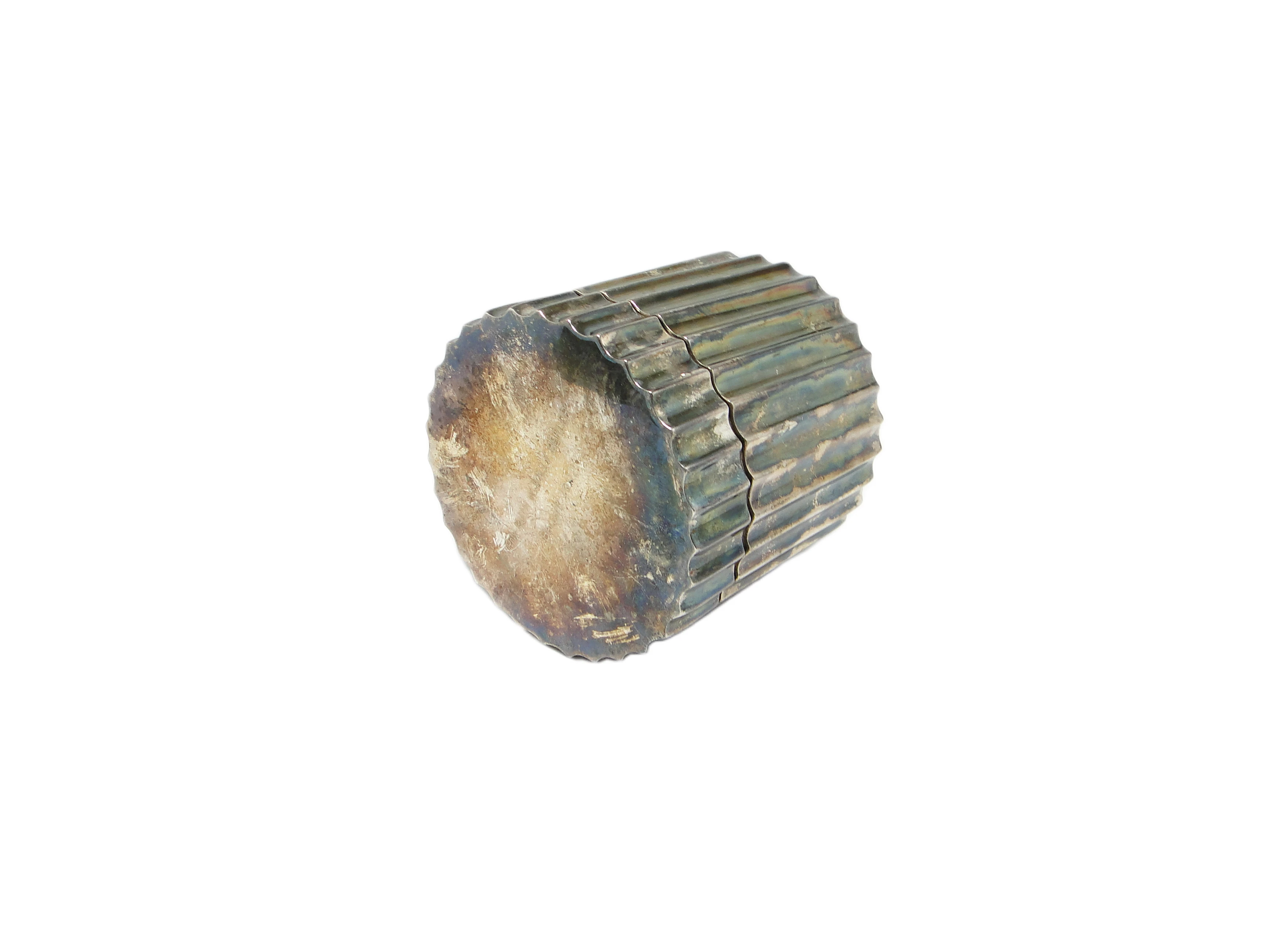 Bomboniera w stylu art déco, wykonana w Wielkiej Brytanii w latach 50., została uformowana z mosiądzu srebrzonego. Cylindryczna bryła, pokryta regularnymi, pionowymi żłobieniami obejmującymi zarówno korpus, jak i szczelnie dopasowaną pokrywkę, konsekwentnie nawiązuje do geometrycznego języka końca epoki art déco. Powierzchnia utrzymana jest w chłodnym odcieniu srebra, lecz patyna ujawnia przebłyski błękitu, złota i ciemnego srebra, tworząc wielowarstwowy, niemal iryzujący efekt. Materiał zdradza precyzję metaloplastyki, choć wizualnie tekstura wydaje się miejscami szorstka i matowa, z delikatnymi połyskami w miejscach przetarć. Pozbawiona uchwytów i dodatkowych dekoracji, bomboniera prezentuje architektoniczny, minimalistyczny charakter typowy dla brytyjskiego wzornictwa powojennego. Stan zachowania bardzo dobry – widoczne są jedynie naturalne ślady użytkowania i patyna, potwierdzające autentyczność przedmiotu.W tej bombonierze rozbrzmiewa głos lat 50.: epoki świadomej wartości formy i proporcji, niepotrzebującej ostentacji. Srebrzysta powierzchnia, z niuansami złota i błękitu, przywołuje obraz salonu, w którym światło łagodnie rozprasza się na rytmicznych żłobieniach. Jeśli mogłaby opowiedzieć swoją historię, przypomniałaby ciche chwile codziennych rytuałów – momenty, gdy słodycze, drobne skarby lub biżuteria, zamknięte pod wiekiem, czekały na swój czas, a każdy dotyk metalu otwierał nowy rozdział domowych opowieści.Bomboniera dobrze odnajdzie się na konsoli lub komodzie w salonie inspirowanym modernizmem, art déco, jak i w eklektycznym wnętrzu kolekcjonerskim. Można zestawić ją z kryształowymi naczyniami z tej samej epoki, minimalistycznymi świecznikami czy ceramiczną rzeźbą o geometrycznej formie. Srebrzysty ton i architektoniczna prostota najlepiej wybrzmią w otoczeniu ciemnego drewna, marmuru lub szkła z lekką patyną, zarówno w klasycznych, jak i współczesnych aranżacjach.