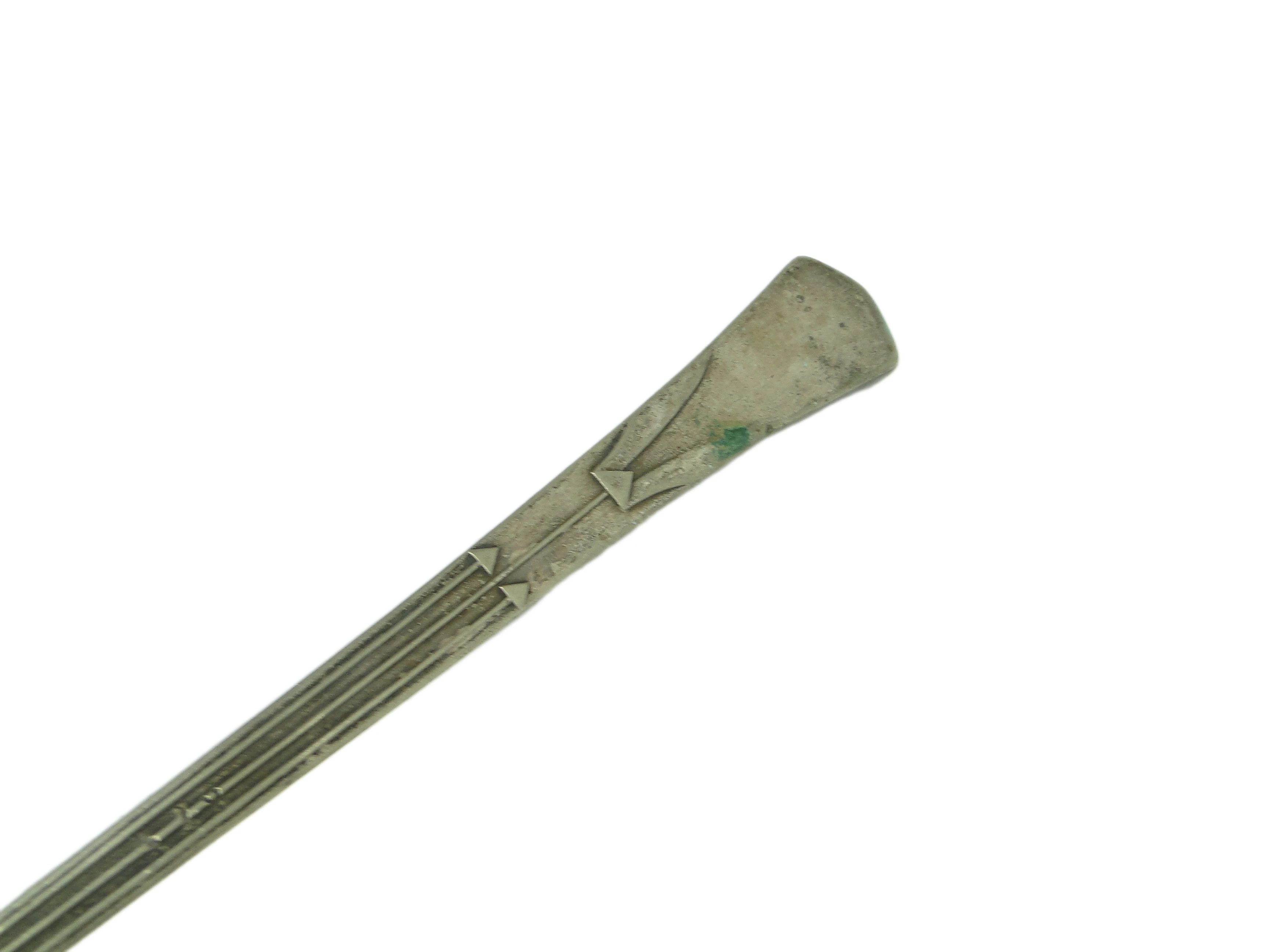 Chochla do zupy w stylu secesyjnym, pochodząca z warszawskiej wytwórni Kummer z lat 20. XX wieku, wykonana została z alpaki srebrzonej. Srebrzenie jest niemal całkowicie starte, odsłaniając matowy, chłodnoszary metal o delikatnej, niejednorodnej patynie. Rękojeść zdobią płynne, organiczne linie z subtelnymi geometrycznymi akcentami, charakterystycznymi dla estetyki Art Nouveau. Forma jest smukła i wyważona, z łagodnie wygiętym trzonkiem i głęboką, okrągłą czaszą. Powierzchnia nosi typowe ślady użytkowania — zarysowania, przebarwienia oraz przetarcia — podkreślające jej autentyczność i wiek. Konstrukcja pozostaje solidna, bez widocznych napraw. Stan zachowania: mocno zużyty, lecz stabilny i w pełni oryginalny.W tej chochli słychać głos dwudziestolecia międzywojennego, gdy polskie rzemiosło szukało równowagi między funkcją a dekoracją. Organiczne ornamenty płyną wzdłuż trzonka jak motyw roślinny uchwycony w metalu, a matowa powierzchnia opowiada o codziennych rytuałach stołu sprzed stulecia. Delikatna patyna i ślady czasu pozwalają wyobrazić sobie, jak przedmiot ten towarzyszył dawnym domowym ucztom, zachowując pamięć minionych pokoleń.Chochlę można wykorzystać zarówno w aranżacji stołu w duchu vintage, jak i jako kolekcjonerski akcent w ekspozycji naczyń z początku XX wieku. Dobrze sprawdzi się w towarzystwie porcelany z geometrycznym lub roślinnym dekorem, obok kryształowych waz czy srebrzonych pater. W nowoczesnym wnętrzu warto połączyć ją z minimalistyczną ceramiką i lnianymi obrusami, by wydobyć kontrast dawnych i współczesnych form oraz podkreślić jej dekoracyjny charakter.