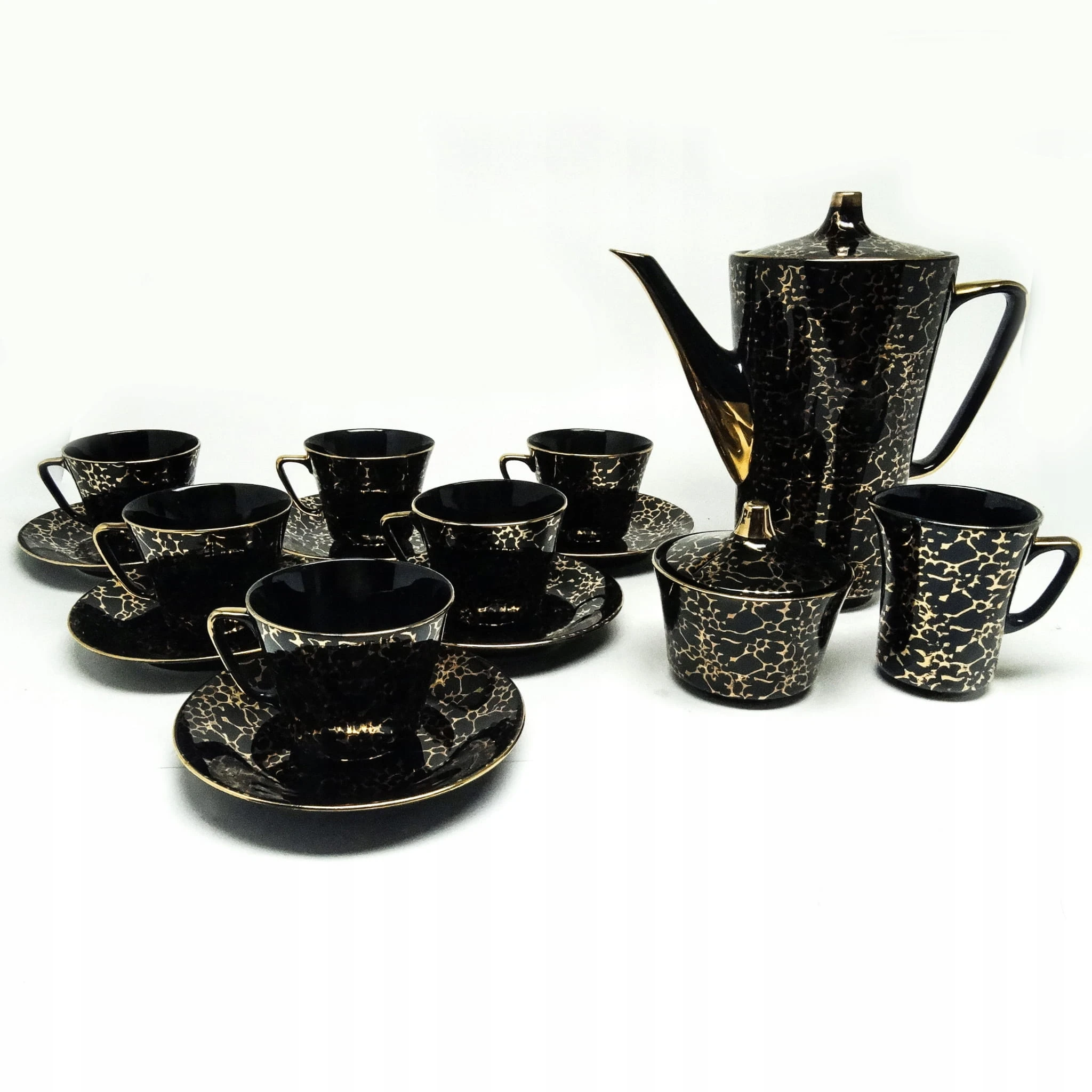 dzbanek wys 22,5 cm 6 x filiżanka wys 6,5 cm średnica 8 cm , 6 x podstawek średnica 14 cm , cukiernica wys z pokrywką 9,5 cm średnica 9 cm , mlecznik wys 8,5 cm