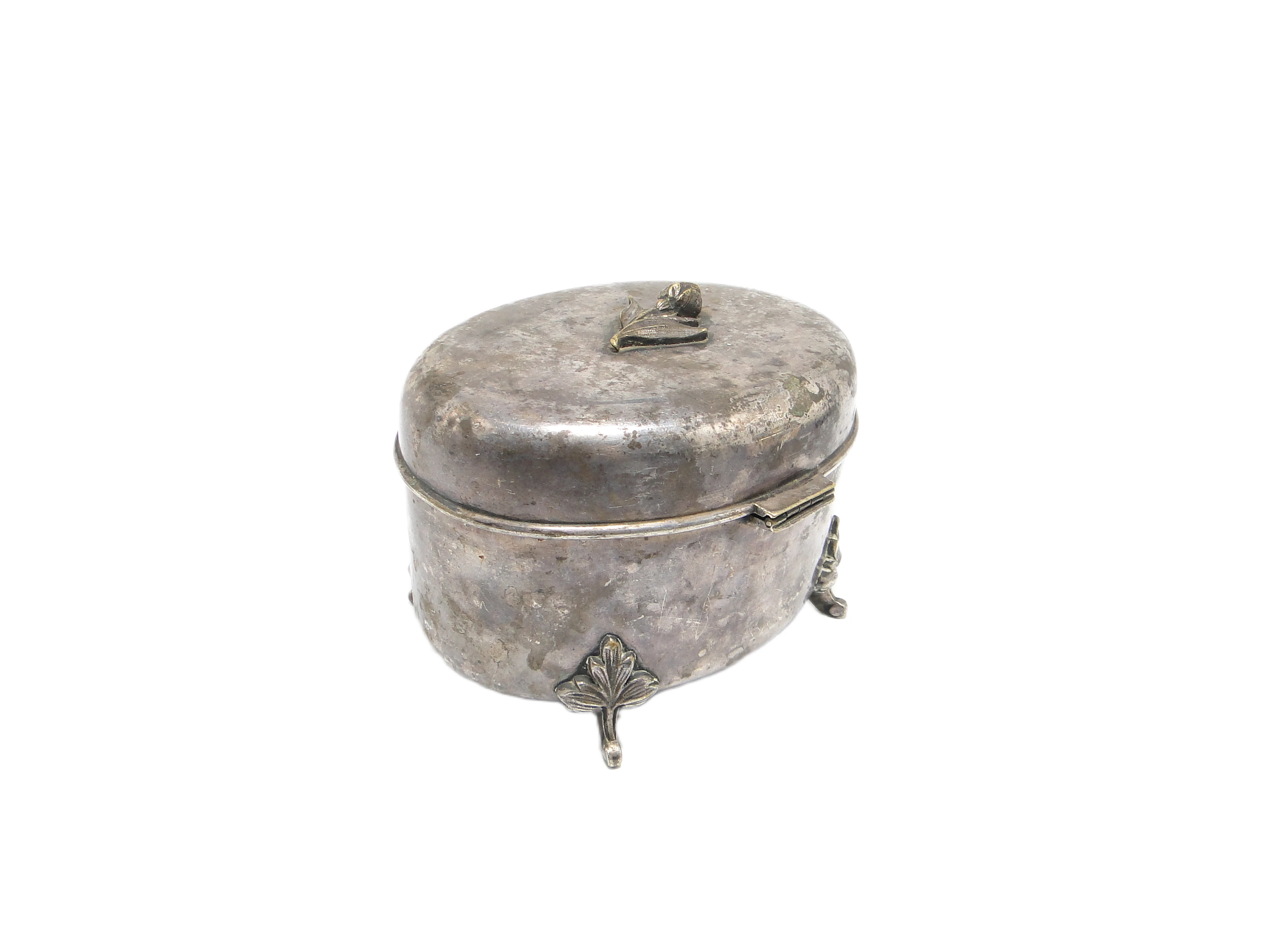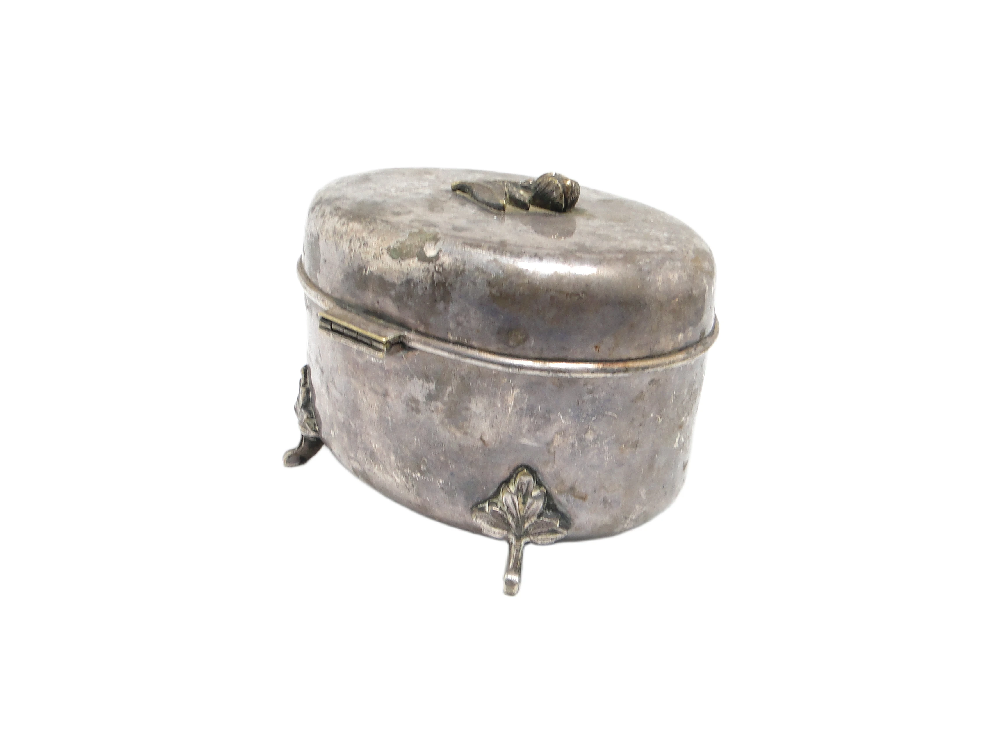 Cukiernica Fraget z lat 20. XX wieku to przykład polskiego rzemiosła art déco, wykonany z mosiądzu platerowanego srebrem w warszawskiej manufakturze. Owalny korpus o miękko zaokrąglonych krawędziach, subtelnie wypukła pokrywa z uchwytem w kształcie liścia oraz trzy stylizowane nóżki – również inspirowane motywem liści – stanowią charakterystyczne elementy tej epoki. Chłodny, przygaszony srebrny kolor z matowym wykończeniem podkreśla dekoracyjny, a zarazem funkcjonalny charakter przedmiotu. Widoczne łączenia, starannie opracowane detale i solidna budowa potwierdzają dbałość o każdy aspekt wykonania. Powierzchnia nosi wyraźną patynę i drobne ślady użytkowania, brak natomiast poważnych uszkodzeń konstrukcyjnych czy wgnieceń. Zachowana w bardzo dobrym stanie, z autentycznymi oznakami upływu czasu.Forma tej cukiernicy przywołuje atmosferę międzywojennej Warszawy – czasów, gdy na stołach pojawiały się przedmioty łączące nowoczesność z tradycją. Motyw liścia, obecny zarówno w uchwycie wieka, jak i w nóżkach, opowiada o fascynacji naturą, która przenikała art déco, a miękki połysk srebra wydaje się nosić w sobie cichą opowieść o dawnych spotkaniach przy herbacie. Patyna i delikatne ślady użytkowania czynią z niej nie tylko przedmiot użytkowy, ale także dyskretnego świadka codziennych rytuałów oraz rodzinnych historii.Cukiernicę można wyeksponować na stole w salonie lub jadalni jako element klasycznego serwisu, zestawiając ją z porcelaną z epoki bądź lnianą serwetą. Sprawdzi się także jako pojedynczy akcent na komodzie w gabinecie, gdzie jej subtelna forma oraz chłodny połysk wprowadzą ton dekoracyjnej powściągliwości. Warto połączyć ją z minimalistyczną zastawą lub użyć w aranżacji z przewagą matowych, ciemnych powierzchni, co pozwoli wydobyć detale wykończenia i podkreślić jej szlachetny rodowód.