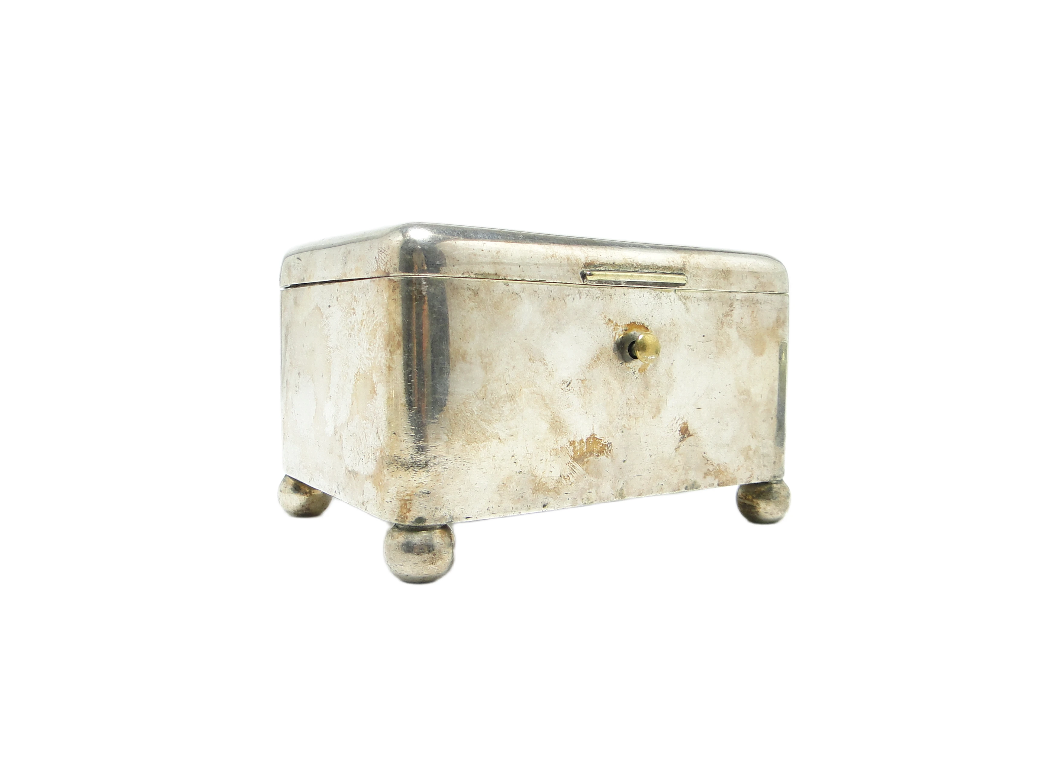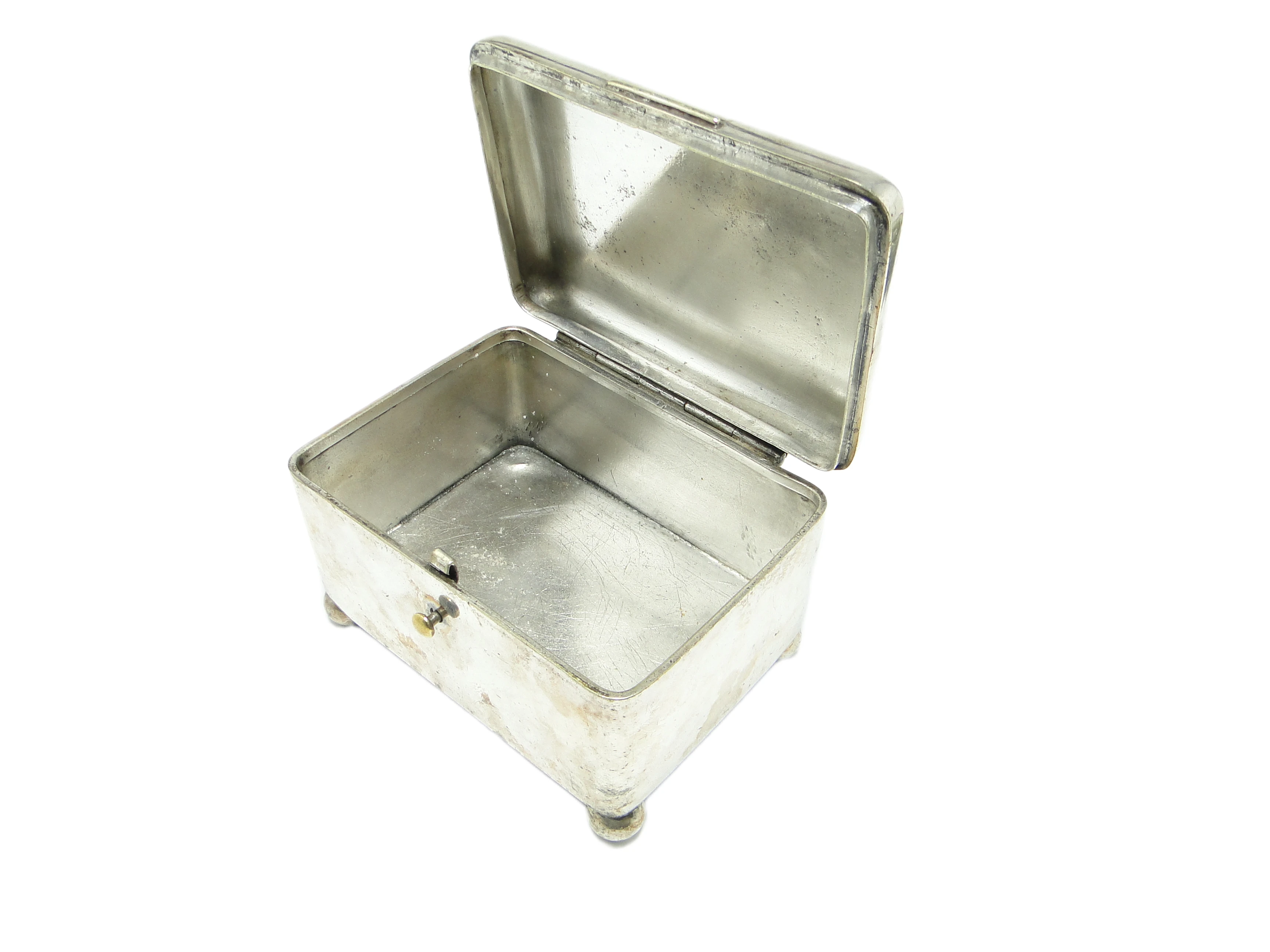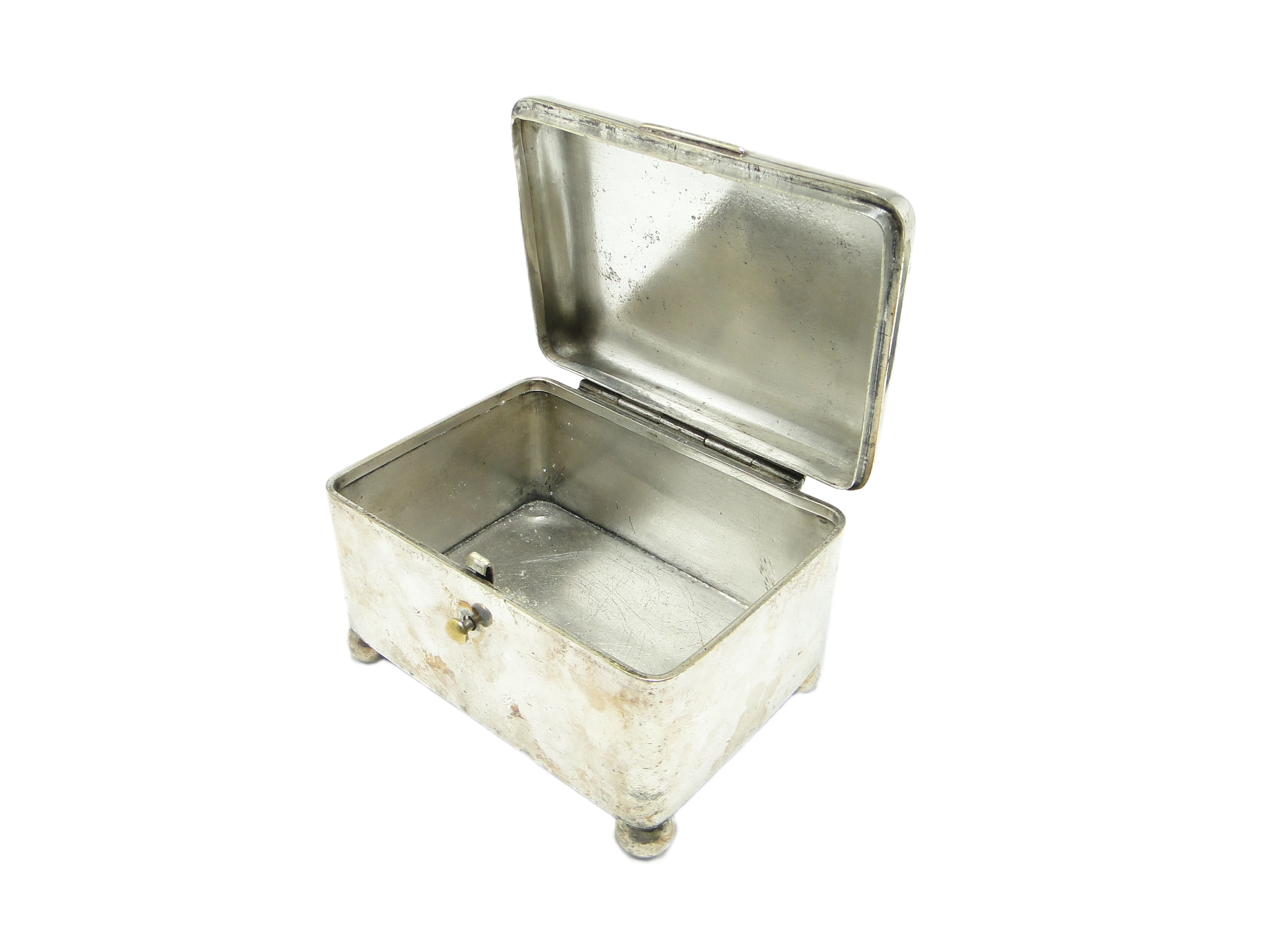 Cukiernica Art Deco z warszawskiej wytwórni Norblin to przykład polskiego rzemiosła z lat 20. XX wieku, wykonana z mosiądzu pokrytego srebrem. Korpus o geometrycznej, prostokątnej formie łagodnie przechodzi w zaokrąglone narożniki, a płaska pokrywka z centralnie osadzoną gałką podkreśla funkcjonalność projektu. Całość wspierają cztery kuliste nóżki, które – podobnie jak uchwyt – odsłaniają miejscami ciepłe tony mosiądzu, stanowiąc dyskretne akcenty kolorystyczne. Matowa, srebrzysta powierzchnia nosi naturalny nalot i patynę, z widocznymi drobnymi rysami oraz przebarwieniami, co nadaje przedmiotowi historycznego charakteru. Konstrukcja pozostaje zwarta, bez poważnych uszkodzeń czy wgnieceń. Stan zachowania bardzo dobry – autentyczna patyna podkreśla zabytkowy rodowód cukiernicy.Forma tej cukiernicy niesie w sobie głos lat 20., gdy geometria i funkcjonalność zyskiwały nowy wymiar w polskim wzornictwie. Oszczędność linii i harmonia proporcji przywołują atmosferę przedwojennej Warszawy, gdzie prostota formy stanowiła o nowoczesności. Matowe srebro i ciepłe przebłyski mosiądzu opowiadają o stołach, na których ceniono zarówno użyteczność, jak i subtelną dekoracyjność – bez nadmiaru ornamentu, lecz z dbałością o każdy detal.Cukiernicę można wyeksponować na klasycznej konsoli, witrynie lub serwantce, gdzie jej chłodny połysk kontrastuje z naturalnym drewnem lub szkłem. Dobrze sprawdzi się w aranżacjach inspirowanych nurtem Art Deco, modernizmem czy w eklektycznych wnętrzach kolekcjonerskich. Warto połączyć ją z porcelaną o prostych liniach, szkłem lub kryształami, by podkreślić jej geometryczną dyscyplinę i zabytkowy charakter. W otoczeniu minimalistycznych dodatków lub innych srebrzonych naczyń z epoki, cukiernica Norblina stanie się subtelnym, ale czytelnym akcentem w kolekcji.