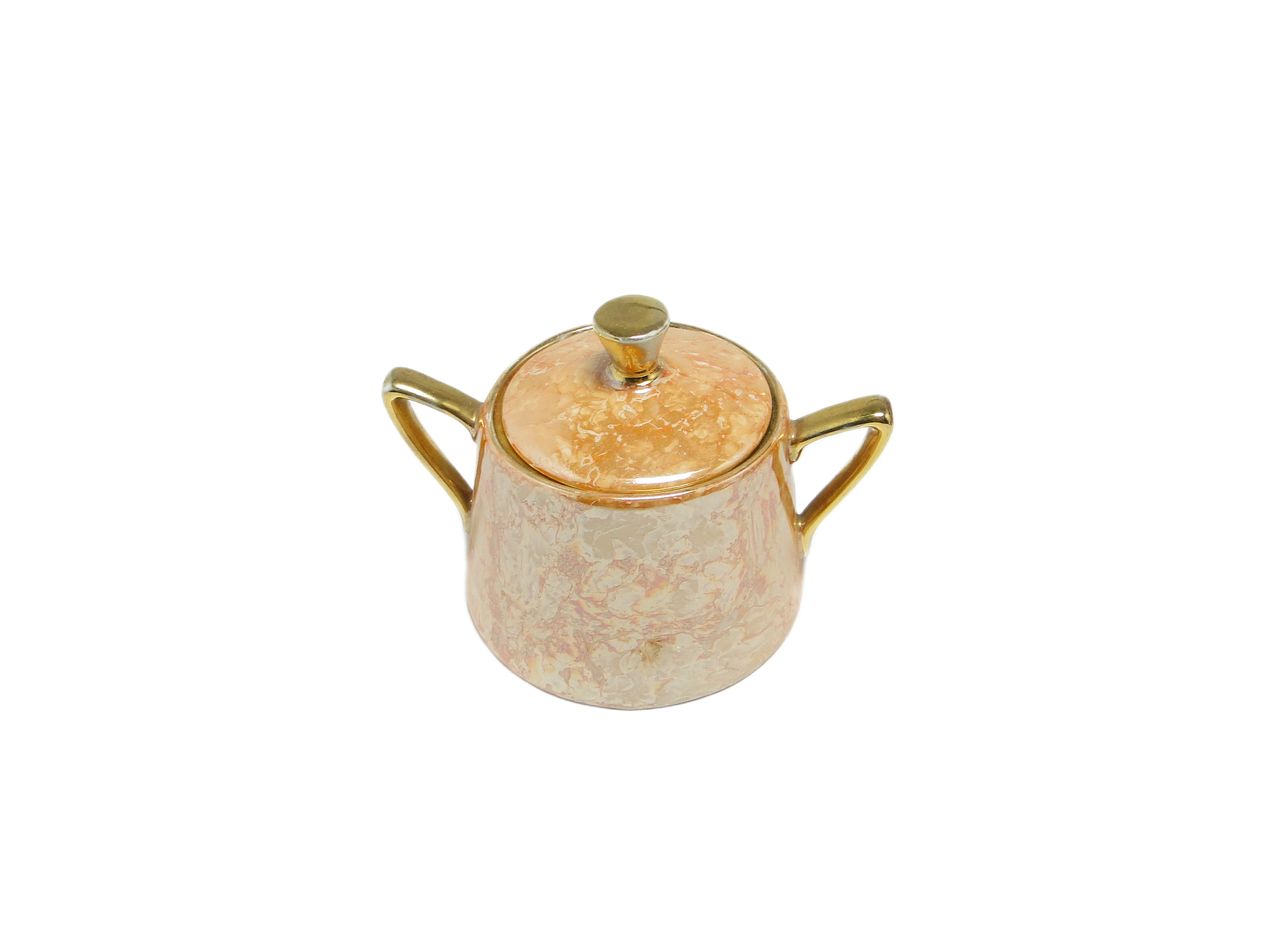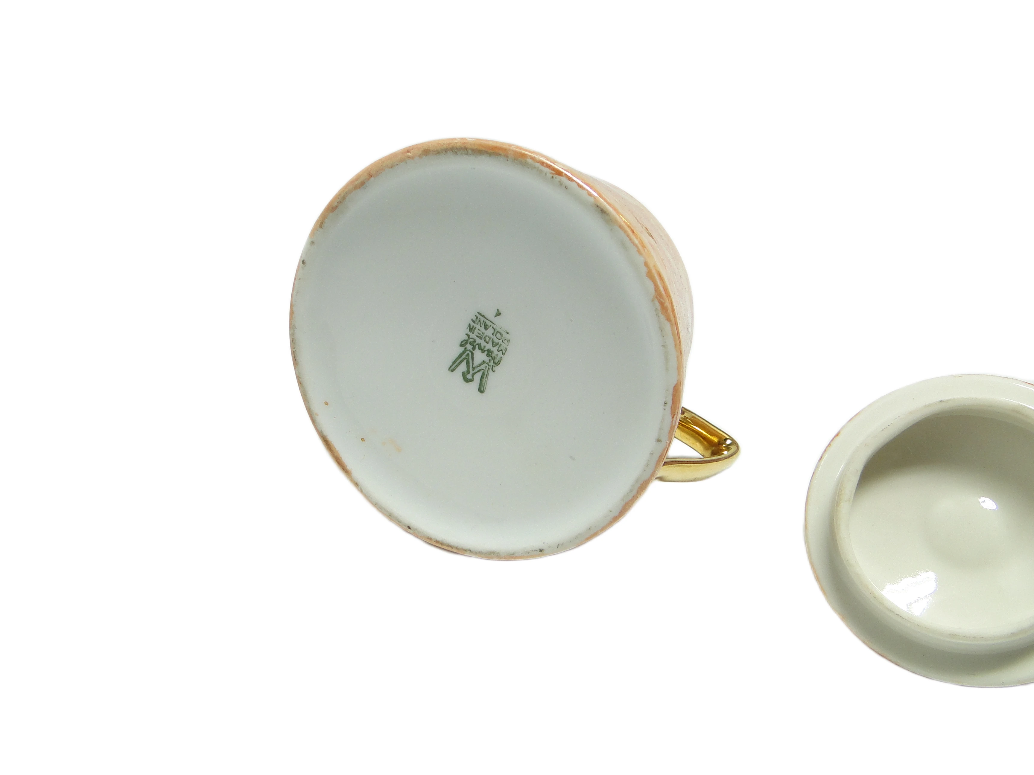 Cukiernica z serii Helena, wyprodukowana w Polsce w latach 70., reprezentuje użytkową porcelanę mid-century modern o czytelnej, stożkowej formie, szerokiej podstawie i lekko zwężającym się profilu. Powierzchnię naczynia pokrywa marmurkowe szkliwo w ciepłych odcieniach beżu, kremu i delikatnej pomarańczy, z wysokim połyskiem, który efektownie odbija światło. Dwa wydłużone, wygięte uchwyty oraz gałka na pokrywce wykończone są metalicznym, złotym szkliwem, wprowadzając akcent dekoracyjny i odwołując się do modernistycznej estetyki lat 70. Konstrukcja pozostaje solidna, bez pęknięć czy wyszczerbień, a złote detale zachowały się w bardzo dobrym stanie, z minimalnymi śladami użytkowania. Stan zachowania: bardzo dobry, brak oznak renowacji lub poważniejszych uszkodzeń.Forma tej cukiernicy przywołuje głos dekady poszukiwań i odwagi w polskim wzornictwie: marmurkowa powierzchnia opowiada o fascynacji nowymi efektami szkliwienia, a złote uchwyty i gałka wyrażają aspirację do subtelnego luksusu w codziennym rytuale. Wysoki połysk porcelany odbija światło niczym tafla w letni poranek, a dynamiczny układ barw przywołuje atmosferę eksperymentów lat 70., gdy każdy detal naczynia miał podkreślać indywidualny charakter stołu.Cukiernicę można zestawić z filiżankami lub imbrykiem z tej samej linii, tworząc spójną, vintage'ową oprawę stołu, ale równie dobrze odnajdzie się jako solista – ustawiona na tacy z ciemnego drewna, w towarzystwie naczyń o gładkich powierzchniach lub subtelnych metalicznych akcentach. Dobrze sprawdzi się w aranżacjach mid-century modern, w eklektycznym salonie lub klasycznej jadalni, gdzie warto połączyć ją z ciepłymi tkaninami i prostą ceramiką, eksponując jej dekoracyjny, a jednocześnie użytkowy charakter.