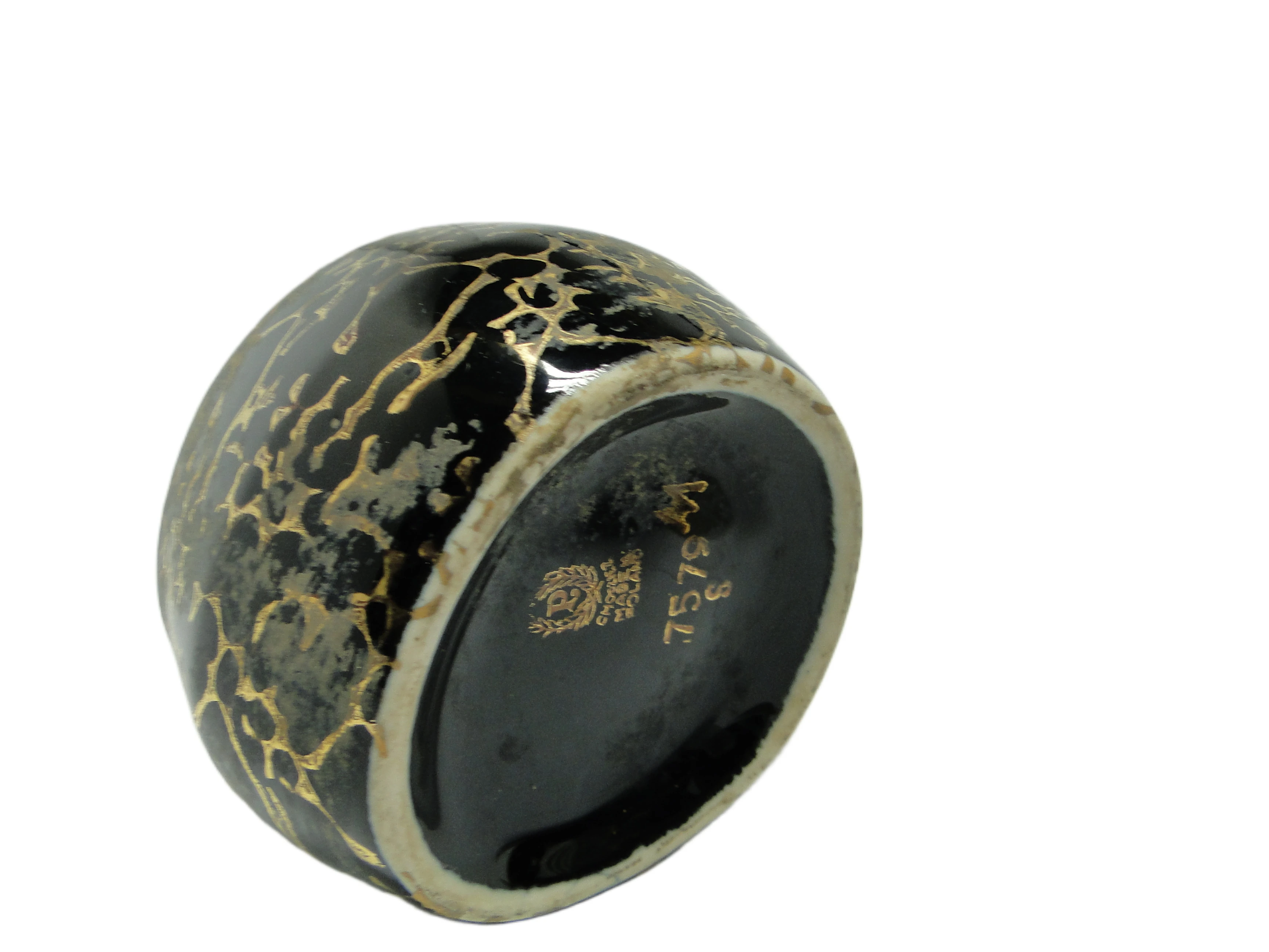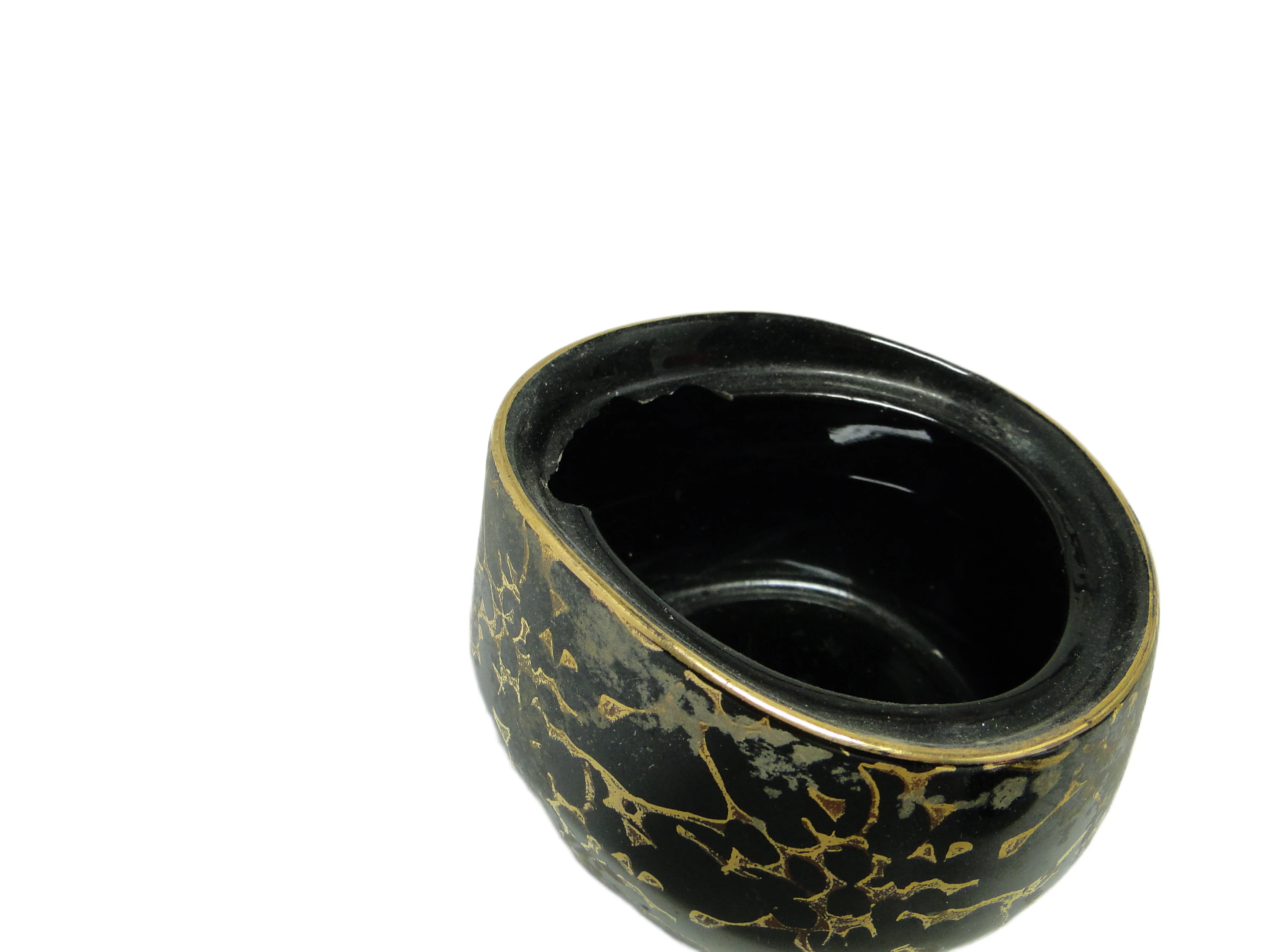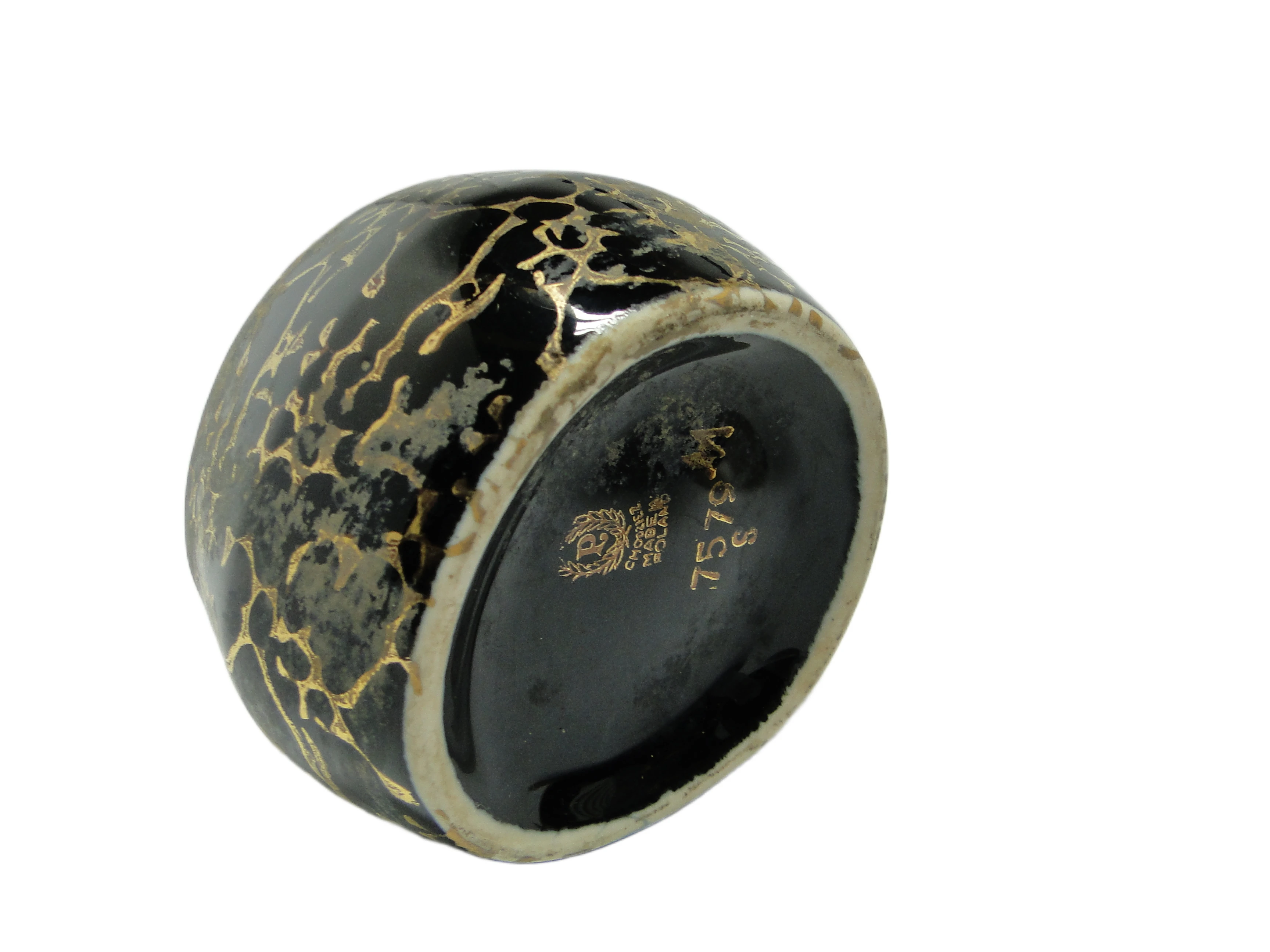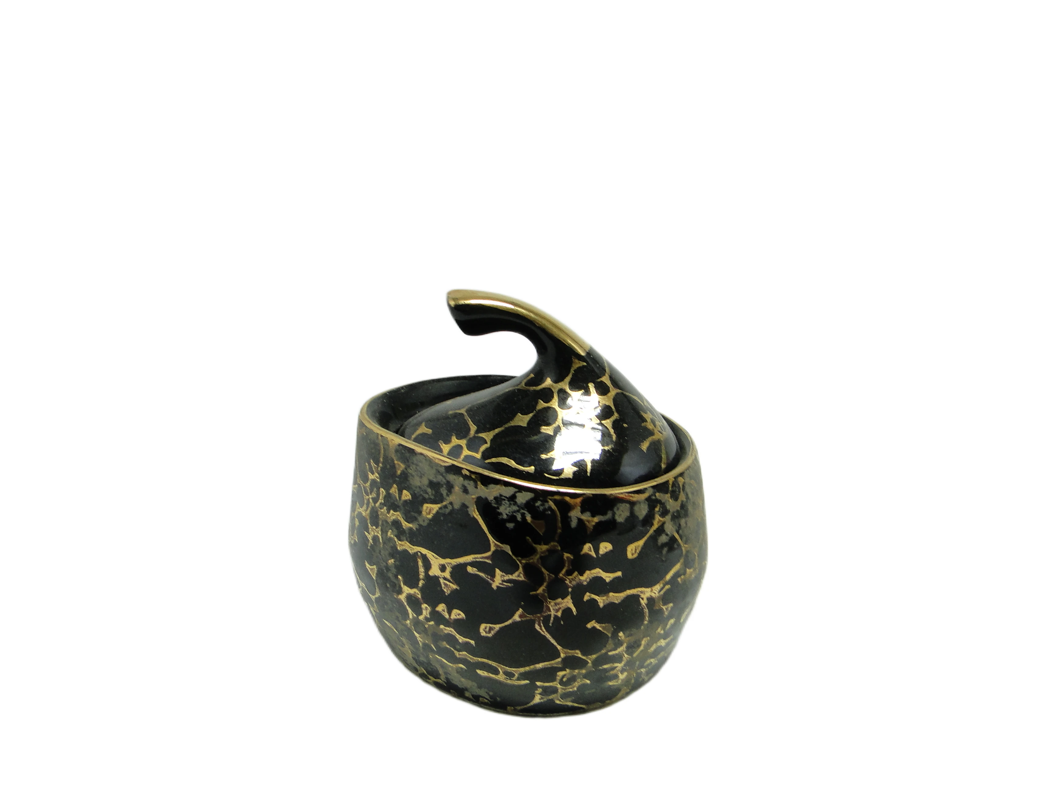 Cukiernica „Iza” z wytwórni Chodzież, wyprodukowana w Polsce w latach 70., wykonana została z porcelany o głębokim, nasyconym czarnym kolorze i wysokim połysku. Zarówno korpus, jak i pokrywkę zdobią nieregularne złote aplikacje, naniesione techniką tamponażu – tworzą dynamiczny, organiczny wzór, który przypomina marmurkowanie lub subtelne spękania. Charakterystycznym elementem jest asymetryczny, wygięty ku górze uchwyt pokrywki, również zaakcentowany złotym detalem. Forma naczynia pozostaje zwarta, o miękkiej, płynnej linii i lekko nieregularnej sylwetce, typowej dla późnego modernizmu i nurtu mid-century modern. Porcelana jest jednolicie gładka, z błyszczącym wykończeniem, a złote zdobienia rozkładają się równomiernie po powierzchni. Stan zachowania bardzo dobry – brak przebarwień, ubytków czy śladów użytkowania.W tej cukiernicy słychać głos śmiałego modernizmu przełomu lat 60. i 70., gdy polska porcelana szukała nowych środków wyrazu. Głęboka czerń połyskuje niczym tafla lakieru, a złote ornamenty opowiadają o eksperymentach z fakturą i światłem. Asymetryczny uchwyt sugeruje ruch, jakby cała forma była w nieustannym dialogu z otoczeniem – naczynie zaprasza do wspólnego rytuału, celebruje codzienność i pamięta czasy, gdy kontrast i dotyk wyznaczały kierunki w projektowaniu użytkowym.Cukiernica „Iza” może zostać wyeksponowana na nowoczesnej tacy z drewna lub stali, gdzie stworzy wyraźny akcent na tle jasnego obrusu czy minimalistycznej zastawy. Dobrze sprawdzi się w aranżacjach mid-century modern – obok filiżanek o prostych liniach lub szklanych naczyń w odcieniach bursztynu. Można ją zestawić z dekoracyjną paterą lub wazonem w złocie, by podkreślić szlachetność aplikacji. Wniesie kolekcjonerski ton do salonu lub jadalni, szczególnie w towarzystwie innych polskich albo środkowoeuropejskich porcelan vintage.