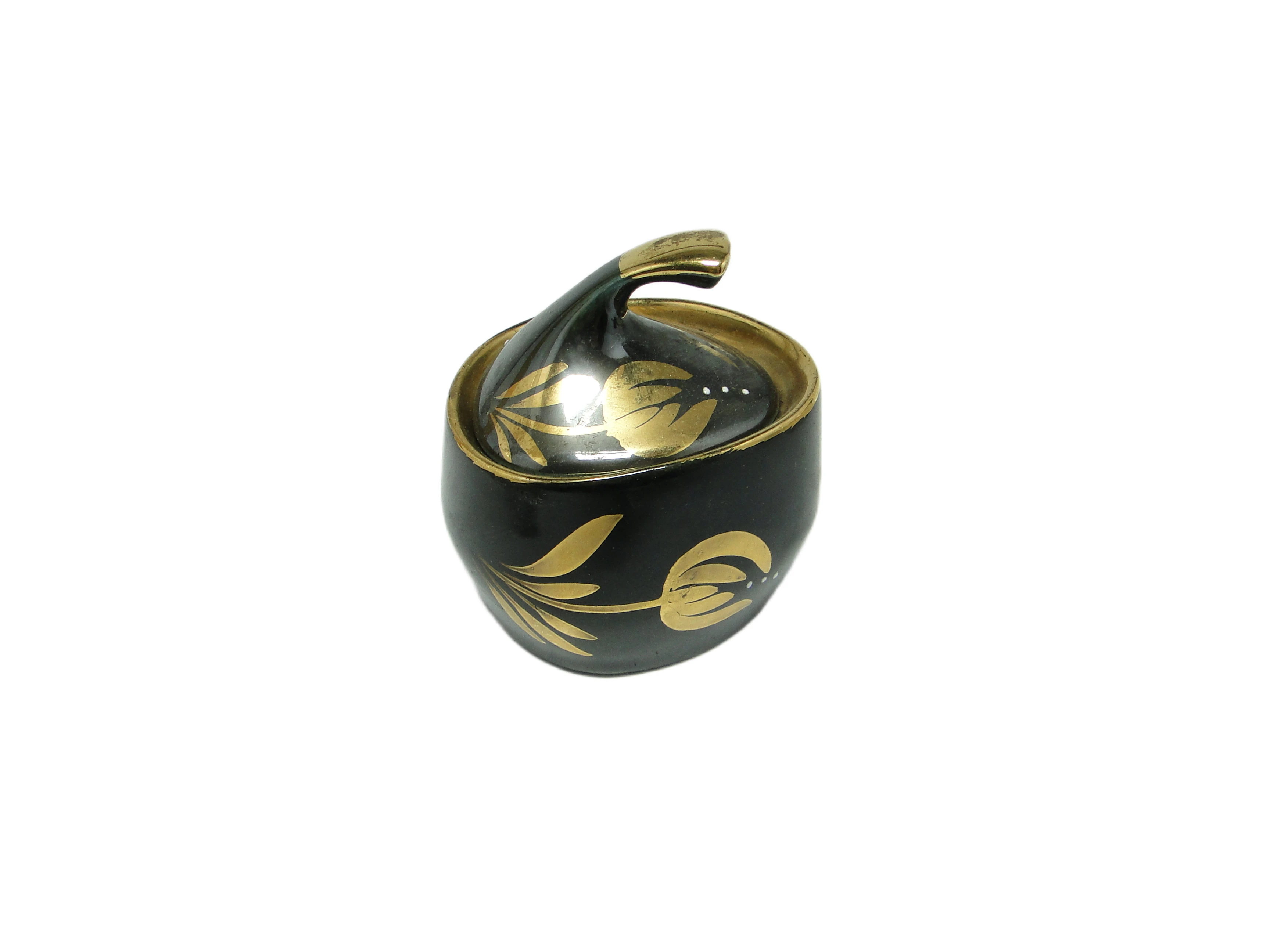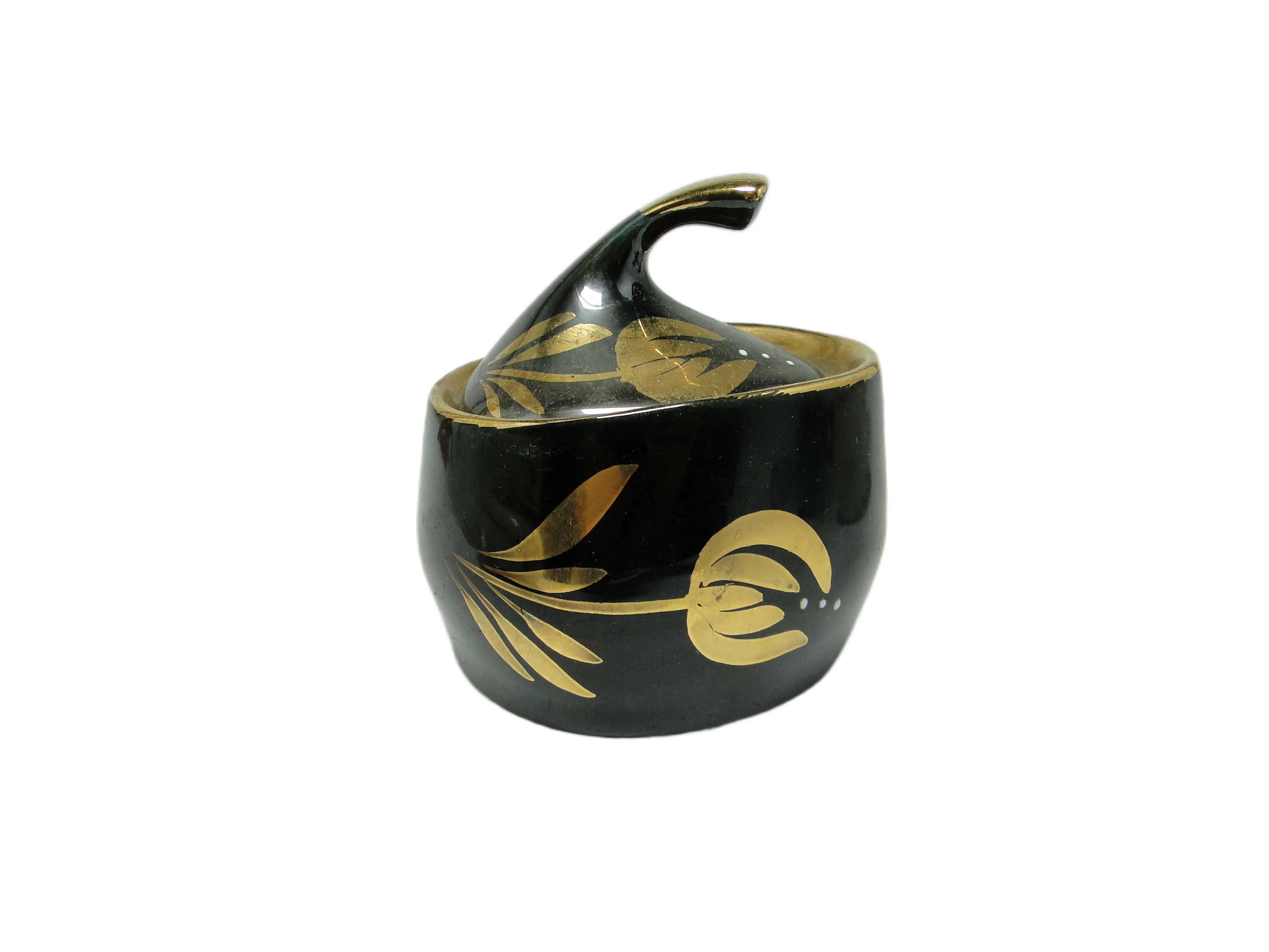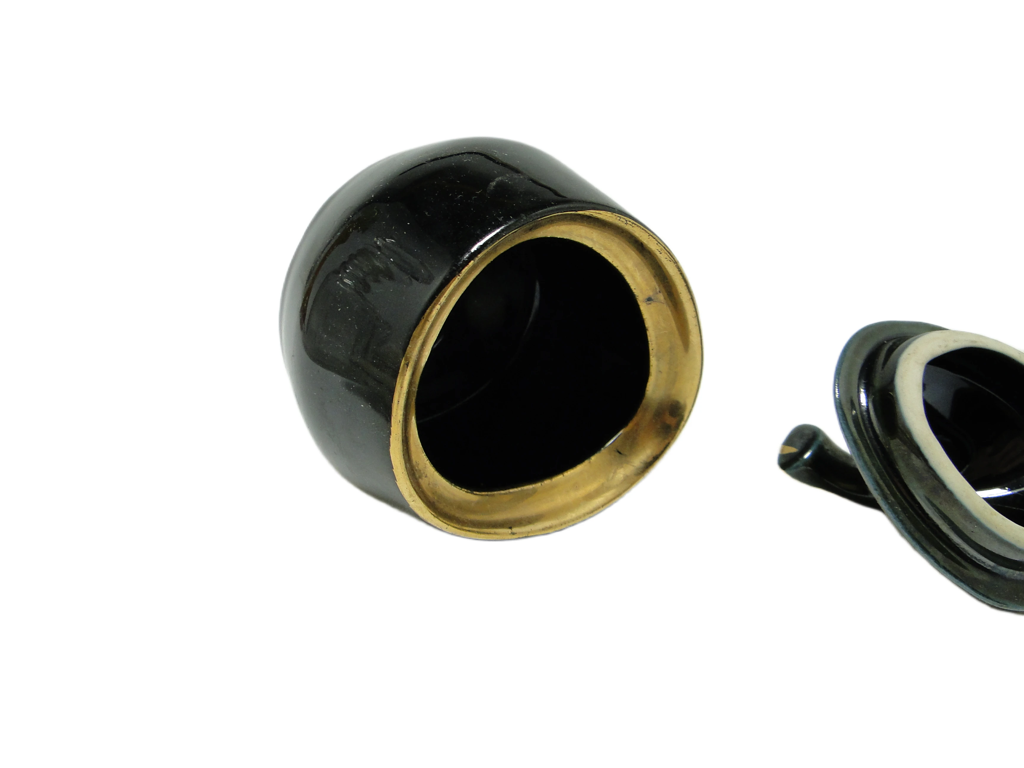 Cukiernica „Iza” z wytwórni Chodzież, wyprodukowana w Polsce w latach 70., wykonana została z porcelany o głębokim, nasyconym czarnym kolorze i wysokim połysku. Zarówno korpus, jak i pokrywkę zdobią nieregularne złote aplikacje, naniesione techniką tamponażu – tworzą dynamiczny, organiczny wzór, który przypomina marmurkowanie lub subtelne spękania. Charakterystycznym elementem jest asymetryczny, wygięty ku górze uchwyt pokrywki, również zaakcentowany złotym detalem. Forma naczynia pozostaje zwarta, o miękkiej, płynnej linii i lekko nieregularnej sylwetce, typowej dla późnego modernizmu i nurtu mid-century modern. Porcelana jest jednolicie gładka, z błyszczącym wykończeniem, a złote zdobienia rozkładają się równomiernie po powierzchni. Stan zachowania bardzo dobry – brak przebarwień, ubytków czy śladów użytkowania.W tej cukiernicy słychać głos śmiałego modernizmu przełomu lat 60. i 70., gdy polska porcelana szukała nowych środków wyrazu. Głęboka czerń połyskuje niczym tafla lakieru, a złote ornamenty opowiadają o eksperymentach z fakturą i światłem. Asymetryczny uchwyt sugeruje ruch, jakby cała forma była w nieustannym dialogu z otoczeniem – naczynie zaprasza do wspólnego rytuału, celebruje codzienność i pamięta czasy, gdy kontrast i dotyk wyznaczały kierunki w projektowaniu użytkowym.Cukiernica „Iza” może zostać wyeksponowana na nowoczesnej tacy z drewna lub stali, gdzie stworzy wyraźny akcent na tle jasnego obrusu czy minimalistycznej zastawy. Dobrze sprawdzi się w aranżacjach mid-century modern – obok filiżanek o prostych liniach lub szklanych naczyń w odcieniach bursztynu. Można ją zestawić z dekoracyjną paterą lub wazonem w złocie, by podkreślić szlachetność aplikacji. Wniesie kolekcjonerski ton do salonu lub jadalni, szczególnie w towarzystwie innych polskich albo środkowoeuropejskich porcelan vintage.