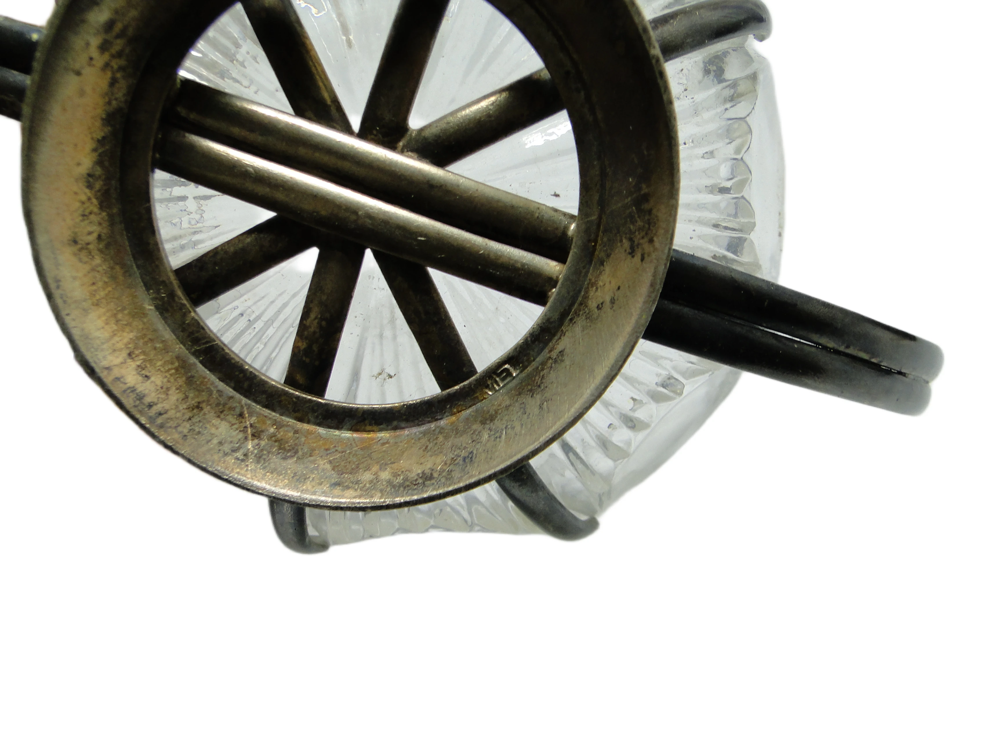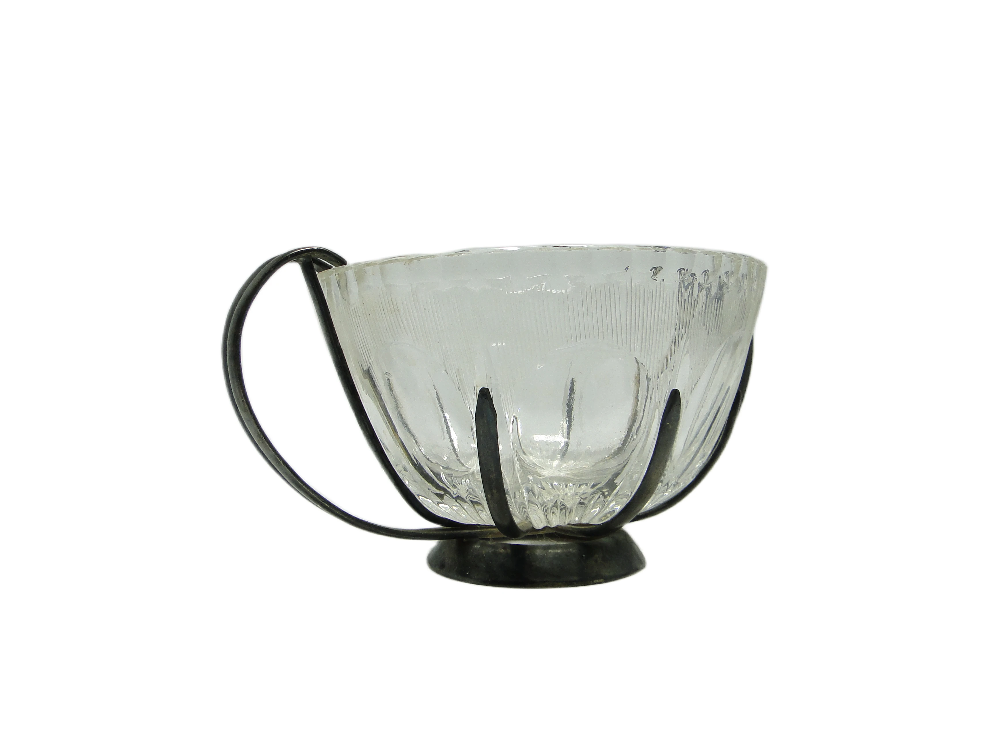Cukiernica z lat 60., wyprodukowana w Polsce, prezentuje estetykę mid-century modern w codziennym przedmiocie stołowym. Transparentne, tłoczone szkło o chłodnym tonie zdobią pionowe żłobienia i geometryczne fasety, które rozpraszają światło i tworzą dynamiczne refleksy. Misa osadzona jest w ramie z posrebrzanego mosiądzu: dwa duże, łukowate uchwyty i cztery pionowe wsporniki obejmują szkło, a całość wspiera okrągła, stabilna podstawa z tego samego materiału. Matowe, lekko spatynowane wykończenie metalu podkreśla vintage’owy charakter. Konstrukcja jest solidna, z wyważonymi proporcjami – szeroka, otwarta misa kontrastuje ze smukłymi uchwytami. Stan zachowania bardzo dobry: szkło wolne od wyszczerbień i pęknięć, metal z minimalną, równomierną patyną, bez istotnych uszkodzeń czy śladów intensywnego użytkowania.Forma tej cukiernicy przywołuje głos lat 60., gdy pragmatyzm i nowoczesność spotykały się w przedmiotach codziennego użytku. Transparentne szkło i chłodny metal opowiadają o stołowych rytuałach, gdzie światło łagodnie załamuje się na fasetach, a matowe uchwyty sugerują obecność kunsztu rzemieślniczego. To naczynie, które z jednej strony zachowuje dyskretną powściągliwość epoki, z drugiej – wprowadza do wnętrza subtelną nostalgię i dbałość o detal.Cukiernicę można wyeksponować na klasycznej tacy z chromowanej stali lub marmuru, zestawiając ją z porcelanowymi filiżankami o prostym wzorze, bądź innymi naczyniami z lat 60. Dobrze sprawdzi się w salonie na stoliku kawowym, gdzie odbije światło dzienne, lub w jadalni w otoczeniu szkła i metalu – minimalistyczne dzbanki lub kolekcjonerskie wazony dopełnią jej charakter. Można połączyć ją z neutralną paletą wnętrza lub zastosować lniane serwetki i bawełniany obrus, by wydobyć ponadczasowy wdzięk i harmonijnie wpisać ją w kolekcjonerskie lub nowoczesne aranżacje.