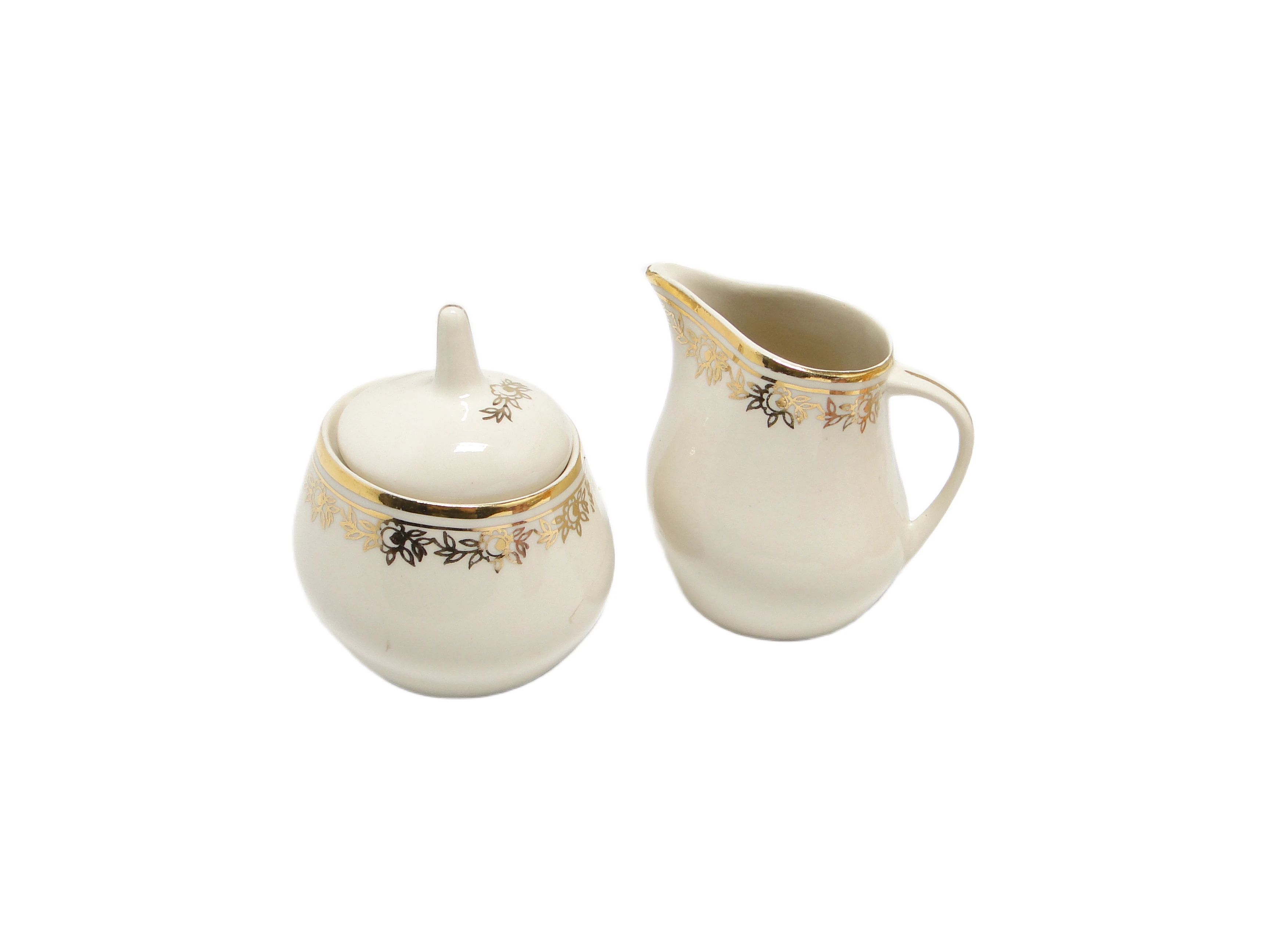 Cukiernica i mlecznik z kolekcji „Ewa” pochodzą z Polski, z lat 70. XX wieku. Zestaw wykonany jest z porcelany w odcieniu ivory white o mleczno-kremowej tonacji, szkliwionej na wysoki połysk. Cukiernica ma pękatą sylwetkę z dopasowaną pokrywką i smukłym uchwytem, natomiast mlecznik wyróżnia się łagodnie wygiętym profilem, wyrazistym dzióbkiem i subtelnie profilowanym uchem. Oba elementy zdobi delikatny fryz kwiatowy w czerni i złocie, biegnący wokół górnej części, a także ręcznie nakładane złote pasy przy krawędziach oraz detale na uchwycie i dzióbku. Proporcje naczyń odwołują się do estetyki mid-century modern, gdzie organiczne linie i wyważona dekoracyjność łączą się z funkcjonalnością. Powierzchnia porcelany jest jednolita, bez widocznych uszkodzeń czy przebarwień; zdobienia złotem są kompletne. Zestaw zachowany w bardzo dobrym stanie, bez śladów intensywnego użytkowania i oznak renowacji.W tych porcelanowych formach pobrzmiewa głos polskich lat 70., gdy codzienność zyskiwała odświętną oprawę dzięki detalowi i jakości wykończenia. Subtelny fryz kwiatowy przywołuje wspomnienie domowych spotkań, gdzie każdy gest nalewania mleka czy podawania cukru miał swoje miejsce w rytuale gościnności. Lśniące złote pasy odbijają światło, jakby naczynia chciały zatrzymać chwilę rozmowy i ciepło stołu – to opowieść o szacunku dla prostych form, w których dekoracja podkreśla, a nie dominuje.Komplet „Ewa” można wyeksponować na klasycznym, drewnianym kredensie lub nowoczesnym stoliku kawowym, zestawiając go z białą porcelaną lub szkłem dla podkreślenia kontrastu i detalu. Dobrze sprawdzi się w otoczeniu stonowanych tekstyliów – lnianych serwet, obrusów – oraz w towarzystwie jednolitej, prostej ceramiki. Wnętrza inspirowane stylem mid-century modern, eklektyczne kolekcjonerskie aranżacje czy salony z nutą vintage – wszędzie tam ten zestaw może być dyskretnym, a jednocześnie wyrazistym akcentem.Brak szczegółowych danych technicznych producenta. Do pielęgnacji zaleca się delikatne mycie ręczne, szczególnie ze względu na ręcznie aplikowane złocenia i szkliwioną powierzchnię. Należy unikać agresywnych detergentów i zmywarek, aby zachować trwałość dekoracji oraz połysk porcelany.