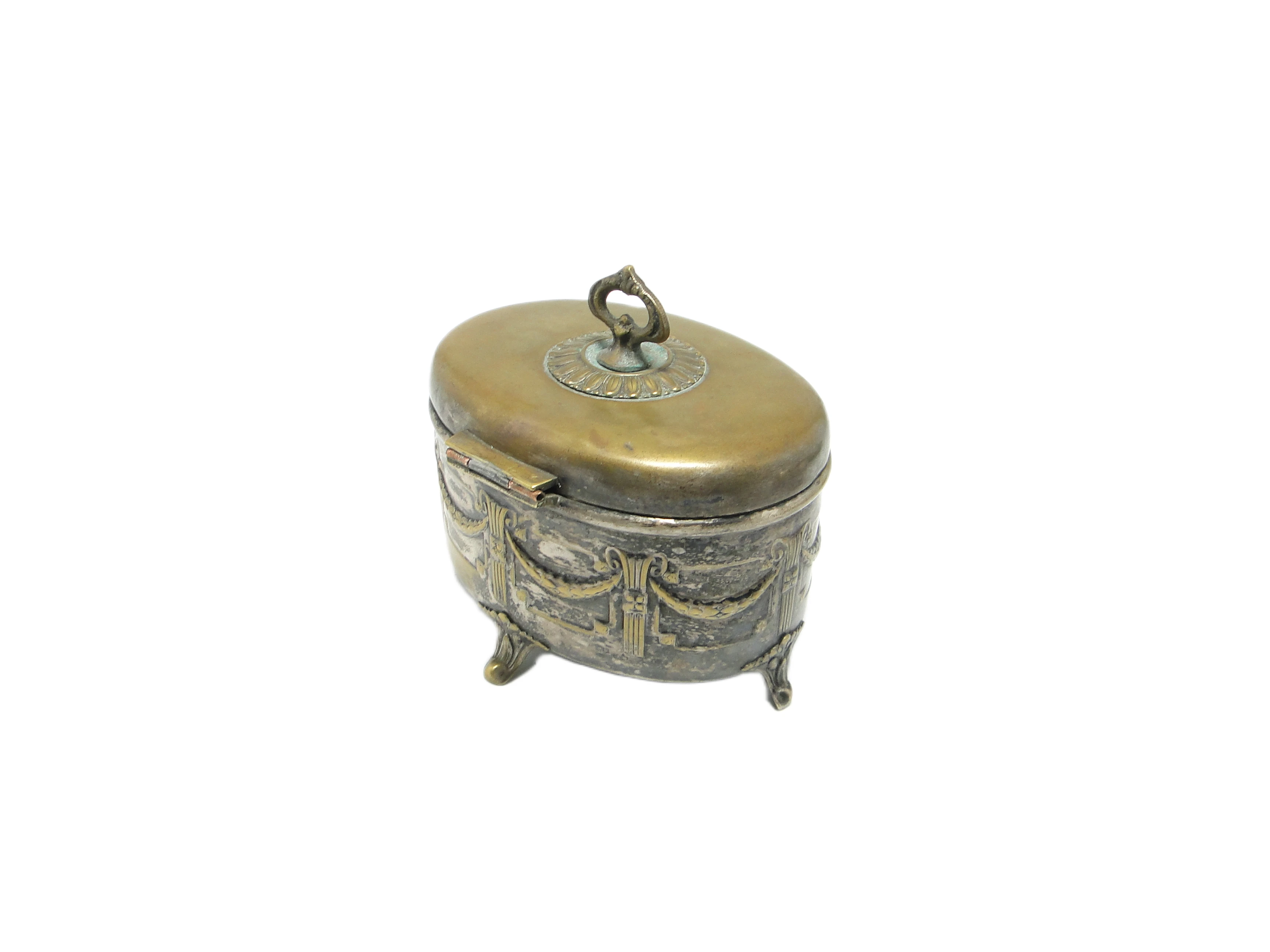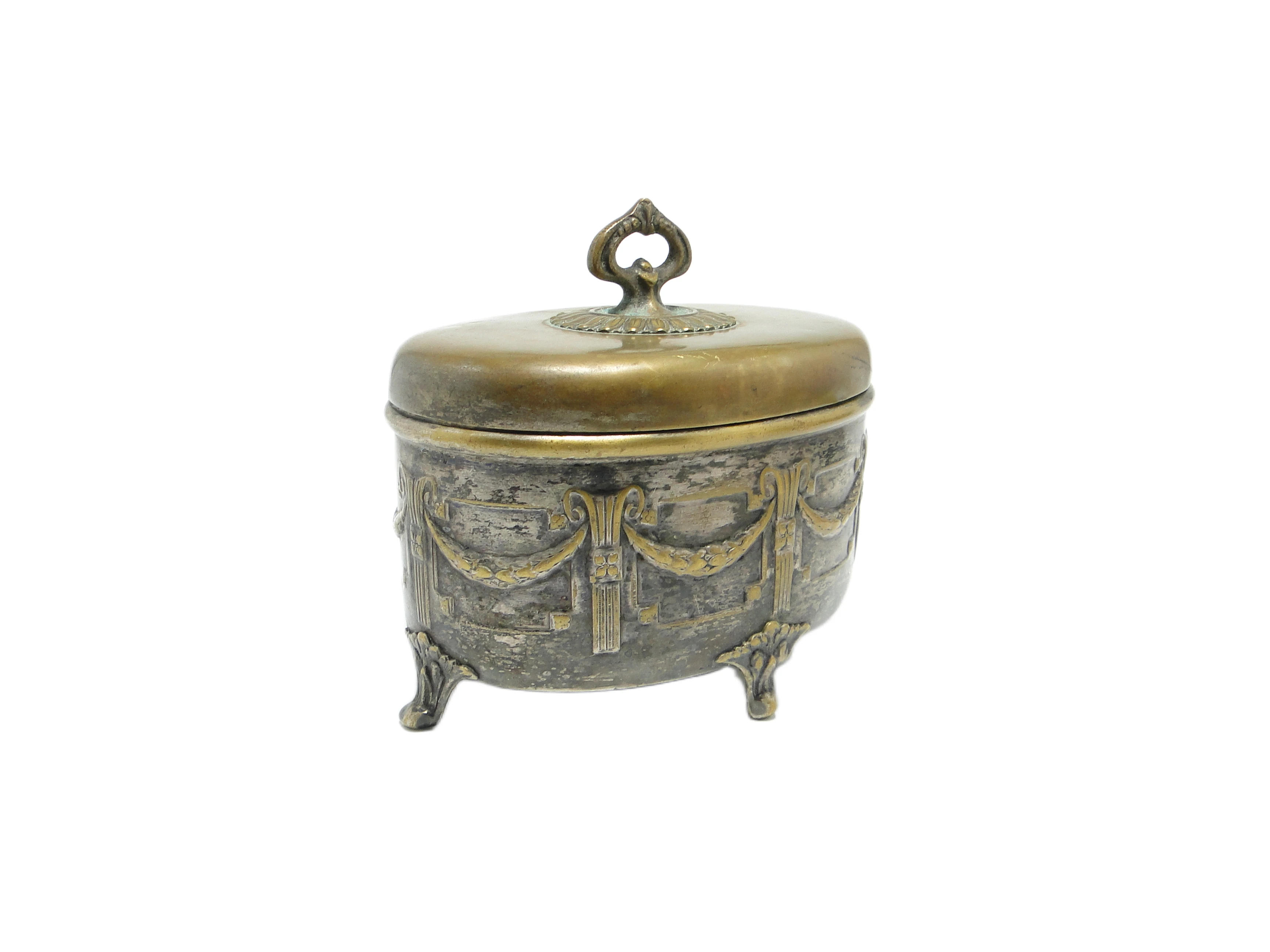 Cukiernica neoklasycystyczna powstała w Austrii pod koniec XIX wieku, wykonana z mosiądzu pokrytego srebrzeniem. Jej powierzchnię charakteryzuje ciepły, przygaszony odcień złota, z widocznymi przetarciami, przez które przebija metaliczny mosiądz, tworząc wyrazistą patynę. Forma harmonijna, oparta na masywnym, zaokrąglonym korpusie wspartym na trzech dekoracyjnych nóżkach stylizowanych na muszle. Pokrywę wieńczy ażurowy uchwyt, a całość zdobią reliefowe girlandy i wstęgi typowe dla neoklasycystycznej stylistyki. Przeważa matowe wykończenie, z delikatnym połyskiem na wypukłych detalach. Proporcje pozostają zrównoważone, a detale wykończone z dbałością o rzemieślniczy kunszt. Na powierzchni widoczne są ślady upływu czasu: patyna, przetarcia, drobne rysy. Wszystkie elementy dekoracyjne są kompletne, bez poważnych uszkodzeń konstrukcyjnych. Stan zachowania: dobry – przedmiot nosi ślady użytkowania, które podkreślają jego autentyczność.Ta cukiernica przenosi do świata salonów końca XIX wieku, gdzie dążenie do harmonii i porządku wyrażało się także w codziennych przedmiotach. Reliefowe girlandy i wstęgi przywołują ducha epoki, gdy nawet drobny akcent zastawy pełnił funkcję symbolicznego rytuału. Patyna i przetarcia świadczą o licznych spotkaniach przy stole, o rękach, które z troską sięgały po cukier, o cichych rozmowach i uroczystych chwilach domowego życia – każdy detal zdaje się szeptać o dawnej elegancji i szacunku dla rzemiosła.Cukiernicę można wyeksponować na konsoli, klasycznej serwantce lub wśród porcelany i ciętego szkła, tworząc spójną kompozycję inspirowaną końcem XIX wieku. Doskonale sprawdzi się także w eklektycznych wnętrzach, gdzie jej neoklasycystyczny charakter podkreślą tkaniny o wyraźnej fakturze, marmurowe blaty czy świeczniki z epoki. Warto połączyć ją z ciemnym drewnem i subtelnym światłem, by wydobyć głębię patyny i reliefowych zdobień.