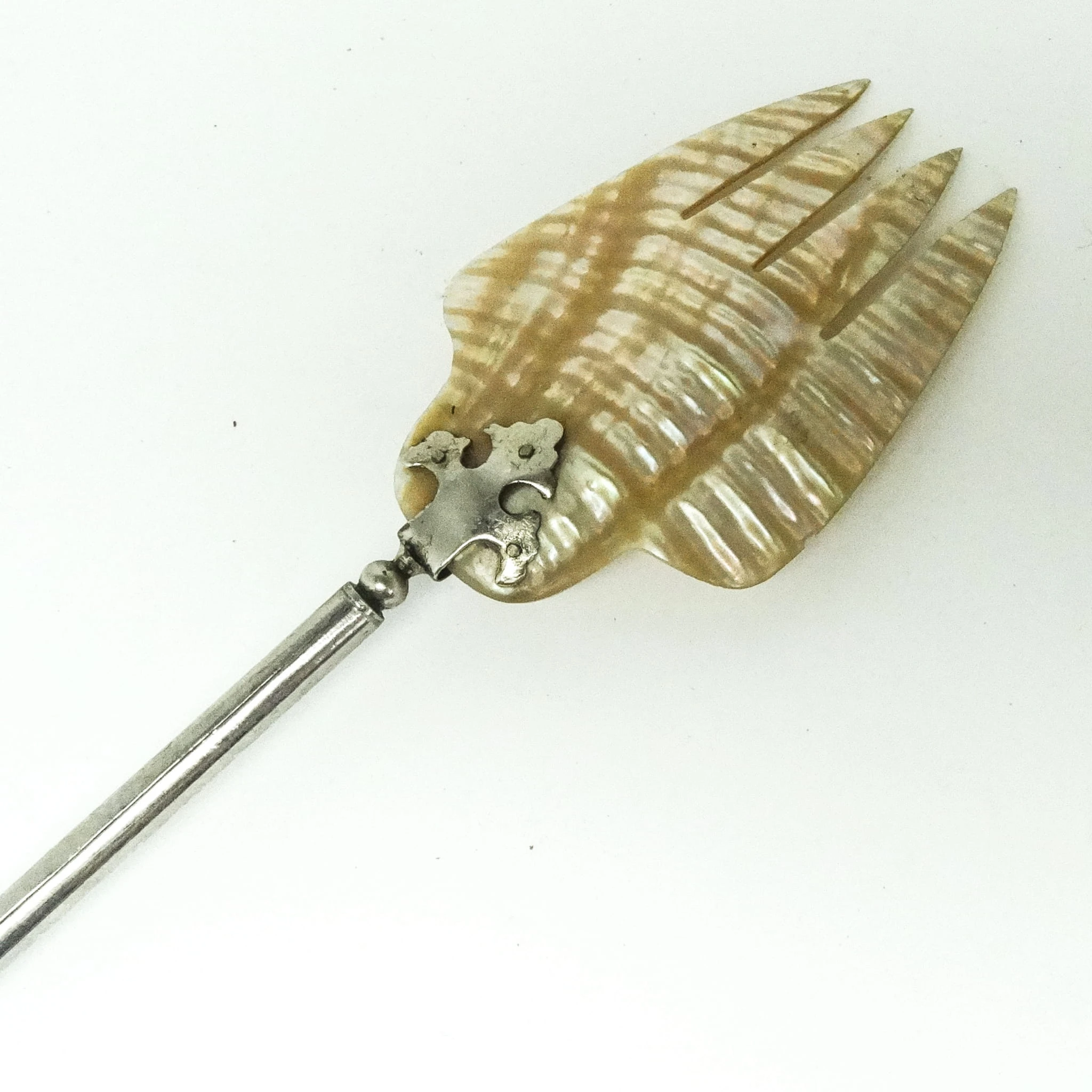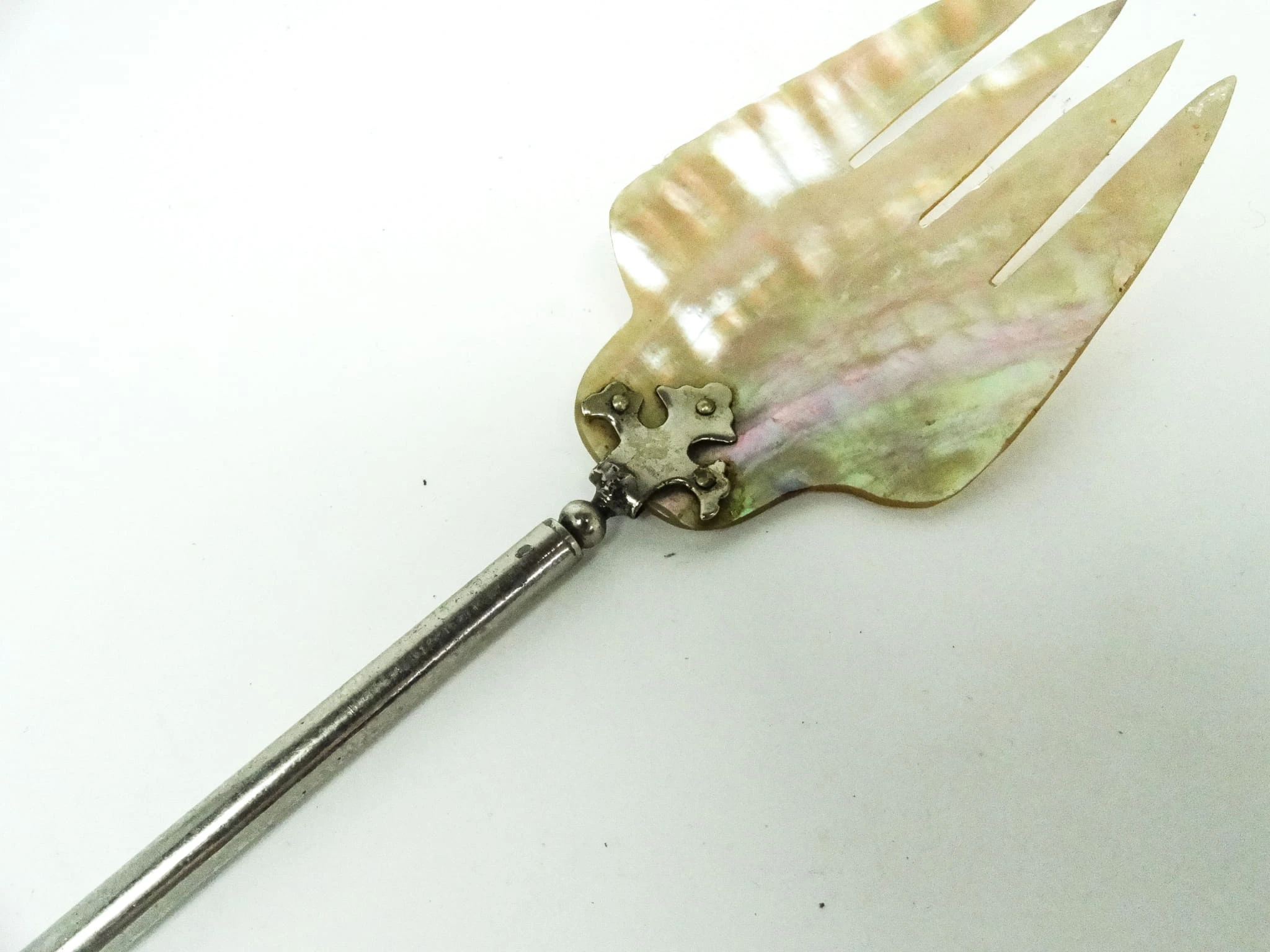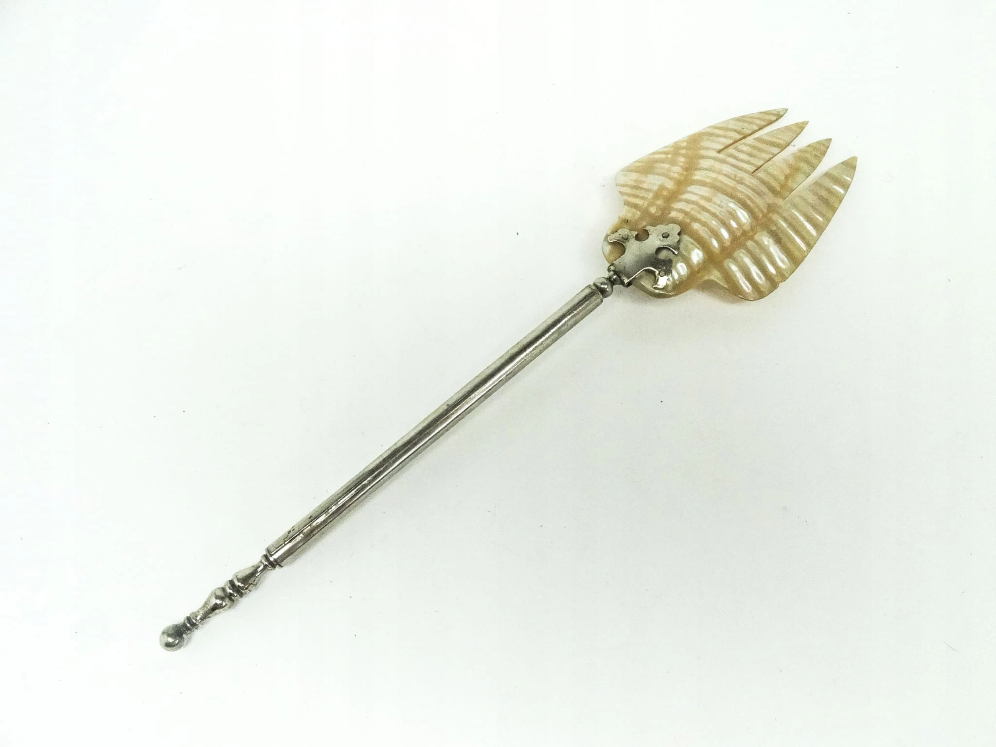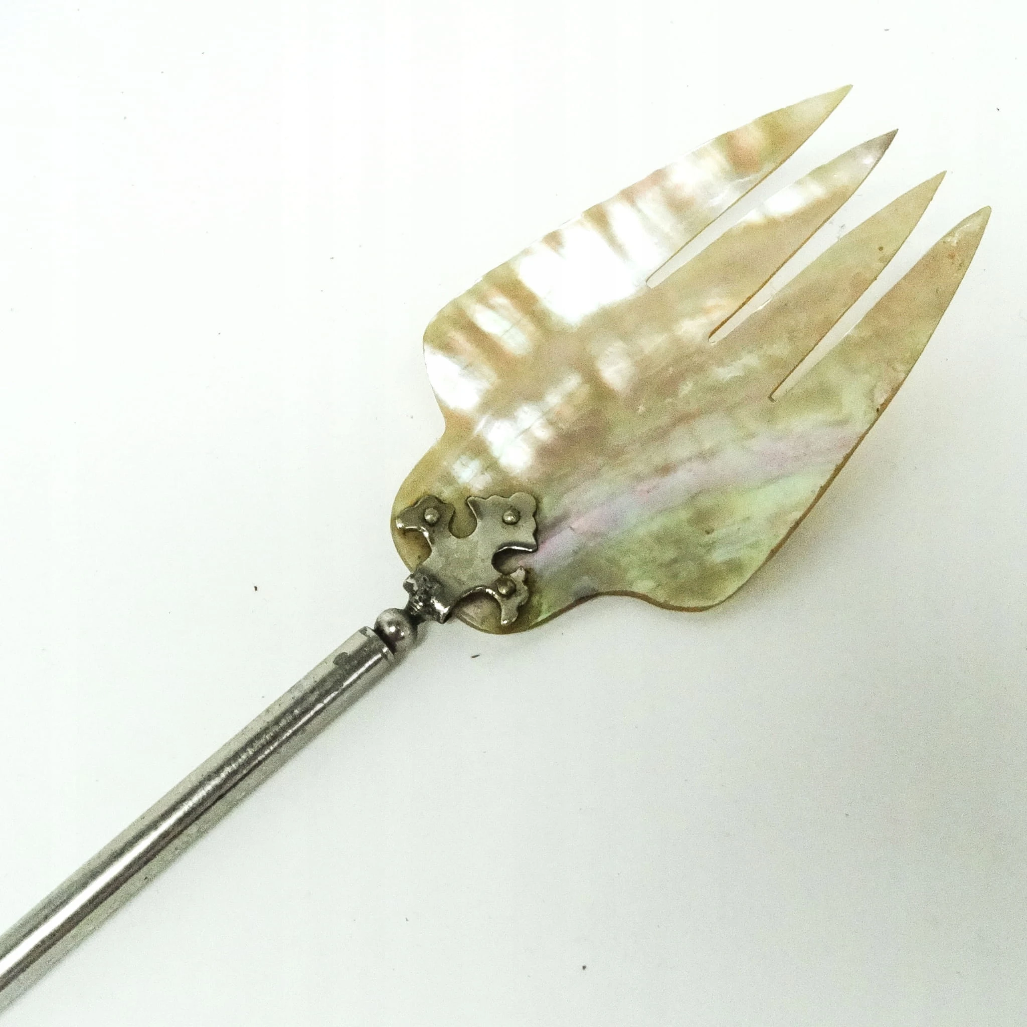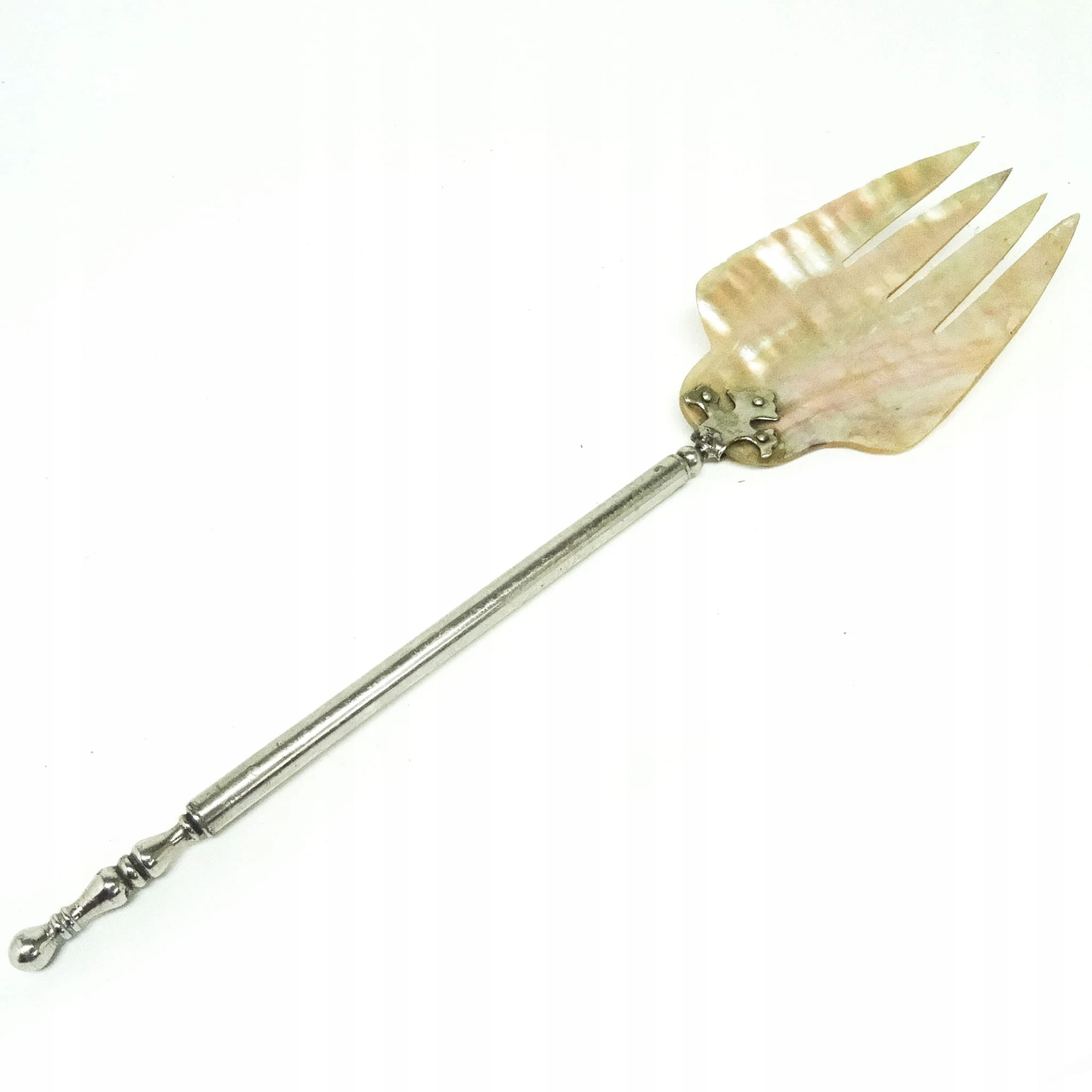 Czerpak do kawioru wykonany z muszli oraz mosiądzu platerowanego wykonany został na początku XX wieku w Niemczech. Stan bardzo dobry.