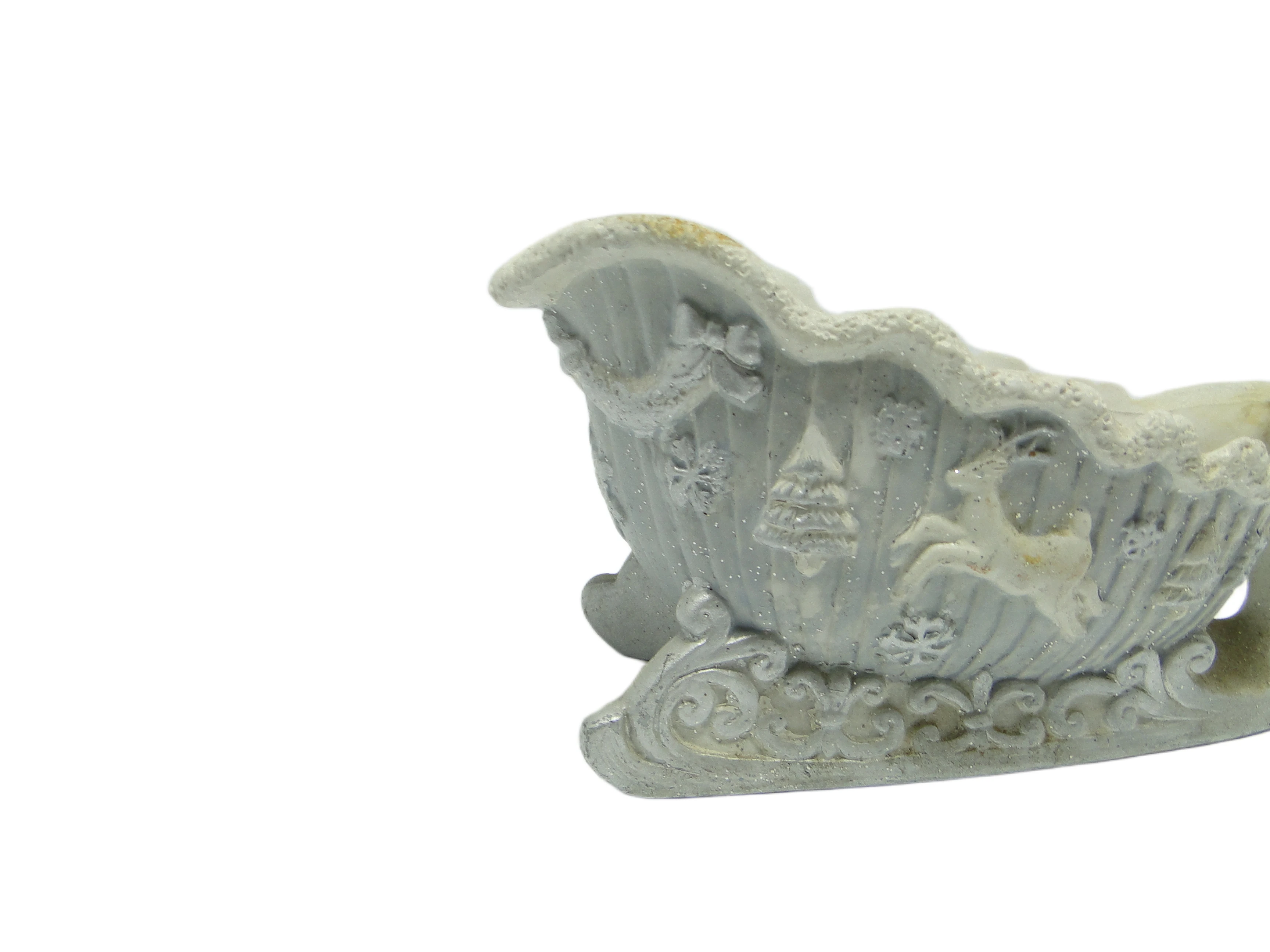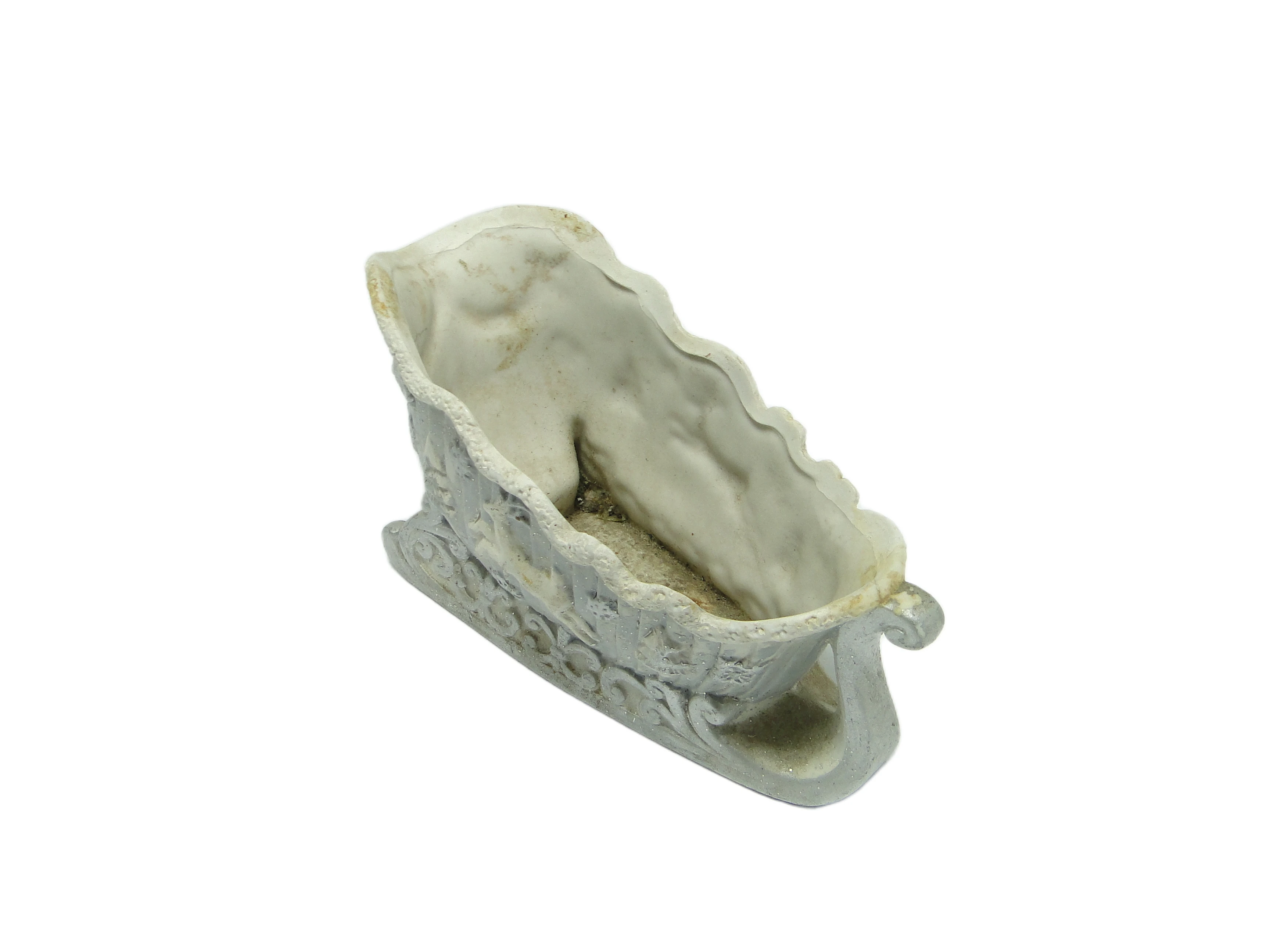 Donica ceramiczna z Polski z lat 90. przyciąga wzrok nietypową formą inspirowaną saniami, z masywnym uchwytem i spiralnymi płozami. Korpus wykonany z ceramiki w chłodnym, jasnoszarym odcieniu z lekką domieszką niebieskiego, pokryty został matowym, nakrapianym szkliwem, które imituje efekt oszronienia. Powierzchnię zdobią wyraźne reliefy: renifery, stylizowane choinki, śnieżynki oraz ślimacznice i ornamenty roślinne, przywodzące na myśl świąteczną ceramikę z połowy XX wieku. Zintegrowany uchwyt jest wygięty w łagodny łuk, zapewniając funkcjonalność i równowagę wizualną. Reliefy są precyzyjnie wykończone, a całość zachowuje solidność konstrukcji. Na krawędziach i podstawie widoczna jest delikatna patyna oraz przebarwienia, charakterystyczne dla autentycznych przedmiotów vintage. Stan zachowania bardzo dobry – widoczne są jedynie subtelne ślady upływu czasu i naturalnego starzenia się ceramiki.W tej donicy pobrzmiewa echo zimowych dekoracji z domów lat 70. Jej forma, inspirowana tradycyjnymi saniami, opowiada historię rodzinnych świąt, trzasku śniegu pod płozami i miękkiego światła odbijającego się od matowej powierzchni. Każdy relief zdaje się przywoływać obraz dawnych wieczorów, kiedy domowe ozdoby były nie tylko dekoracją, ale także zapisem wspomnień i rodzinnych rytuałów. Motywy roślinne i zwierzęce przenoszą w świat spokojnych, zimowych aranżacji, gdzie każdy detal miał swoje znaczenie.Donicę można wykorzystać jako centralny akcent na komodzie lub stole w salonie, zwłaszcza w aranżacjach eklektycznych, retro czy klasycznych. Warto zestawić ją z gałązkami sosny, suchymi trawami lub minimalistycznym bukietem, aby podkreślić jej zimowy charakter. Dobrze sprawdzi się także w towarzystwie innych dekoracji vintage – szklanych świeczników, mosiężnych figurek czy tkanin o wyrazistej fakturze. Połączenie z grubym lnem lub wełną dodatkowo wydobędzie ziarnistą powierzchnię ceramiki i podkreśli chłodny odcień szarości.