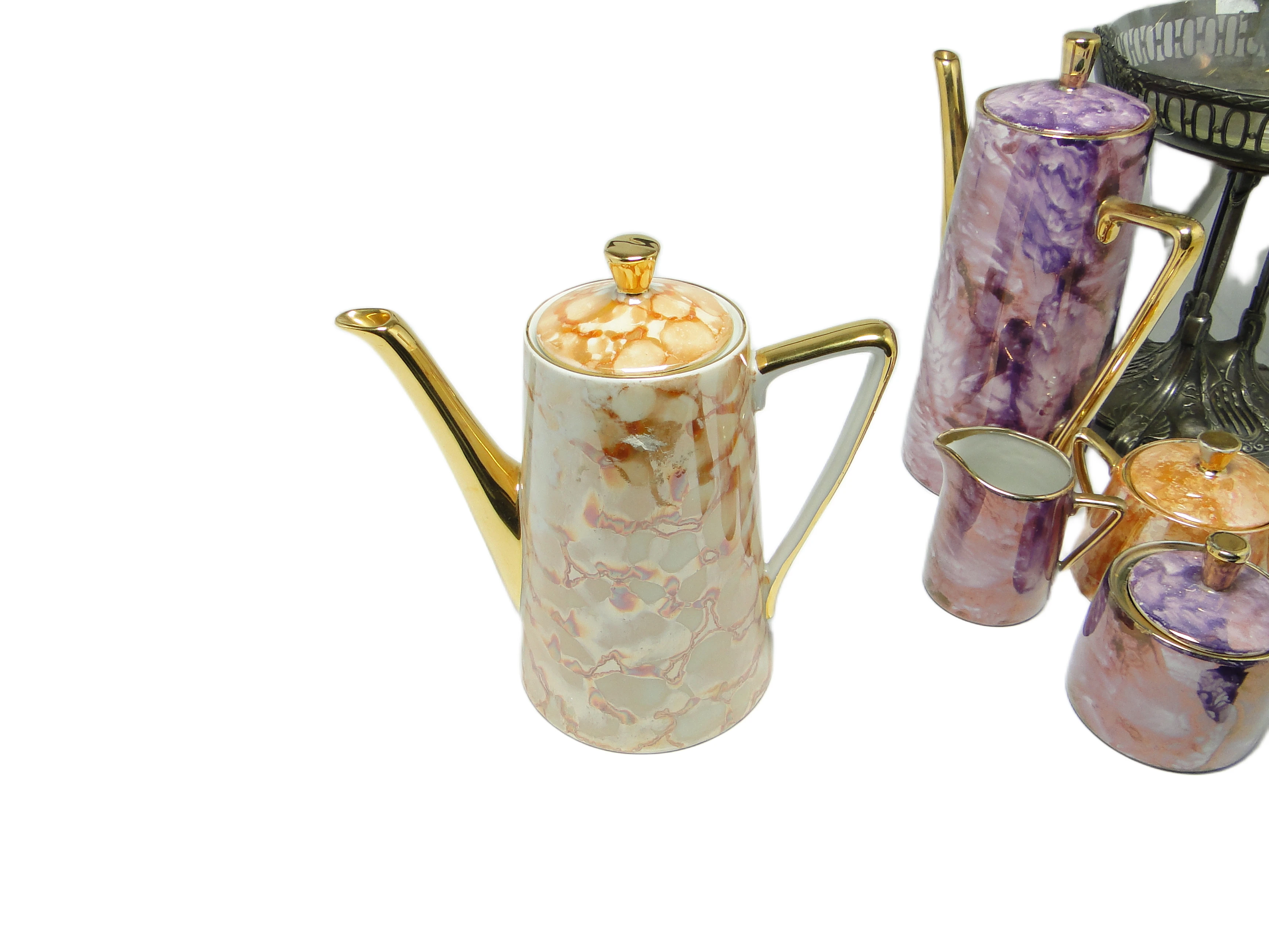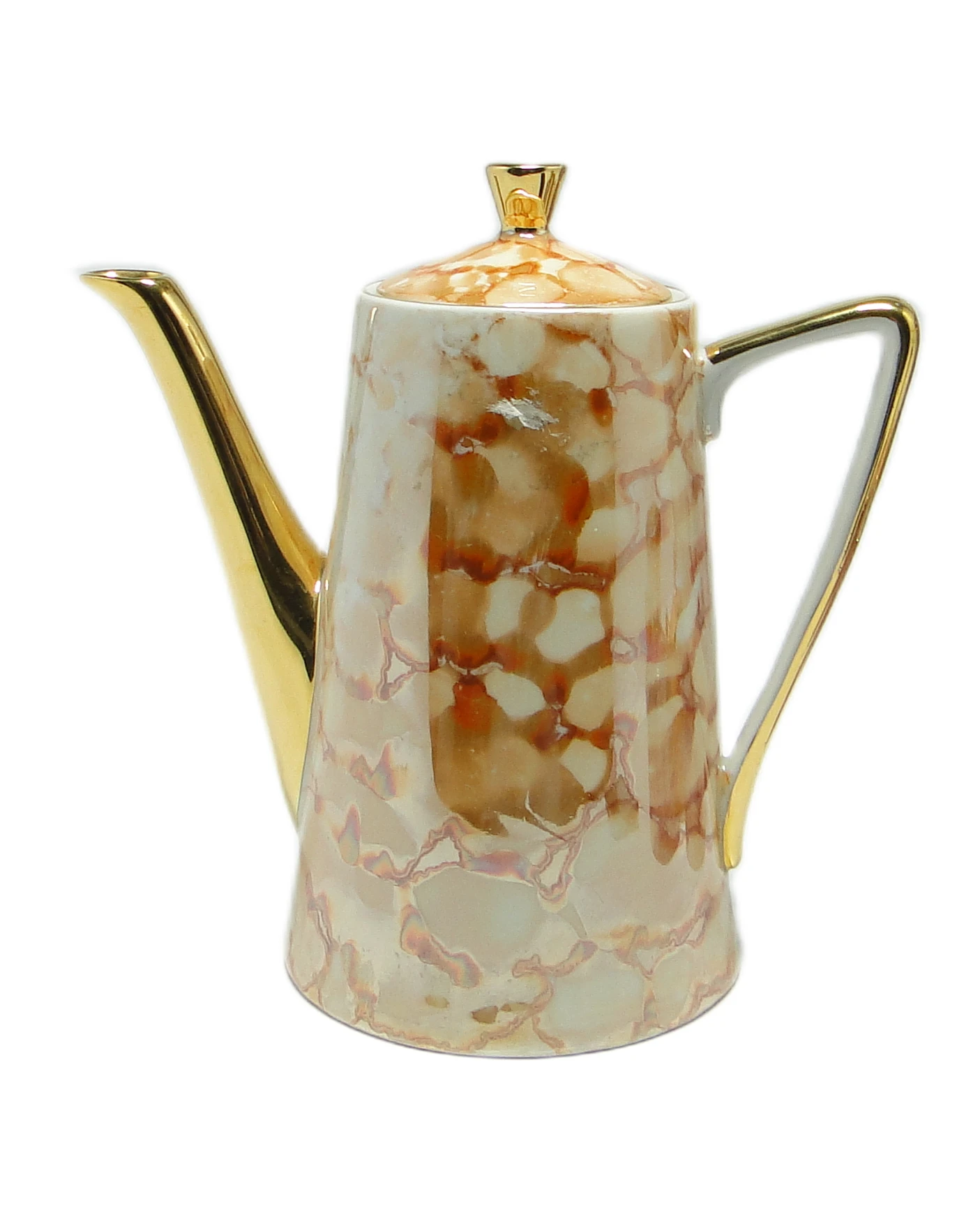Dzbanek Helena (Milenium), pochodzący z wytwórni porcelany Wawel w Polsce, powstał w latach 70. XX wieku. Jego smukła, lekko fasetowana bryła wpisuje się w nurty mid-century modern, akcentując wyważone proporcje i geometryczną linię. Beżowa porcelana została pokryta marmurkowym wzorem w odcieniach kremu i karmelowego brązu, a błyszcząca powierzchnia podkreśla głębię koloru oraz nieregularność wzoru. Uchwyt, dzióbek i gałka pokrywki wykończone zostały metaliczną, złotą glazurą – polerowane detale kontrastują z organiczną strukturą korpusu i podkreślają modernistyczny charakter dzbanka. Porcelana jest gładka i starannie wykończona, bez wyszczerbień, pęknięć ani śladów zużycia. Złocenia są kompletne i nie wykazują oznak ścierania. Stan zachowania: bardzo dobry – brak widocznych oznak użytkowania lub renowacji.Forma dzbanka przywołuje narrację epoki, w której polska porcelana dążyła do harmonii pomiędzy funkcjonalnością a dekoracyjnością. Marmurkowa polewa odzwierciedla fascynację lat 70. eksperymentami z barwieniem masy ceramicznej, a złote akcenty przypominają o domowych ceremoniach, gdzie podanie herbaty czy kawy miało rangę małego rytuału. Ten dzbanek jakby opowiadał o codzienności, w której sztuka użytkowa staje się pretekstem do spotkań, a każdy szczegół – od kanciastego uchwytu po subtelną grę światła na szkliwie – jest nośnikiem nastroju tamtej dekady.Naczynie sprawdzi się zarówno w roli funkcjonalnej, jako część serwisu kawowego lub herbacianego, jak i jako dekoracyjny akcent na półce czy komodzie. Można zestawić go z filiżankami o podobnej stylistyce, szkłem w ciepłych tonacjach lub minimalistyczną ceramiką, aby podkreślić jego unikalny charakter. Dobrze prezentuje się w aranżacjach mid-century modern oraz w eklektycznych wnętrzach kolekcjonerskich, gdzie vintage porcelana staje się częścią opowieści o miejscu. Tło z jasnego drewna lub jednolitej tkaniny pozwoli wydobyć głębię marmurkowego wzoru i połysk złotych detali.
