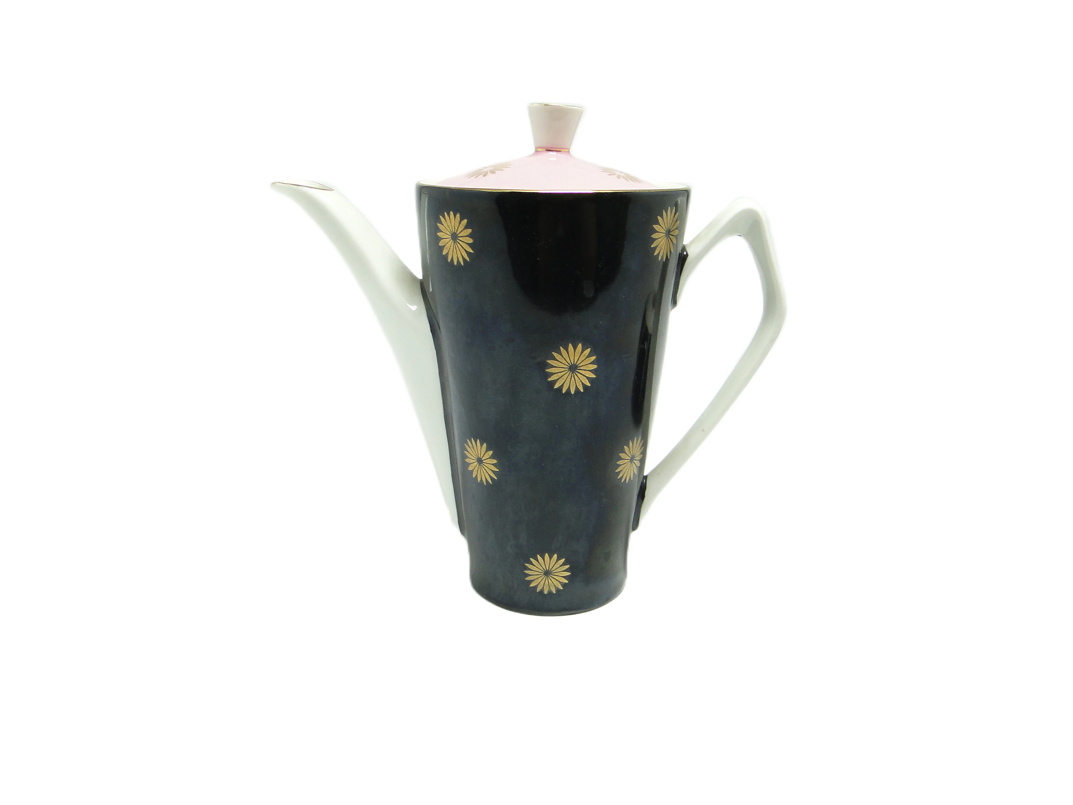 - Dzbanek do kawy wyprodukowany przez wytwórnię Chodzież w Polsce w latach 70. to przykład porcelanowego wzornictwa mid-century modern. Korpus utrzymany jest w głębokim, chłodnym odcieniu granatu z subtelnym gradientem, ozdobiony powtarzającym się, stylizowanym motywem stokrotek w żółto-złotych tonach. Smukły, wydłużony dzióbek oraz uchwyt o wyrazistej, geometrycznej linii są śnieżnobiałe i kontrastują z ciemnym tłem, podobnie jak biała pokrywka zwieńczona fasetowanym uchwytem w delikatnie różowym kolorze. Całość charakteryzuje się czystymi liniami, harmonijną proporcją i starannym wykończeniem, typowym dla polskich wyrobów porcelanowych tego okresu. Dzbanek łączy funkcję użytkową z dekoracyjną, a jego precyzyjna konstrukcja i spójność detali podkreślają wysoką jakość rzemiosła. Zachowany w bardzo dobrym stanie, bez widocznych śladów użytkowania, uszkodzeń czy renowacji.Forma dzbanka opowiada o polskich latach 70., kiedy codzienność nabierała barw, a wzornictwo miało za zadanie nie tylko służyć praktycznie, lecz także cieszyć oko. Rytmiczny motyw kwiatowy na granatowym tle przywołuje atmosferę optymizmu i graficznej narracji, która łagodziła surowość tamtych czasów. Połysk porcelany odbija światło, jakby wciąż pamiętał domowe spotkania przy kawie, rozmowy i gesty, które wypełniały wnętrza subtelną radością. Charakterystyczny profil dzbanka i kontrastowe zestawienie barw niosą w sobie echo troski o codzienną estetykę i drobne przyjemności.Dzbanek można wykorzystać jako element serwisu kawowego podczas spotkań w salonie lub jadalni, ale także jako dekoracyjny akcent na półce, komodzie czy w kolekcji ceramiki vintage. Dobrze sprawdzi się w aranżacjach inspirowanych stylem mid-century modern, w towarzystwie prostych, drewnianych mebli lub minimalistycznych dodatków. Można go zestawić z filiżankami w jednolitym kolorze, szklanymi wazonami czy geometrycznymi formami, by podkreślić jego wyrazistą linię i graficzny wzór. W naturalnym świetle szkliwo dzbanka wydobędzie głębię kolorów i struktury porcelany.
