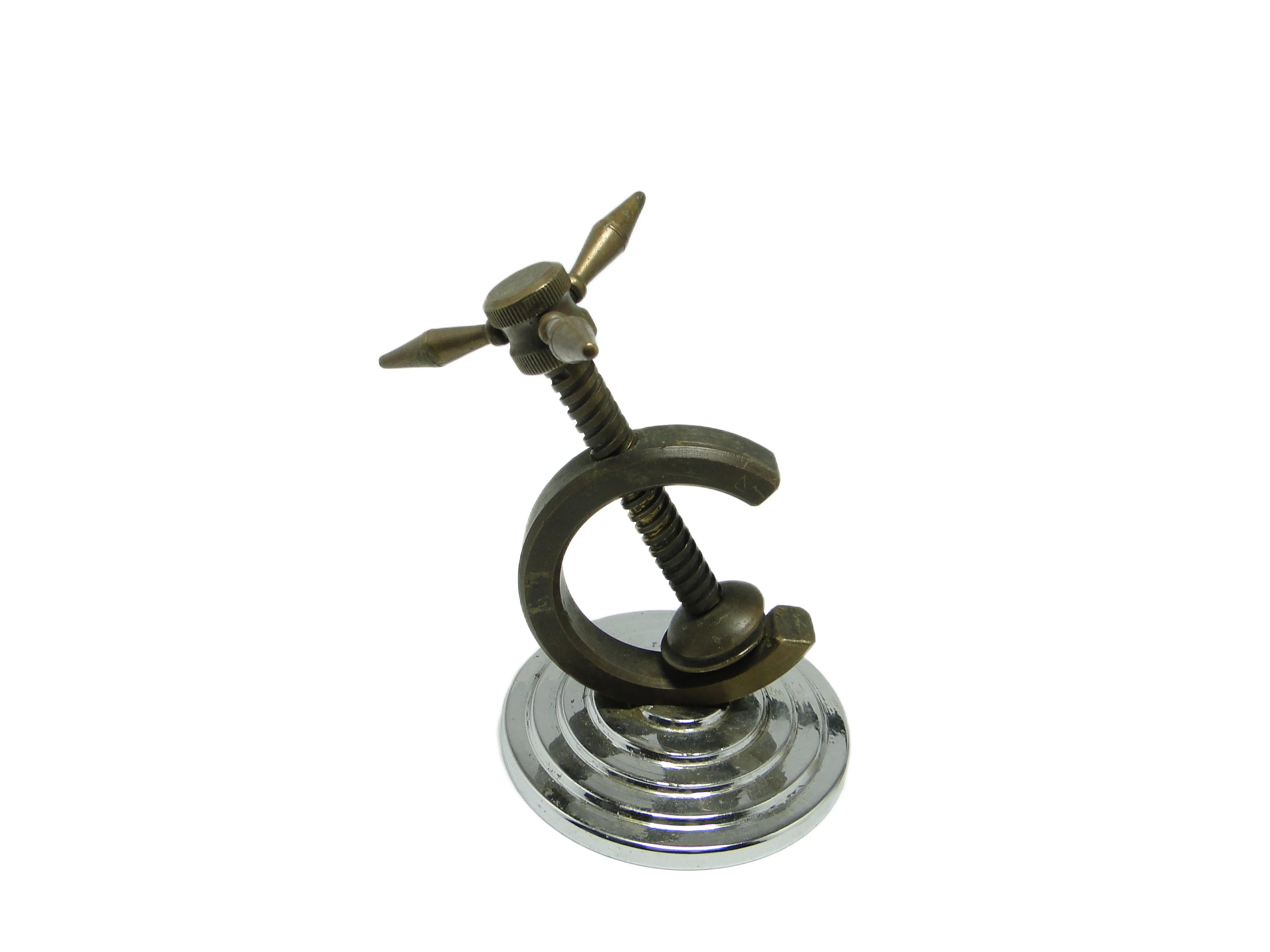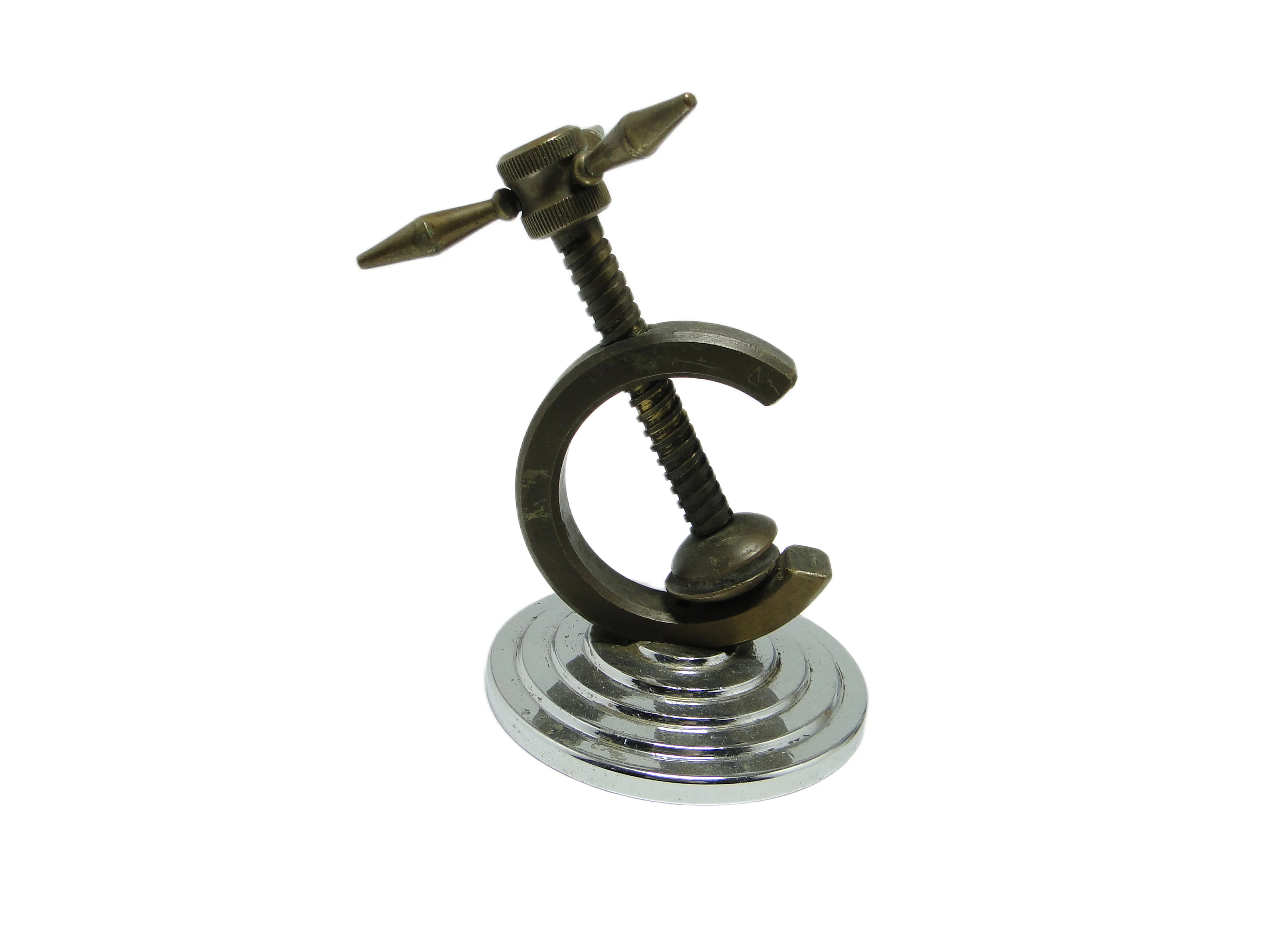 Dziadek do orzechów w stylu Art Deco z lat 30., wykonany w Niemczech, prezentuje połączenie mosiądzu o matowej, ciemnej patynie oraz błyszczącego, chromowanego metalu. Solidna, masywna konstrukcja wykorzystuje śrubowy mechanizm i poprzeczny uchwyt o wyrazistych, geometrycznych zakończeniach. Podstawa, wykończona na wysoki połysk w lustrzanym chromie, uformowana jest w koncentryczny, stopniowany wzór – motyw charakterystyczny dla geometrycznej estetyki epoki. Detale wykonania, takie jak widoczne gwinty i precyzyjna obróbka metalu, podkreślają jakość rzemiosła międzywojennego. Kontrast faktur – matowego, lekko teksturowanego mosiądzu i gładkiego, lśniącego chromu – buduje mocny, industrialny charakter. Stan zachowania bardzo dobry – oryginalne powierzchnie i detale zostały zachowane, widoczne są jedynie minimalne, naturalne ślady czasu typowe dla kolekcjonerskich egzemplarzy sprzed dekad.W tej niewielkiej, funkcjonalnej formie kryje się opowieść o okresie, który łączył nowoczesność z dekoracyjnością. Dziadek do orzechów z lat 30. przemawia językiem niemieckiego modernizmu: oszczędna geometria, zimny połysk metalu i logiczna konstrukcja niosą ducha epoki, w której nawet przedmioty codziennego użytku miały swoją rolę w budowaniu stylu życia. Dotyk chłodnego mosiądzu przywołuje skojarzenia z eleganckimi kawiarniami i apartamentami wielkomiejskiej Europy okresu międzywojennego, gdy funkcjonalność była nieodłączna od estetyki.Obiekt można wyeksponować na konsoli lub niskiej półce w salonie, zestawiając go z ceramiką o prostych liniach lub szkłem, które podkreślą jego geometryczny charakter. Dobrze sprawdzi się zarówno w kolekcjonerskich aranżacjach Art Deco, jak i w eklektycznych przestrzeniach, gdzie kontrastuje z ciepłem ciemnego drewna lub innymi metalicznymi akcentami. Można zestawić go z innymi przedmiotami z lat 20. i 30., aby wydobyć modernistyczny ton, lub połączyć z minimalistycznymi dekoracjami, akcentując jego industrialną genezę.