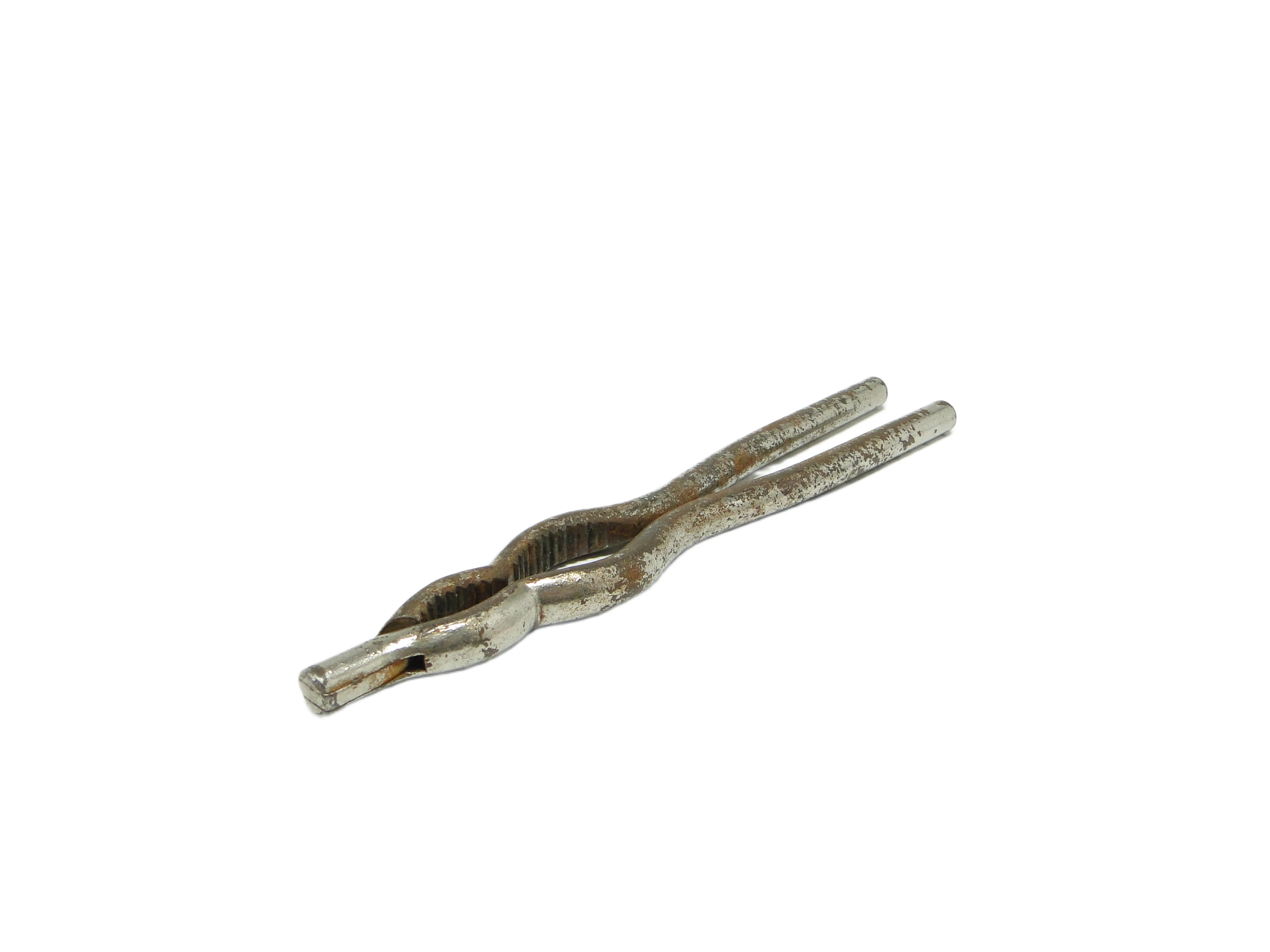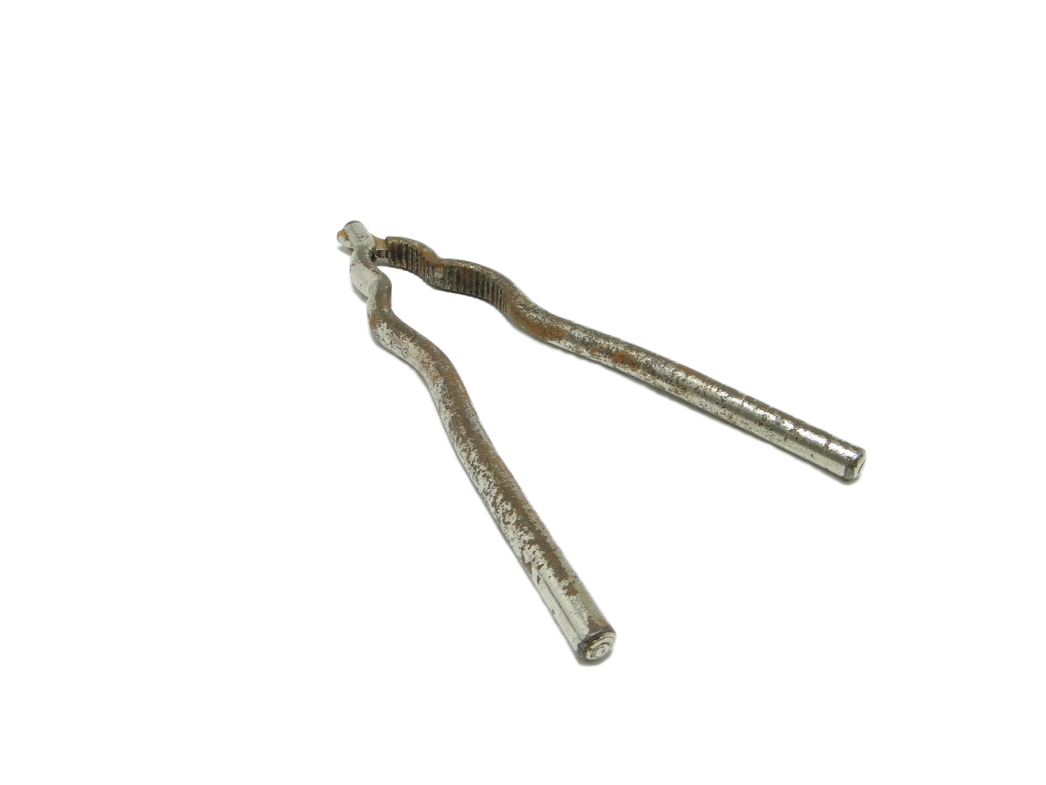 Dziadek do orzechów z lat 50., wykonany w Polsce, stanowi przykład powojennego wzornictwa przemysłowego podporządkowanego zasadom funkcjonalności i trwałości. Całość wykonano ze stali hartowanej o chłodnym, matowym odcieniu srebra. Konstrukcja składa się z dwóch wydłużonych, lekko wygiętych ramion połączonych prostym przegubem, tworząc minimalistyczną, pozbawioną ozdób formę. Strefa chwytająca została wyraźnie żłobiona dla pewniejszego uchwytu i skuteczniejszego rozłupywania orzechów. Powierzchnia nosi ślady patyny, miejscowe przebarwienia, drobne rysy, przetarcia, fragmenty rdzy oraz ubytki powłoki, które podkreślają autentyczność i wiek narzędzia. Końcówki ramion są tępe i widocznie zużyte, jednak całość pozostaje w pełni sprawna i stabilna. Stan zachowania: bardzo dobry jak na wiek produktu, z widocznymi śladami użytkowania i starzenia.W metalowej fakturze tego przedmiotu pobrzmiewa echo powojennej Polski – czasów, gdy codzienność kształtowana była przez surową praktyczność i brak nadmiaru. Dziadek do orzechów nie opowiada o sobie ozdobami, lecz historią dłoni, które go używały. Przebarwienia, zadrapania i patyna to zapis minionych dekad, w których przedmiot ten pełnił swoją funkcję podczas zimowych wieczorów przy rodzinnym stole. Minimalistyczna forma i solidna stal wciąż przypominają o czasach, w których przedmiot miał przede wszystkim służyć – i służy do dziś, przekazując głos epoki skupionej na trwałości i prostocie.Można wykorzystać go jako użytkowy akcent na stole w salonie lub kuchni – zarówno jako sprawne narzędzie, jak i wyrazisty przedmiot kolekcjonerski w duchu vintage. W zestawieniu z innymi stalowymi lub szklanymi dodatkami z lat 50., np. metalową tacą czy szkłem w odcieniu dymionego brązu, podkreśli industrialny charakter aranżacji. Dobrze odnajdzie się we wnętrzach inspirowanych stylem mid-century modern, a także w eklektycznych przestrzeniach kolekcjonerskich, gdzie autentyczna historia przedmiotów buduje niepowtarzalną narrację.
