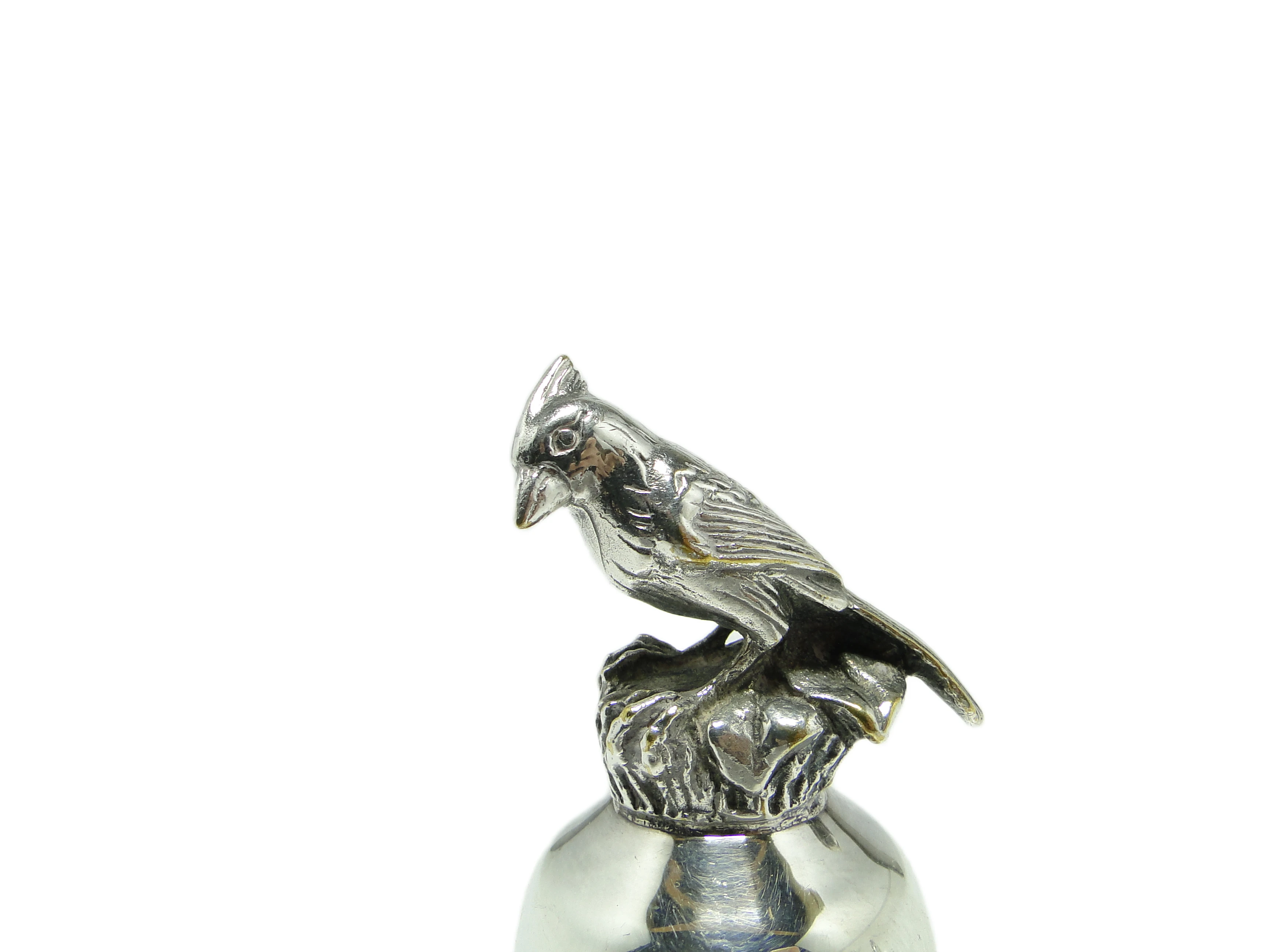 Figuralny dzwonek na służbę z lat 70. został wykonany w Niemczech z chromowanego mosiądzu o intensywnie lustrzanej powierzchni, nadającej całości chłodny, srebrzysty połysk. Zwarty, stożkowy korpus zdobią dwie precyzyjnie grawerowane, równoległe linie u góry. Rękojeść formowana jest w stylizowaną, geometryczną głowę ptaka o kanciastych liniach i wyraźnej teksturze, kontrastujących z gładkością reszty dzwonka. Konstrukcja nie posiada widocznych łączeń czy śrub, a cała powierzchnia utrzymana jest w wysokim połysku, bez matowych czy satynowych fragmentów. Dzwonek zachowany w bardzo dobrym stanie, bez śladów patyny czy wgnieceń – widoczne są jedynie subtelne ślady użytkowania typowe dla wieku.W tej drobnej formie wybrzmiewa głos lat 70., kiedy postmodernizm chętnie łączył zabawny motyw z geometryczną dyscypliną. Gładka, chromowana powierzchnia odbija światło jak tafla szkła, a stylizowana głowa ptaka wydaje się zapraszać do interakcji, przełamując codzienną rutynę nutą ironii i dystansu. Dzwonek zdaje się szeptać o czasie, w którym design nie bał się żartu, a granica między funkcją i dekoracją była płynna.Można zestawić go z szklanymi wazonami lub geometrycznymi świecznikami na konsoli w salonie, gdzie połyskująca powierzchnia dzwonka znajdzie oprawę wśród obiektów o czystych liniach. Sprawdzi się zarówno jako subtelny akcent w kolekcjonerskich, eklektycznych przestrzeniach, jak i w aranżacjach inspirowanych postmodernizmem czy współczesnym minimalizmem. Warto połączyć go z przedmiotami o matowej fakturze lub w chłodnej palecie srebra i szarości, by wydobyć jego żartobliwy, figuralny charakter.