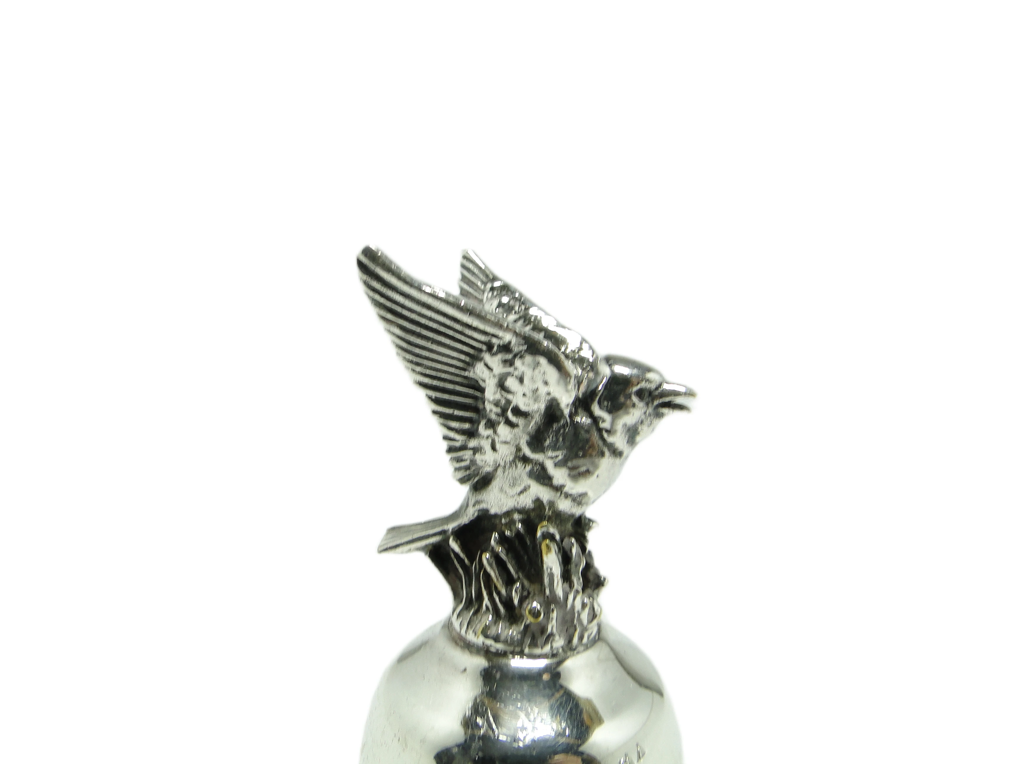 Figuralny dzwonek na służbę z lat 70. został wykonany w Niemczech z chromowanego mosiądzu o intensywnie lustrzanej powierzchni, nadającej całości chłodny, srebrzysty połysk. Zwarty, stożkowy korpus zdobią dwie precyzyjnie grawerowane, równoległe linie u góry. Rękojeść formowana jest w stylizowaną, geometryczną głowę ptaka o kanciastych liniach i wyraźnej teksturze, kontrastujących z gładkością reszty dzwonka. Konstrukcja nie posiada widocznych łączeń czy śrub, a cała powierzchnia utrzymana jest w wysokim połysku, bez matowych czy satynowych fragmentów. Dzwonek zachowany w bardzo dobrym stanie, bez śladów patyny czy wgnieceń – widoczne są jedynie subtelne ślady użytkowania typowe dla wieku.W tej drobnej formie wybrzmiewa głos lat 70., kiedy postmodernizm chętnie łączył zabawny motyw z geometryczną dyscypliną. Gładka, chromowana powierzchnia odbija światło jak tafla szkła, a stylizowana głowa ptaka wydaje się zapraszać do interakcji, przełamując codzienną rutynę nutą ironii i dystansu. Dzwonek zdaje się szeptać o czasie, w którym design nie bał się żartu, a granica między funkcją i dekoracją była płynna.Można zestawić go z szklanymi wazonami lub geometrycznymi świecznikami na konsoli w salonie, gdzie połyskująca powierzchnia dzwonka znajdzie oprawę wśród obiektów o czystych liniach. Sprawdzi się zarówno jako subtelny akcent w kolekcjonerskich, eklektycznych przestrzeniach, jak i w aranżacjach inspirowanych postmodernizmem czy współczesnym minimalizmem. Warto połączyć go z przedmiotami o matowej fakturze lub w chłodnej palecie srebra i szarości, by wydobyć jego żartobliwy, figuralny charakter.