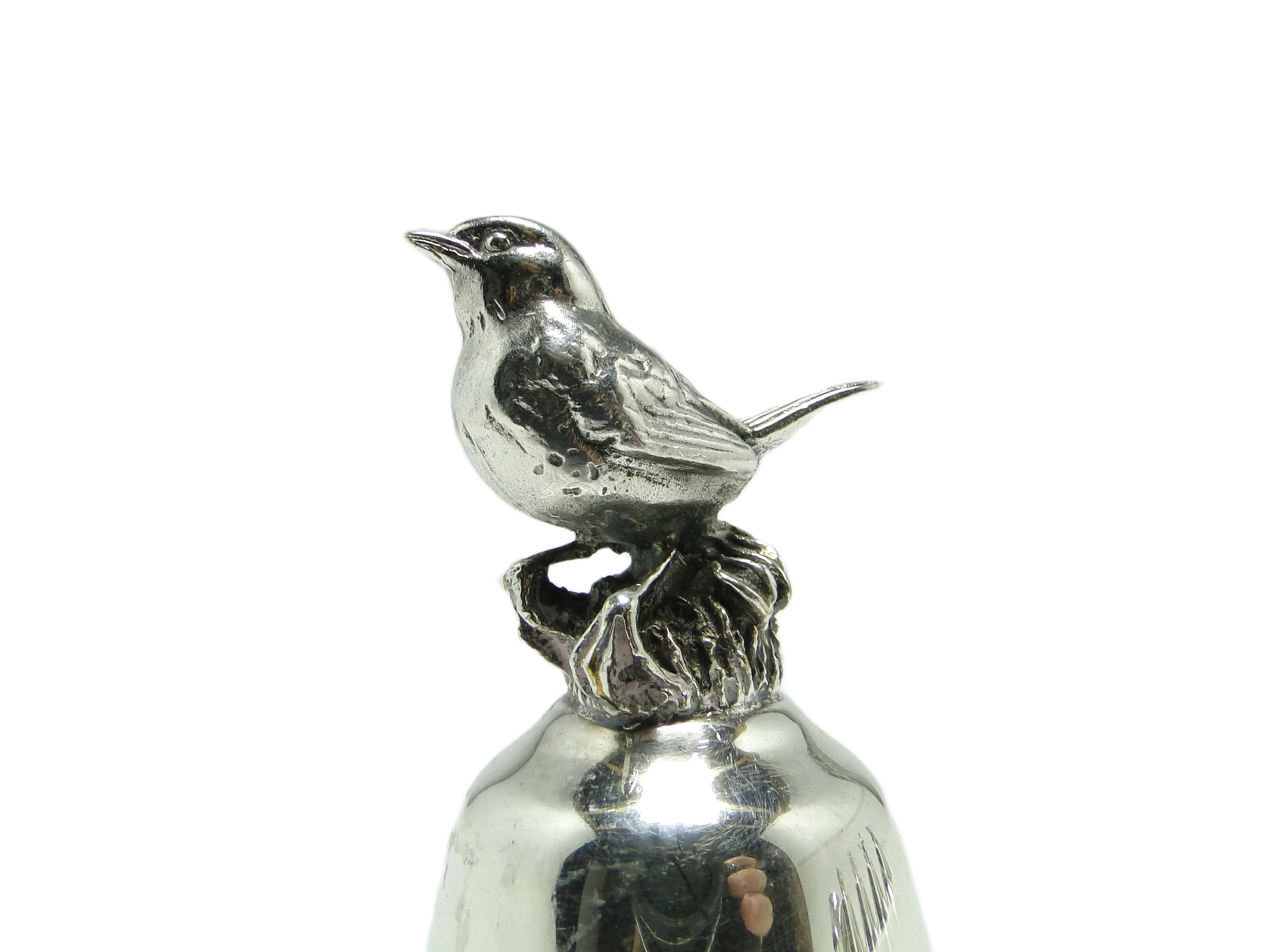 Figuralny dzwonek na służbę z lat 70. został wykonany w Niemczech z chromowanego mosiądzu o intensywnie lustrzanej powierzchni, nadającej całości chłodny, srebrzysty połysk. Zwarty, stożkowy korpus zdobią dwie precyzyjnie grawerowane, równoległe linie u góry. Rękojeść formowana jest w stylizowaną, geometryczną głowę ptaka o kanciastych liniach i wyraźnej teksturze, kontrastujących z gładkością reszty dzwonka. Konstrukcja nie posiada widocznych łączeń czy śrub, a cała powierzchnia utrzymana jest w wysokim połysku, bez matowych czy satynowych fragmentów. Dzwonek zachowany w bardzo dobrym stanie, bez śladów patyny czy wgnieceń – widoczne są jedynie subtelne ślady użytkowania typowe dla wieku.W tej drobnej formie wybrzmiewa głos lat 70., kiedy postmodernizm chętnie łączył zabawny motyw z geometryczną dyscypliną. Gładka, chromowana powierzchnia odbija światło jak tafla szkła, a stylizowana głowa ptaka wydaje się zapraszać do interakcji, przełamując codzienną rutynę nutą ironii i dystansu. Dzwonek zdaje się szeptać o czasie, w którym design nie bał się żartu, a granica między funkcją i dekoracją była płynna.Można zestawić go z szklanymi wazonami lub geometrycznymi świecznikami na konsoli w salonie, gdzie połyskująca powierzchnia dzwonka znajdzie oprawę wśród obiektów o czystych liniach. Sprawdzi się zarówno jako subtelny akcent w kolekcjonerskich, eklektycznych przestrzeniach, jak i w aranżacjach inspirowanych postmodernizmem czy współczesnym minimalizmem. Warto połączyć go z przedmiotami o matowej fakturze lub w chłodnej palecie srebra i szarości, by wydobyć jego żartobliwy, figuralny charakter.