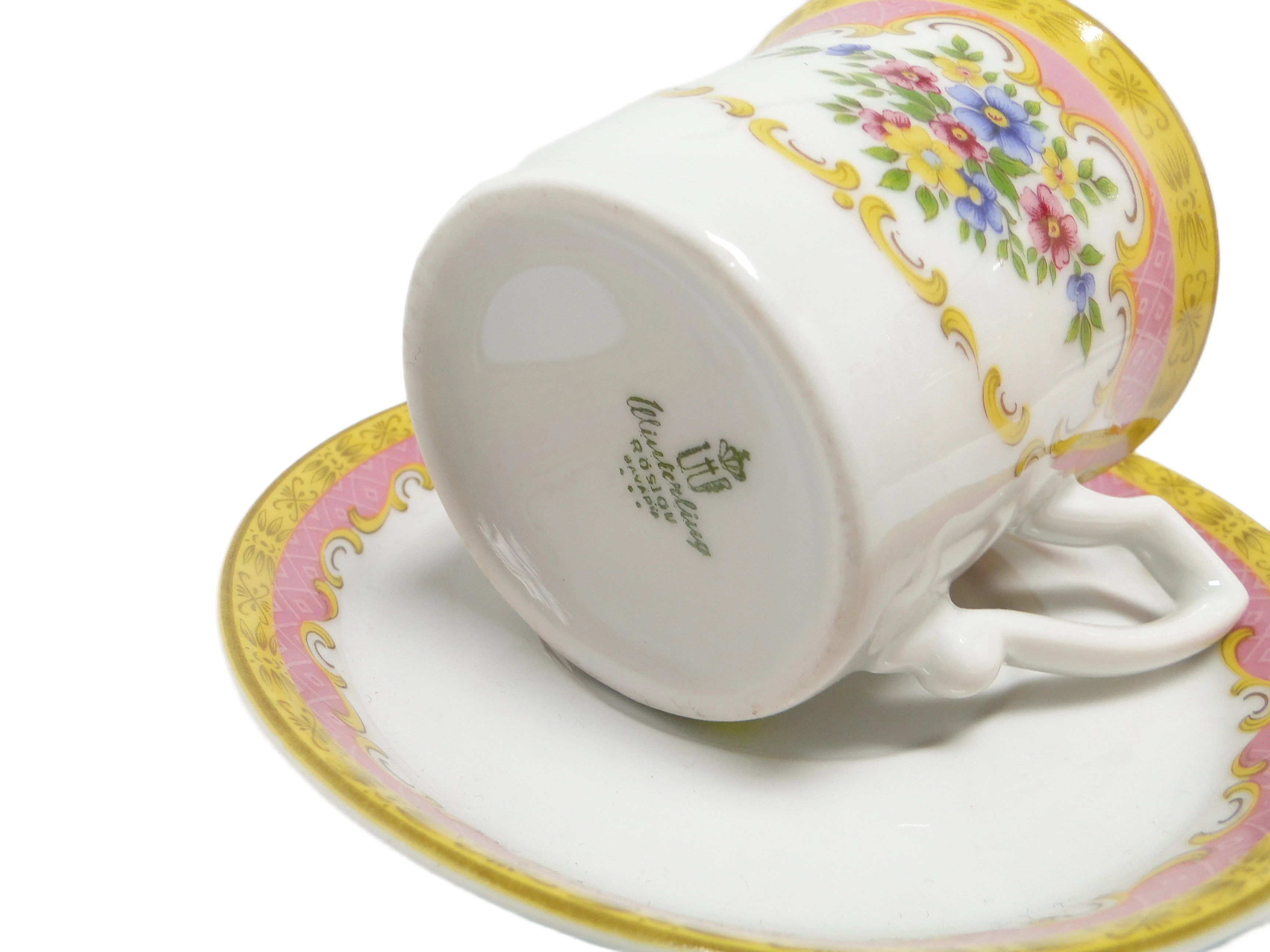 Filiżanka ze spodkiem z lat 50., wykonana w Niemczech, prezentuje powojenną europejską porcelanę dekoracyjną w duchu secesji. Przyciąga szerokimi, pasteloworóżowymi pasami z diamentowym wzorem, okalającymi śnieżnobiałą porcelanę, oraz misternymi złoceniami w formie esownic i stylizowanych ornamentów roślinnych. Centralny punkt stanowi ręcznie malowany bukiet kwiatów w odcieniach różu, błękitu, żółci i fioletu, uzupełniony złotymi detalami. Subtelnie wyprofilowany uchwyt oraz harmonijne proporcje filiżanki i spodka podkreślają charakterystyczny dla połowy XX wieku europejski styl. Powierzchnia porcelany jest gładka i lśniąca, bez widocznych śladów użycia, ubytków ani oznak renowacji. Stan zachowania: bardzo dobry, wszystkie elementy dekoracyjne są oryginalne i nie noszą śladów blaknięcia czy uszkodzeń.Ten porcelanowy zestaw opowiada historię powojennych Niemiec, kiedy tęsknota za harmonią i pięknem lat sprzed wojny znalazła swój wyraz w dekoracjach inspirowanych secesją. Pastelowe barwy i bogate złocenia przywołują obraz śniadań przy porcelanie, w blasku miękkiego światła odbijającego się od lśniącej powierzchni. Ręcznie malowane kwiaty, otoczone złotymi ornamentami, stają się cichym zaproszeniem do chwili wytchnienia i rozmowy, przypominając, że codzienny rytuał może być celebracją tradycji oraz subtelnego piękna.Zestaw ten można zestawić z klasycznymi witrynami, srebrnymi łyżeczkami i haftowanymi serwetkami w salonie lub jadalni. Dobrze sprawdzi się również jako akcent w eklektycznych wnętrzach, gdzie historyczne detale łączą się z nowoczesnością. Pastelowe i złote wykończenia warto podkreślić delikatnym, rozproszonym światłem – na przykład w sąsiedztwie lampy z mlecznym kloszem – oraz otoczyć kwiatowymi kompozycjami i jasnym obrusem, by wydobyć ich dekoracyjny charakter.