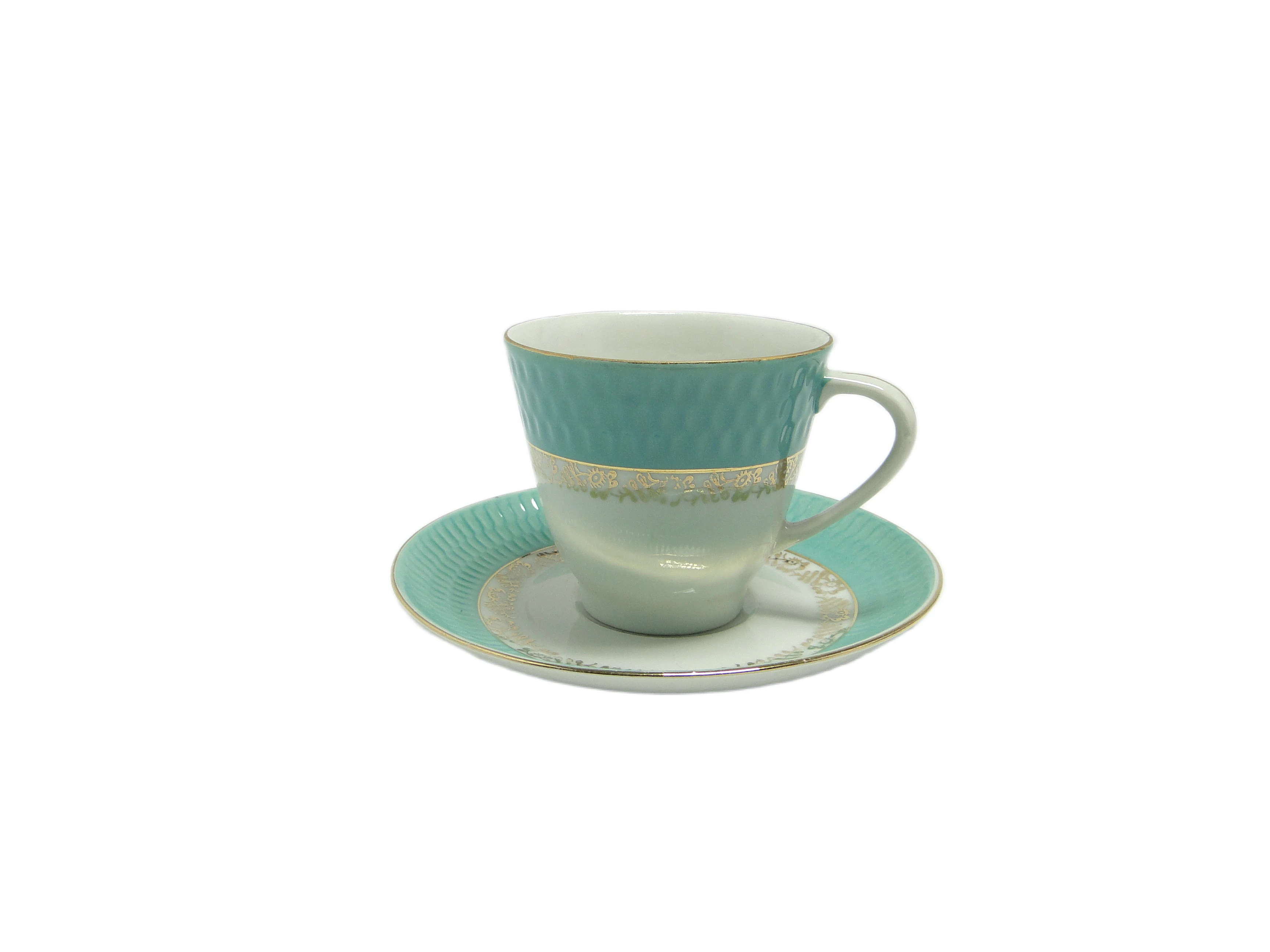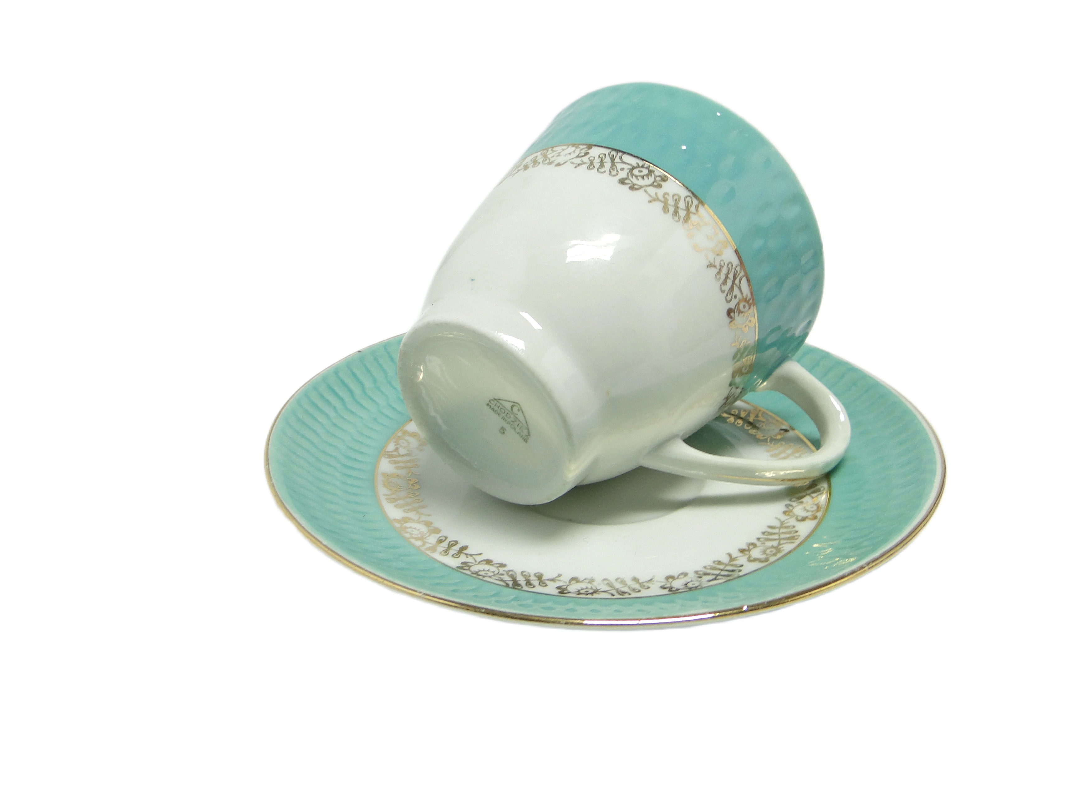 Filiżanka ze spodkiem z serii „Karol” to przykład polskiej porcelany z lat 70., wyprodukowanej przez wytwórnię Chodzież. Górną część filiżanki oraz rant spodka pokrywa delikatna, pastelowa zieleń o chłodnym tonie, na której widoczny jest subtelny, tłoczony wzór. Centralny pas filiżanki i środek spodka pozostają białe, ozdobione misterną złotą ornamentyką roślinną. Obrzeża akcentuje cienka, błyszcząca linia złota, podkreślając klasyczny charakter zestawu. Uchwyt filiżanki, biały i płynnie zintegrowany z formą, dopełnia całość typową dla europejskiego modernizmu połowy XX wieku — z delikatnie rozchyloną czarką i wyważonymi proporcjami. Powierzchnia porcelany jest gładka, lśniąca, pozbawiona widocznych śladów użytkowania, uszkodzeń czy renowacji. Zachowana w bardzo dobrym stanie, wpisuje się w rzadko spotykane kolekcje polskiej porcelany vintage.Ten zestaw nastrojem przywołuje elegancję i powściągliwość lat 70., kiedy domowa zastawa była nie tylko użytkowa, ale również świadczyła o wyczuciu stylu. Subtelne połączenie zieleni, bieli i złota opowiada historię spotkań przy kawie i chwil celebracji codzienności. Kształt filiżanki, lekko rozchylony ku górze, zdaje się zapraszać do spokojnej rozmowy, a delikatne ornamenty odbijają światło niczym echo minionych, starannie pielęgnowanych rytuałów.Tę filiżankę można zestawić z prostą, białą porcelaną lub szkłem, by wyeksponować jej kolor i detal. Dobrze sprawdzi się na stole w salonie urządzonym w duchu mid-century modern lub w eklektycznych wnętrzach kolekcjonerskich, gdzie vintage spotyka się z nowoczesnością. Warto połączyć ją z lnianą serwetą i świeżymi kwiatami na stole, by podkreślić jej delikatny, dekoracyjny charakter i oddać ducha polskiego designu lat 70.