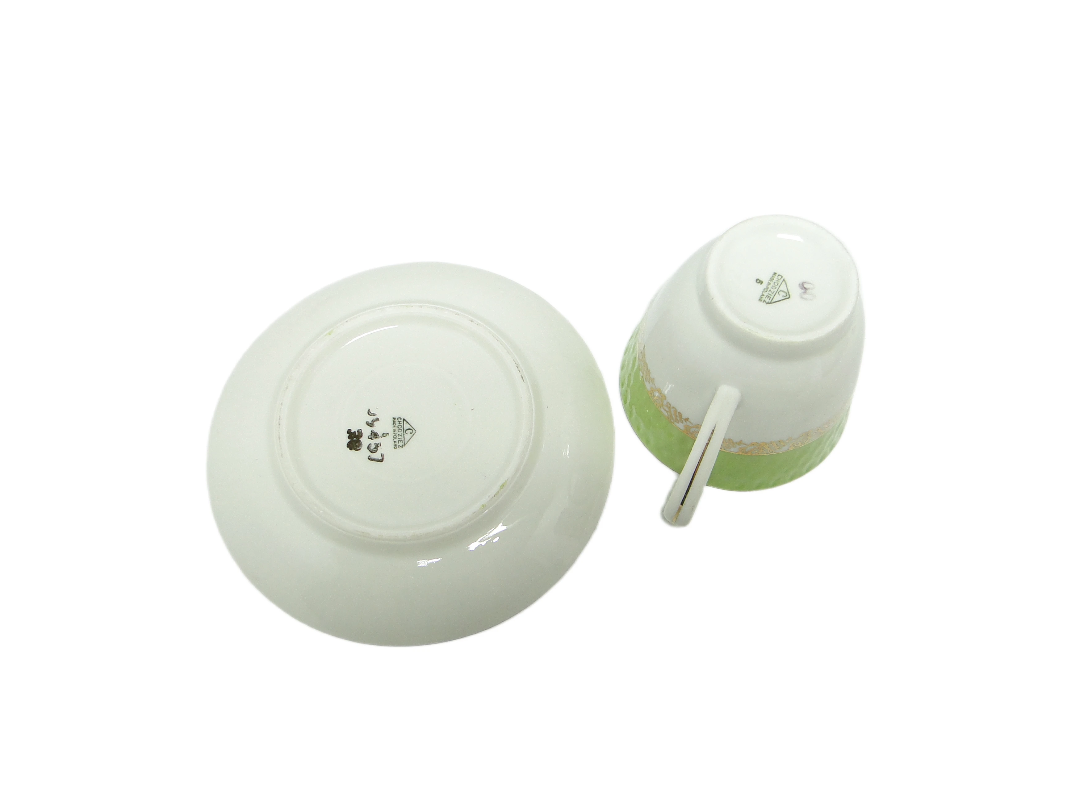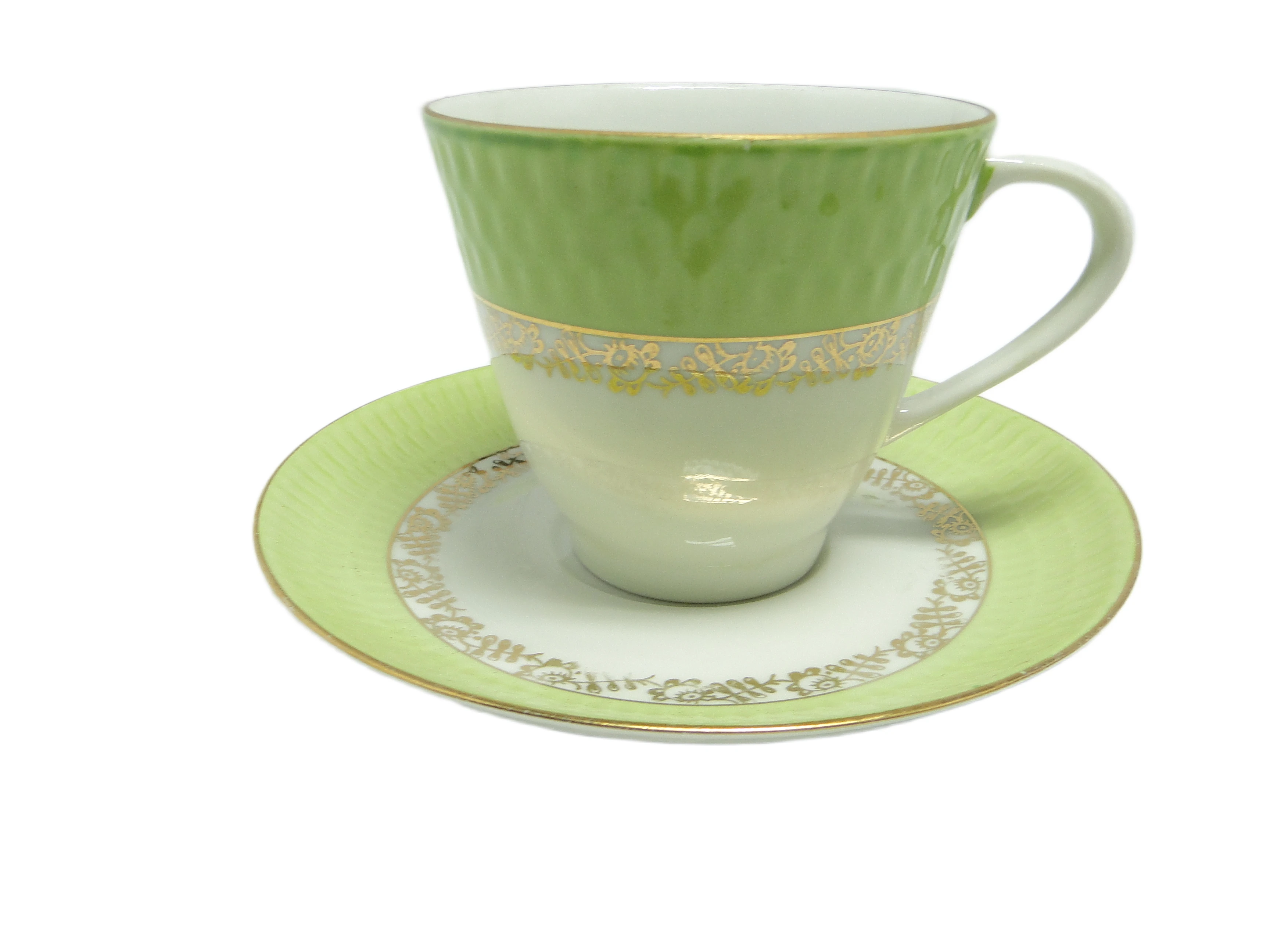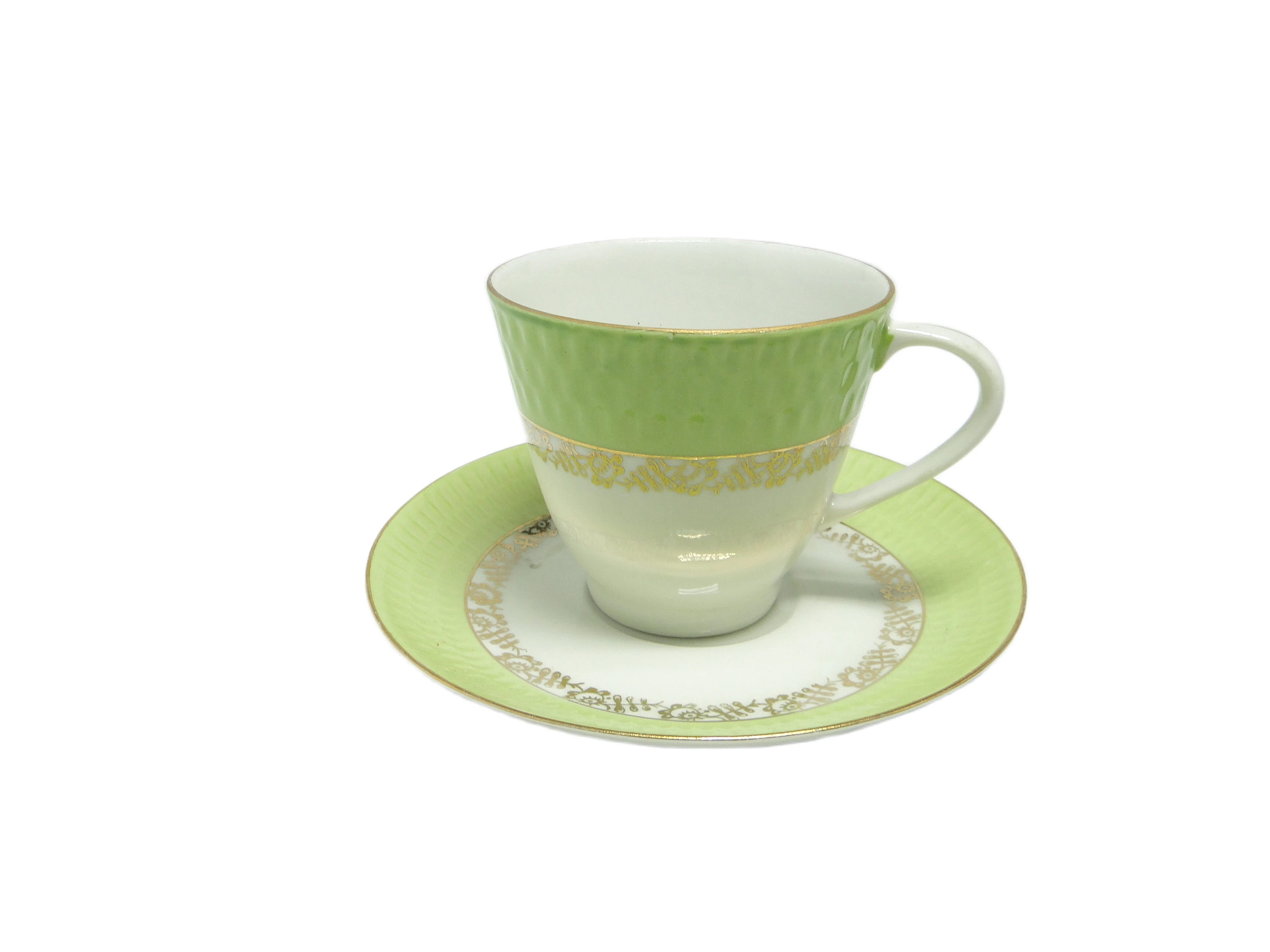Filiżanka ze spodkiem z serii „Karol” to przykład polskiej porcelany z lat 70., wyprodukowanej przez wytwórnię Chodzież. Górną część filiżanki oraz rant spodka pokrywa delikatna, pastelowa zieleń o chłodnym tonie, na której widoczny jest subtelny, tłoczony wzór. Centralny pas filiżanki i środek spodka pozostają białe, ozdobione misterną złotą ornamentyką roślinną. Obrzeża akcentuje cienka, błyszcząca linia złota, podkreślając klasyczny charakter zestawu. Uchwyt filiżanki, biały i płynnie zintegrowany z formą, dopełnia całość typową dla europejskiego modernizmu połowy XX wieku — z delikatnie rozchyloną czarką i wyważonymi proporcjami. Powierzchnia porcelany jest gładka, lśniąca, pozbawiona widocznych śladów użytkowania, uszkodzeń czy renowacji. Zachowana w bardzo dobrym stanie, wpisuje się w rzadko spotykane kolekcje polskiej porcelany vintage.Ten zestaw nastrojem przywołuje elegancję i powściągliwość lat 70., kiedy domowa zastawa była nie tylko użytkowa, ale również świadczyła o wyczuciu stylu. Subtelne połączenie zieleni, bieli i złota opowiada historię spotkań przy kawie i chwil celebracji codzienności. Kształt filiżanki, lekko rozchylony ku górze, zdaje się zapraszać do spokojnej rozmowy, a delikatne ornamenty odbijają światło niczym echo minionych, starannie pielęgnowanych rytuałów.Tę filiżankę można zestawić z prostą, białą porcelaną lub szkłem, by wyeksponować jej kolor i detal. Dobrze sprawdzi się na stole w salonie urządzonym w duchu mid-century modern lub w eklektycznych wnętrzach kolekcjonerskich, gdzie vintage spotyka się z nowoczesnością. Warto połączyć ją z lnianą serwetą i świeżymi kwiatami na stole, by podkreślić jej delikatny, dekoracyjny charakter i oddać ducha polskiego designu lat 70.