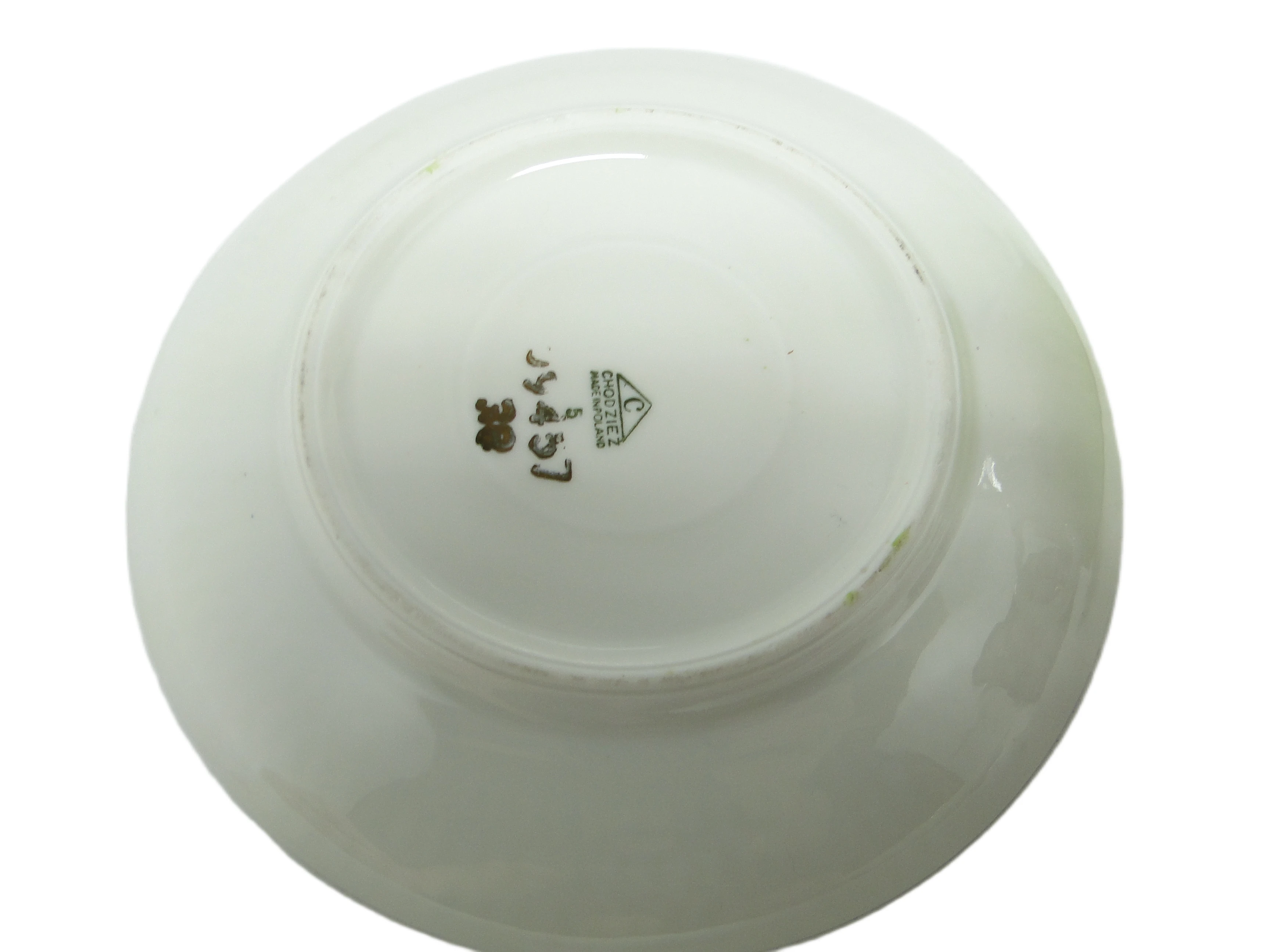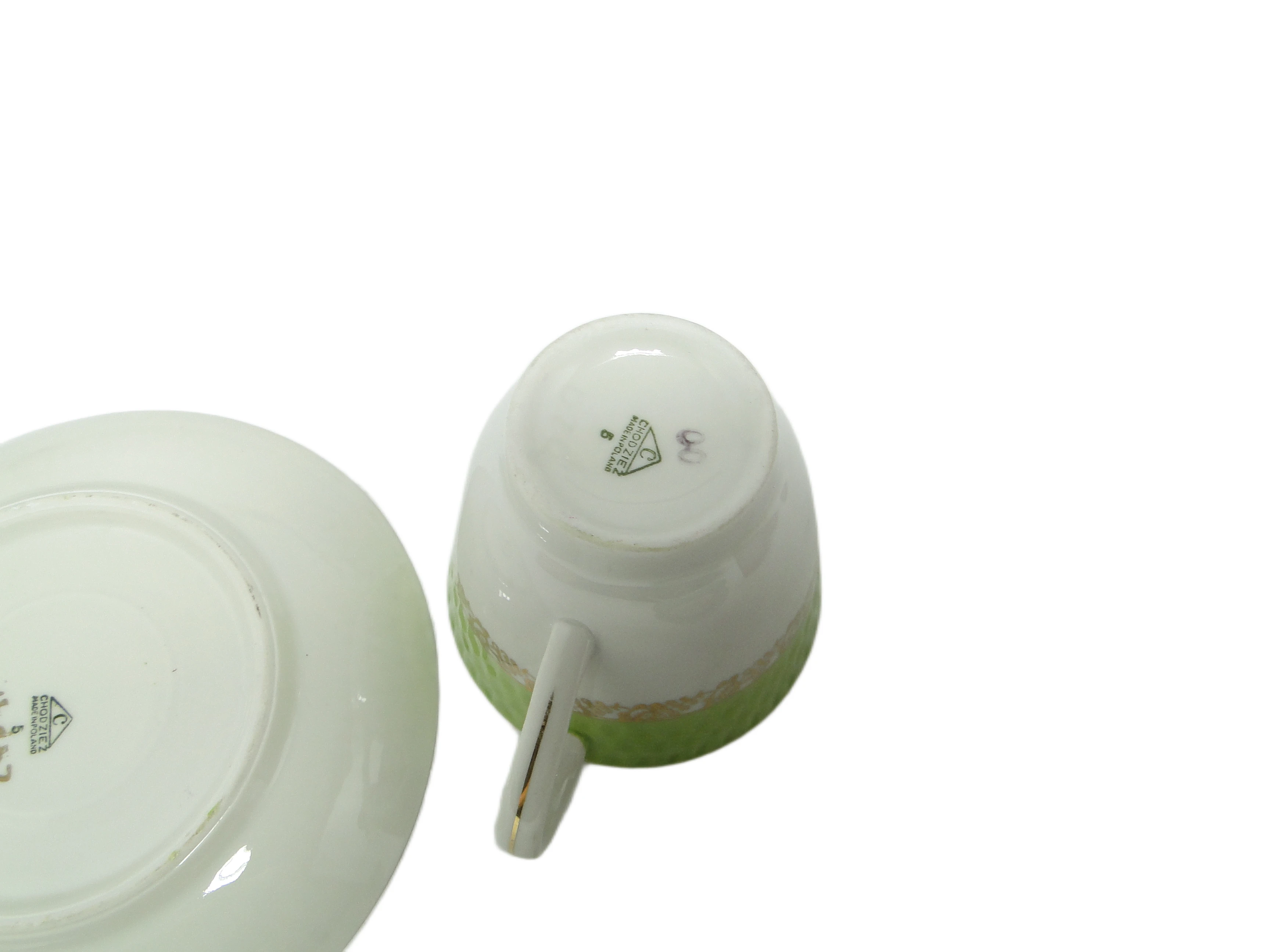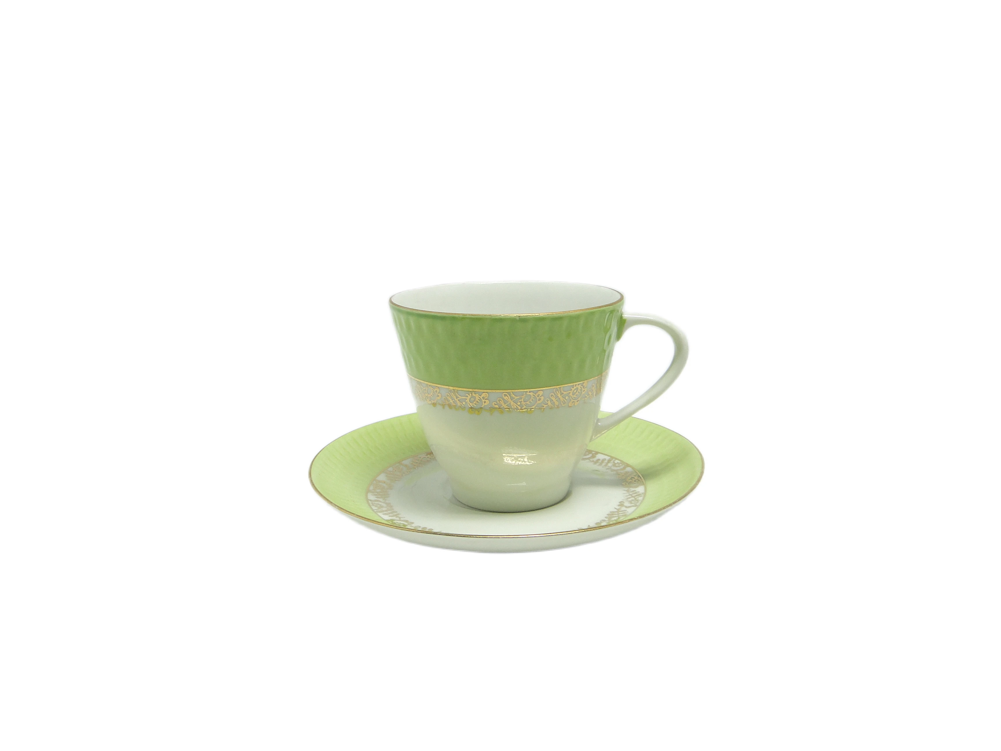 Filiżanka ze spodkiem z serii „Karol” to przykład polskiej porcelany z lat 70., wyprodukowanej przez wytwórnię Chodzież. Górną część filiżanki oraz rant spodka pokrywa delikatna, pastelowa zieleń o chłodnym tonie, na której widoczny jest subtelny, tłoczony wzór. Centralny pas filiżanki i środek spodka pozostają białe, ozdobione misterną złotą ornamentyką roślinną. Obrzeża akcentuje cienka, błyszcząca linia złota, podkreślając klasyczny charakter zestawu. Uchwyt filiżanki, biały i płynnie zintegrowany z formą, dopełnia całość typową dla europejskiego modernizmu połowy XX wieku — z delikatnie rozchyloną czarką i wyważonymi proporcjami. Powierzchnia porcelany jest gładka, lśniąca, pozbawiona widocznych śladów użytkowania, uszkodzeń czy renowacji. Zachowana w bardzo dobrym stanie, wpisuje się w rzadko spotykane kolekcje polskiej porcelany vintage.Ten zestaw nastrojem przywołuje elegancję i powściągliwość lat 70., kiedy domowa zastawa była nie tylko użytkowa, ale również świadczyła o wyczuciu stylu. Subtelne połączenie zieleni, bieli i złota opowiada historię spotkań przy kawie i chwil celebracji codzienności. Kształt filiżanki, lekko rozchylony ku górze, zdaje się zapraszać do spokojnej rozmowy, a delikatne ornamenty odbijają światło niczym echo minionych, starannie pielęgnowanych rytuałów.Tę filiżankę można zestawić z prostą, białą porcelaną lub szkłem, by wyeksponować jej kolor i detal. Dobrze sprawdzi się na stole w salonie urządzonym w duchu mid-century modern lub w eklektycznych wnętrzach kolekcjonerskich, gdzie vintage spotyka się z nowoczesnością. Warto połączyć ją z lnianą serwetą i świeżymi kwiatami na stole, by podkreślić jej delikatny, dekoracyjny charakter i oddać ducha polskiego designu lat 70.