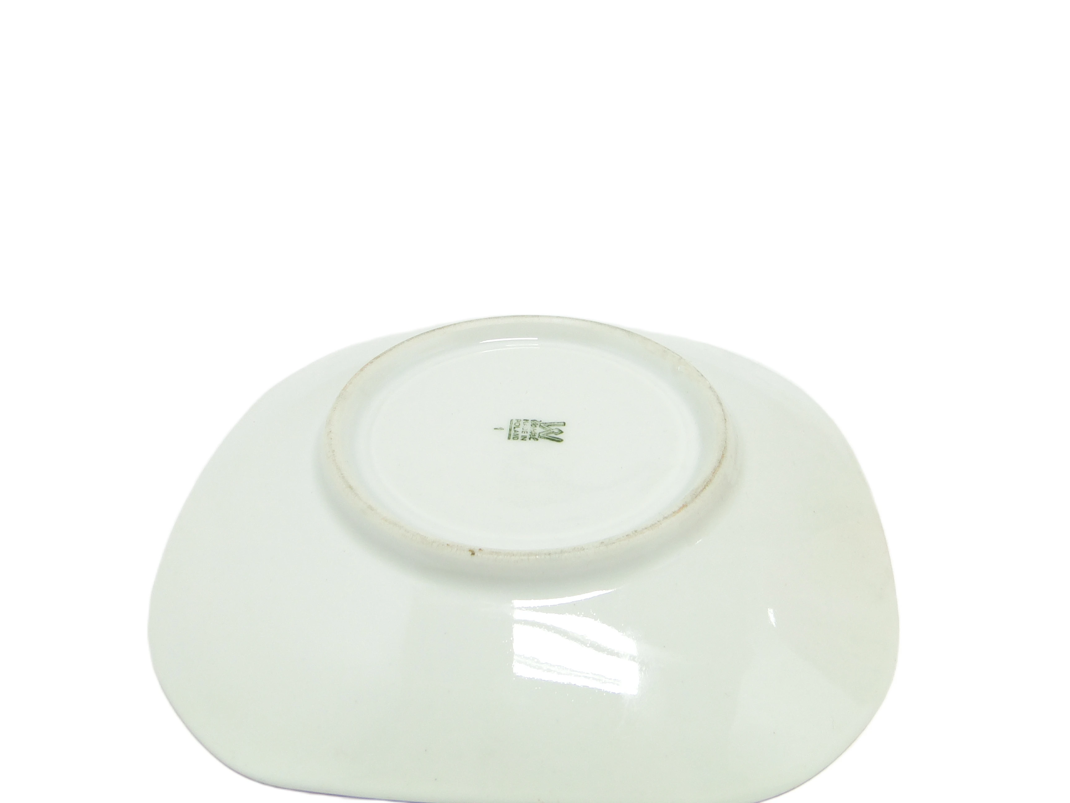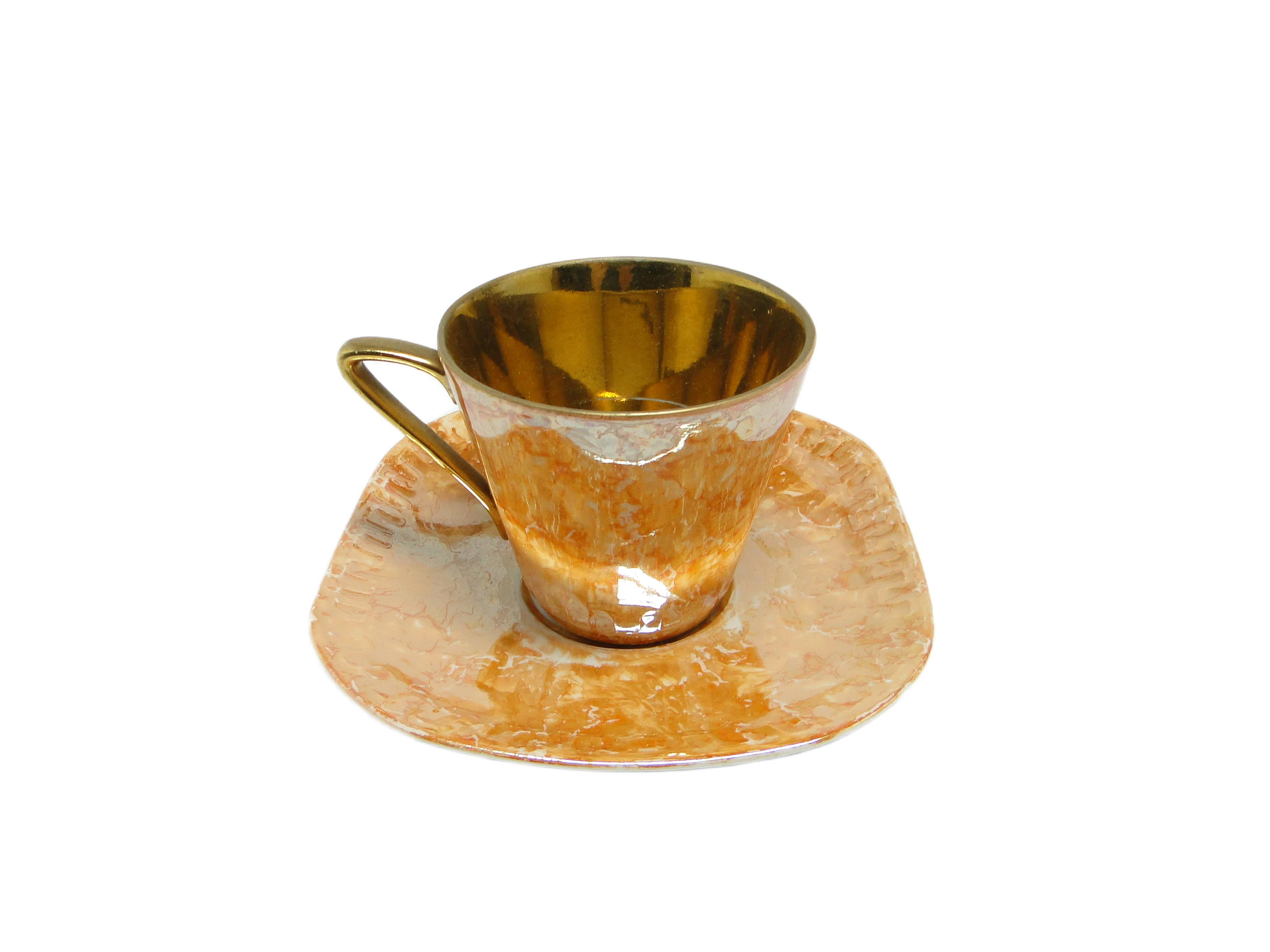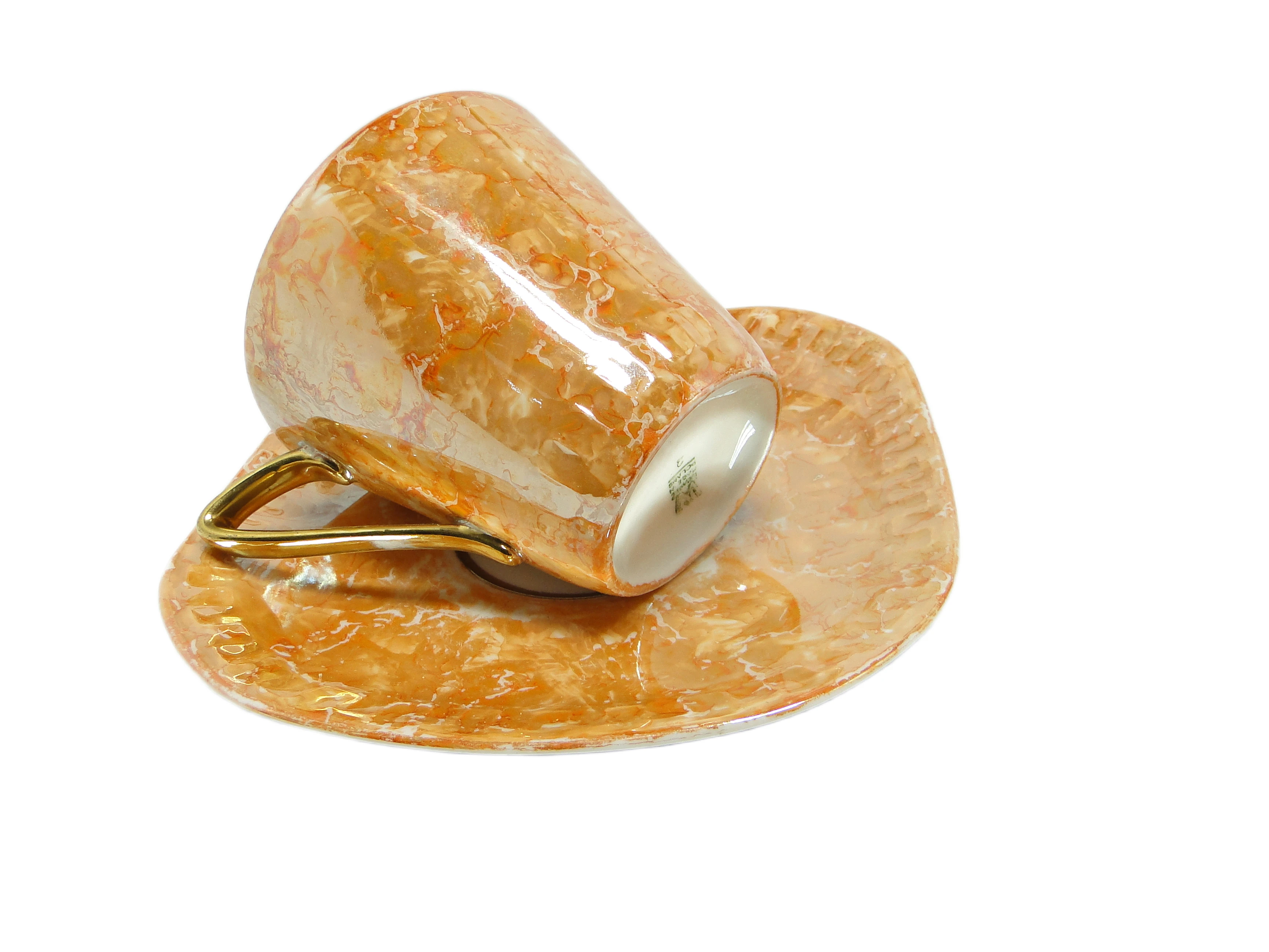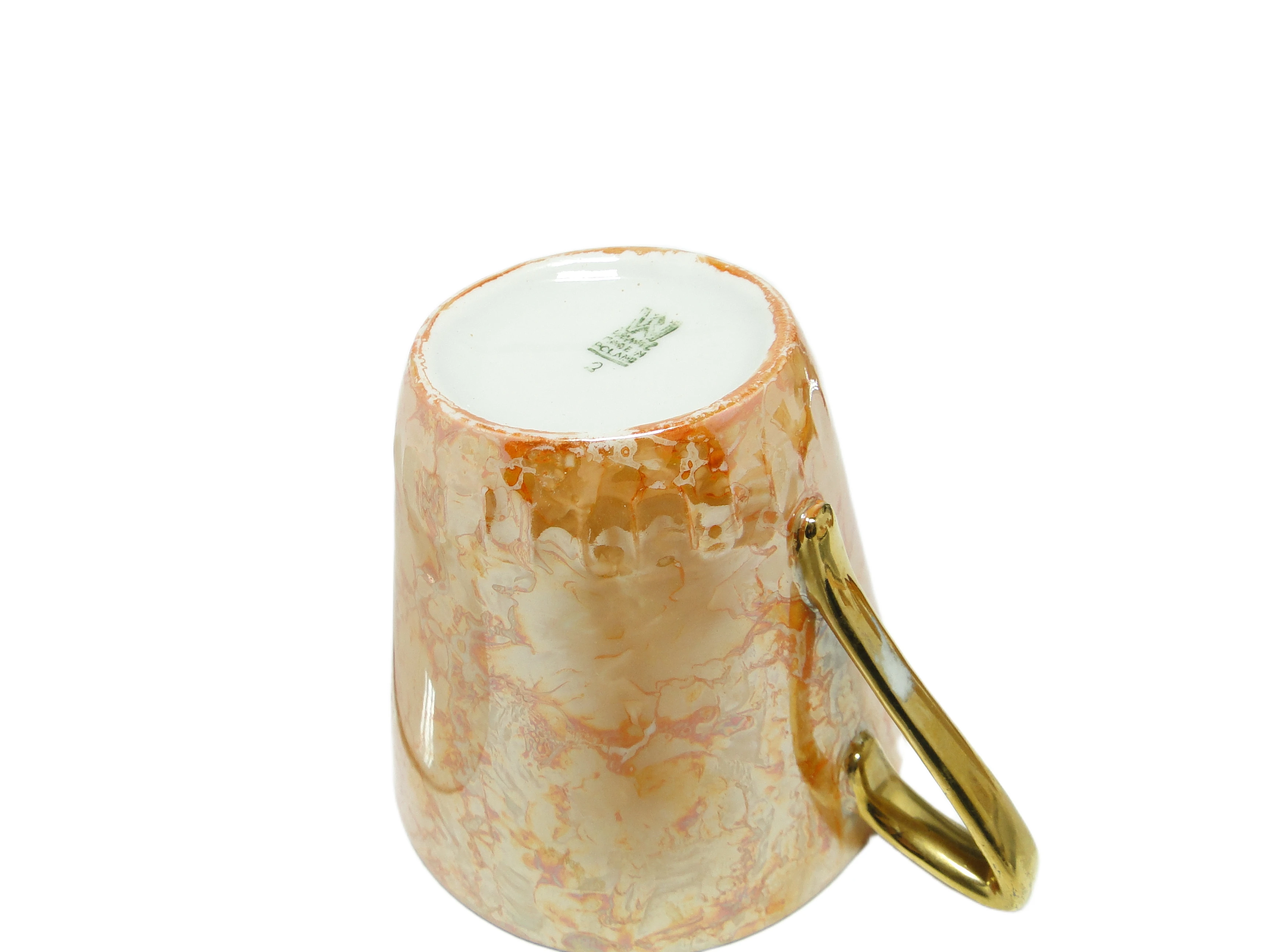 Filiżanka z podstawkiem z kolekcji Helena, wyprodukowana przez wytwórnię porcelany Wawel w Polsce w latach 70., prezentuje charakterystyczne dla epoki połączenie nowoczesnej, geometrycznej formy z organicznym wzorem. Bazowy kolor porcelany to ciepły, złocisto-beżowy odcień z opalizującym, perłowym połyskiem, który subtelnie zmienia się pod wpływem światła, przechodząc w róż, krem i szarość. Powierzchnię zdobi marmurkowy deseń w odcieniach złota, beżu i bladego różu, powtarzający się zarówno na filiżance o lekko stożkowym profilu i delikatnie rozchylonym rancie, jak i na nieregularnie uformowanym spodku. Uchwyt o smukłej, kanciastej linii pokryty jest błyszczącą złotą powłoką, a gładkość i lekkość porcelany świadczą o precyzji wykonania typowej dla manufaktury Wawel. Całość pokryta jest wysokopołyskowym, niemal lustrzanym szkliwem. Filiżanka i spodek zachowały bardzo dobry stan, bez widocznych wyszczerbień, pęknięć czy śladów zużycia.Forma i wykończenie tej filiżanki przywołują głos lat 70. – czas, gdy polski design użytkowy szukał równowagi między fascynacją nowoczesnością a tęsknotą za naturalnymi materiałami i rzemiosłem. Lśniąca powierzchnia odbija światło, jakby zatrzymywała poranny blask, a organiczny wzór nawiązuje do polskich pejzaży i naturalnych kamieni. Asymetria spodka i złote akcenty sugerują, że codzienność może być pełna subtelnych odkryć, a każdy łyk kawy czy herbaty staje się małym rytuałem celebrującym estetykę minionych dekad.Filiżankę można wykorzystać zarówno w codziennym serwisie kawowym, jak i potraktować jako solistyczny akcent na konsoli czy w przeszklonej witrynie. Dobrze sprawdzi się w zestawieniu z innymi naczyniami o miękkich, organicznych liniach lub szkłem w pastelowych barwach. Można ją połączyć z prostą, lnianą serwetą i złotymi sztućcami, podkreślając jej dekoracyjny charakter w eklektycznych aranżacjach vintage, jak i w minimalistycznych kompozycjach, gdzie perłowy połysk i marmurowy wzór staną się głównym motywem.