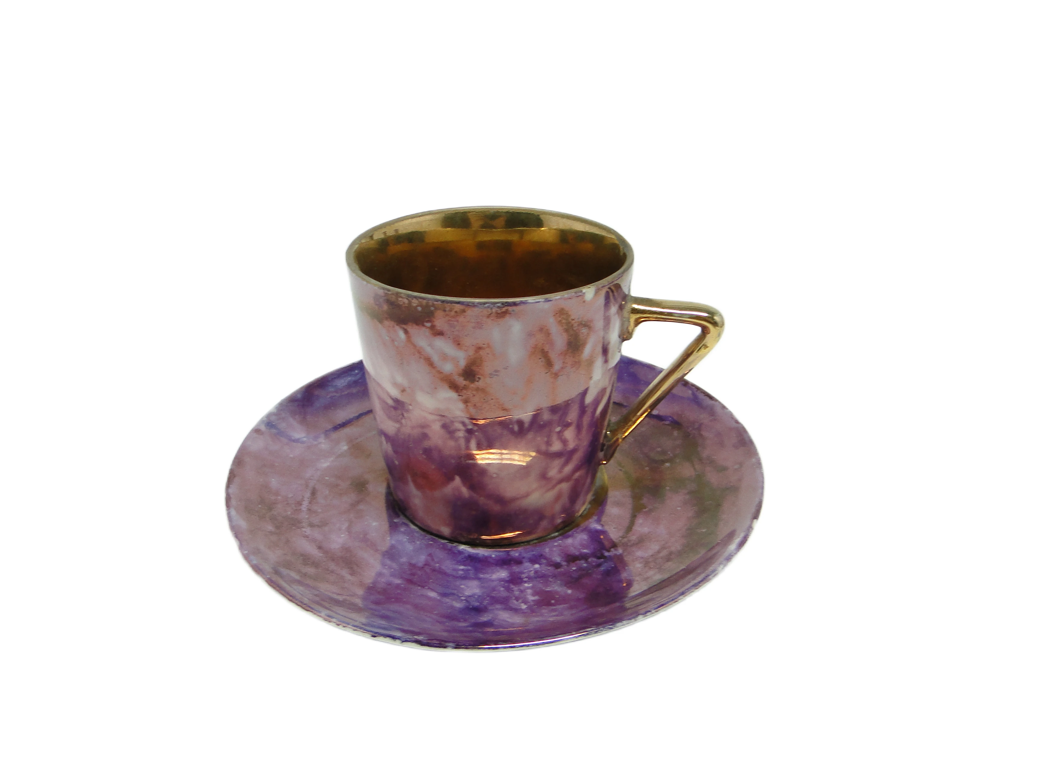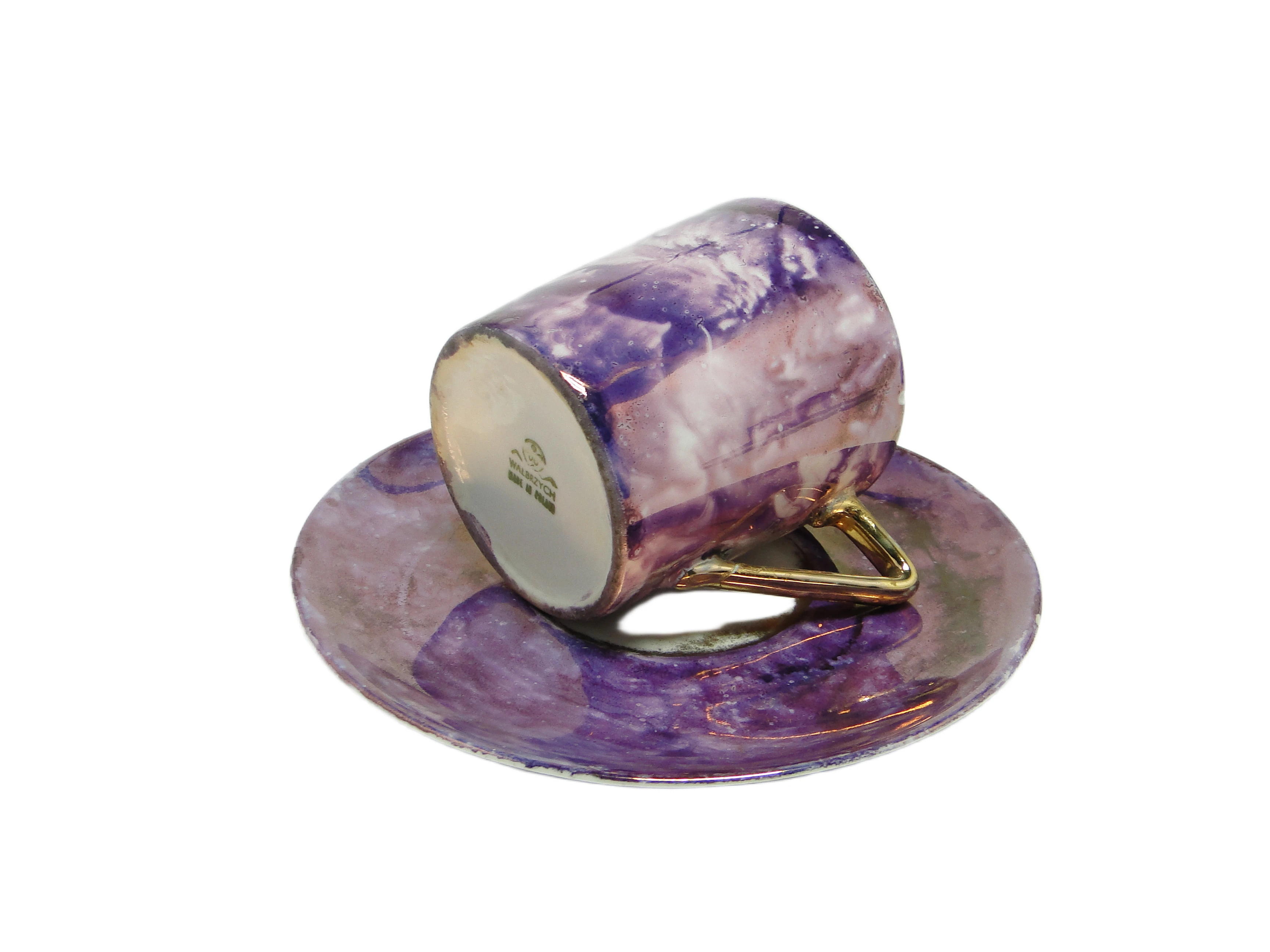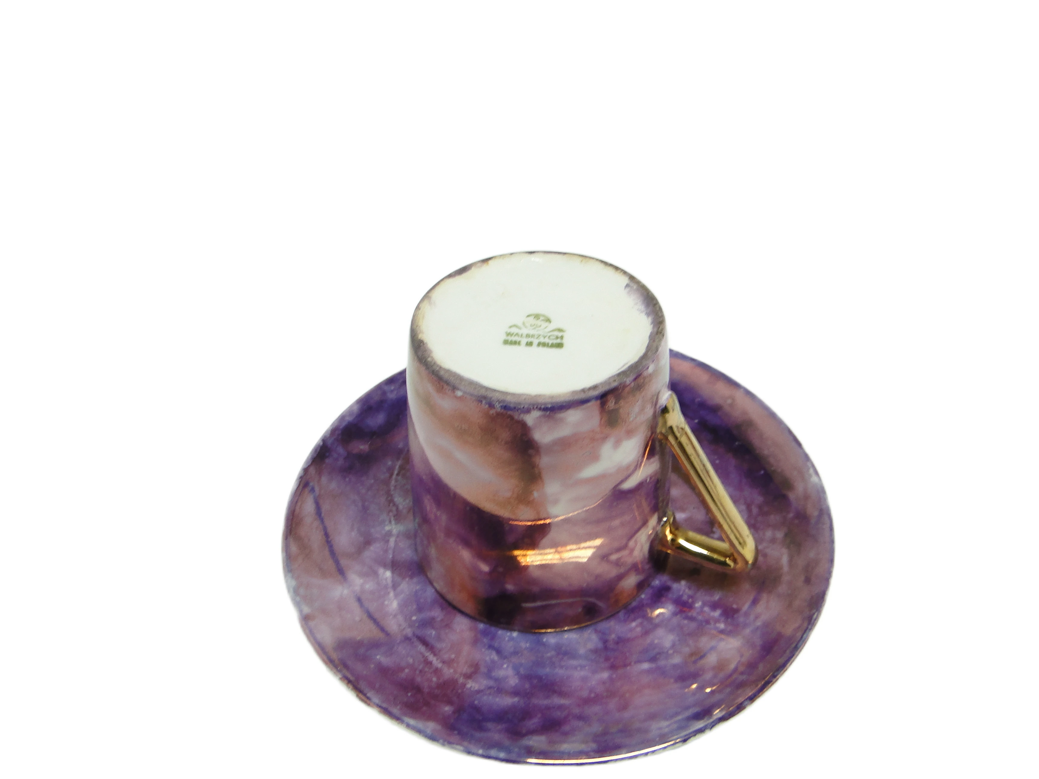 Filiżanka ze spodkiem wykonana z porcelany w Polsce w latach 70. prezentuje styl mid-century modern charakterystyczny dla wschodnioeuropejskiego wzornictwa epoki. Marmurkowe wykończenie w odcieniach fioletu, lawendy i różu, z opalizującą, perłową powierzchnią, obejmuje zarówno filiżankę, jak i spodek, tworząc unikatowy wzór o subtelnych przejściach barw. Uchwyt oraz wnętrze filiżanki są pokryte błyszczącym, metalicznym złotem, co nadaje całości wyrazisty kontrast i podkreśla eksportowy charakter produktu z czasów PRL. Geometryczny, kanciasty uchwyt oraz cylindryczna forma filiżanki i płaski spodek wpisują się w minimalistyczne założenia projektu. Porcelana jest gładka i szkliwiona, bez widocznych uszkodzeń, odprysków czy śladów zużycia; złote detale pozostają kompletne i wyraziste. Marmurkowy wzór został nałożony ręcznie, dzięki czemu każdy zestaw jest niepowtarzalny. Zestaw zachowany w bardzo dobrym stanie, bez widocznych śladów użytkowania.W tej filiżance można odnaleźć głos pokolenia lat 70., które w codziennych przedmiotach szukało odrobiny blasku i nowoczesności. Eksportowa porcelana z PRL była małą ambasadorką aspiracji – złote wnętrze odbijało światło, sugerując luksus i wyjście poza szarość codzienności, a perłowe marmurkowanie przypominało o marzeniach i tęsknocie za kolorami Zachodu. Każda filiżanka była drobnym rytuałem, zaproszeniem do świata, w którym nawet krótka przerwa na herbatę czy kawę mogła stać się oddechem od rzeczywistości.Taki zestaw można zestawić z innymi porcelanowymi elementami o metalicznych detalach lub ustawić na minimalistycznej tacy, gdzie stanie się centralnym punktem kompozycji. Dobrze sprawdzi się w salonie utrzymanym w duchu mid-century modern, ale odnajdzie się również w eklektycznych wnętrzach kolekcjonerskich, gdzie liczy się historia przedmiotów. Warto połączyć go ze szklanymi wazonami lub tekstyliami w odcieniach fiołka, by podkreślić opalizujący efekt i wydobyć głębię koloru.