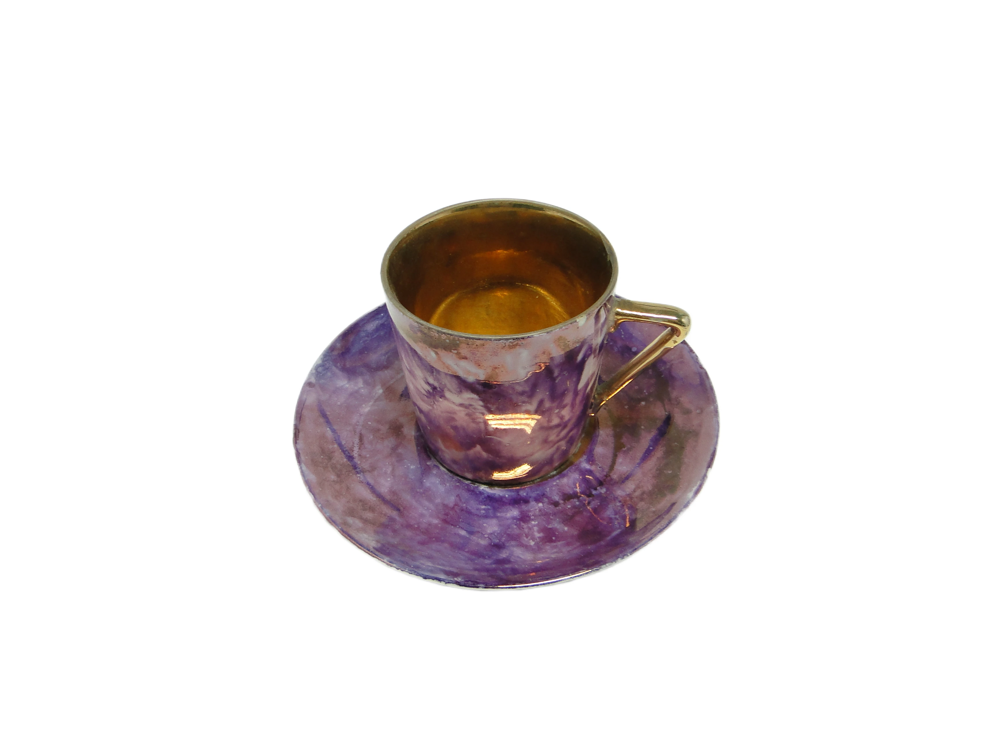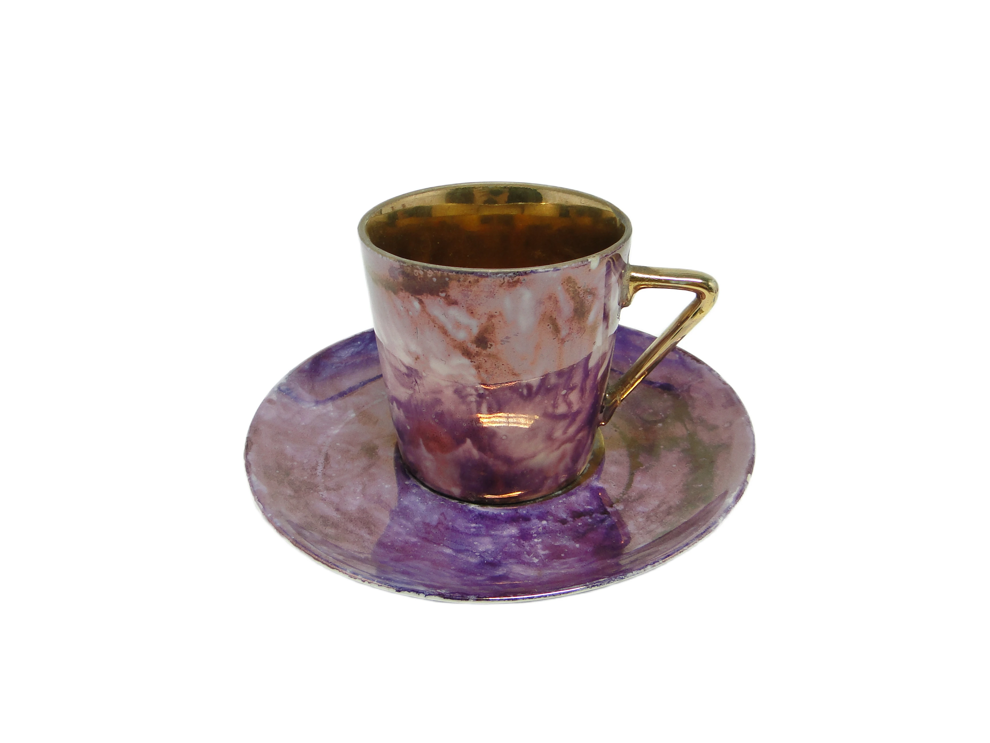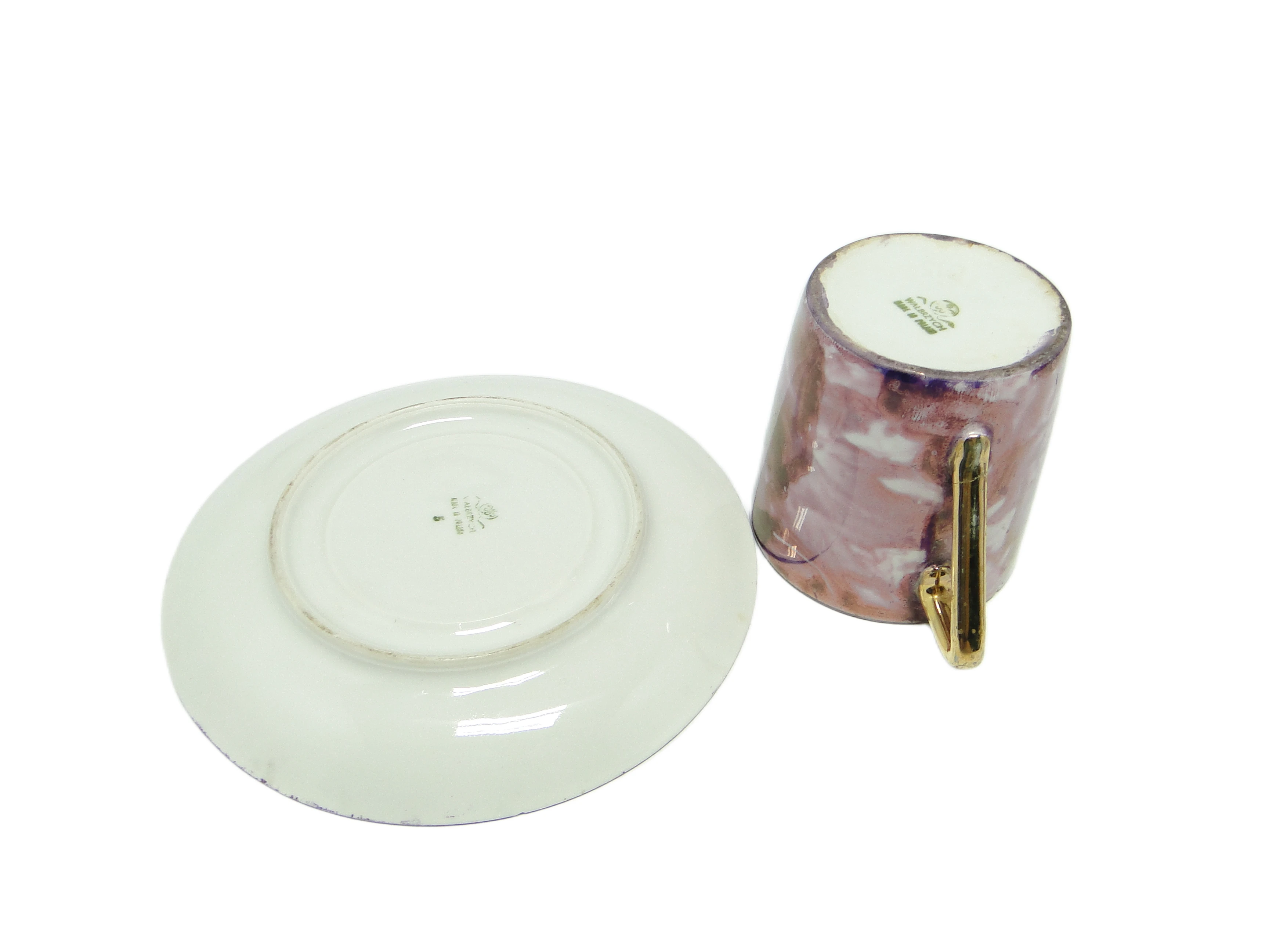 Filiżanka ze spodkiem wykonana z porcelany w Polsce w latach 70. prezentuje styl mid-century modern charakterystyczny dla wschodnioeuropejskiego wzornictwa epoki. Marmurkowe wykończenie w odcieniach fioletu, lawendy i różu, z opalizującą, perłową powierzchnią, obejmuje zarówno filiżankę, jak i spodek, tworząc unikatowy wzór o subtelnych przejściach barw. Uchwyt oraz wnętrze filiżanki są pokryte błyszczącym, metalicznym złotem, co nadaje całości wyrazisty kontrast i podkreśla eksportowy charakter produktu z czasów PRL. Geometryczny, kanciasty uchwyt oraz cylindryczna forma filiżanki i płaski spodek wpisują się w minimalistyczne założenia projektu. Porcelana jest gładka i szkliwiona, bez widocznych uszkodzeń, odprysków czy śladów zużycia; złote detale pozostają kompletne i wyraziste. Marmurkowy wzór został nałożony ręcznie, dzięki czemu każdy zestaw jest niepowtarzalny. Zestaw zachowany w bardzo dobrym stanie, bez widocznych śladów użytkowania.W tej filiżance można odnaleźć głos pokolenia lat 70., które w codziennych przedmiotach szukało odrobiny blasku i nowoczesności. Eksportowa porcelana z PRL była małą ambasadorką aspiracji – złote wnętrze odbijało światło, sugerując luksus i wyjście poza szarość codzienności, a perłowe marmurkowanie przypominało o marzeniach i tęsknocie za kolorami Zachodu. Każda filiżanka była drobnym rytuałem, zaproszeniem do świata, w którym nawet krótka przerwa na herbatę czy kawę mogła stać się oddechem od rzeczywistości.Taki zestaw można zestawić z innymi porcelanowymi elementami o metalicznych detalach lub ustawić na minimalistycznej tacy, gdzie stanie się centralnym punktem kompozycji. Dobrze sprawdzi się w salonie utrzymanym w duchu mid-century modern, ale odnajdzie się również w eklektycznych wnętrzach kolekcjonerskich, gdzie liczy się historia przedmiotów. Warto połączyć go ze szklanymi wazonami lub tekstyliami w odcieniach fiołka, by podkreślić opalizujący efekt i wydobyć głębię koloru.