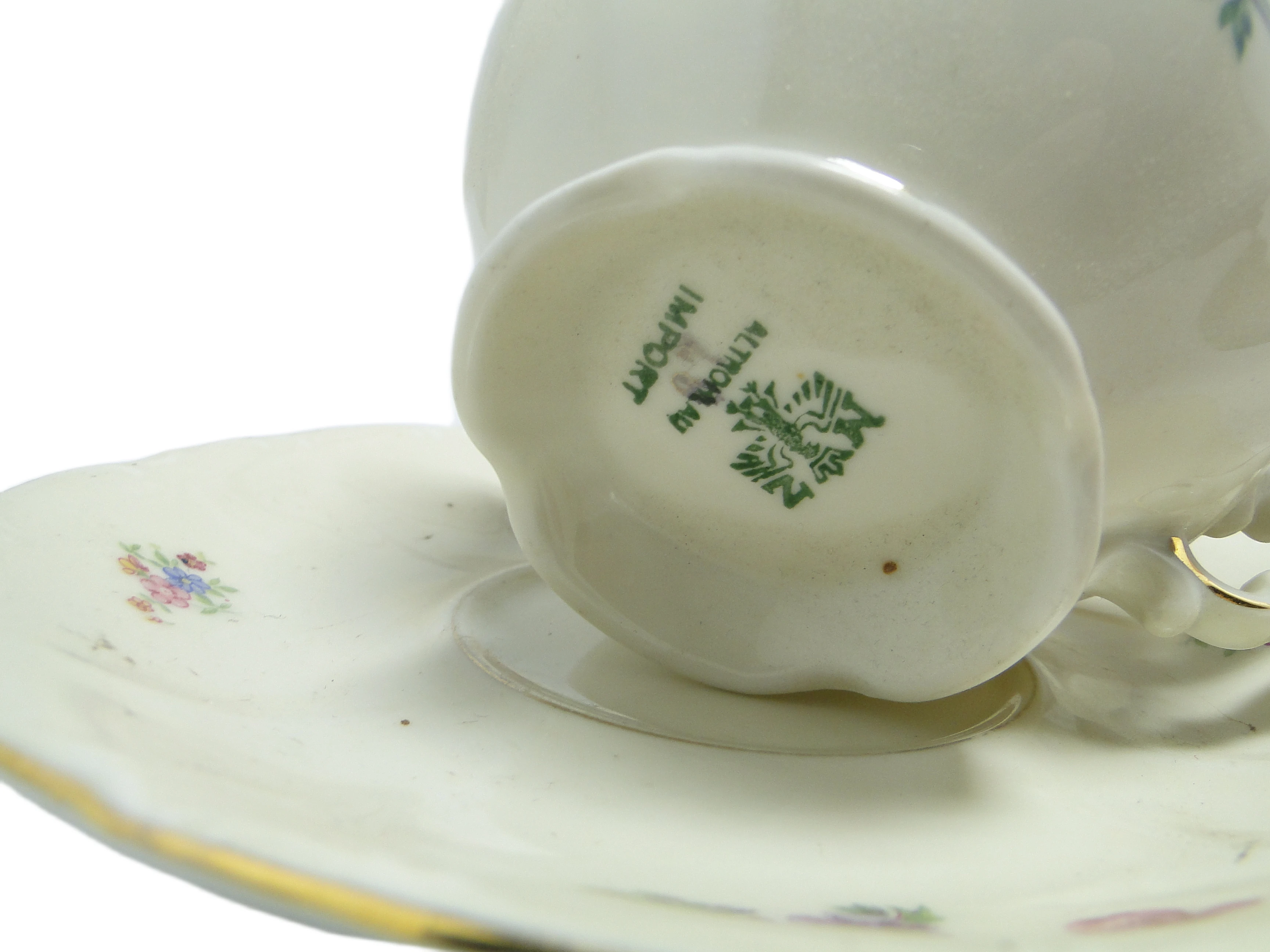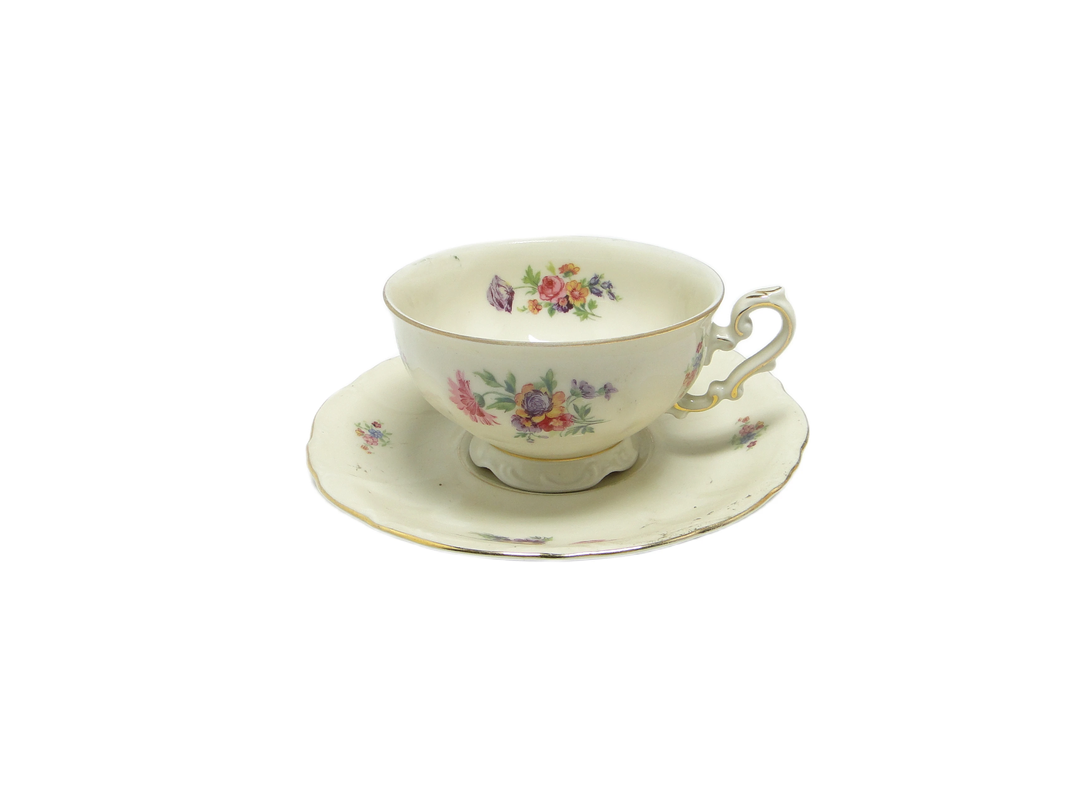 Filiżanka ze spodkiem z lat 30., pochodząca z Niemiec, została wykonana z porcelany w odcieniu ivory white o subtelnie żółtawej tonacji. Powierzchnię obu elementów zdobią starannie rozmieszczone, wielobarwne bukiety kwiatowe w odcieniach różu, fioletu, żółci, zieleni i błękitu. Obrzeża filiżanki i spodka mają delikatnie falistą linię, podkreśloną cienką, ręcznie nakładaną złoconą lamówką. Uchwyt utrzymany jest w dekoracyjnym duchu baroku – wyraźnie profilowany, z rzeźbiarską krzywizną i złoceniem. Całość wykończona jest na wysoki połysk, co wzmacnia głębię detali i szlachetność kolorystyki. Porcelana pozostaje gładka, jednolicie szkliwiona, bez widocznych pęknięć czy wyszczerbień – jedynie minimalne przetarcia złocenia przy rantach i uchwycie świadczą o upływie czasu. Zestaw zachowany w bardzo dobrym stanie, typowym dla starannie pielęgnowanych wyrobów z tej epoki.Filiżanka zdaje się opowiadać o przedwojennej Europie, w której codzienność nasycona była rytuałami i dbałością o formę. Barokowe inspiracje odzwierciedlone w dekoracyjnym uchwycie i złoconych krawędziach przywołują intymną atmosferę eleganckich saloników – miejsc, gdzie herbata stawała się pretekstem do rozmowy i celebrowania chwili. Kwiatowe motywy, rozświetlone kremowym tłem porcelany, przywołują obrazy dawnych spotkań i cichych gestów przy stole, a falista linia brzegu sugeruje miękkość i swobodę płynącą z obcowania z rzemiosłem.Zestaw może być efektownym akcentem na półce w witrynie lub na konsoli w salonie, szczególnie w towarzystwie innych porcelanowych naczyń z lat 20. i 30. Dobrze sprawdzi się w aranżacjach eklektycznych, klasycznych lub kolekcjonerskich wnętrzach z nutą romantyzmu. Warto połączyć go z kryształowymi kieliszkami, haftowanym obrusem lub pojedynczą gałązką kwiatów, by podkreślić historyczny i dekoracyjny charakter tego barokowego zestawu.