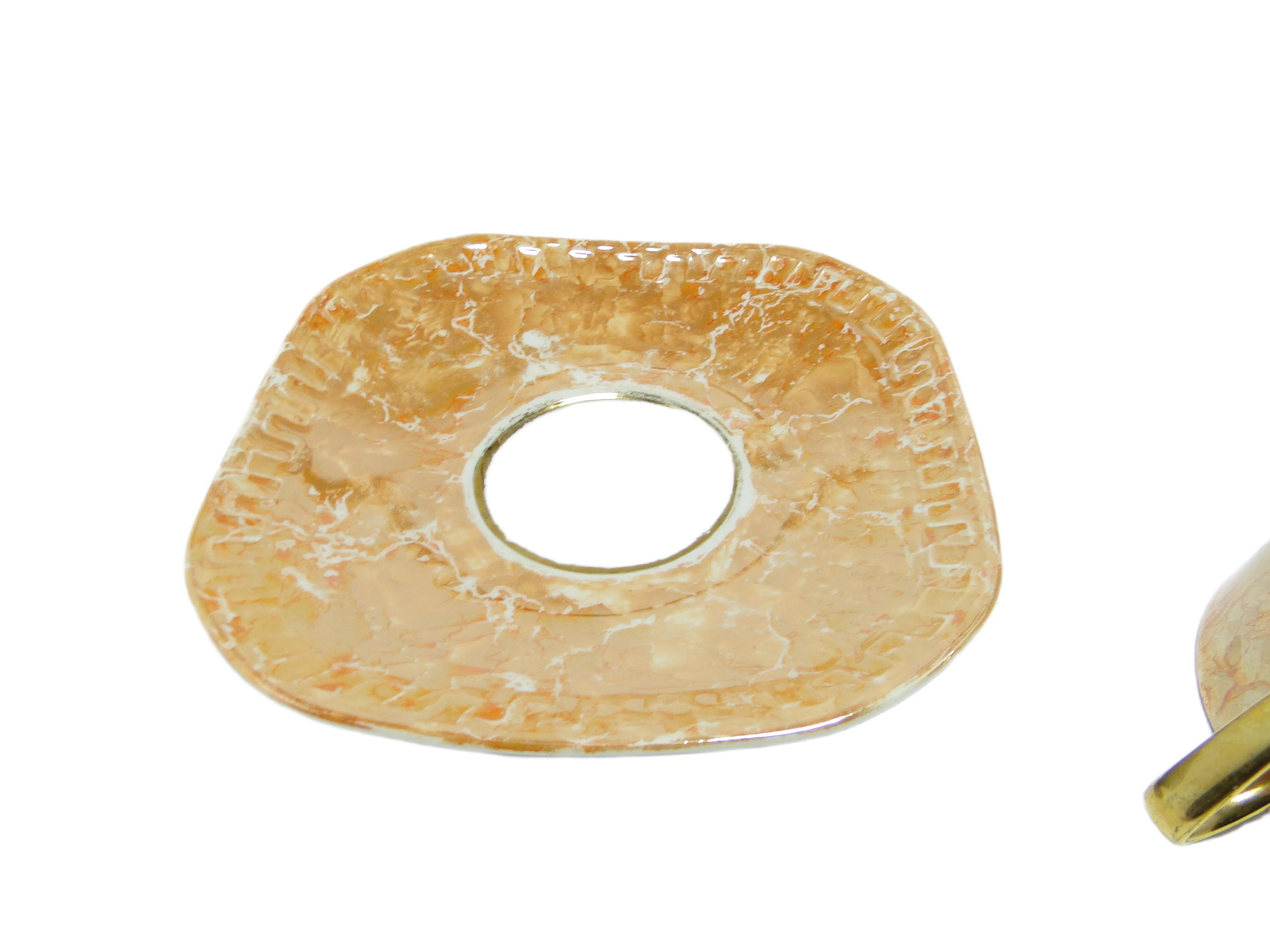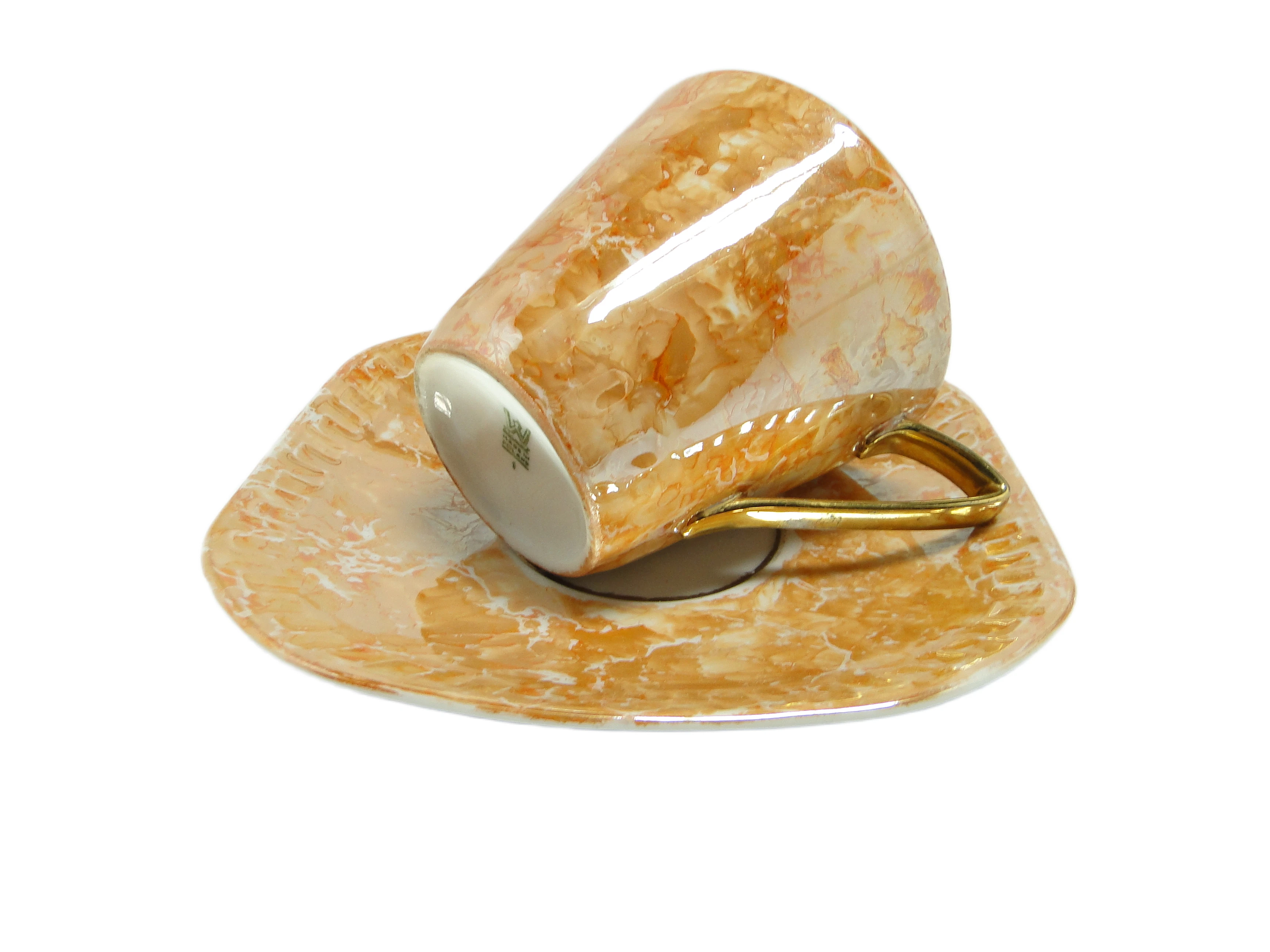 - Filiżanka ze spodkiem Helena (Milenium), wyprodukowana przez fabrykę Wawel w Polsce w latach 70., to przykład porcelany mid-century modern o wyrazistych, geometrycznych liniach. Naczynie pokryte jest ciepłą, złocisto-brązową polewą z marmurkowym efektem i wysokim połyskiem, nadającym niemal metaliczny charakter powierzchni. Górny rant filiżanki oraz uchwyt wykończone zostały lustrzaną, złotą glazurą, a wnętrze filiżanki również pokryto złotem, co odbija światło i podkreśla dekoracyjność projektu. Spodek o kwadratowej formie z zaokrąglonymi narożami zdobi marmurkowy wzór w odcieniach beżu i brązu; na jego krawędzi widać subtelny, geometryczny relief. Powierzchnia porcelany pozostaje jednolicie gładka i błyszcząca, bez widocznych pęknięć czy wyszczerbień. Stan zachowania: dobry, bez śladów istotnego zużycia.Forma filiżanki i spodka przywołuje głos polskiego modernizmu lat 70.: geometryczna dyscyplina spotyka się tu z fascynacją blaskiem i eksperymentem z kolorem. Złote lustrzane wnętrze sugeruje chęć wprowadzenia do codzienności odrobiny teatralności, a marmurkowa polewa przypomina, że nawet przedmiot użytkowy może być nośnikiem indywidualizmu i poszukiwania własnego stylu. W tej porcelanie słychać echa epoki, która w prostocie formy odnajdywała szansę na wyrażenie nastroju i wyjątkowości chwili.Filiżanka Helena dobrze odnajdzie się w salonie lub jadalni urządzonej w duchu mid-century modern, gdzie można ją zestawić z jasną ceramiką lub szkłem, by podkreślić złote detale i geometryczny kształt spodka. Dobrze sprawdzi się także w eklektycznym zestawieniu z innymi naczyniami z lat 70., a ustawiona na drewnianej tacy lub marmurowym blacie uwydatni kontrast faktur i wzmocni dekoracyjny charakter. Może pełnić funkcję kolekcjonerską, eksponowana na otwartej półce obok innych przykładów polskiej porcelany vintage.