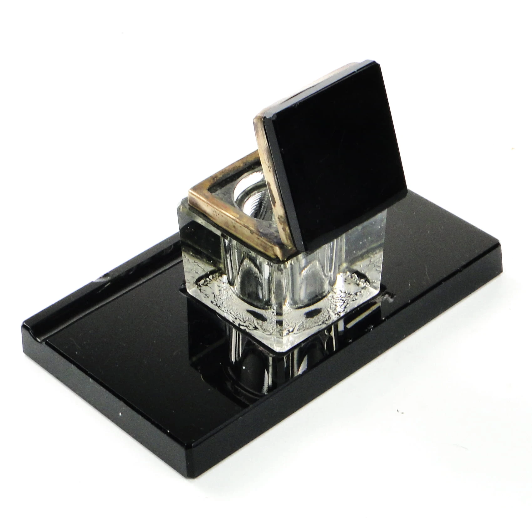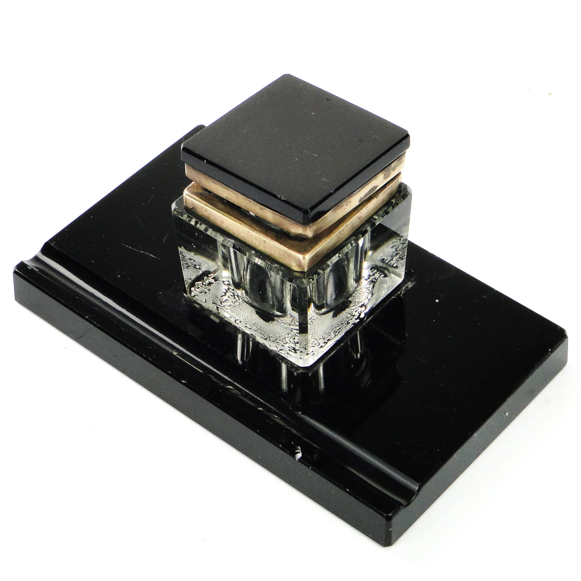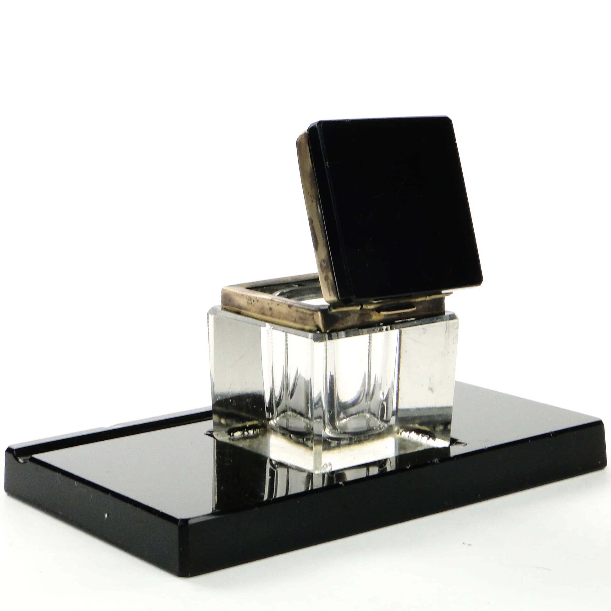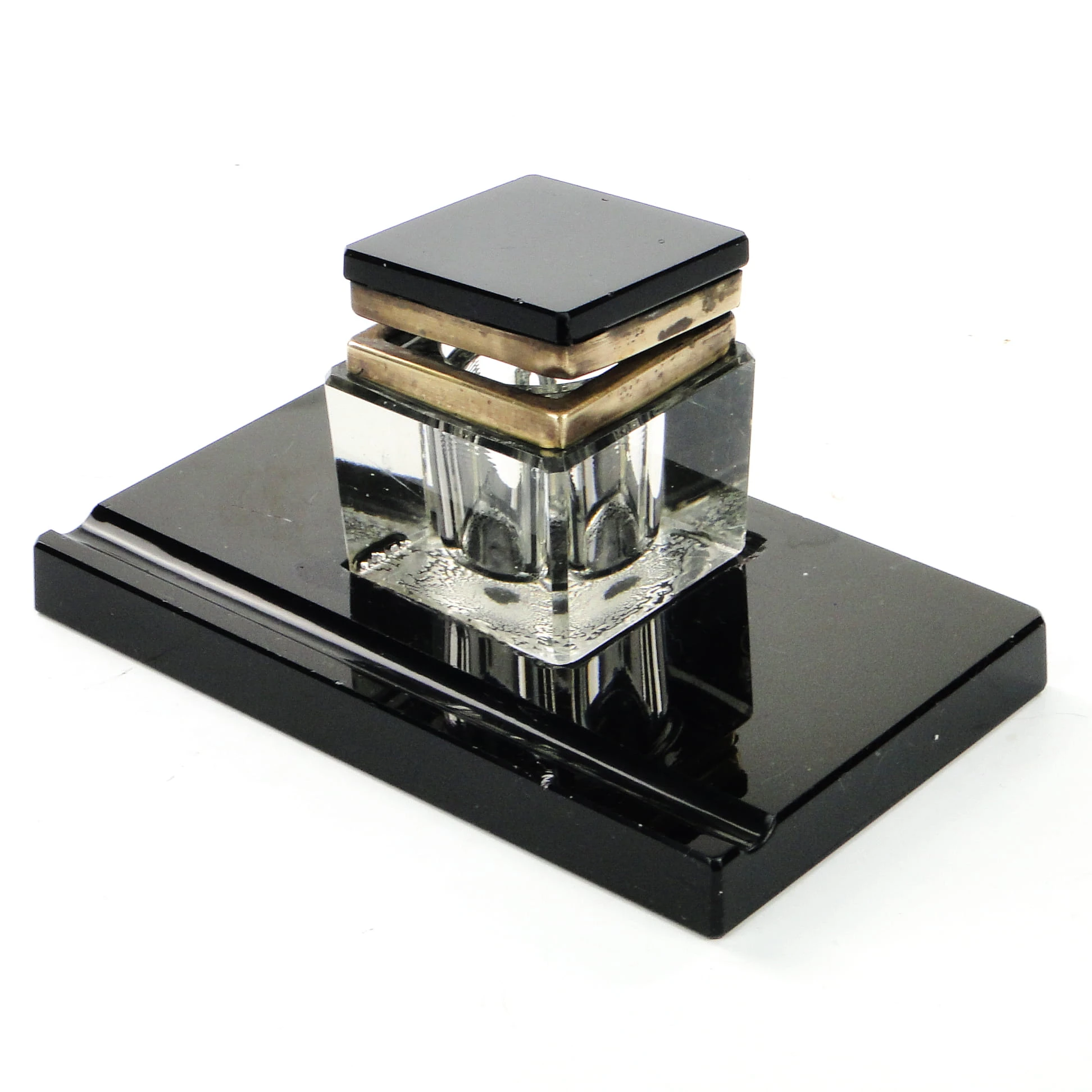 Kałamarz wyprodukowany został w Niemczech w latach 30. Wykonany jest w stylu art deco, powierzchnia jest z fasetowanego szkła przezroczystego i mosiądzu. Zachowany jest w dobrym stanie, dwa drobne odpryski.