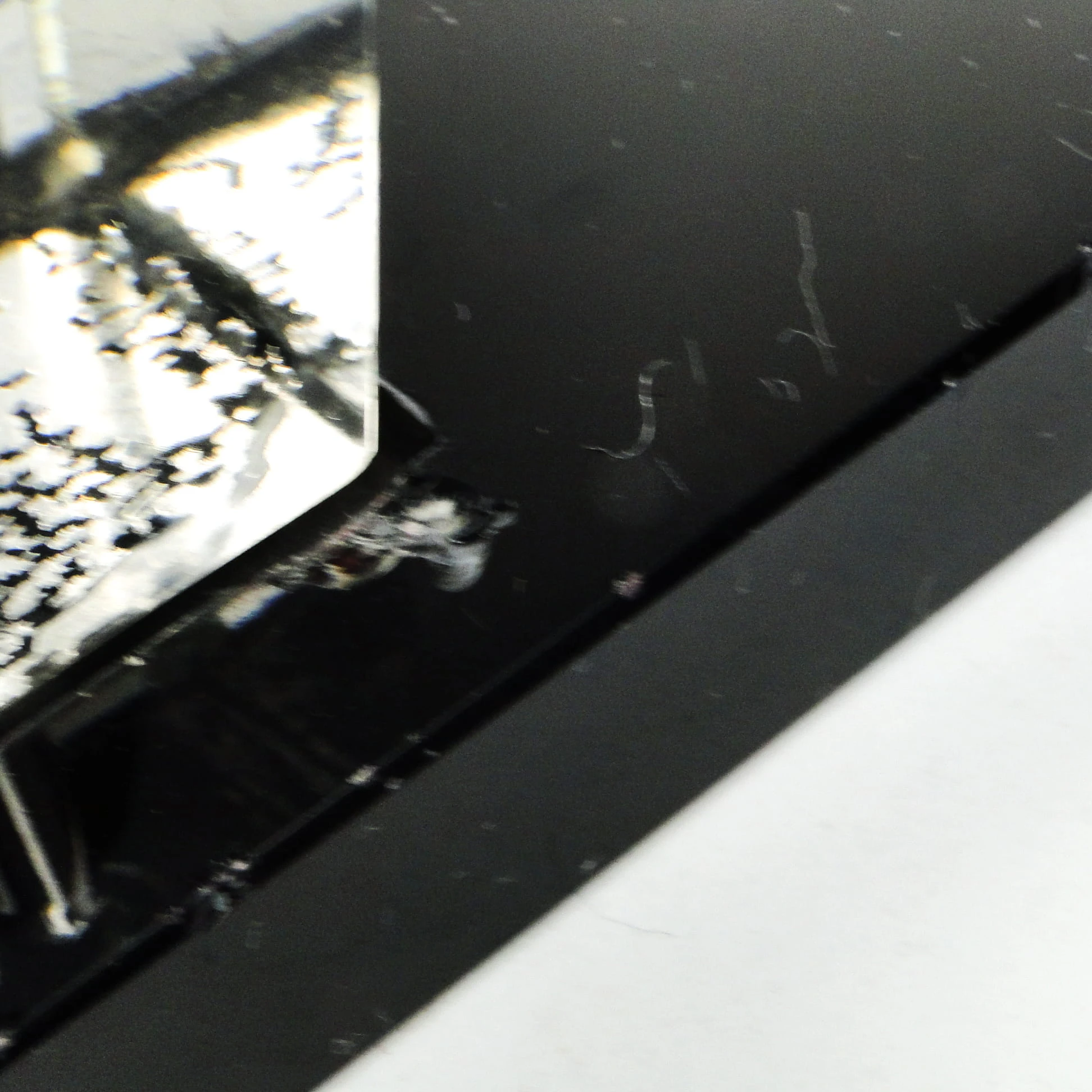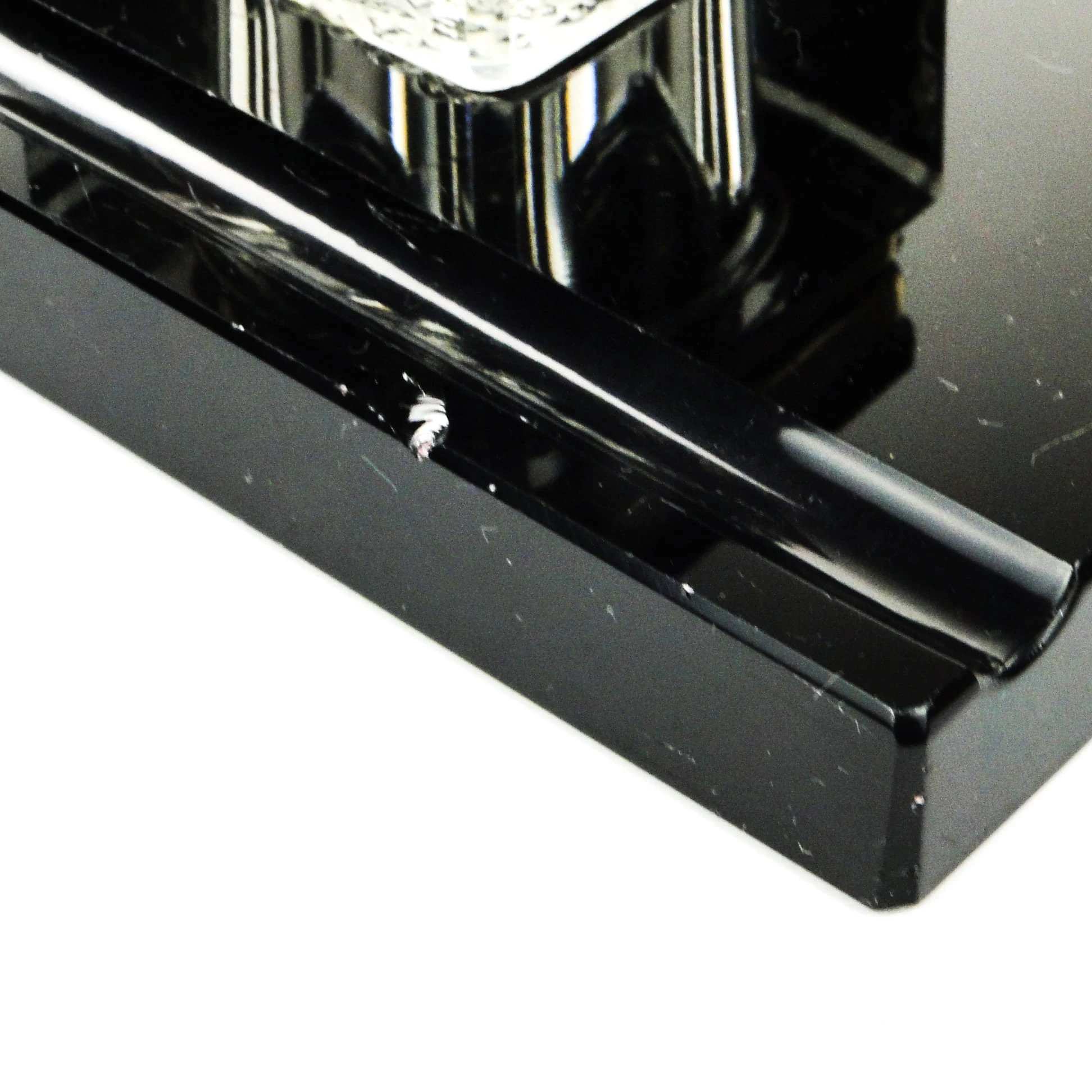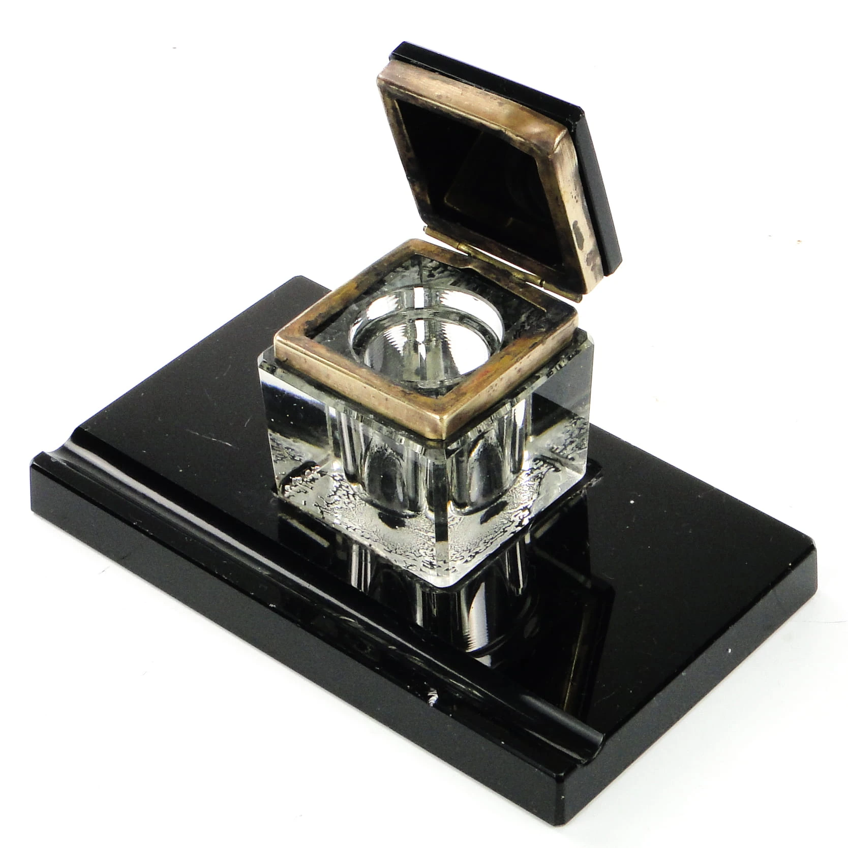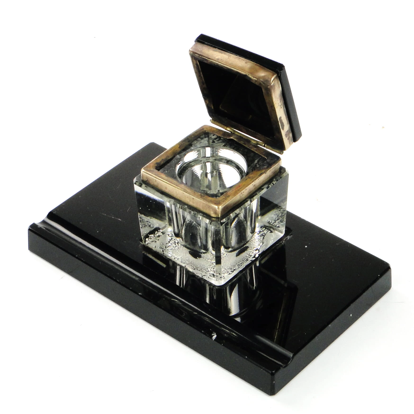 Kałamarz wyprodukowany został w Niemczech w latach 30. Wykonany jest w stylu art deco, powierzchnia jest z fasetowanego szkła przezroczystego i mosiądzu. Zachowany jest w dobrym stanie, dwa drobne odpryski.