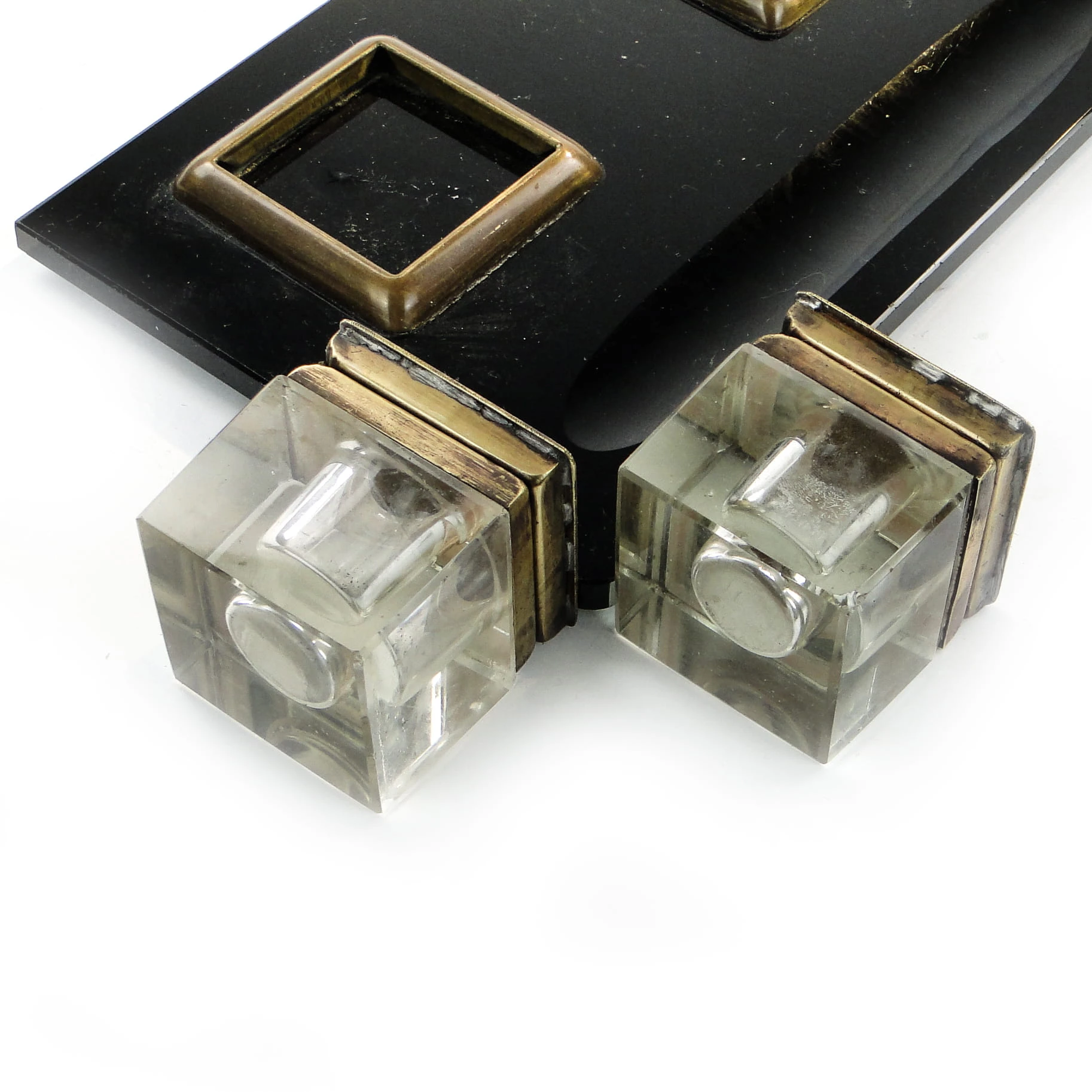 Kałamarz wyprodukowany został w Niemczech w latach 30. Wykonany jest w stylu art deco, powierzchnia jest z fasetowanego szkła przezroczystego i mosiądzu. Zachowany jest w dobrym stanie, dwa drobne odpryski.