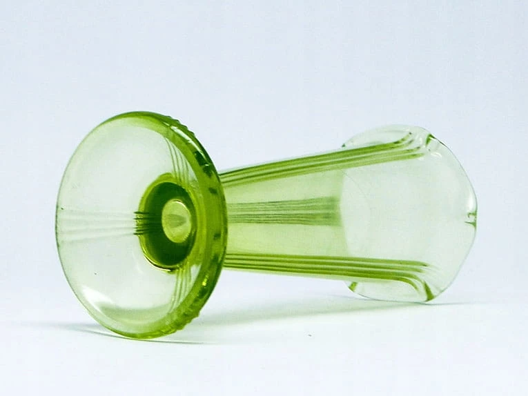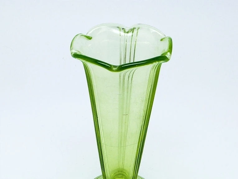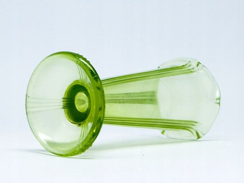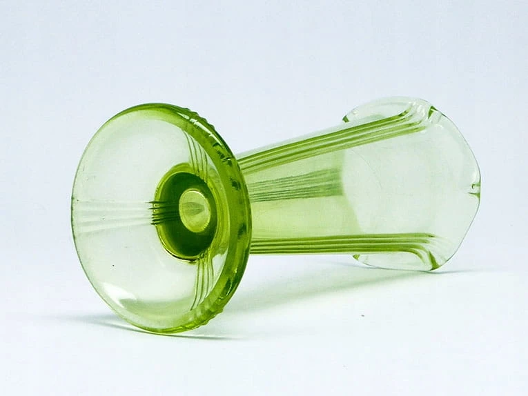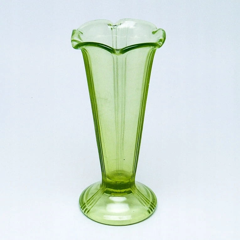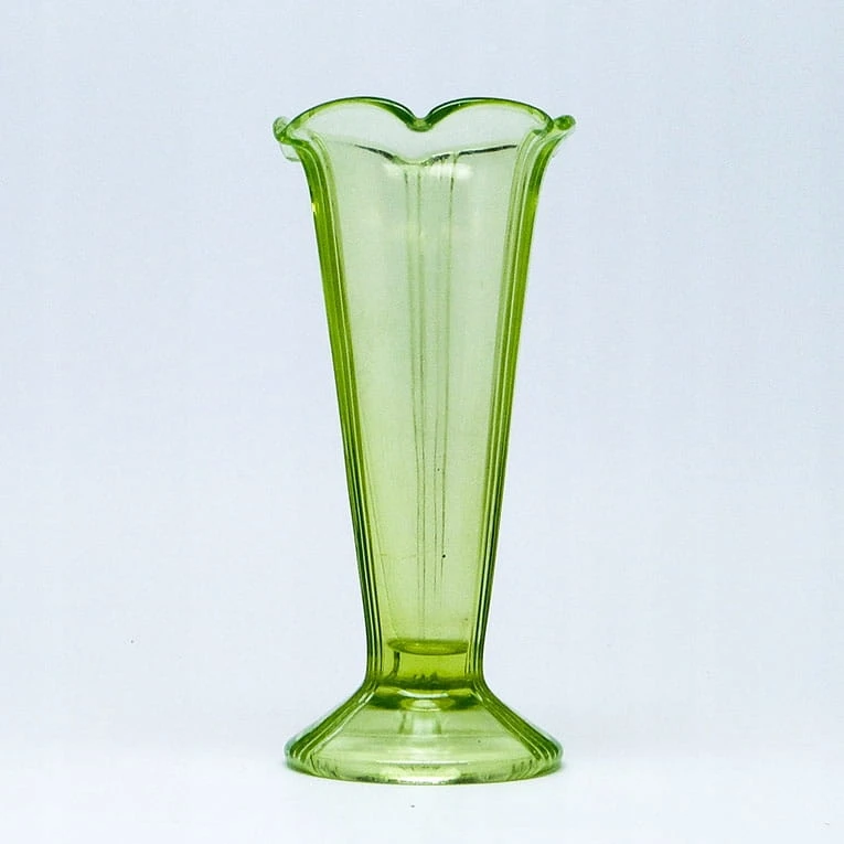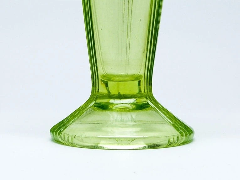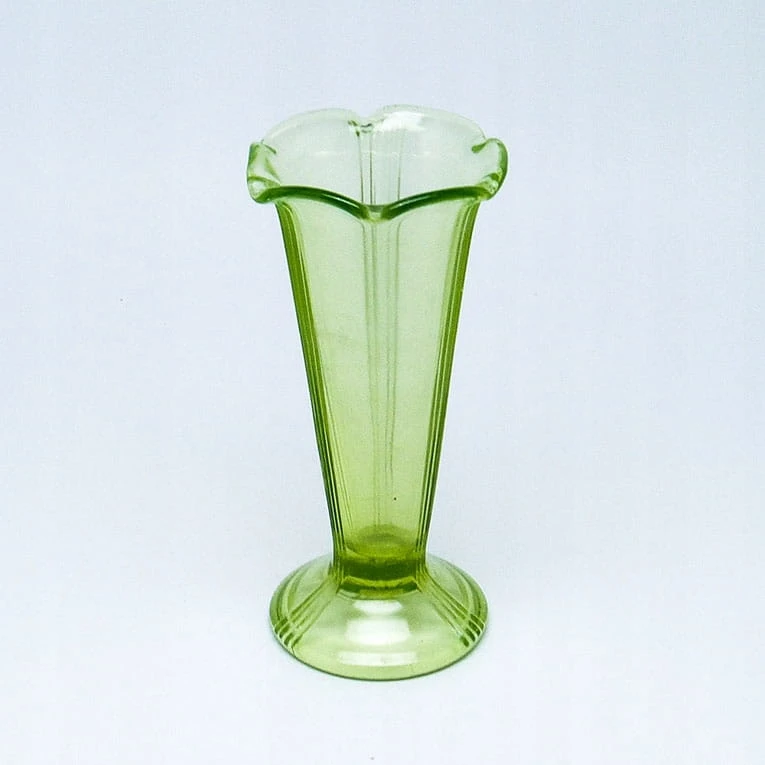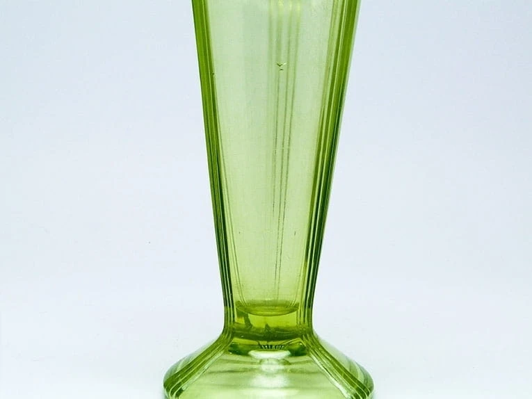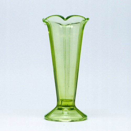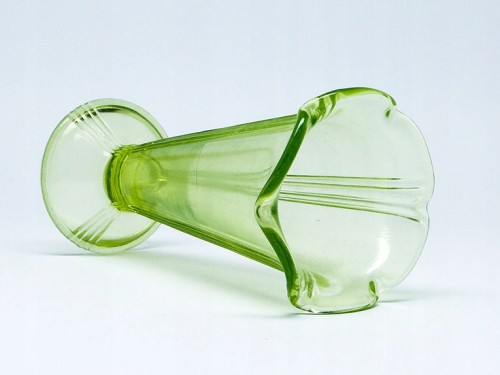 Wazon wykonany metodą prasowania. Naczynie o prostej, geometrycznej formie charakterystycznej dla szkieł Art Deco. Korpus w formie rozszerzającego się ku górze kielicha, w połowie wysokości ozdobiony wytłoczonym zygzakiem. Ośmiokątna stopa oddzielona od korpusu nodusem w kształcie spłaszczonej kuli.