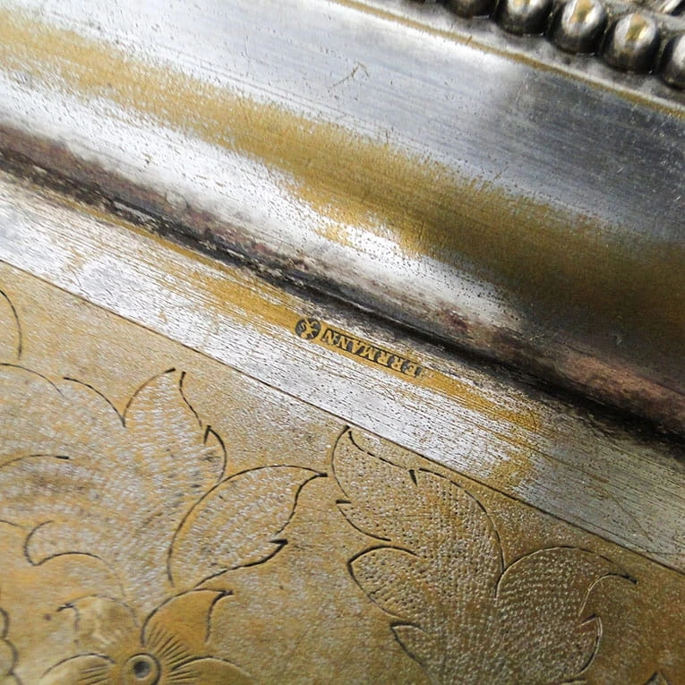 Taca została wykonana w wytwórni platerów Hermann we Wiedniu. Pochodzi z lat 1890-1900. Stan bardzo dobry. Zdobiona ornamentem w formie bawolich oczek, ciężka, masywna i solidna.