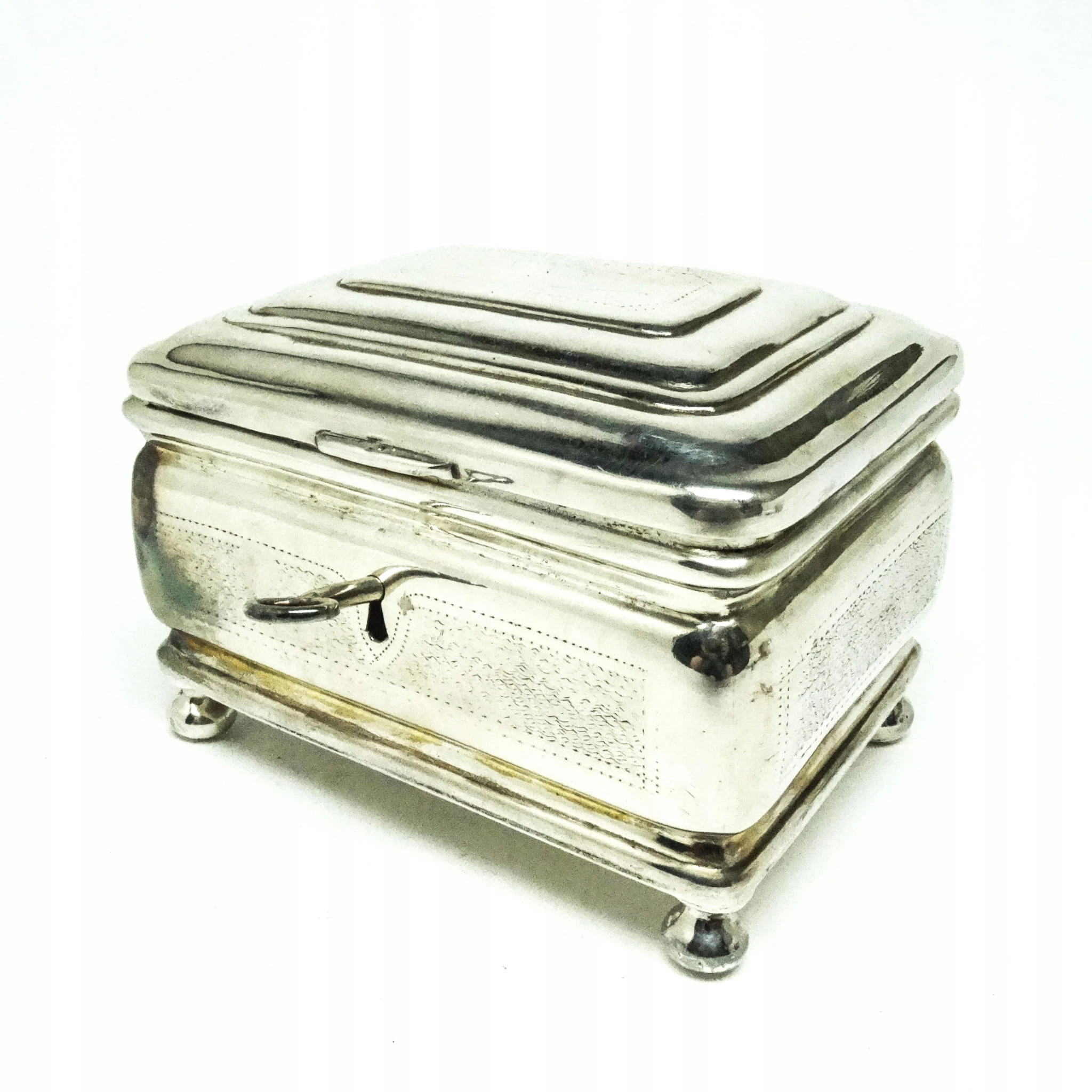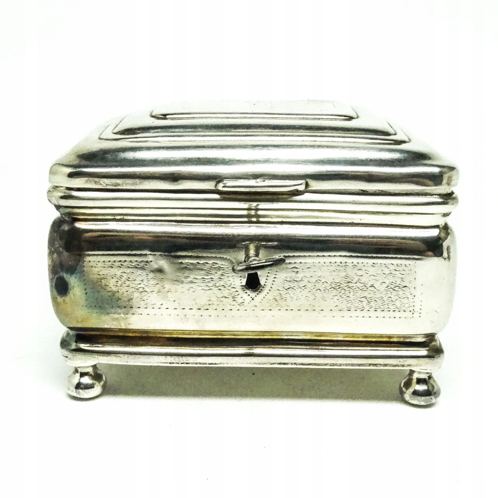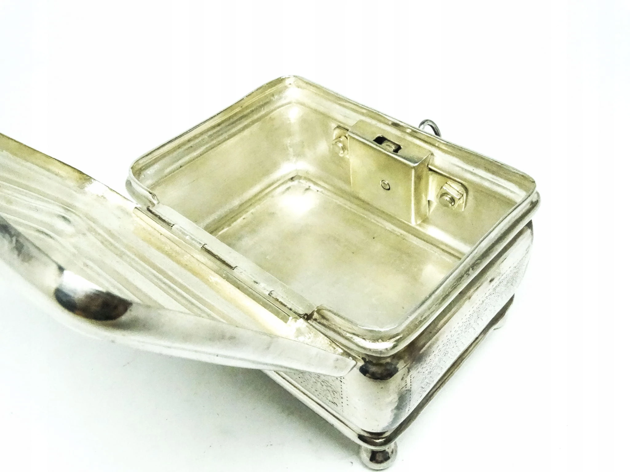Cukiernica skrzynkowa została wyprodukowana w wytwórni platerów Handelsmann w Warszawie w latach 80. XIX wieku. Posiada zamek i kluczyk, stan dobry.