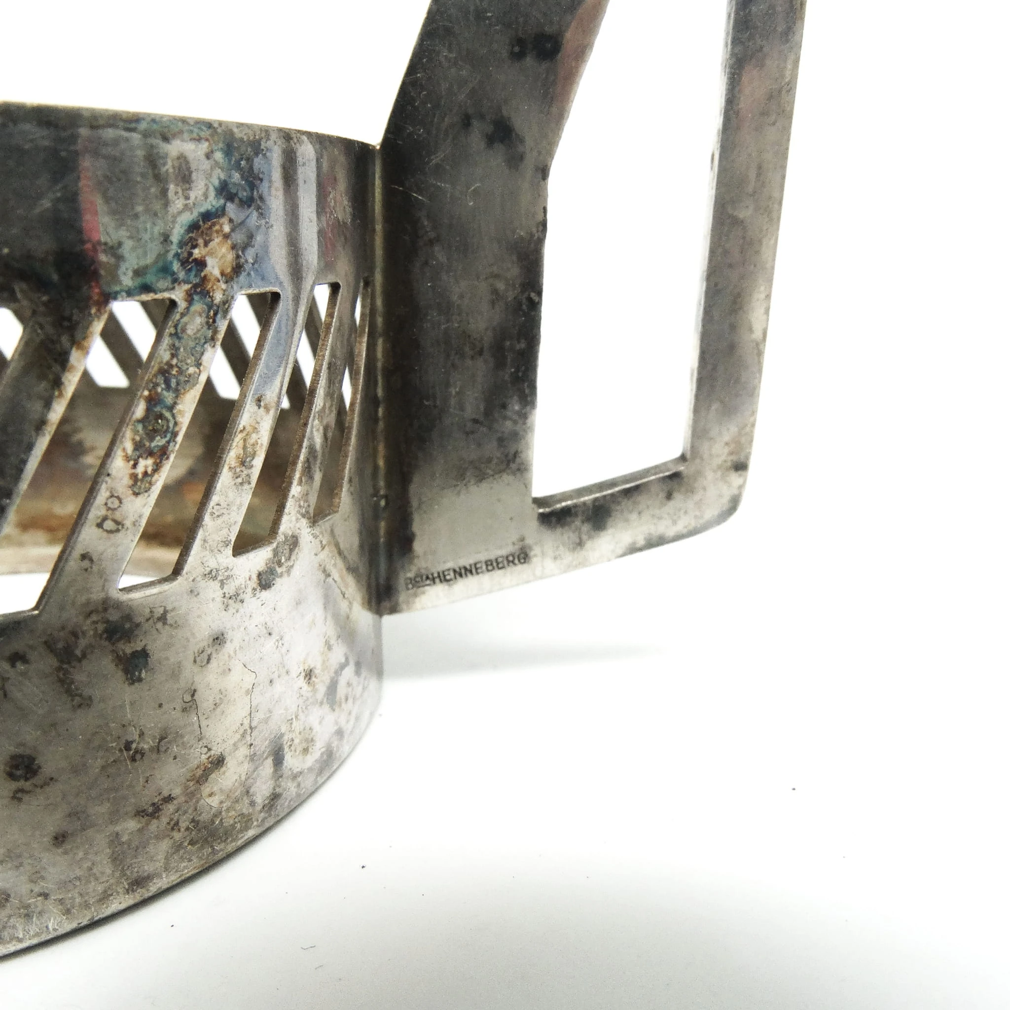 Koszyk do herbaty został wykonany w wytwórni platerów Bracia Henneberg w Warszawie. Pochodzi z lat 30. Nosi ślady użytkowania.
