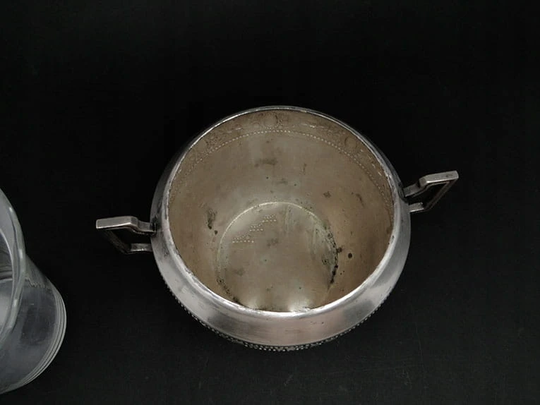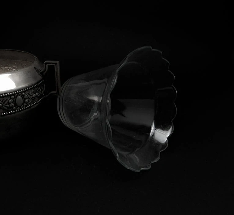 wzorzystymi uchwytami oraz ornamentami wytłoczonymi na grubym metalu, gdzie jednocześnie zachowano bardzo dużą staranność i dbałość o szczegóły oddając styl klasycystyczny. Żadniera posiada także wkład i to nie byle jaki. Jest on wykonany ze szkła szlifowanego i grawerowanego.
