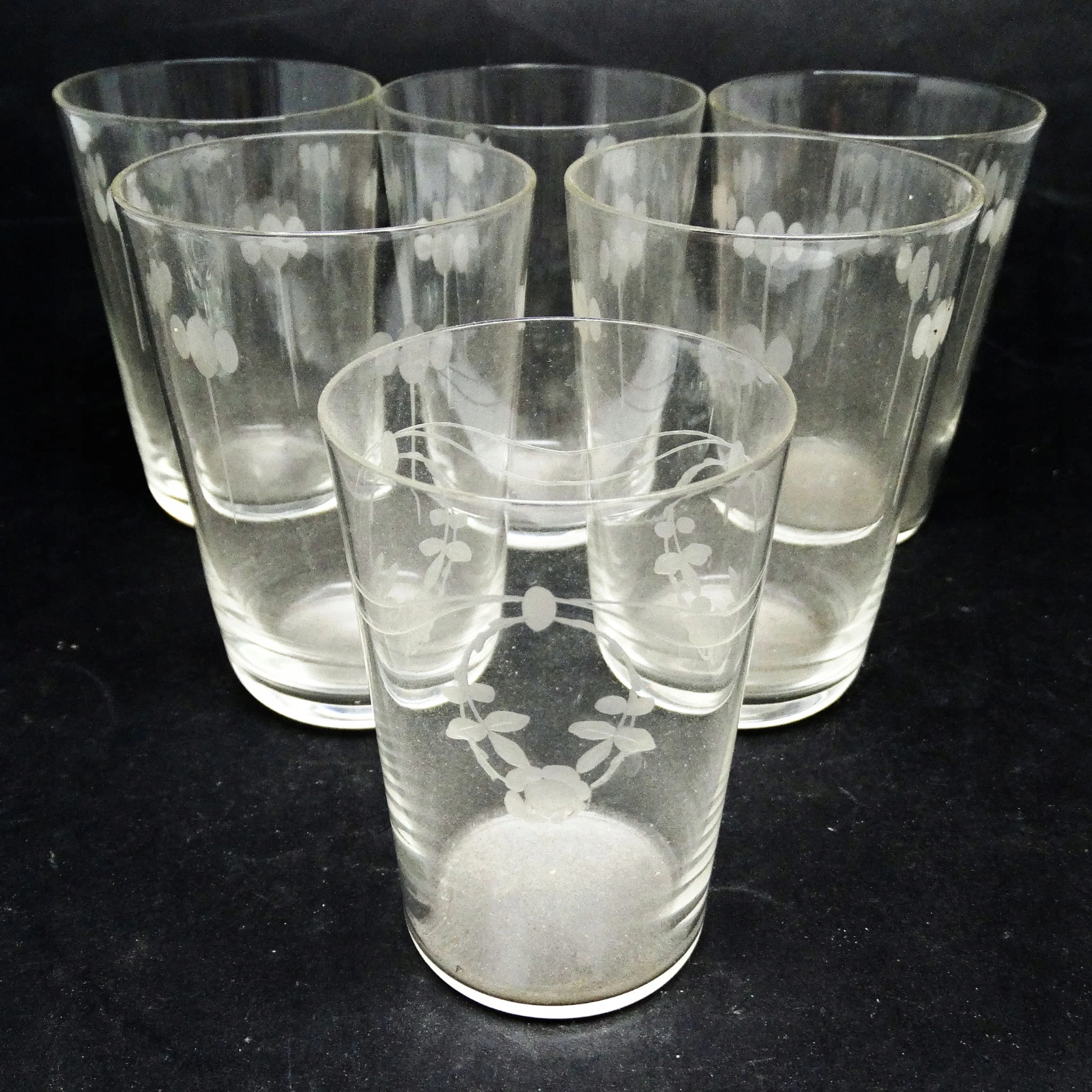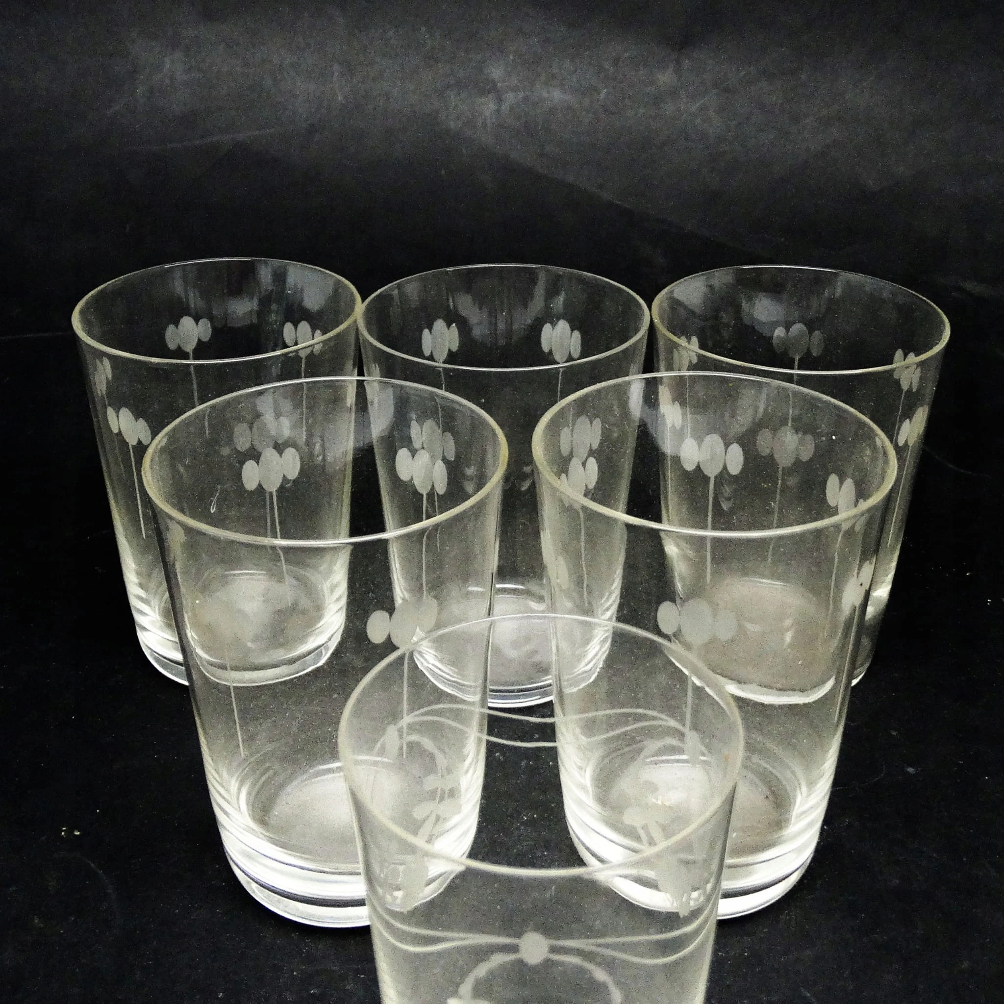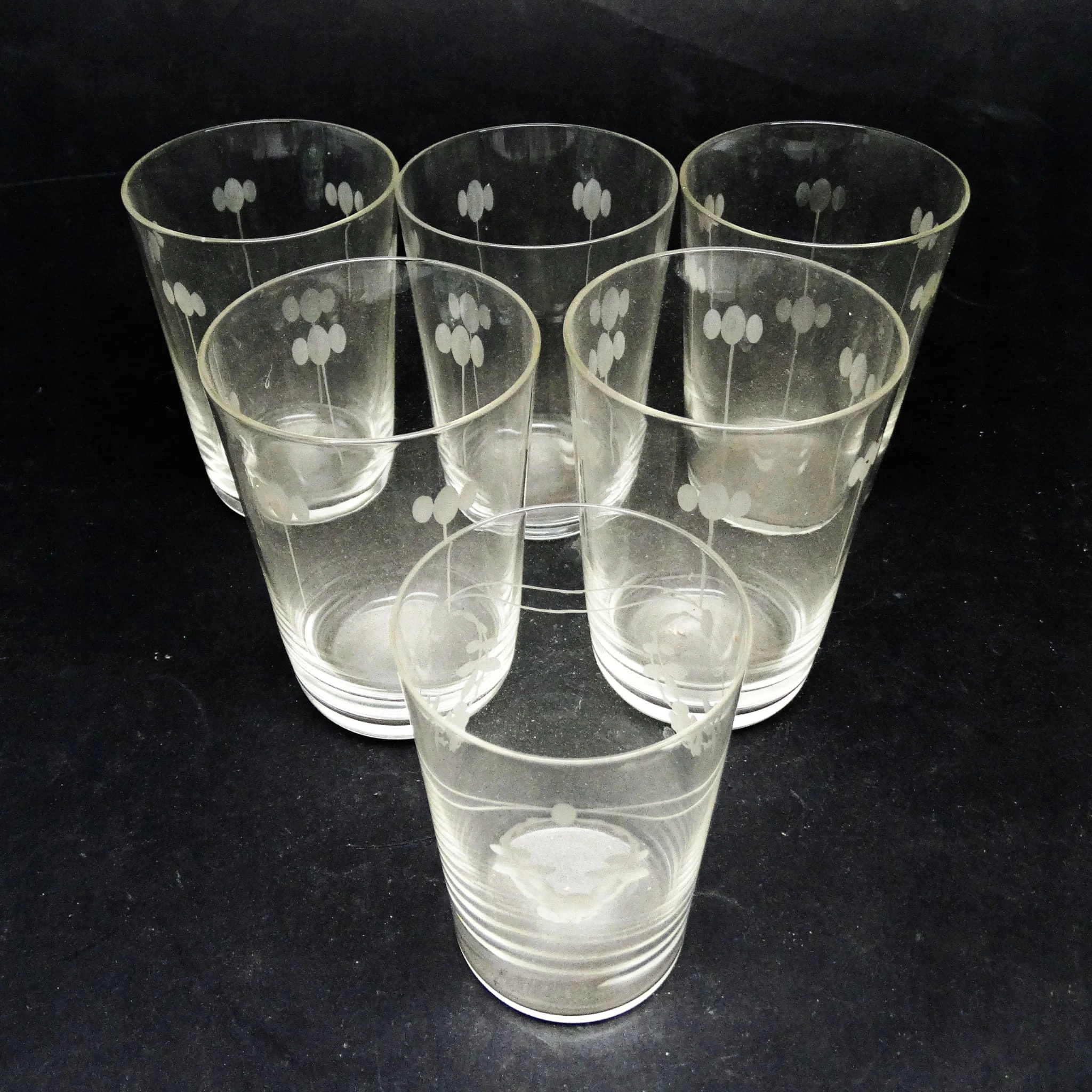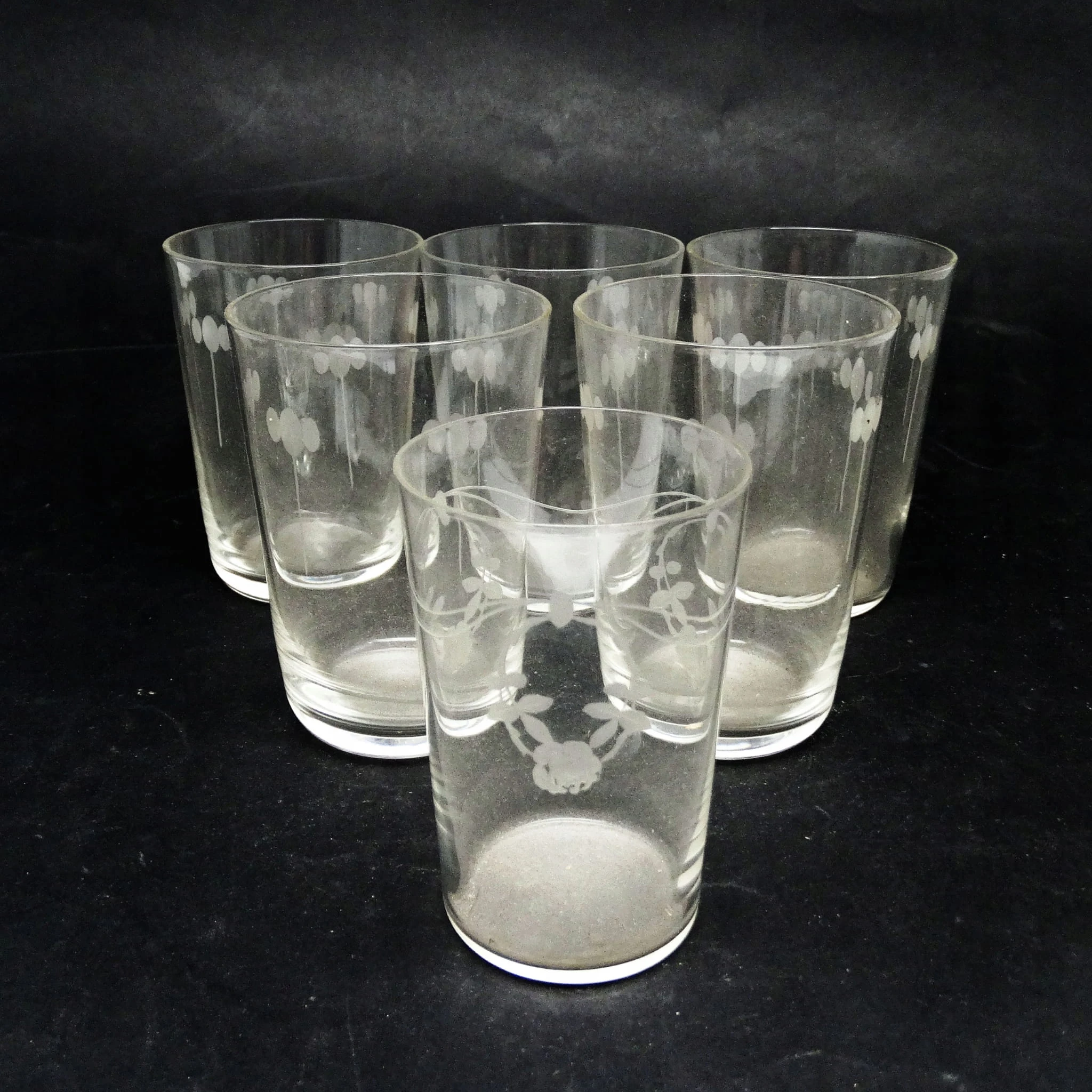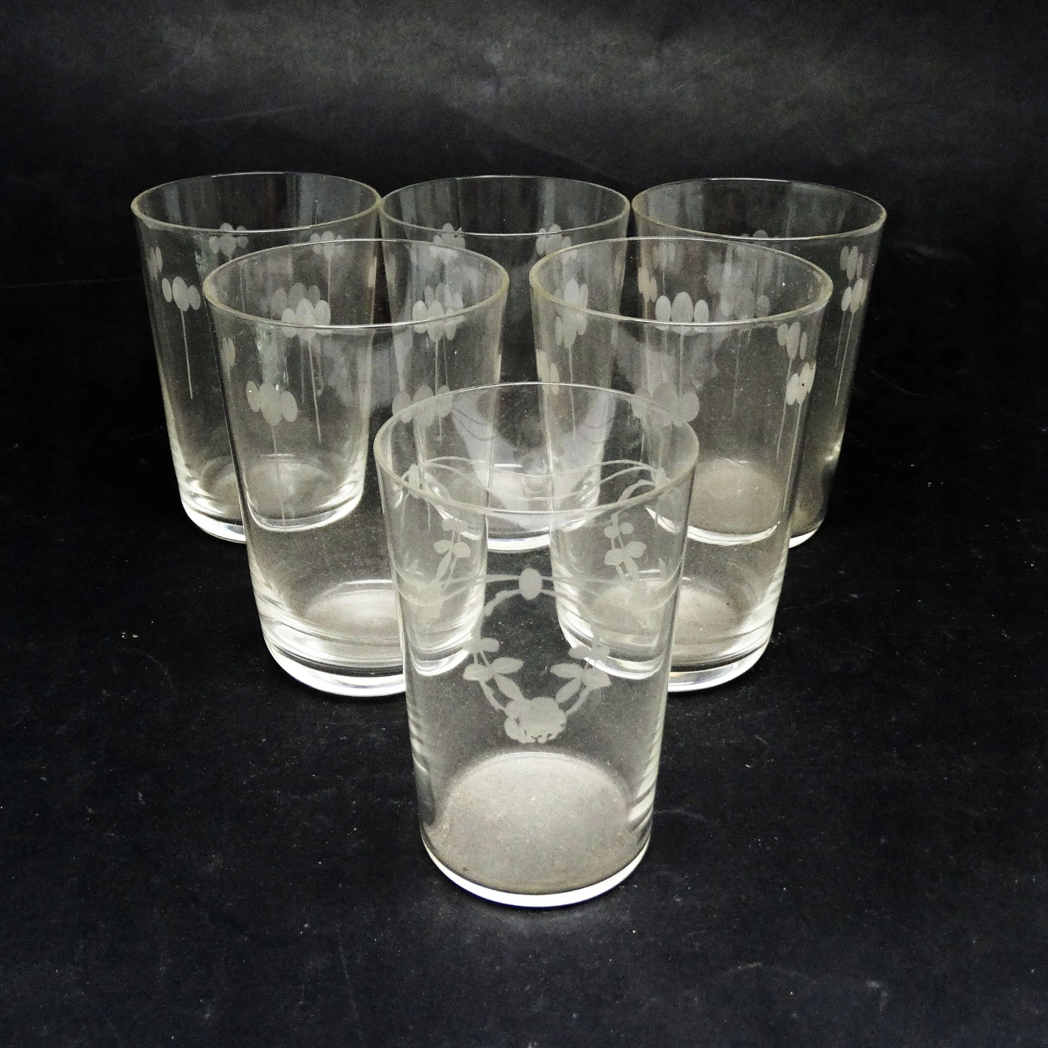 Szklanki wykonane metodą prasowania, ze szkła w odcieniu przeźroczystym, deseniowane. Wykonane w Hucie Hortensja. Stan dobry.