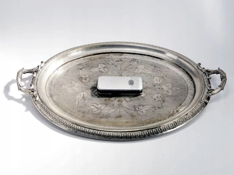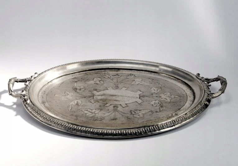 Taca pod serwis kawowy lub do herbaty krakowskiej wytwórni Michała Jarry. Bardzo zdobny przedmiot.