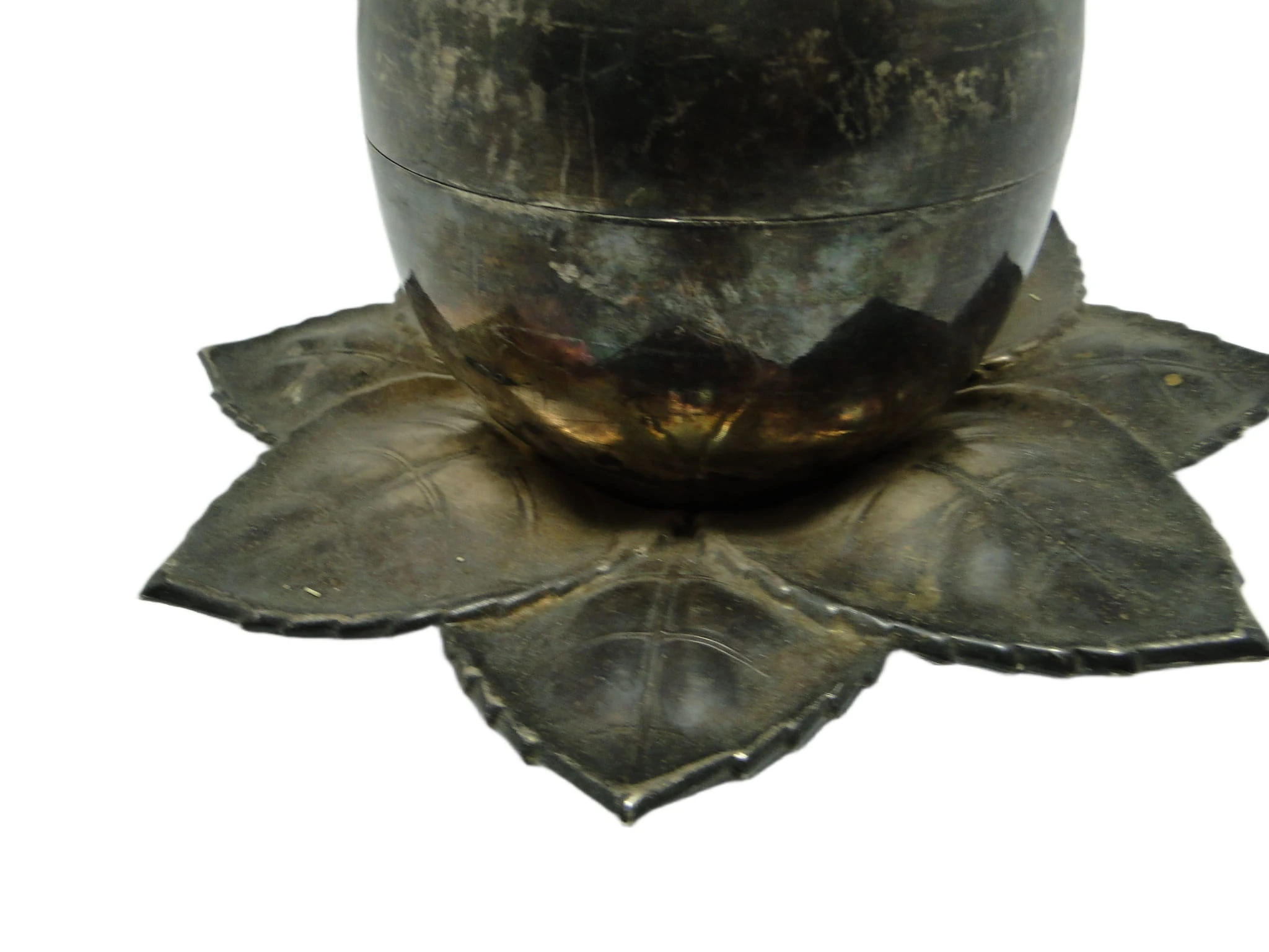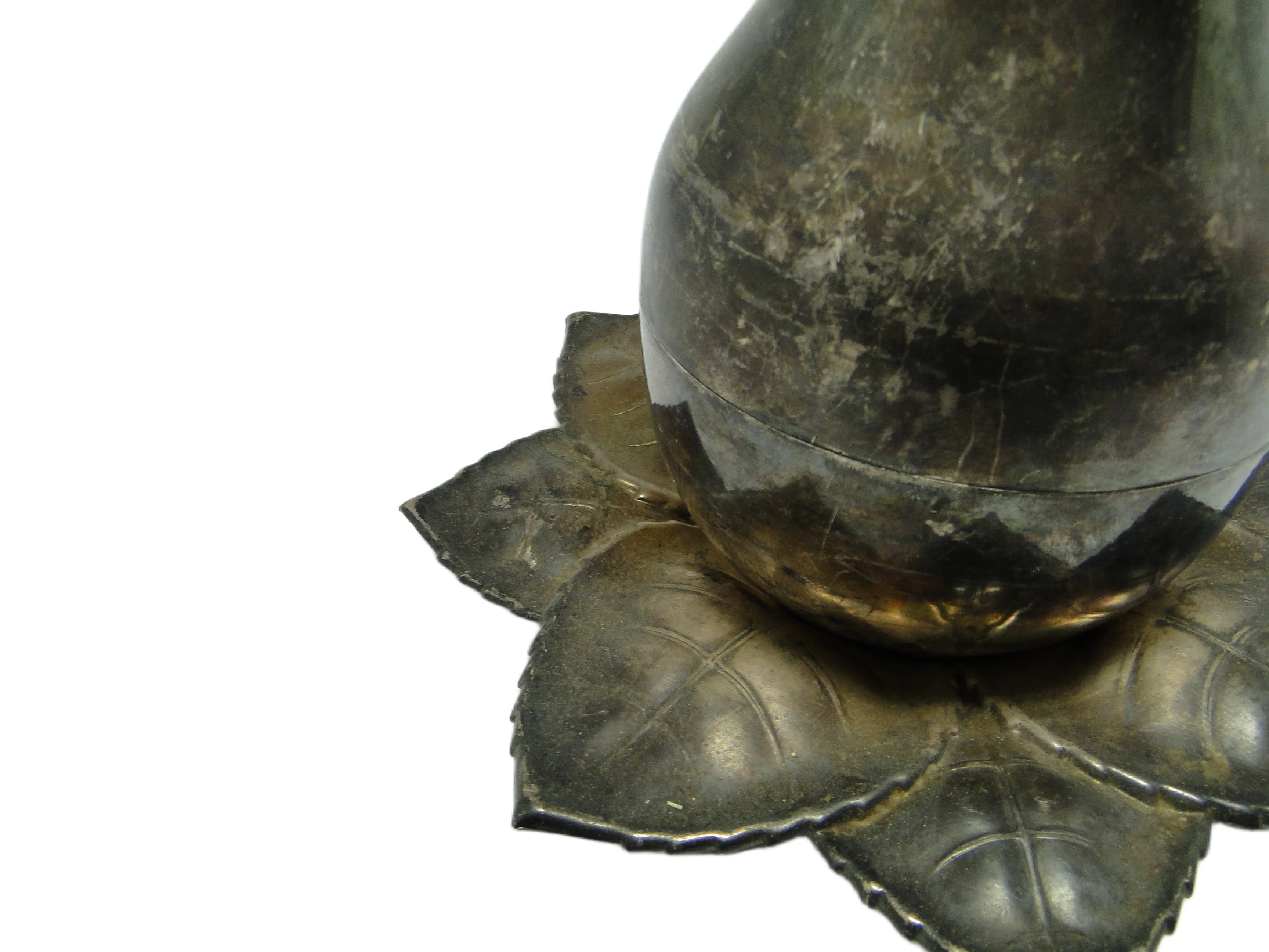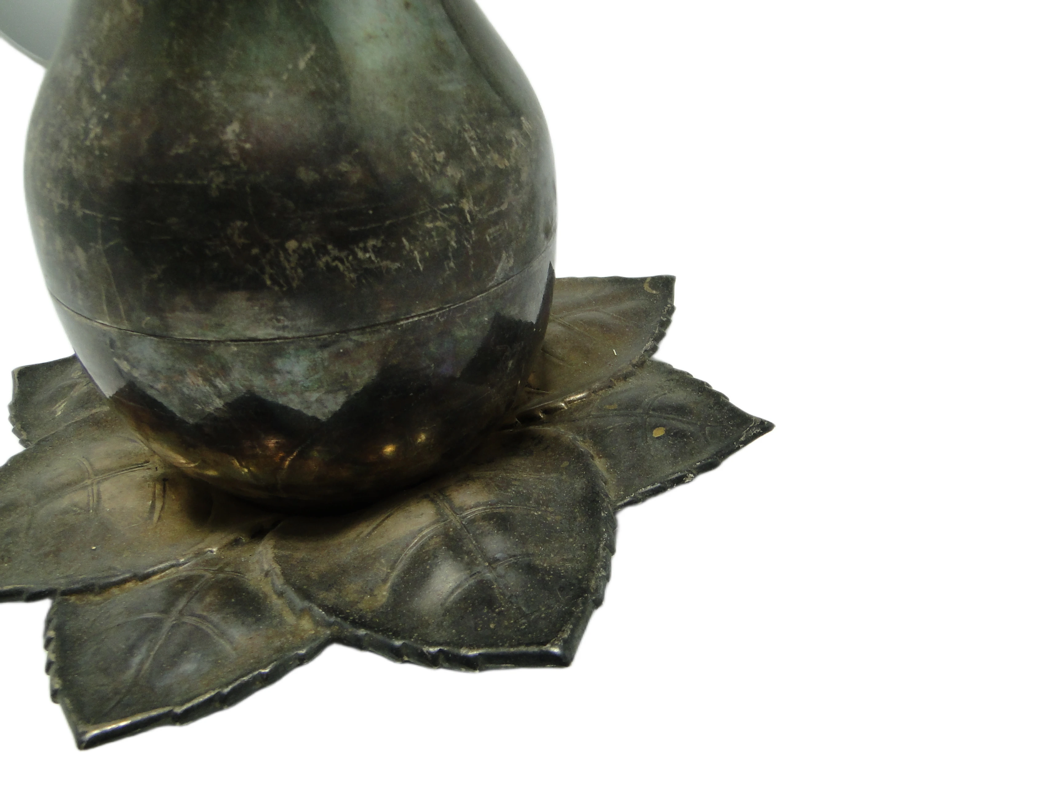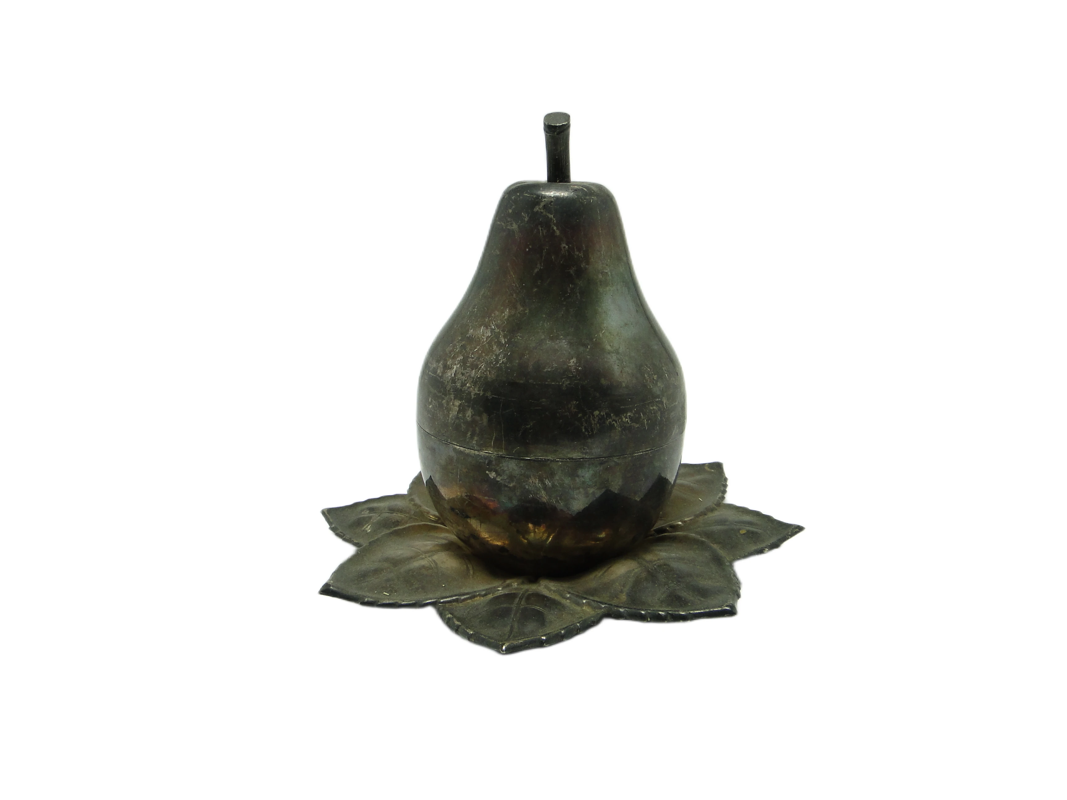 Kabaret na alkohole w stylu art déco z lat 30., wykonany na Węgrzech przez wytwórnię Szandrik, to pojemnik o rzeźbiarskiej formie jabłka z pokrywką ze srebrzonego mosiądzu. Całość osadzona jest na dekoracyjnej podstawie z sześciu tłoczonych liści o wyraźnych żyłkach i miękko falistych krawędziach. Dominujący kolor to chłodne, matowe srebro z miejscowymi złotawymi akcentami, które ujawniają się w miejscach naturalnej patyny i oksydacji. Gładka kopuła jabłka kontrastuje z organiczną, wyczuwalną fakturą podstawy, a wszystkie elementy są spójnie połączone bez widocznych okuć. Przedmiot nosi subtelne rysy i przebarwienia, typowe dla wieku, lecz nie wykazuje poważniejszych uszkodzeń ani śladów napraw. Zachowany w bardzo dobrym stanie, z oryginalnymi elementami i naturalną patyną.Kabaret oddaje głos epoki, w której powstał – lat 30., gdy art déco przywracało codziennym przedmiotom rangę małych dzieł sztuki. Jego obła, zamknięta forma przywodzi na myśl wieczory spędzane w eleganckich salonach, gdzie srebrzyste refleksy odbijały się w kieliszkach, a organiczna podstawa liści wprowadzała zmysłowy kontrapunkt dla geometrycznej dyscypliny stylu. Matowe wykończenie i miejscowa oksydacja mówią o upływie czasu, który nie zatarł uroku przedmiotu, lecz nadał mu autentyczności i kolekcjonerskiej szlachetności.Kabaret można zestawić z barkiem z ciemnego drewna, konsolą w stylu art déco lub kolekcją szkła lat 30., gdzie jego organiczna bryła ciekawie kontrastuje z prostymi liniami innych obiektów. Sprawdzi się również jako pojemnik na niewielkie alkohole, drobne akcesoria do serwowania lub ozdobny akcent w klasycznych wnętrzach z retro elementami. Warto połączyć go z matowym szkłem, chromem czy geometrycznymi detalami, by podkreślić zarówno historyczne, jak i współczesne odniesienia.