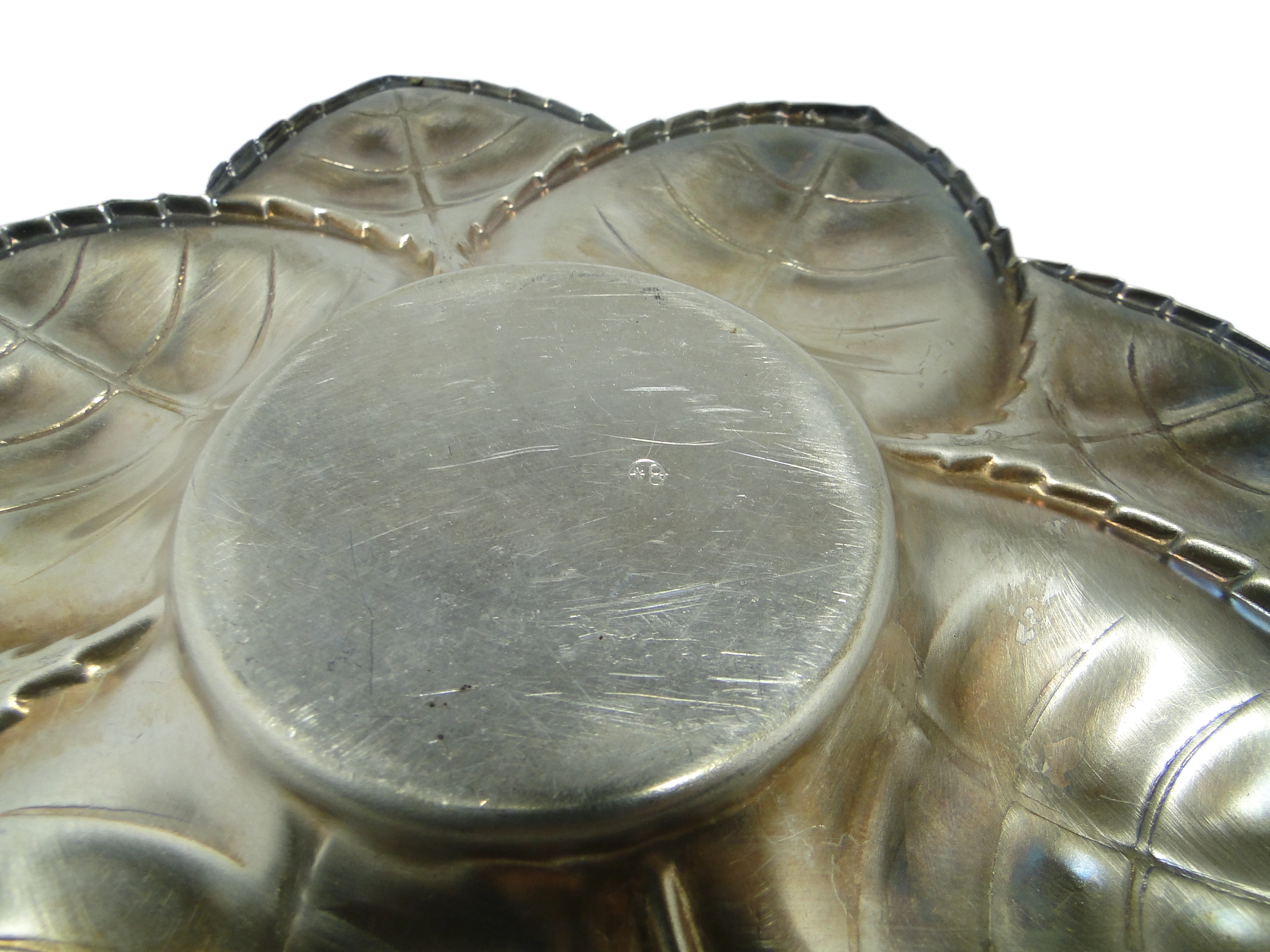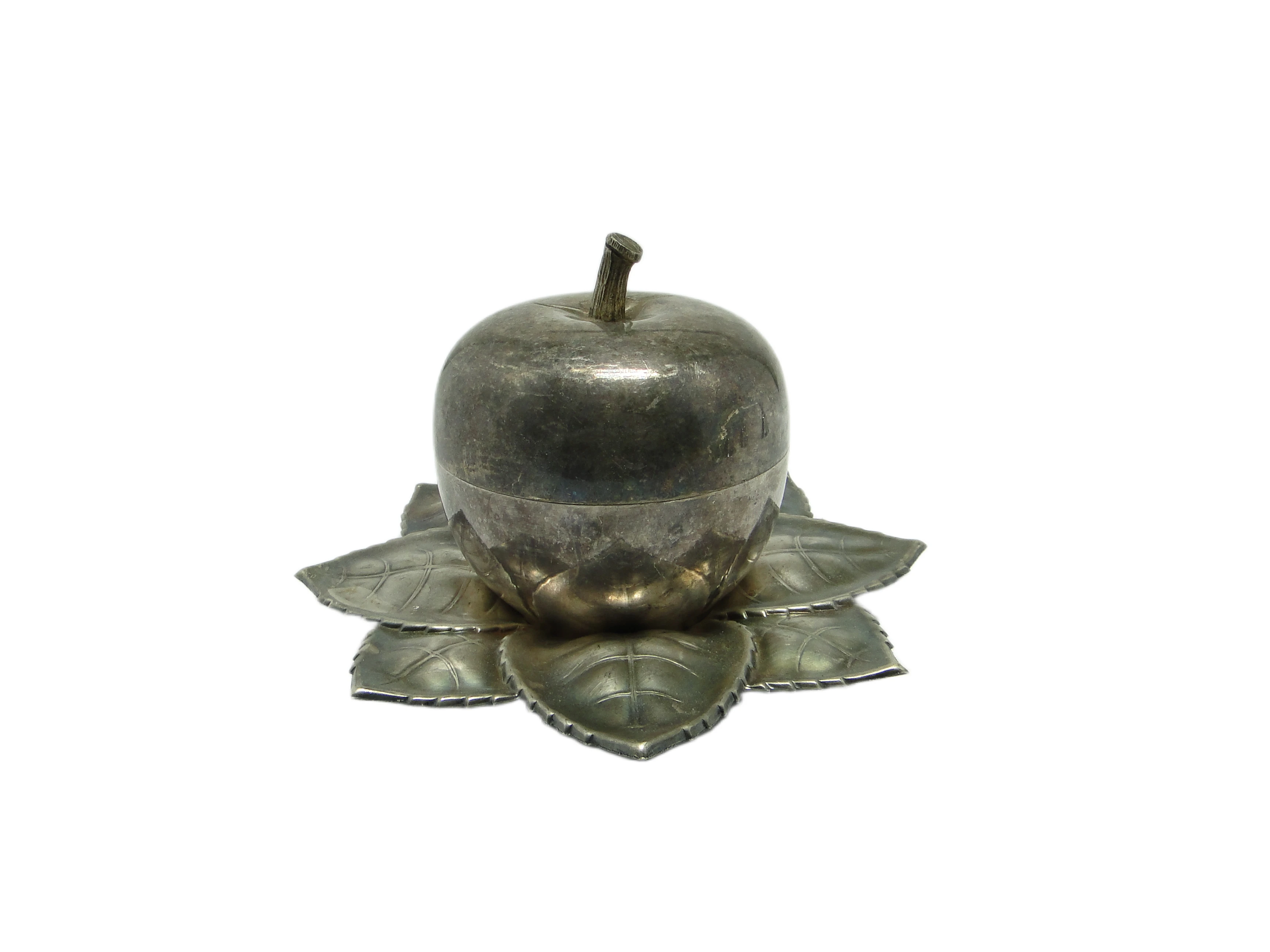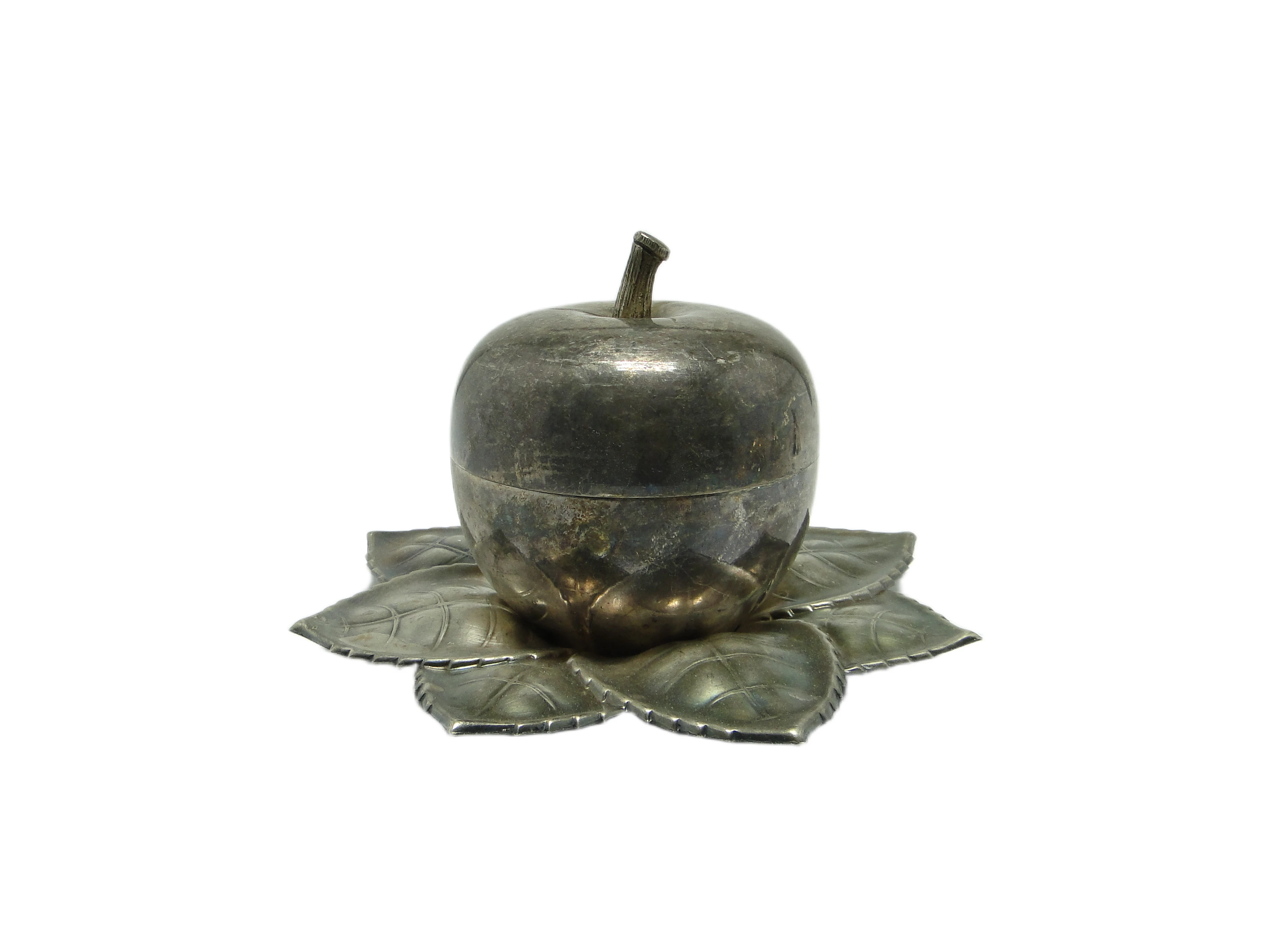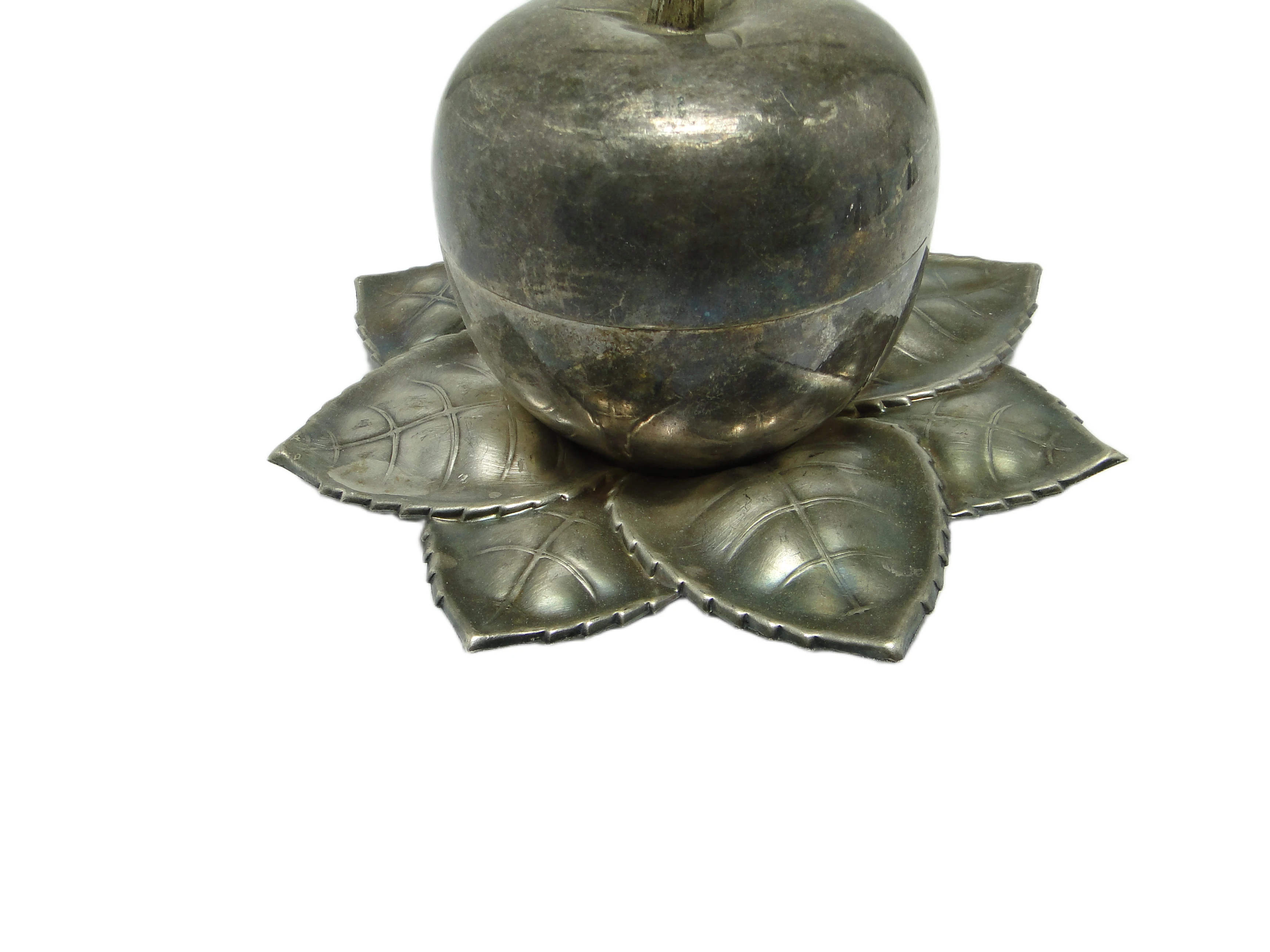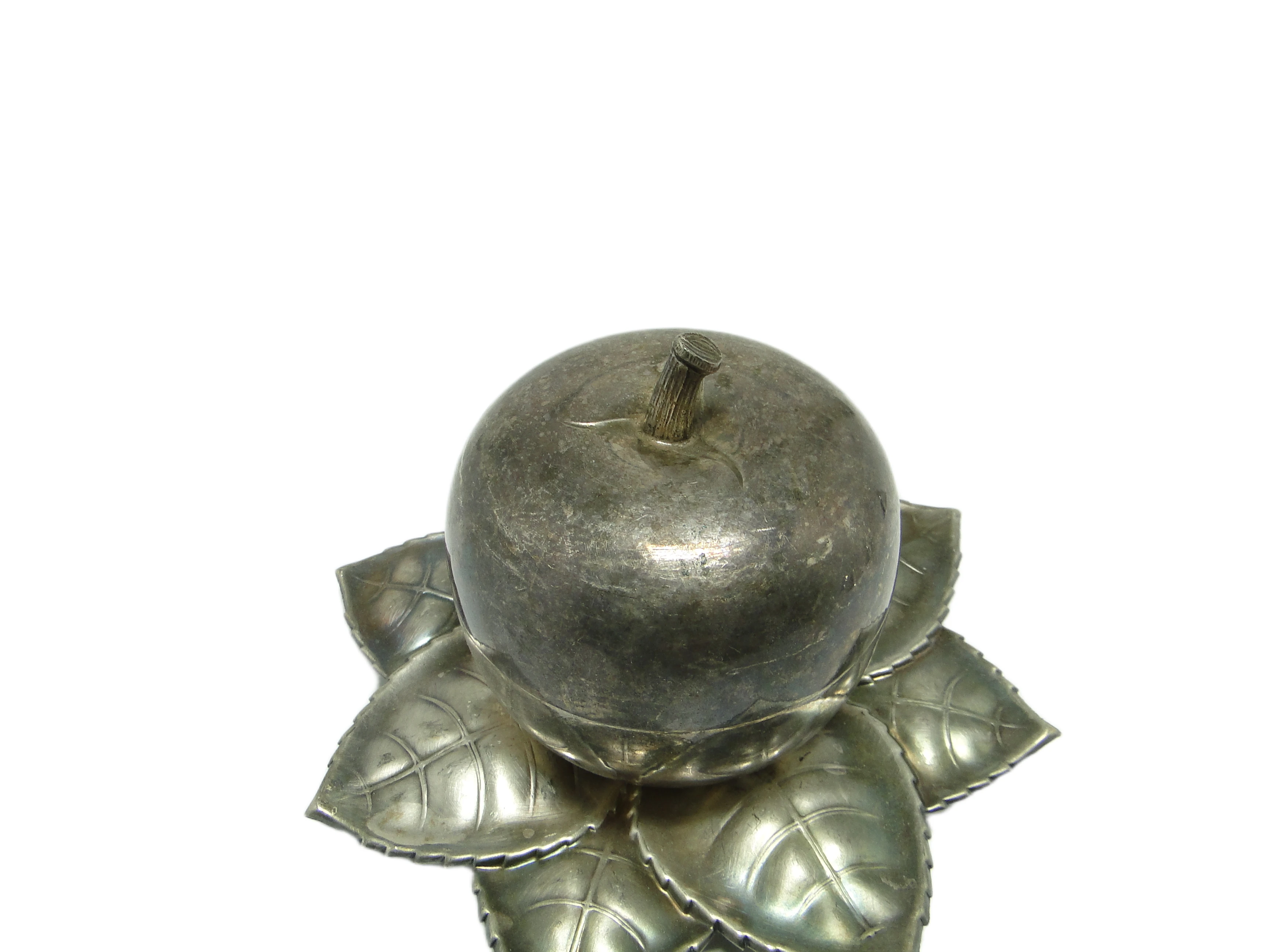Kabaret na alkohole w stylu art déco z lat 30., wykonany na Węgrzech przez wytwórnię Szandrik, to pojemnik o rzeźbiarskiej formie jabłka z pokrywką ze srebrzonego mosiądzu. Całość osadzona jest na dekoracyjnej podstawie z sześciu tłoczonych liści o wyraźnych żyłkach i miękko falistych krawędziach. Dominujący kolor to chłodne, matowe srebro z miejscowymi złotawymi akcentami, które ujawniają się w miejscach naturalnej patyny i oksydacji. Gładka kopuła jabłka kontrastuje z organiczną, wyczuwalną fakturą podstawy, a wszystkie elementy są spójnie połączone bez widocznych okuć. Przedmiot nosi subtelne rysy i przebarwienia, typowe dla wieku, lecz nie wykazuje poważniejszych uszkodzeń ani śladów napraw. Zachowany w bardzo dobrym stanie, z oryginalnymi elementami i naturalną patyną.Kabaret oddaje głos epoki, w której powstał – lat 30., gdy art déco przywracało codziennym przedmiotom rangę małych dzieł sztuki. Jego obła, zamknięta forma przywodzi na myśl wieczory spędzane w eleganckich salonach, gdzie srebrzyste refleksy odbijały się w kieliszkach, a organiczna podstawa liści wprowadzała zmysłowy kontrapunkt dla geometrycznej dyscypliny stylu. Matowe wykończenie i miejscowa oksydacja mówią o upływie czasu, który nie zatarł uroku przedmiotu, lecz nadał mu autentyczności i kolekcjonerskiej szlachetności.Kabaret można zestawić z barkiem z ciemnego drewna, konsolą w stylu art déco lub kolekcją szkła lat 30., gdzie jego organiczna bryła ciekawie kontrastuje z prostymi liniami innych obiektów. Sprawdzi się również jako pojemnik na niewielkie alkohole, drobne akcesoria do serwowania lub ozdobny akcent w klasycznych wnętrzach z retro elementami. Warto połączyć go z matowym szkłem, chromem czy geometrycznymi detalami, by podkreślić zarówno historyczne, jak i współczesne odniesienia.