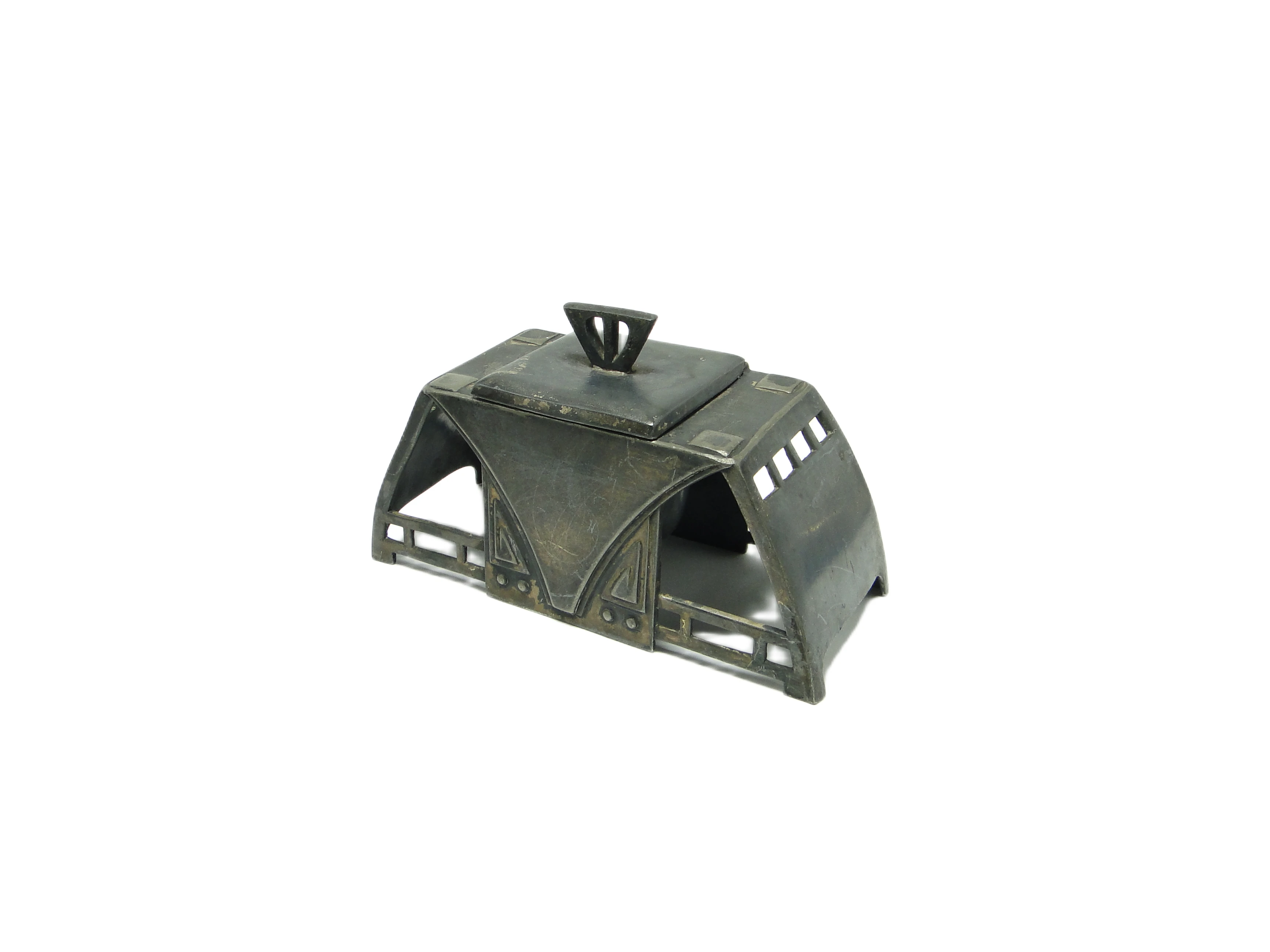 Kałamarz wyprodukowany przez renomowaną niemiecką manufakturę WMF na początku XX wieku jest przykładem secesyjnego wzornictwa z wyraźnymi wpływami wczesnego modernizmu. Wykonany ze srebrzonej cyny, wyróżnia się zwartą, architektoniczną formą o niskim profilu i szerokiej podstawie. Trapezowe boki, geometryczne wycięcia oraz płaska pokrywa, zwieńczona stylizowanym trójkątnym uchwytem, tworzą kompozycję typową dla Jugendstilu. Powierzchnia w przygaszonym, matowym odcieniu srebra jest lekko szorstka, z widocznymi śladami patyny, miejscami oksydacji oraz drobnymi rysami i wgnieceniami. Wzmocnienia w postaci nitów i wyraźnych połączeń mechanicznych podkreślają solidność ręcznego wykonania. Kałamarz zachowany jest w bardzo dobrym stanie – nie posiada poważnych uszkodzeń, a naturalne ślady użytkowania i wiekowa patyna wzmacniają autentyczność antyku.Forma kałamarza niesie w sobie głos początku XX wieku, kiedy sztuka użytkowa poszukiwała harmonii między inspiracją naturą a rodzącą się nowoczesnością. Metalowe powierzchnie, matowe i nieco przytłumione, przywołują obrazy dawnych biurek, na których rozgrywały się setki zapisanych stron i wieczorów spędzonych przy świetle lampy. Każdy detal – od geometrycznych wycięć po masywny trójkątny uchwyt – oddaje ducha secesji, w której dynamiczna linia spotyka się z architektonicznym rygorem. Widoczne ślady czasu wydają się opowiadać o epoce, gdy przedmioty codziennego użytku miały ambicję stać się nośnikiem artystycznej idei.Kałamarz WMF można zestawić z biurkiem z epoki lub współczesnymi meblami o prostych liniach, gdzie jego rzeźbiarska forma stworzy kontrapunkt dla gładkich powierzchni. Dobrze sprawdzi się na klasycznej konsoli w salonie lub w gabinecie kolekcjonera, w otoczeniu przedmiotów z metalu, szkła lub ciemnego drewna. Warto połączyć go z minimalistyczną lampą stołową lub ceramiczną tacą – taki zestaw pozwoli zbudować subtelną, historyczną narrację we wnętrzu o kolekcjonerskim charakterze.