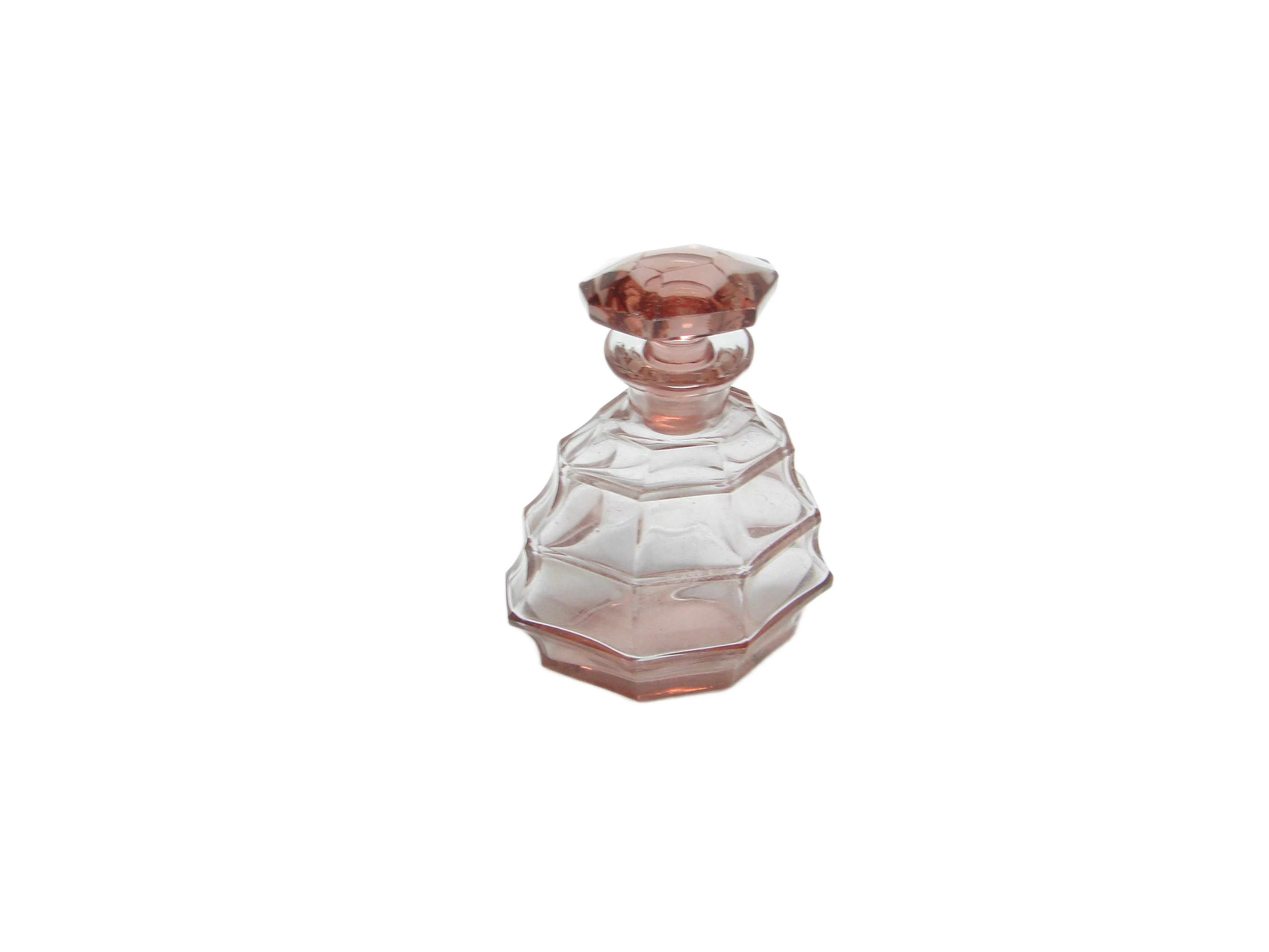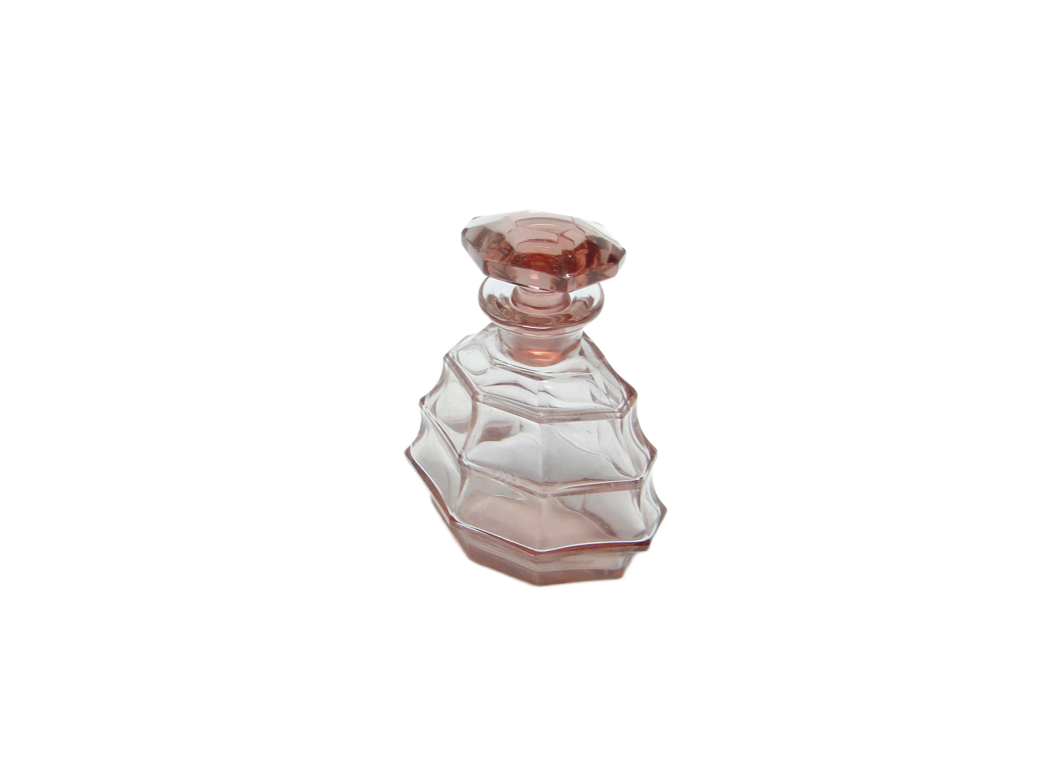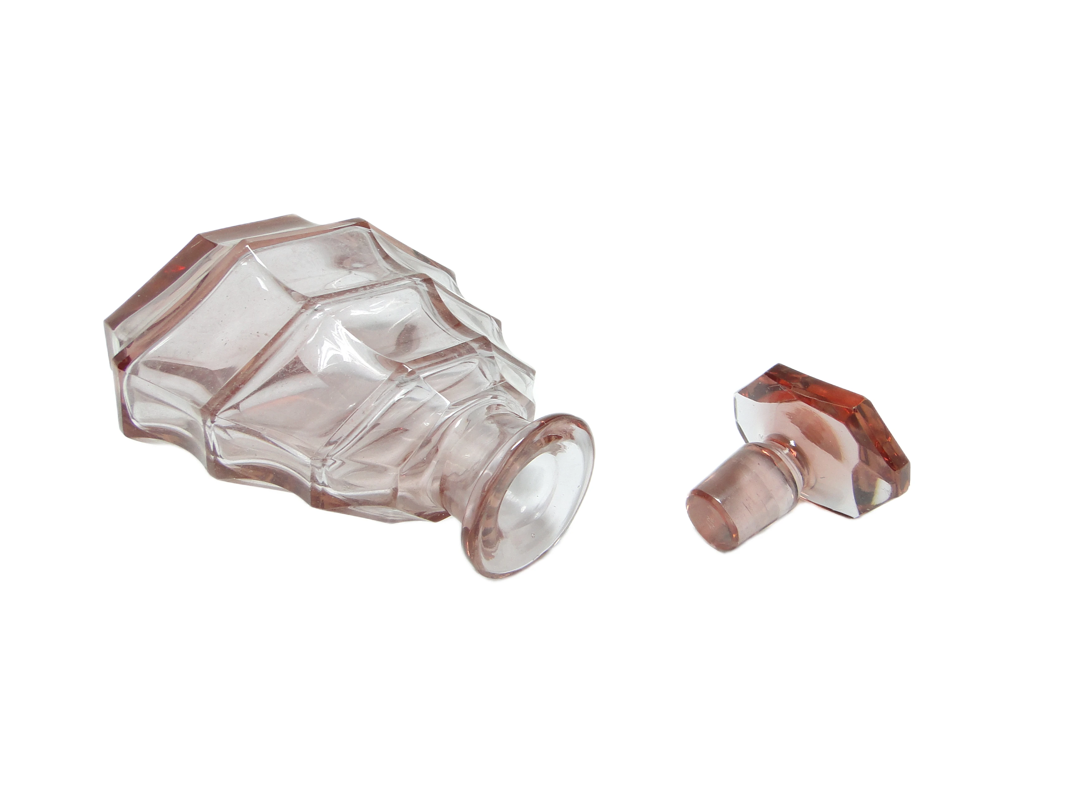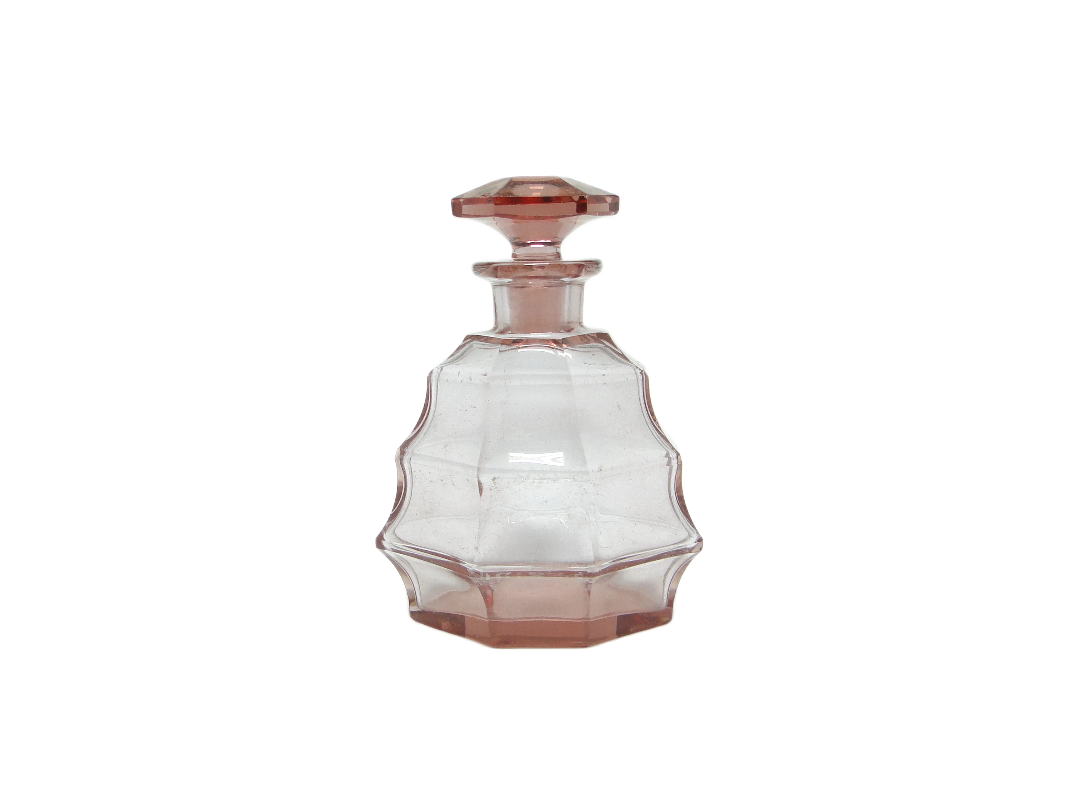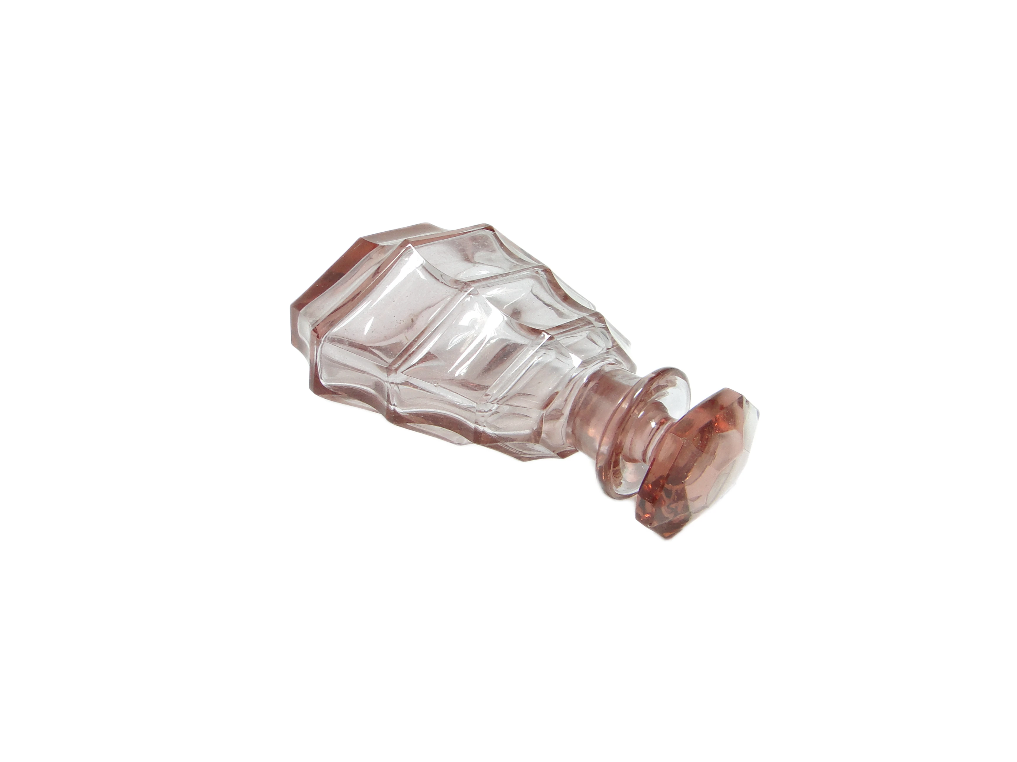 Karafka art déco wykonana z różowego szkła kryształowego pochodzi z lat 30. XX wieku, z czechosłowackiej wytwórni Moser. Korpus o wielobocznych, fasetowanych ściankach i geometrycznym, również fasetowanym korku reprezentuje charakterystyczną dla epoki precyzję i dążenie do klarownych form. Delikatny, chłodny odcień różu nadaje całości świeżości i lekkości, a szkło pozostaje gładkie, błyszczące i przejrzyste. Płynne przejście między szeroką podstawą a smukłą szyjką, ostre krawędzie i brak dodatkowych dekoracji podkreślają wysoką jakość wykonania. Sygnatura producenta i brak widocznych uszkodzeń świadczą o bardzo dobrym stanie zachowania – widoczne są tylko minimalne ślady użytkowania typowe dla przedmiotów z epoki.Ten przedmiot opowiada historię międzywojennego modernizmu, kiedy artyści i rzemieślnicy poszukiwali syntezy funkcjonalności z estetyką. Geometryczne linie i szlifowane fasety przywołują optymizm lat 30., a światło odbijające się od różowego kryształu rozprasza się na powierzchni niczym refleksy dawnej sali balowej. Karafka, stworzona z myślą o luksusie codzienności, zachowała ducha tamtych czasów, w których elegancja i użytkowość spotykały się przy wspólnym stole.Karafkę można wyeksponować na konsoli, barku lub półce w salonie, w towarzystwie srebrnych akcesoriów, kieliszków o prostych formach lub porcelanowych dodatków. Doskonale odnajdzie się zarówno w kolekcjonerskim wnętrzu w duchu art déco, jak i jako kontrapunkt dla minimalistycznych przestrzeni – warto zestawić ją z marmurowym blatem lub szlachetnym drewnem, by podkreślić kolor i geometryczne linie.Nie podano szczegółowych wymiarów ani dodatkowych informacji technicznych. Zaleca się mycie ręczne i unikanie silnych detergentów, by zachować połysk kryształu oraz integralność fasetowanych krawędzi.