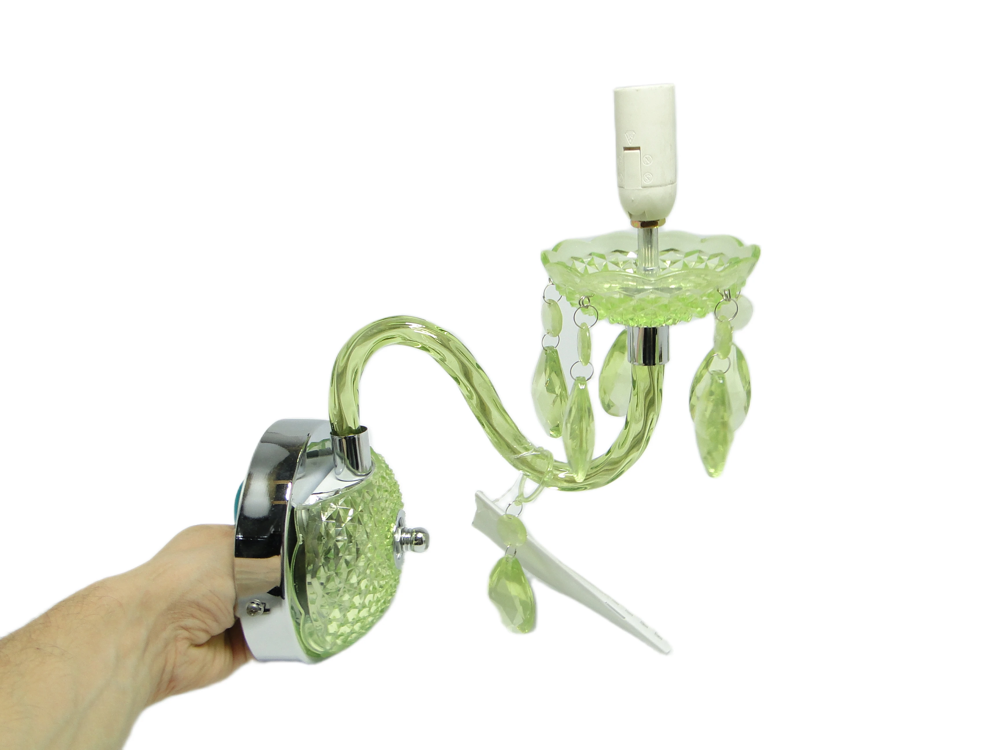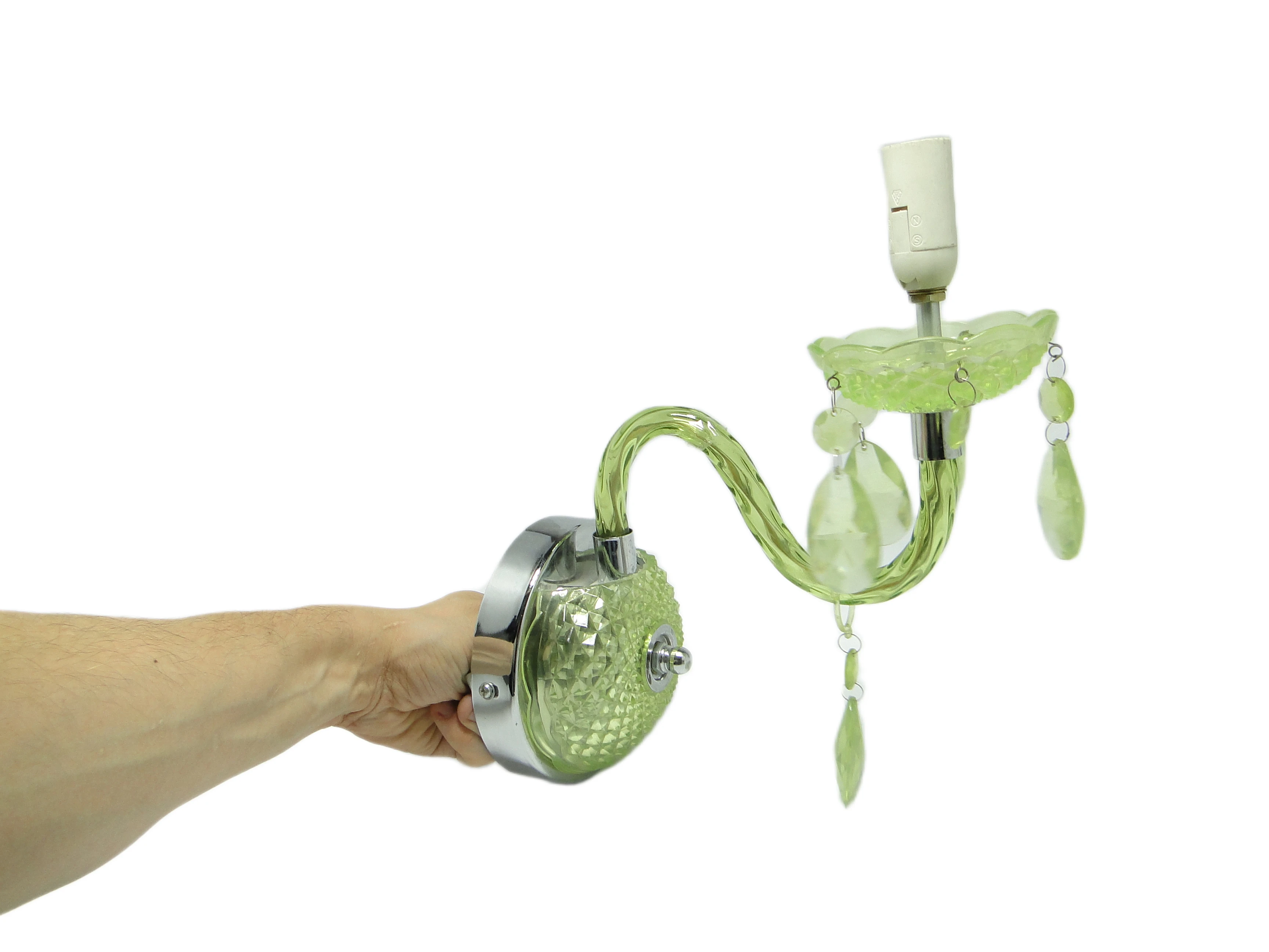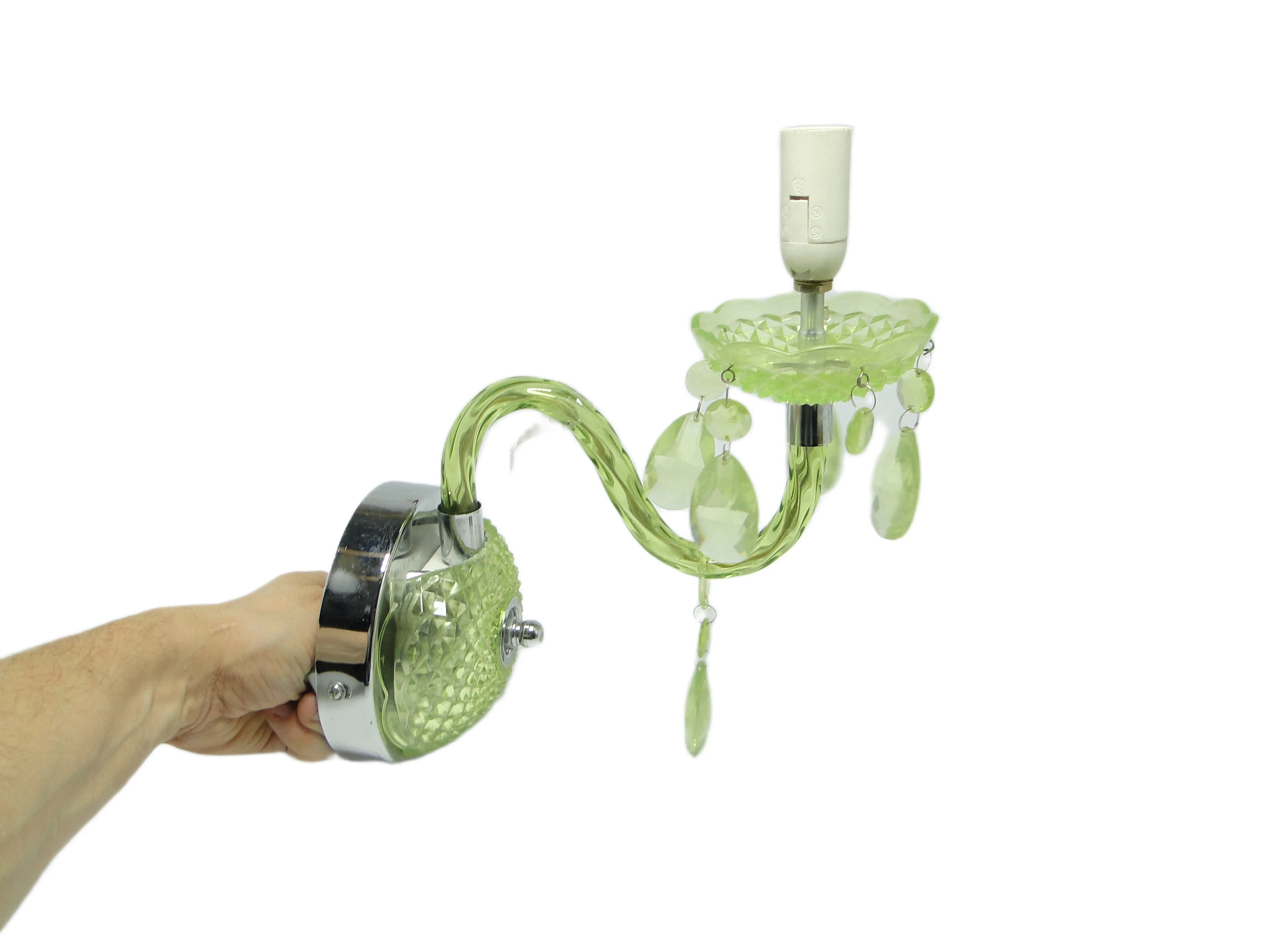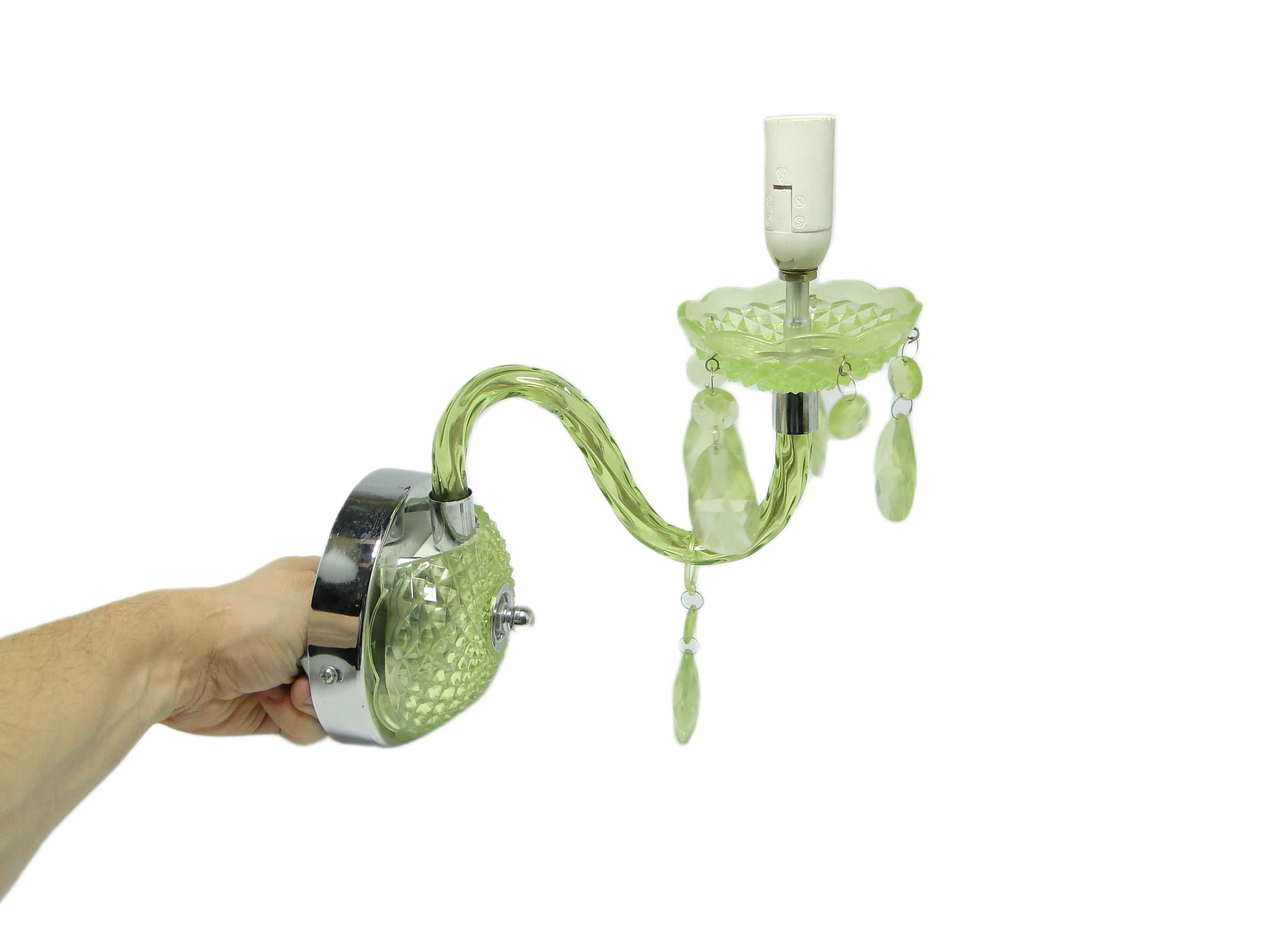 Kinkiet ścienny z Polski z lat 90. to przykład postmodernistycznego podejścia do oświetlenia, gdzie forma i materiał prowadzą subtelny dialog z tradycją. Korpus, wykonany z przezroczystego, limonkowo-turkusowego tworzywa sztucznego, został uformowany tak, by imitować szlifowane szkło. Na rozecie ściennej oraz spodku pod oprawką żarówki widoczny jest diamentowy wzór, nawiązujący do klasycznych motywów dekoracyjnych. Chromowane, lustrzane akcenty na płycie montażowej i oprawce żarówki podkreślają kontrast pomiędzy chłodną zielenią a metalicznym połyskiem. Ramię lampy, delikatnie wygięte, płynnie łączy się z główną częścią kinkietu. Zwisające, przezroczyste łezki z tego samego tworzywa przywodzą na myśl biżuteryjne detale tradycyjnych żyrandoli, a całość utrzymana jest w bardzo dobrym stanie – brak widocznych pęknięć, odprysków czy przebarwień, wszystkie elementy są oryginalne i kompletne, instalacja pozostaje sprawna.Ten kinkiet opowiada historię lat 90., kiedy polskie wzornictwo czerpało inspiracje z przeszłości, przetwarzając je przez filtr nowych technologii i materiałów. Błyszcząca, przezroczysta zieleń tworzy wrażenie światła zamkniętego w szklanej strukturze, a zwisające łezki – niczym miniaturowe szmaragdy – łapią i rozpraszają blask, przywołując atmosferę domów, w których nostalgia spotykała się z potrzebą świeżości. Kinkiet zdaje się szeptać o pragnieniu odmiany i odwadze zabawy formą – jego powierzchnia odbija światło i fragmenty otoczenia, zmieniając się z każdą chwilą.Można zestawić go z meblami z połowy XX wieku, by podkreślić jego vintage’owy rodowód, lub wprowadzić do eklektycznego wnętrza jako świetlny akcent. Dobrze sprawdzi się na ścianie w salonie, obok lustra lub grafiki, jak i w przedpokoju, gdzie zapewni dyskretne, rozproszone oświetlenie. Warto połączyć go z innymi detalami w odcieniach zieleni lub chromu, a dla kontrastu – z matowymi powierzchniami ścian czy tekstyliami o surowej fakturze, co pozwoli wyeksponować połyskującą strukturę lampy.