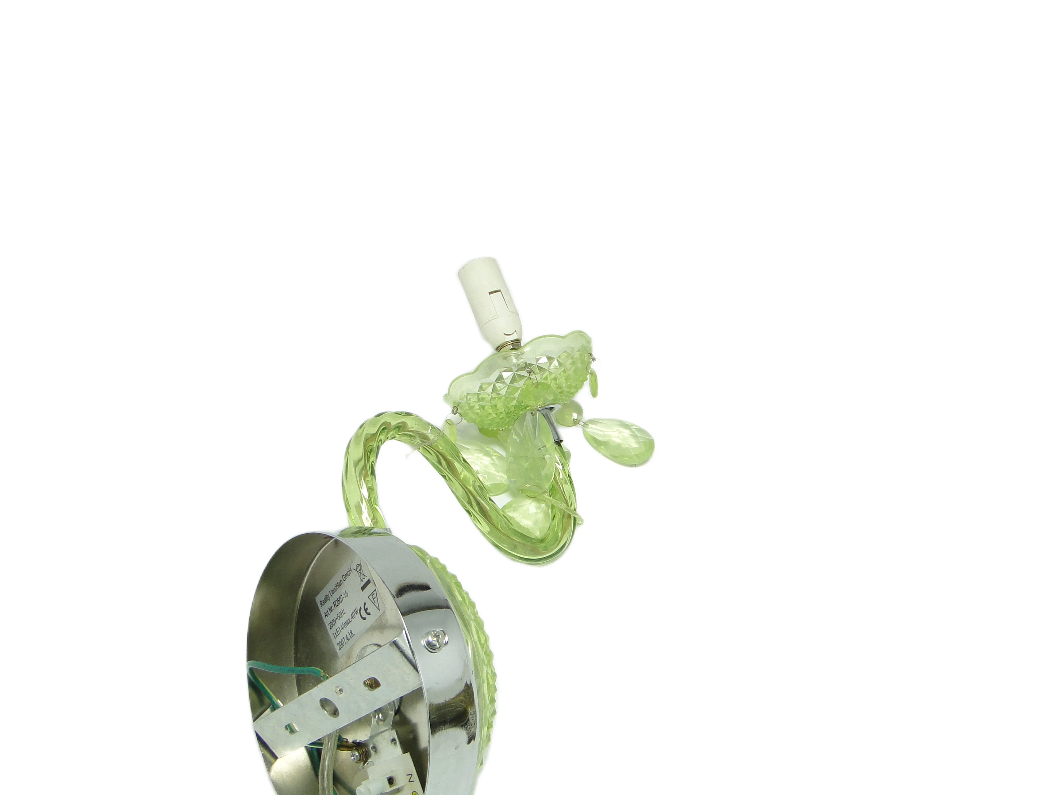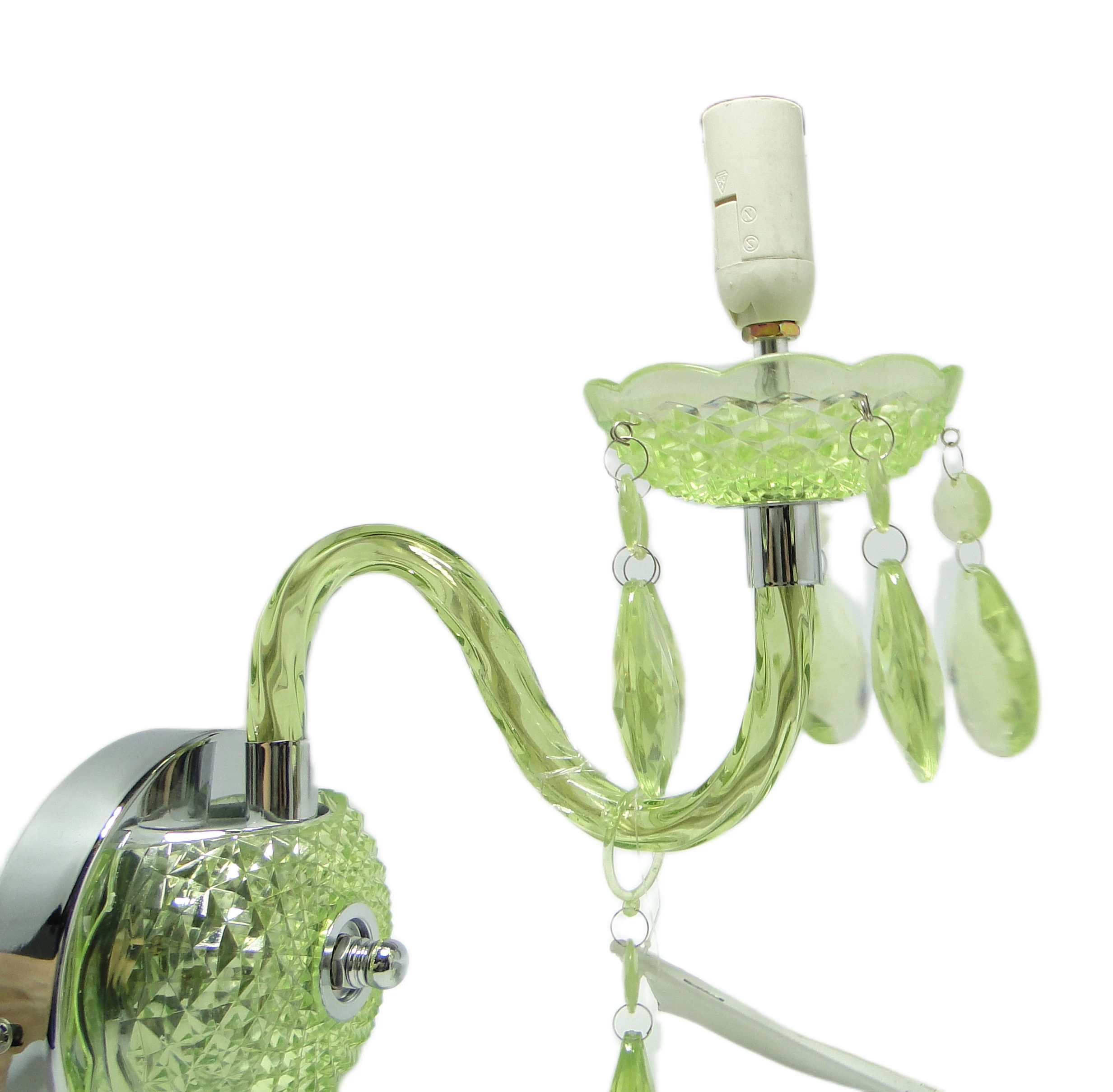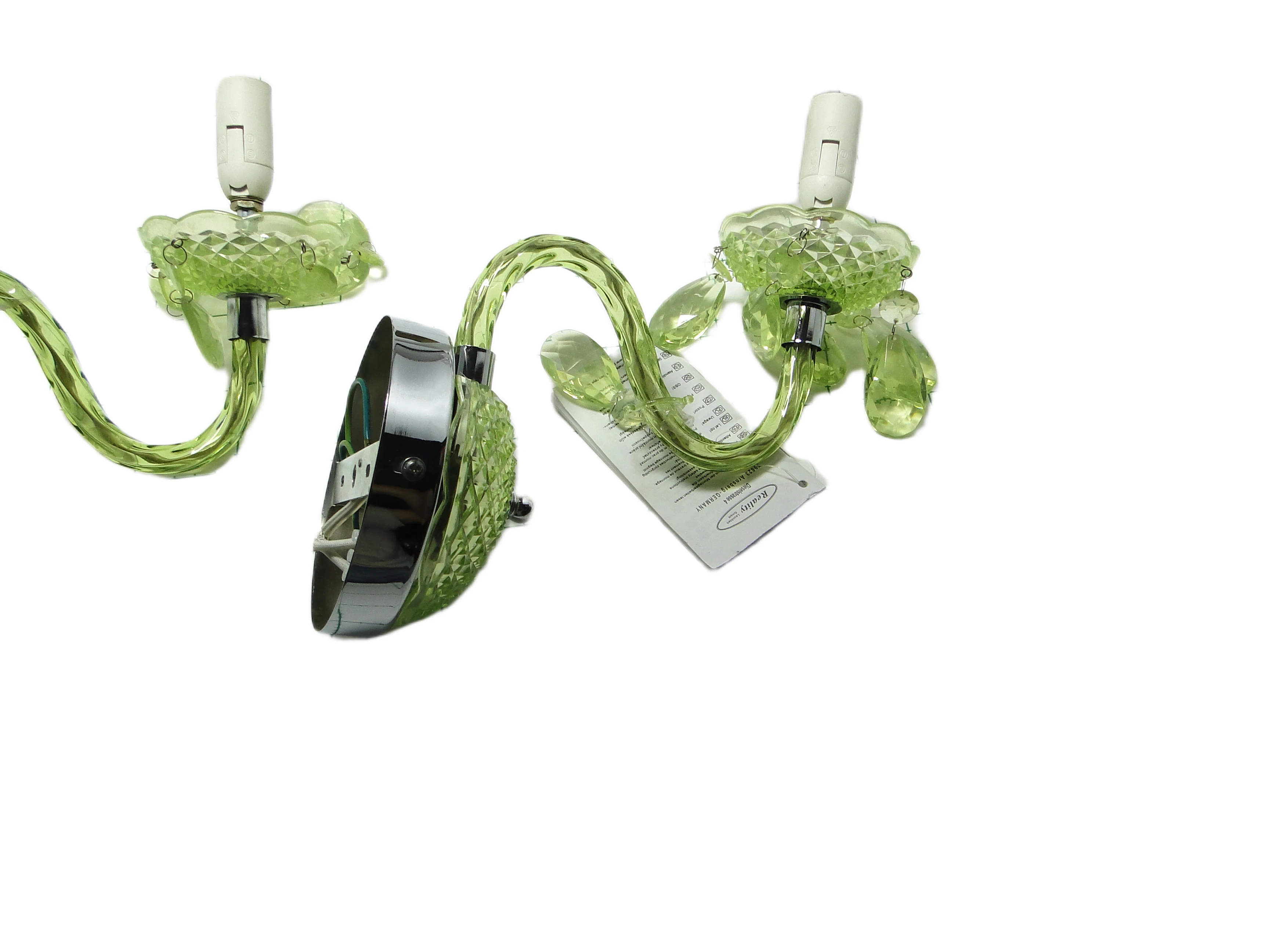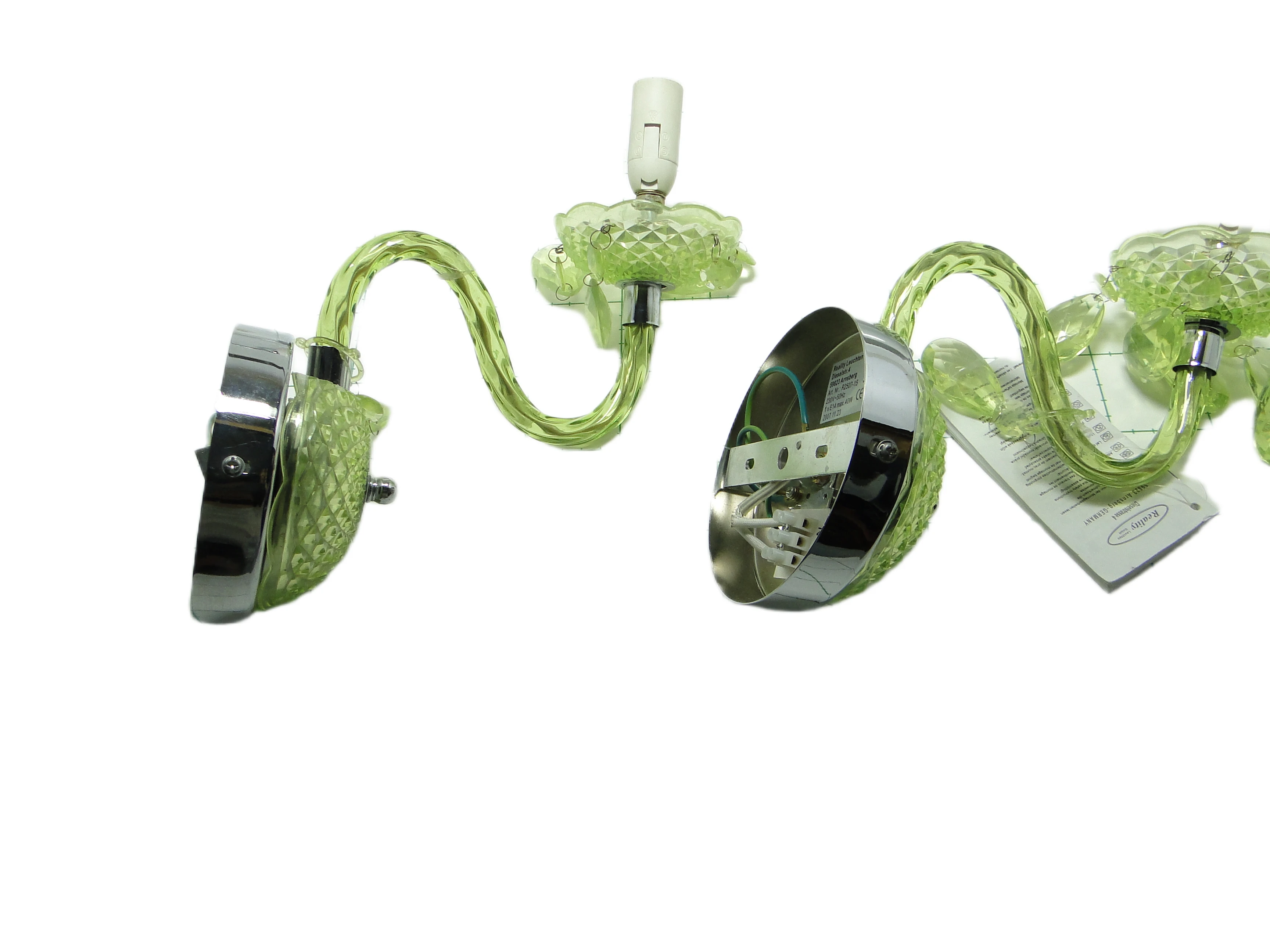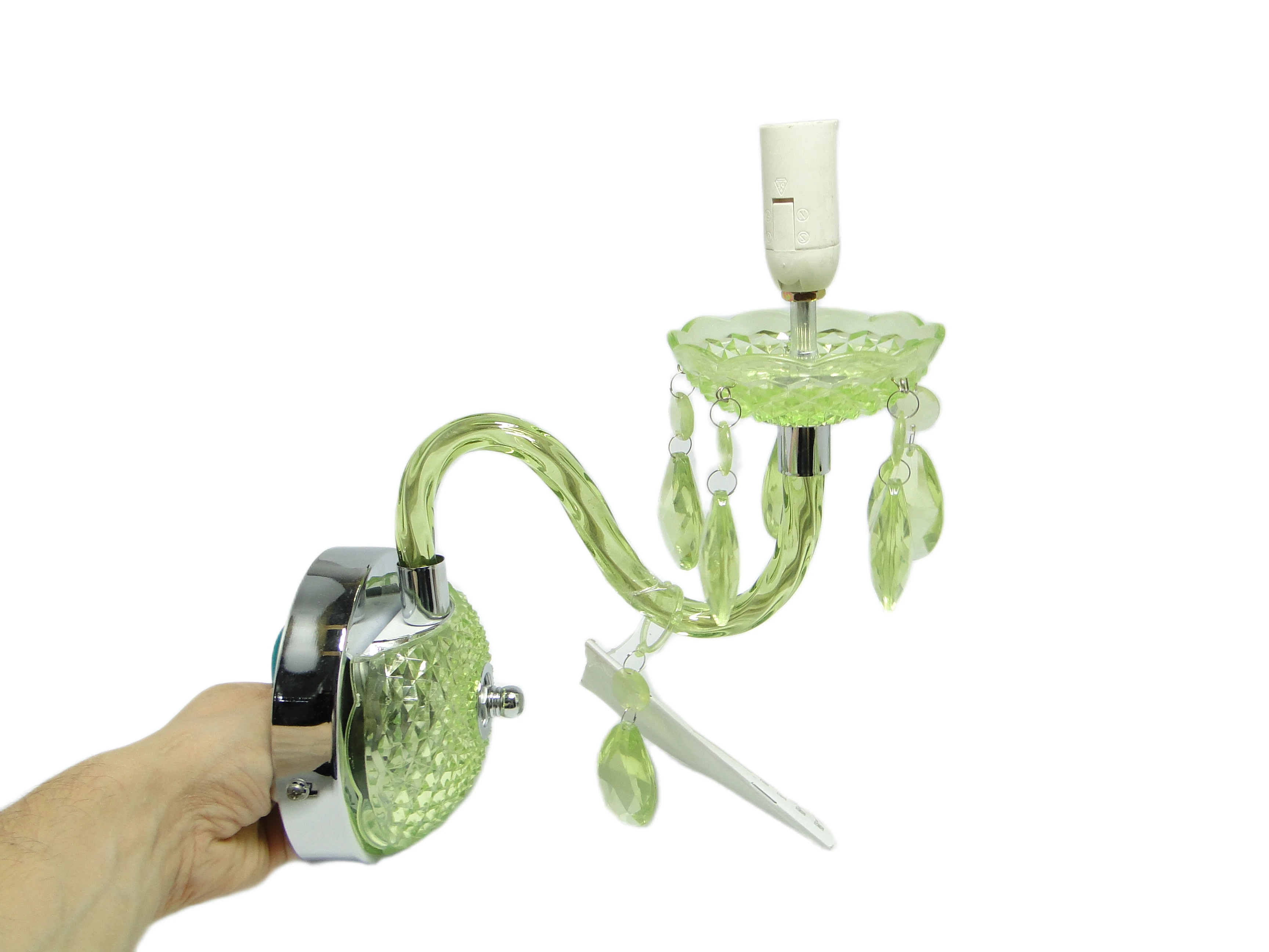 Kinkiet ścienny z Polski z lat 90. to przykład postmodernistycznego podejścia do oświetlenia, gdzie forma i materiał prowadzą subtelny dialog z tradycją. Korpus, wykonany z przezroczystego, limonkowo-turkusowego tworzywa sztucznego, został uformowany tak, by imitować szlifowane szkło. Na rozecie ściennej oraz spodku pod oprawką żarówki widoczny jest diamentowy wzór, nawiązujący do klasycznych motywów dekoracyjnych. Chromowane, lustrzane akcenty na płycie montażowej i oprawce żarówki podkreślają kontrast pomiędzy chłodną zielenią a metalicznym połyskiem. Ramię lampy, delikatnie wygięte, płynnie łączy się z główną częścią kinkietu. Zwisające, przezroczyste łezki z tego samego tworzywa przywodzą na myśl biżuteryjne detale tradycyjnych żyrandoli, a całość utrzymana jest w bardzo dobrym stanie – brak widocznych pęknięć, odprysków czy przebarwień, wszystkie elementy są oryginalne i kompletne, instalacja pozostaje sprawna.Ten kinkiet opowiada historię lat 90., kiedy polskie wzornictwo czerpało inspiracje z przeszłości, przetwarzając je przez filtr nowych technologii i materiałów. Błyszcząca, przezroczysta zieleń tworzy wrażenie światła zamkniętego w szklanej strukturze, a zwisające łezki – niczym miniaturowe szmaragdy – łapią i rozpraszają blask, przywołując atmosferę domów, w których nostalgia spotykała się z potrzebą świeżości. Kinkiet zdaje się szeptać o pragnieniu odmiany i odwadze zabawy formą – jego powierzchnia odbija światło i fragmenty otoczenia, zmieniając się z każdą chwilą.Można zestawić go z meblami z połowy XX wieku, by podkreślić jego vintage’owy rodowód, lub wprowadzić do eklektycznego wnętrza jako świetlny akcent. Dobrze sprawdzi się na ścianie w salonie, obok lustra lub grafiki, jak i w przedpokoju, gdzie zapewni dyskretne, rozproszone oświetlenie. Warto połączyć go z innymi detalami w odcieniach zieleni lub chromu, a dla kontrastu – z matowymi powierzchniami ścian czy tekstyliami o surowej fakturze, co pozwoli wyeksponować połyskującą strukturę lampy.