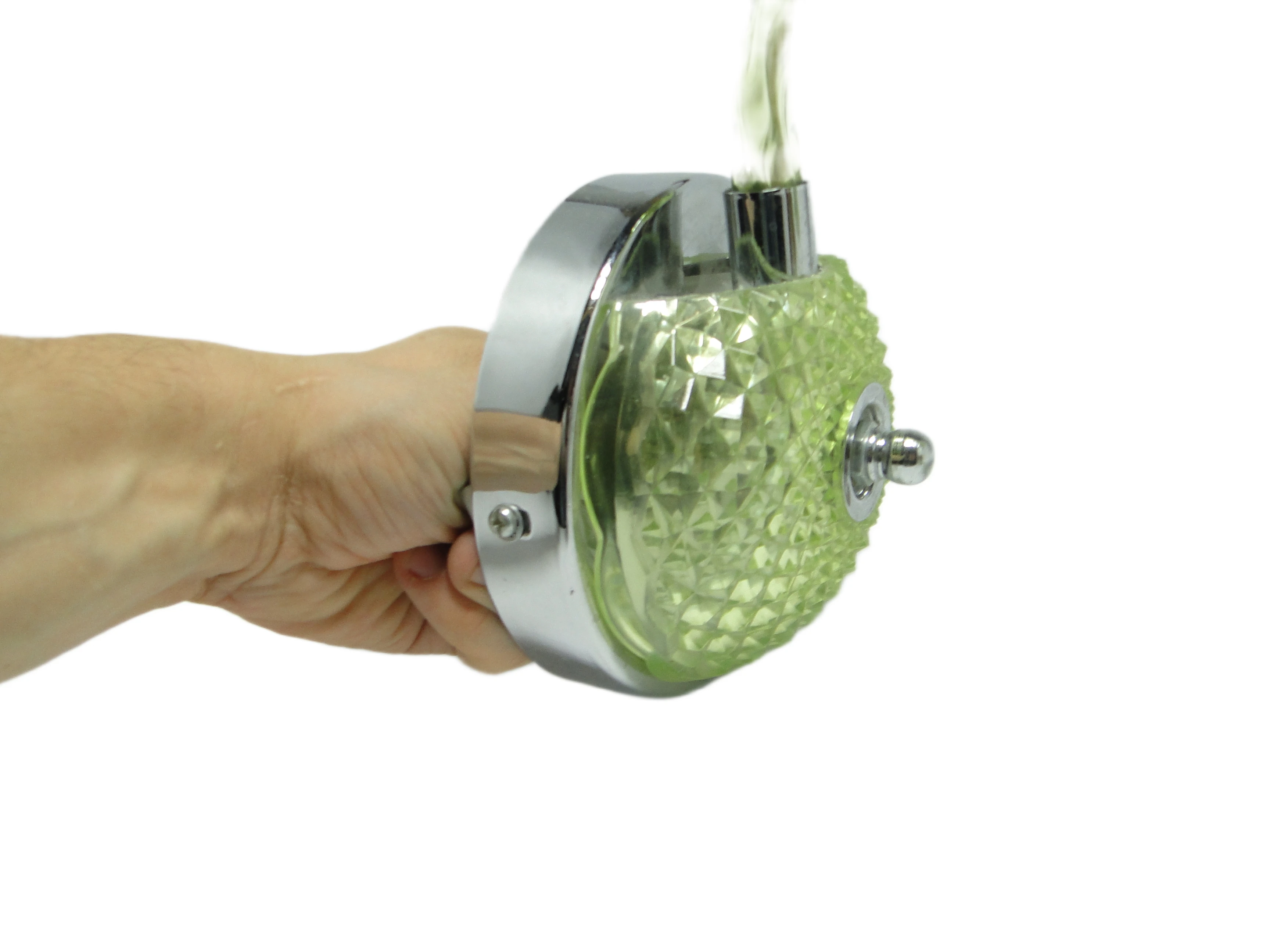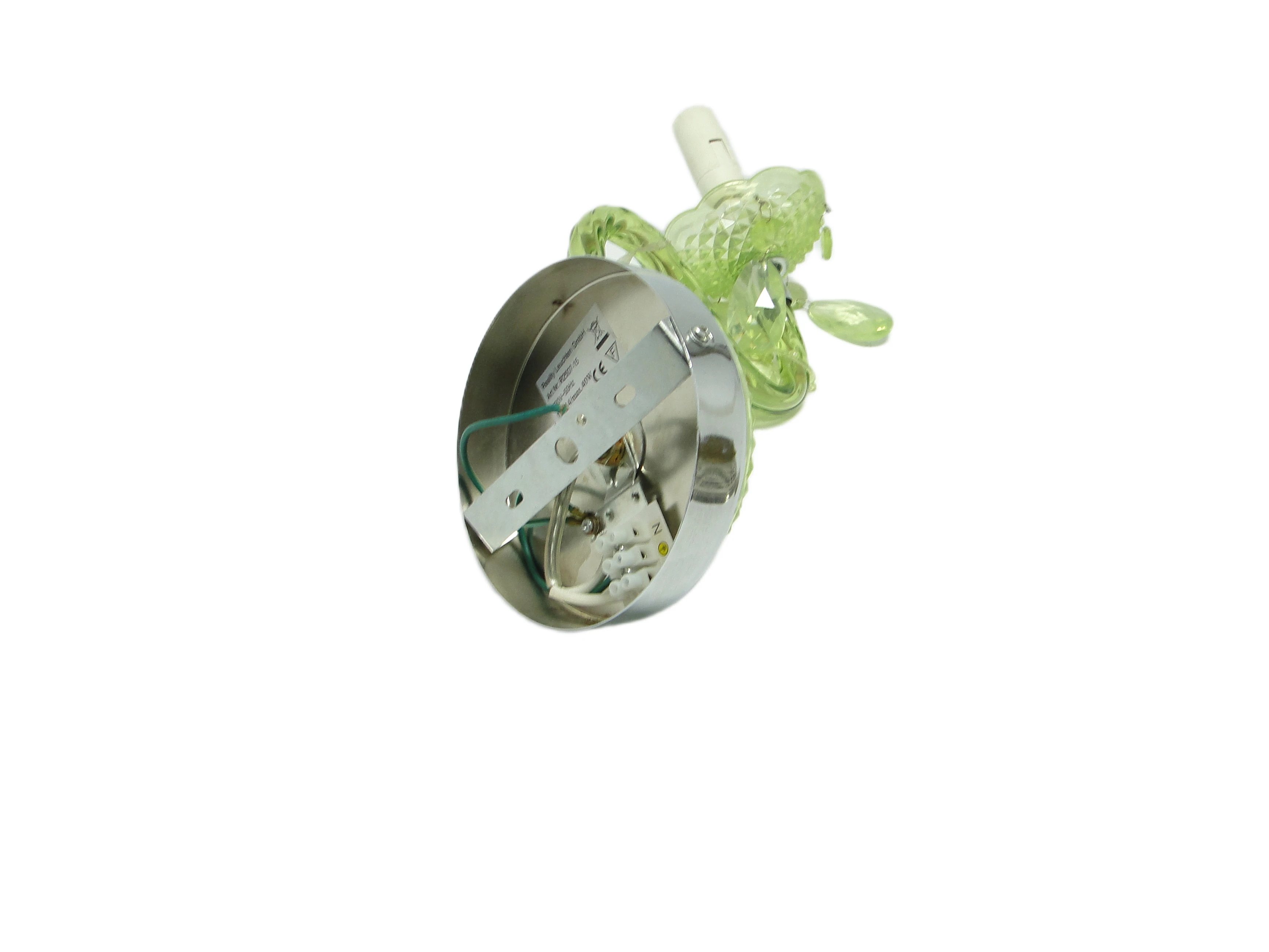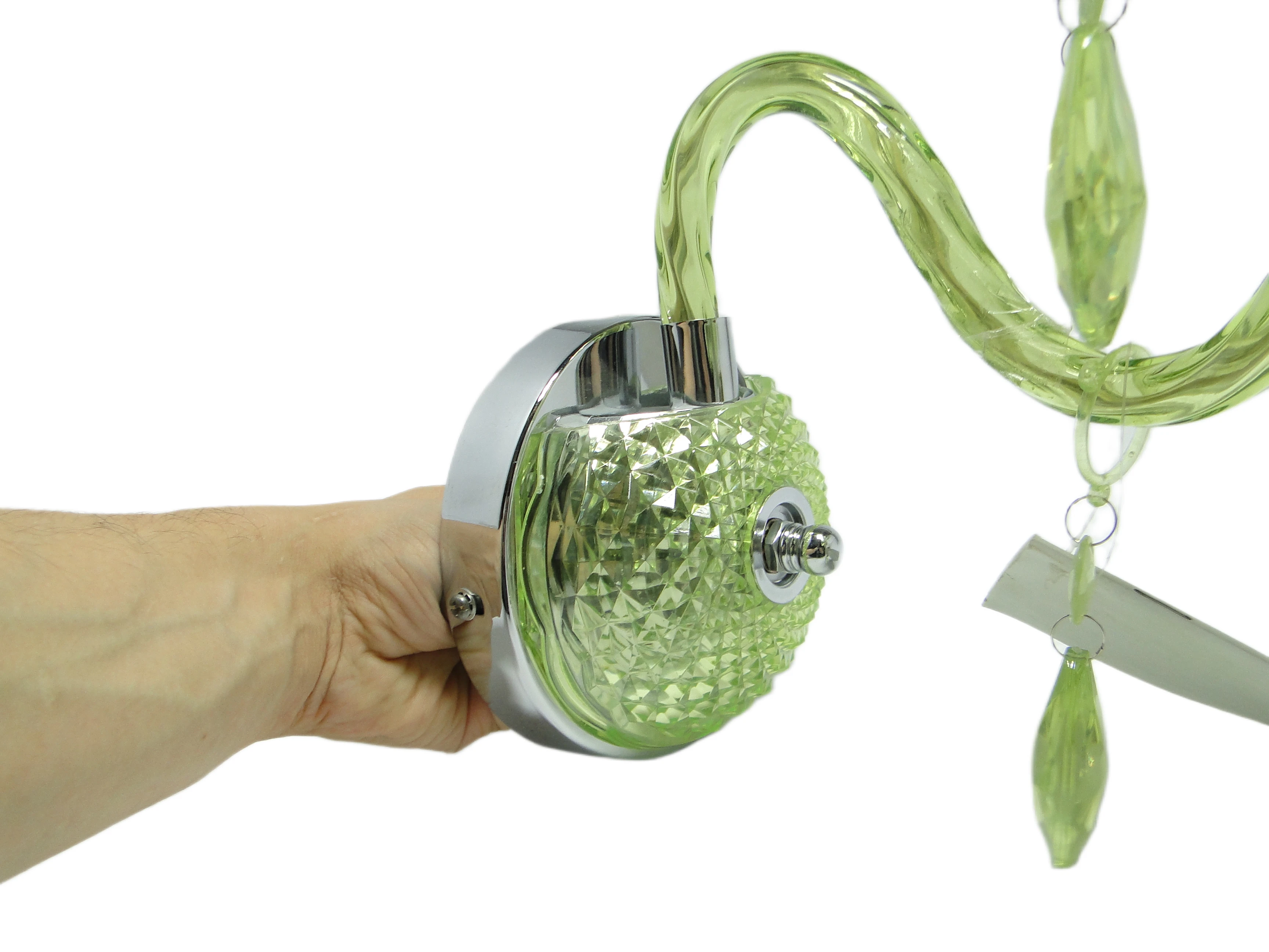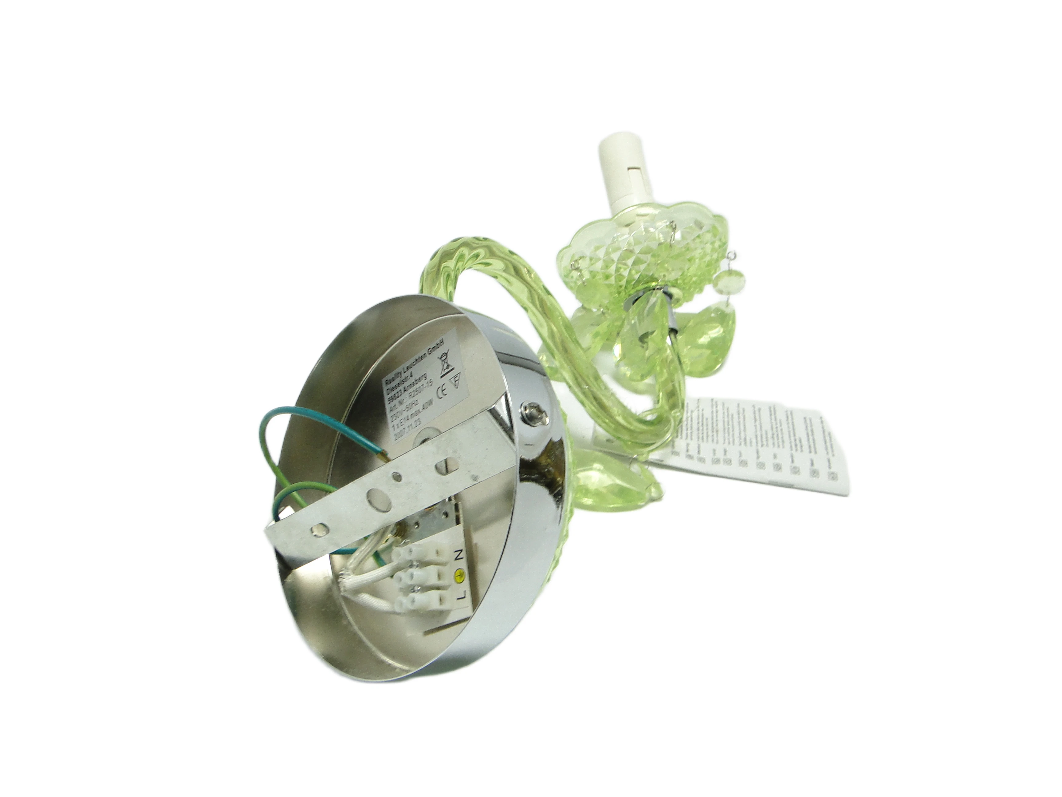 Kinkiet ścienny z Polski z lat 90. to przykład postmodernistycznego podejścia do oświetlenia, gdzie forma i materiał prowadzą subtelny dialog z tradycją. Korpus, wykonany z przezroczystego, limonkowo-turkusowego tworzywa sztucznego, został uformowany tak, by imitować szlifowane szkło. Na rozecie ściennej oraz spodku pod oprawką żarówki widoczny jest diamentowy wzór, nawiązujący do klasycznych motywów dekoracyjnych. Chromowane, lustrzane akcenty na płycie montażowej i oprawce żarówki podkreślają kontrast pomiędzy chłodną zielenią a metalicznym połyskiem. Ramię lampy, delikatnie wygięte, płynnie łączy się z główną częścią kinkietu. Zwisające, przezroczyste łezki z tego samego tworzywa przywodzą na myśl biżuteryjne detale tradycyjnych żyrandoli, a całość utrzymana jest w bardzo dobrym stanie – brak widocznych pęknięć, odprysków czy przebarwień, wszystkie elementy są oryginalne i kompletne, instalacja pozostaje sprawna.Ten kinkiet opowiada historię lat 90., kiedy polskie wzornictwo czerpało inspiracje z przeszłości, przetwarzając je przez filtr nowych technologii i materiałów. Błyszcząca, przezroczysta zieleń tworzy wrażenie światła zamkniętego w szklanej strukturze, a zwisające łezki – niczym miniaturowe szmaragdy – łapią i rozpraszają blask, przywołując atmosferę domów, w których nostalgia spotykała się z potrzebą świeżości. Kinkiet zdaje się szeptać o pragnieniu odmiany i odwadze zabawy formą – jego powierzchnia odbija światło i fragmenty otoczenia, zmieniając się z każdą chwilą.Można zestawić go z meblami z połowy XX wieku, by podkreślić jego vintage’owy rodowód, lub wprowadzić do eklektycznego wnętrza jako świetlny akcent. Dobrze sprawdzi się na ścianie w salonie, obok lustra lub grafiki, jak i w przedpokoju, gdzie zapewni dyskretne, rozproszone oświetlenie. Warto połączyć go z innymi detalami w odcieniach zieleni lub chromu, a dla kontrastu – z matowymi powierzchniami ścian czy tekstyliami o surowej fakturze, co pozwoli wyeksponować połyskującą strukturę lampy.