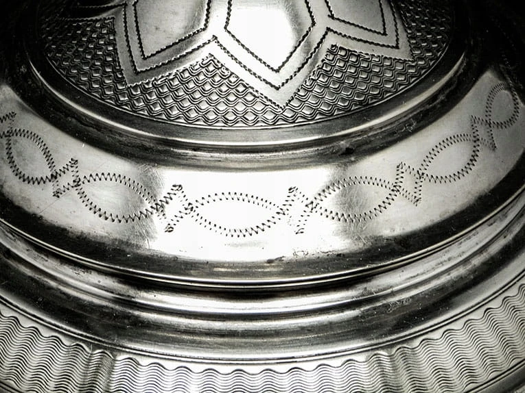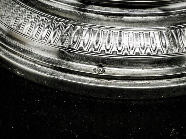 Cesarstwa Austro-Węgierskiego około 1800-1820 roku - giloszowanie, sposób zdobienia oraz sposób wykonania figury wskazują, że jest to patera klasycystyczna. Została wykonana przed okresem Biedermeier.